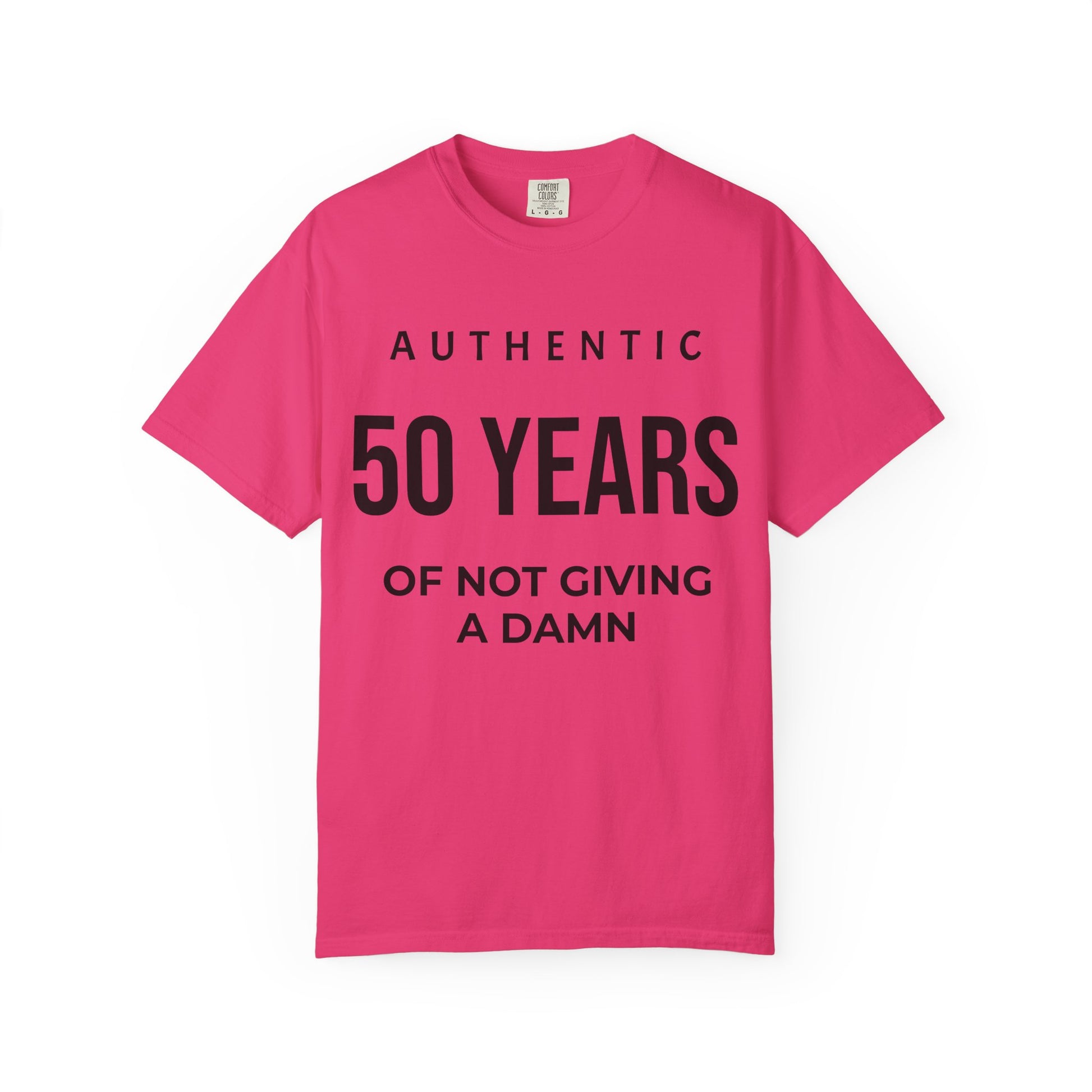 This relaxed-fit tee feels like a friendly shrug in fabric form — soft, lived-in, and unapologetically honest. The garment-dyed cotton has a subtle, matte texture that washes in the way of well-worn favorites, and the bold, minimalist text reads “AUTHENTIC 50 YEARS OF NOT GIVING A DAMN” across the chest with calm confidence. It sits loose across the shoulders and breathes through the medium-weight knit, so it works as an everyday layer for weekend hangs, low-key celebrations, or just lounging while you refuse to be fussed over. Finished with double-needle seams and a sewn-in label, it’s built to stay comfortable and look straightforward for years. Choose from many muted shades to match the mood you want to wear.