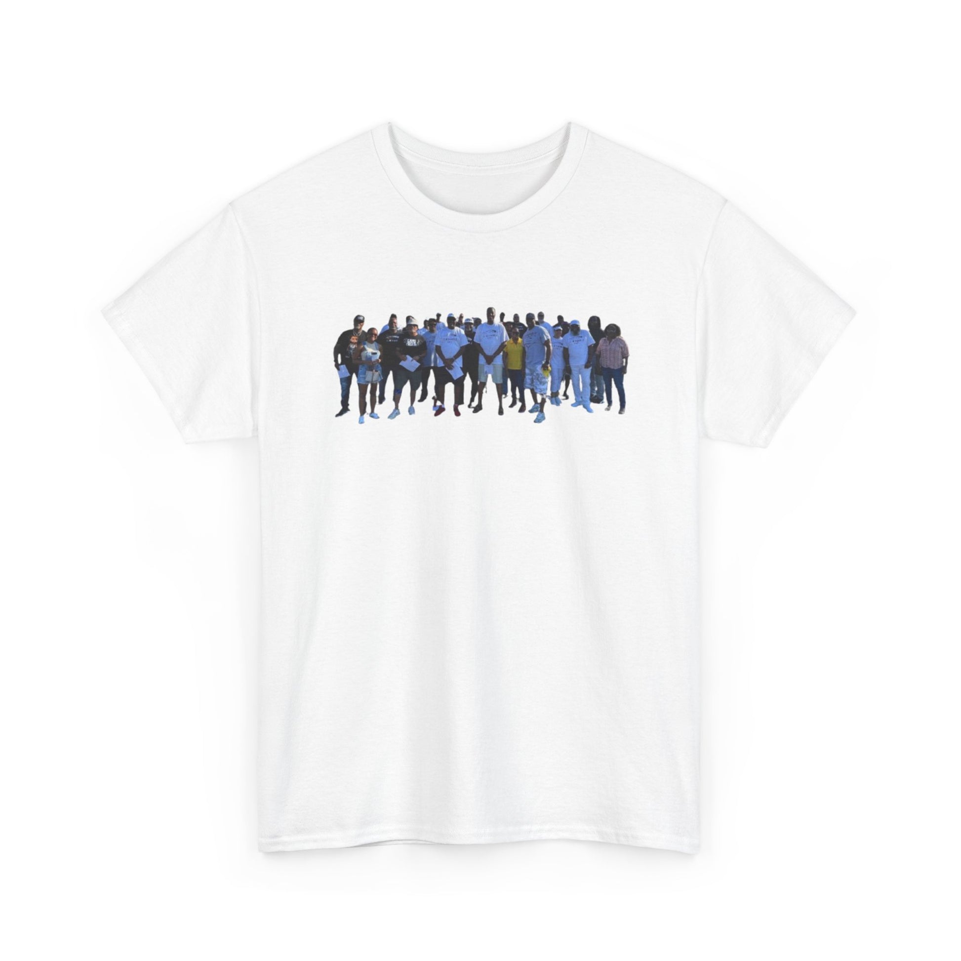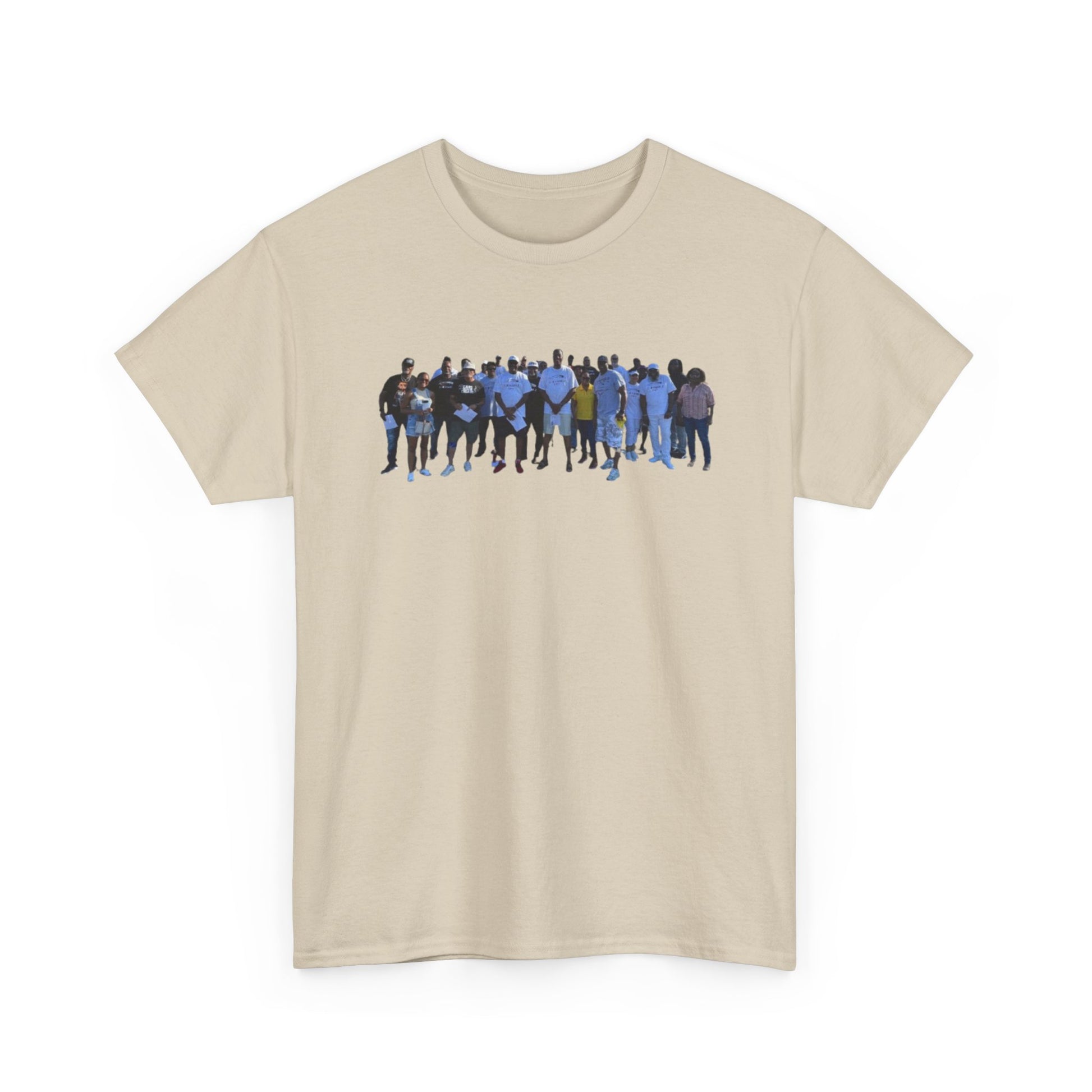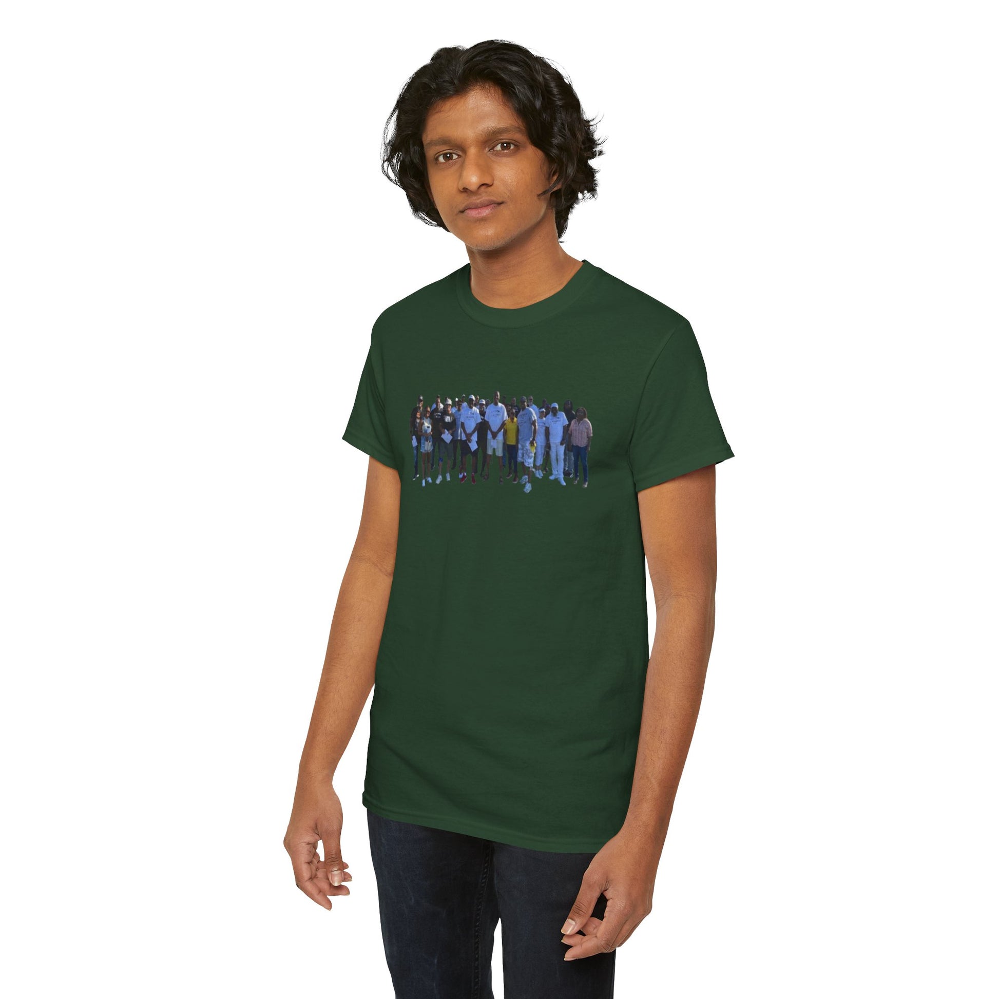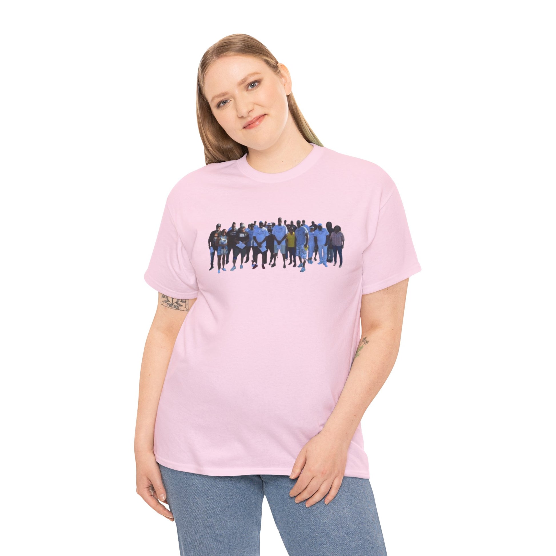 This tee carries a quiet, communal energy — a row of silhouettes in cool blues that reads like a neighborhood snapshot or a team gathered before something starts. It sits low on the chest so the artwork feels personal, like a secret you and your crew share. Wear it on slow weekend mornings with coffee, on evening walks when the light softens, or layered under a jacket for casual meet-ups. The classic crew neckline and relaxed cut let the image do the talking without fuss. The soft, sturdy cotton holds the print crisp and flat, so the scene keeps its graphic clarity through washes and wear. There’s an understated familiarity to this shirt: it’s for people who move through groups and moments with calm confidence, who prefer subtle statements over loud logos.