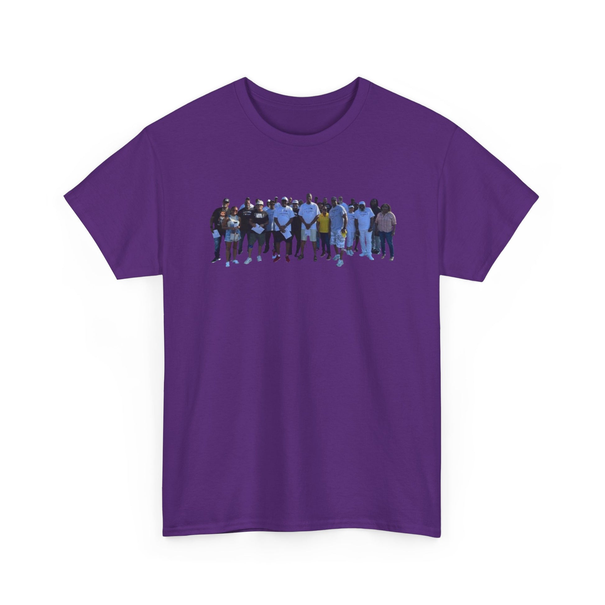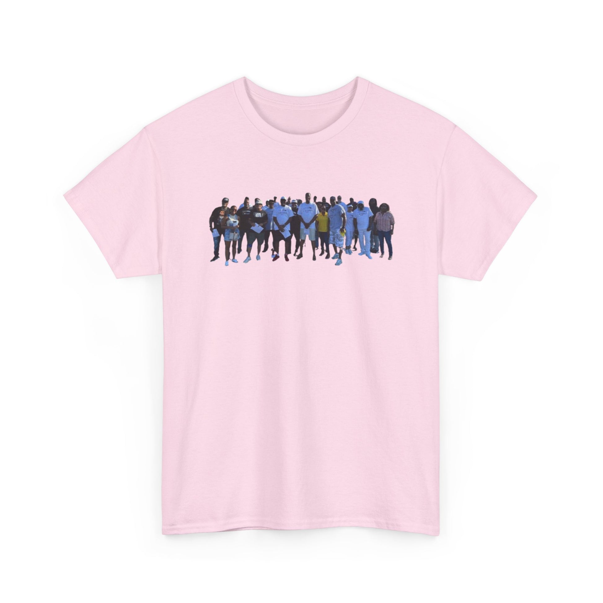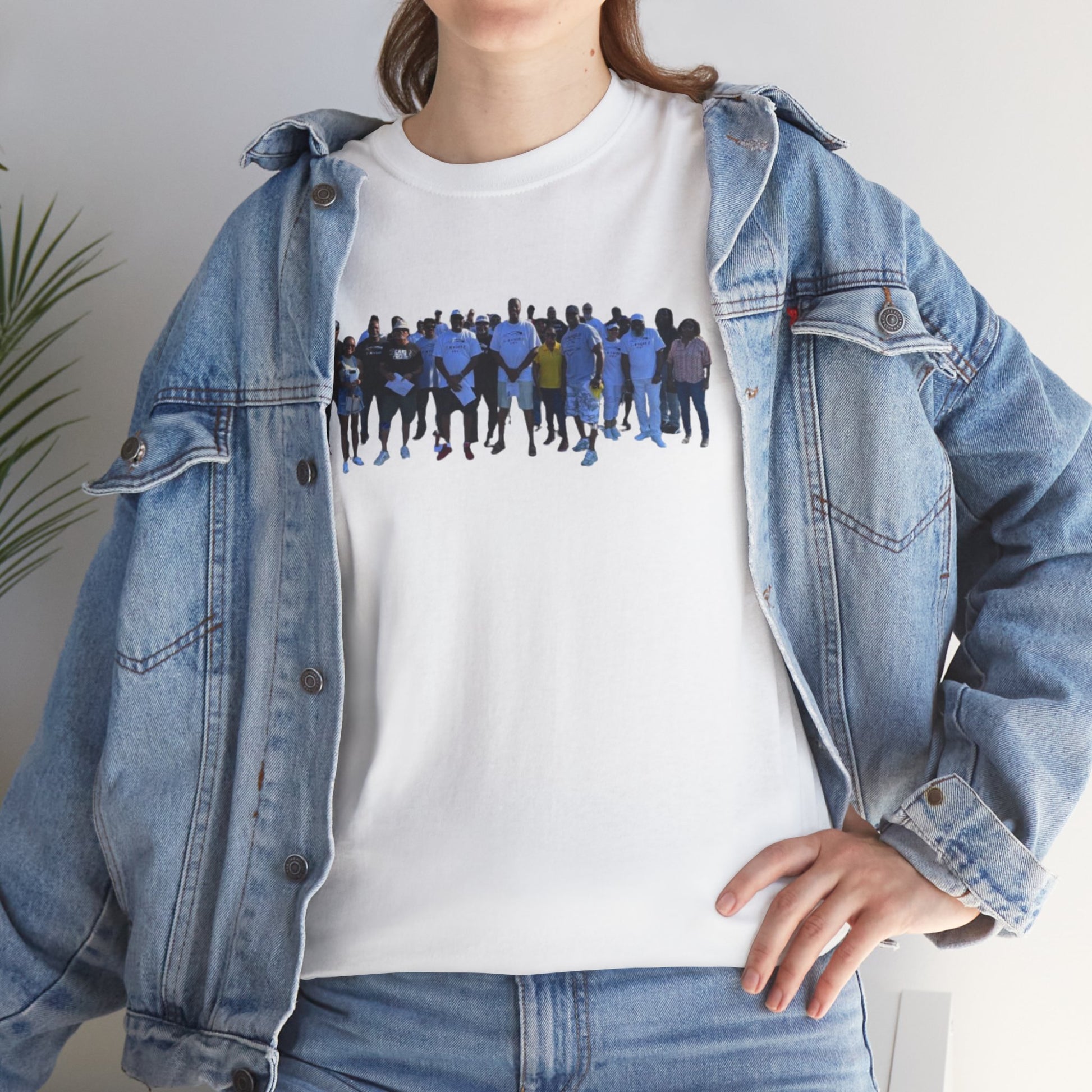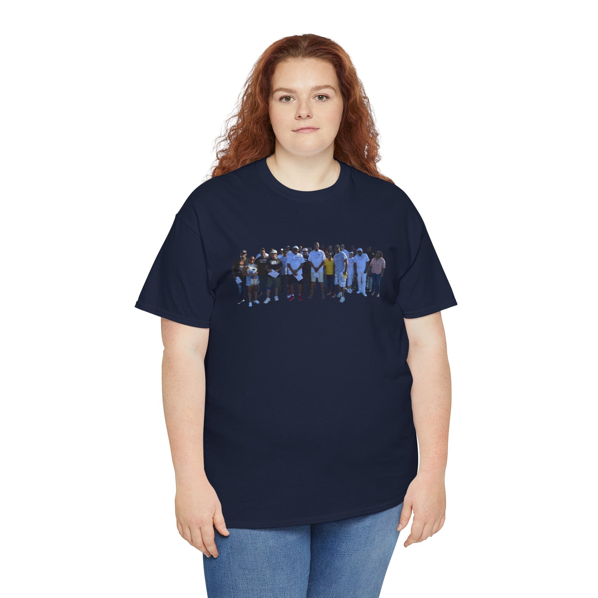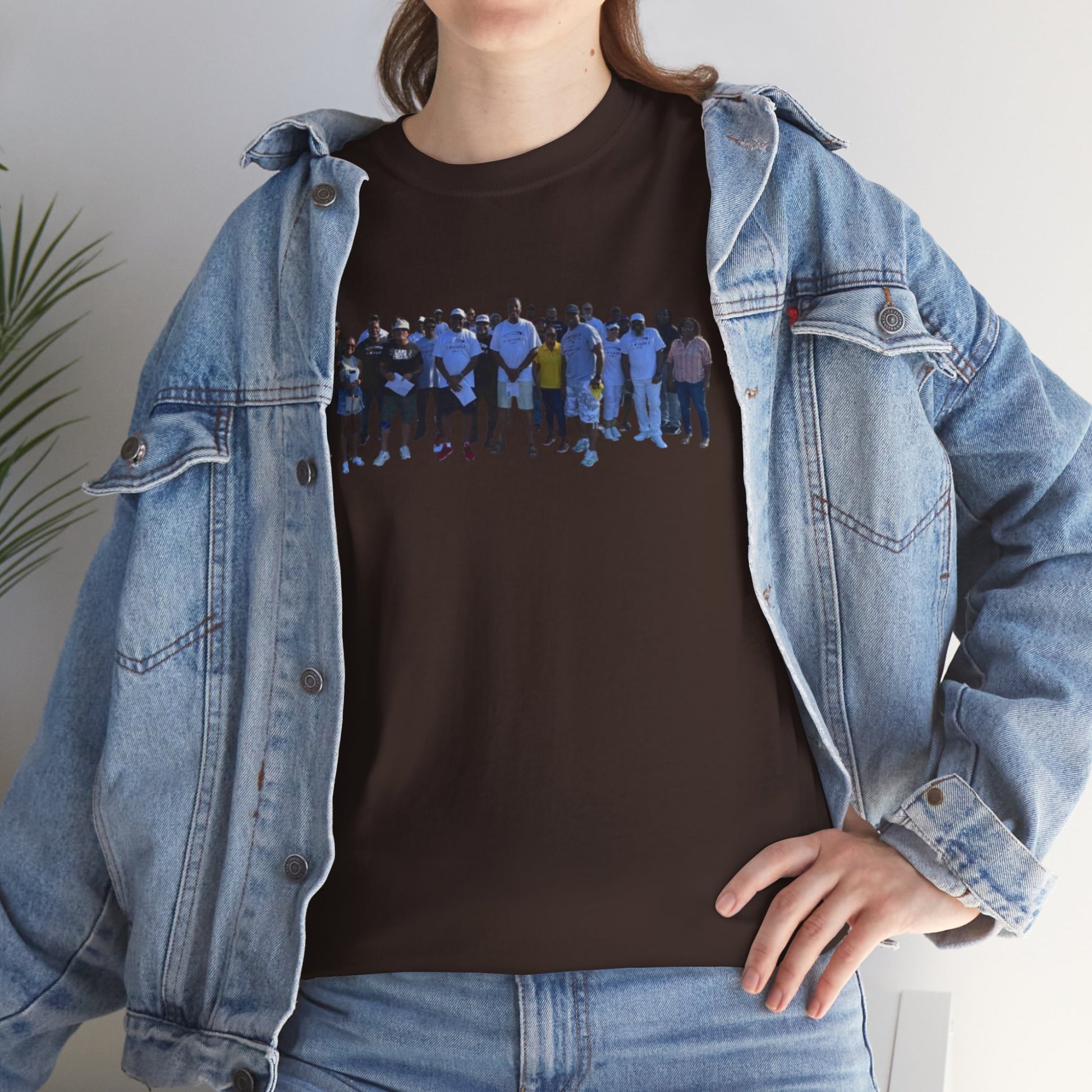 This tee carries a quiet, communal energy — a row of silhouettes in cool blues that reads like a neighborhood snapshot or a team gathered before something starts. It sits low on the chest so the artwork feels personal, like a secret you and your crew share. Wear it on slow weekend mornings with coffee, on evening walks when the light softens, or layered under a jacket for casual meet-ups. The classic crew neckline and relaxed cut let the image do the talking without fuss. The soft, sturdy cotton holds the print crisp and flat, so the scene keeps its graphic clarity through washes and wear. There’s an understated familiarity to this shirt: it’s for people who move through groups and moments with calm confidence, who prefer subtle statements over loud logos.