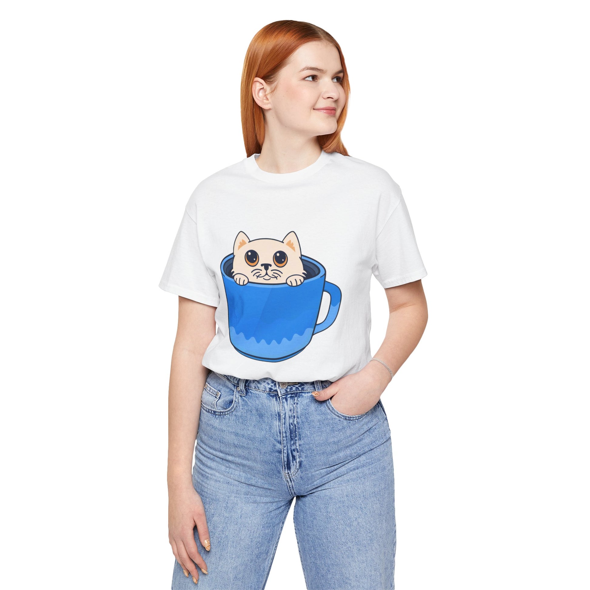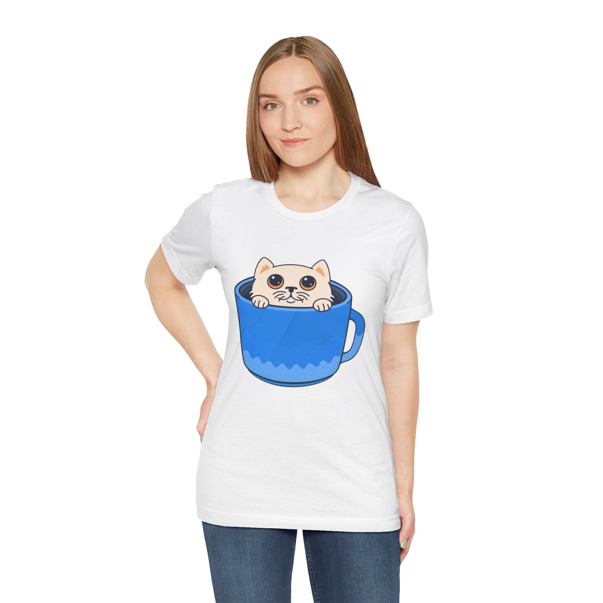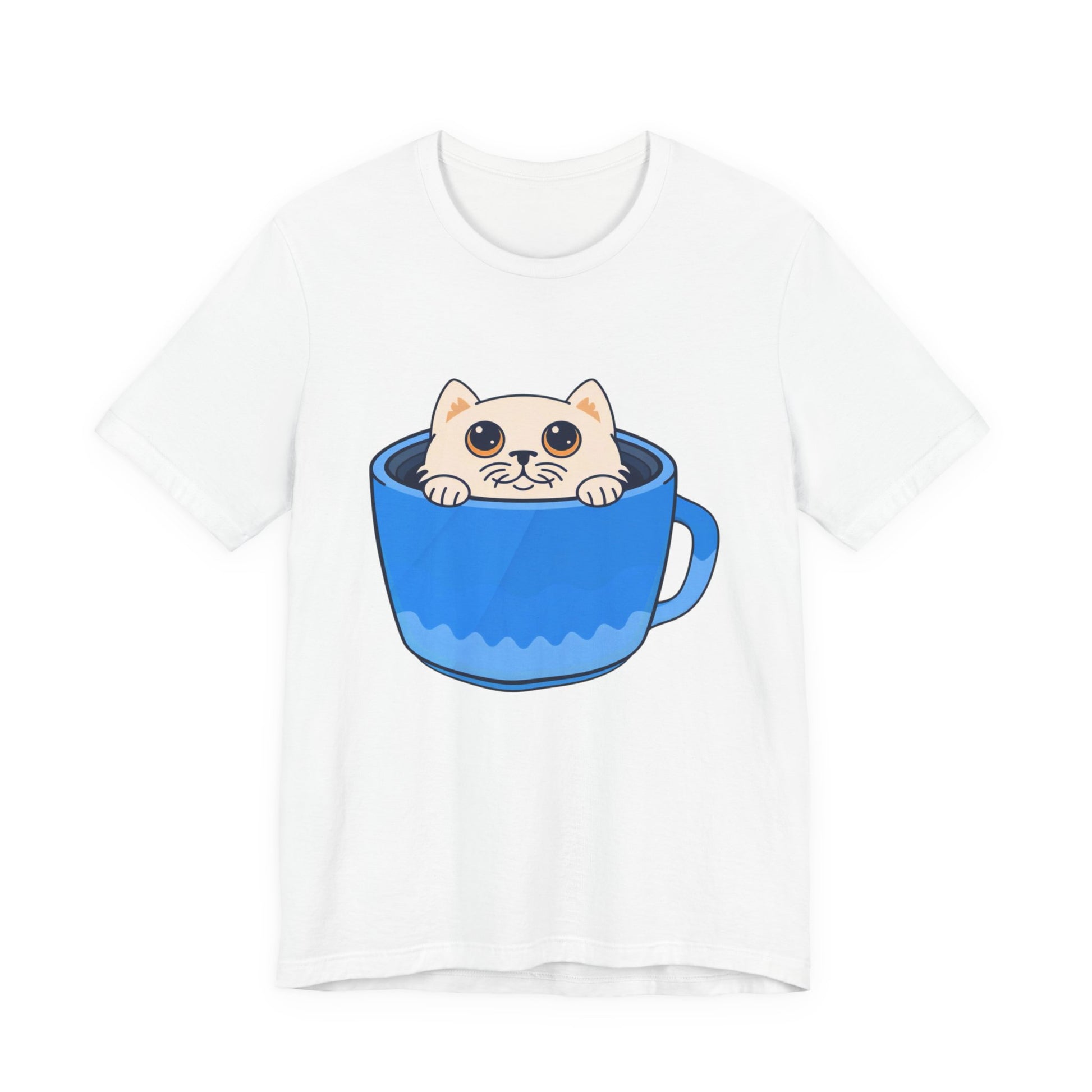 A lightweight, soft cotton tee that brings a little daily delight to casual outfits. A wide-eyed kitten peeks out from inside a bright blue mug, printed with clean lines and vivid color so the playful illustration stands out on the chest. Wear it on relaxed mornings with jeans and slippers, layered under a cardigan for coffee dates, or out with friends when you want a subtle, whimsical statement. The crew neck and retail cut keep the silhouette neat and easy to accessorize. This shirt feels like a small, warm moment — cozy, cheerful, and a little mischievous.
