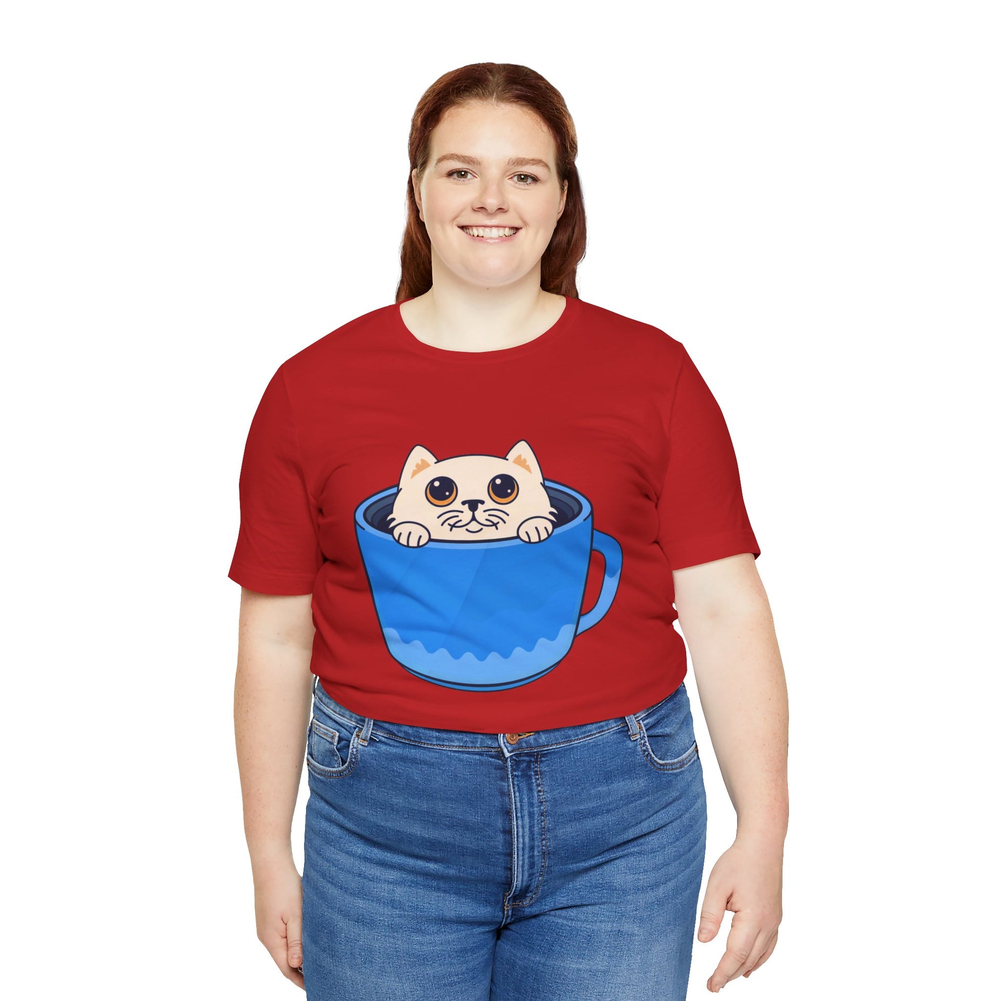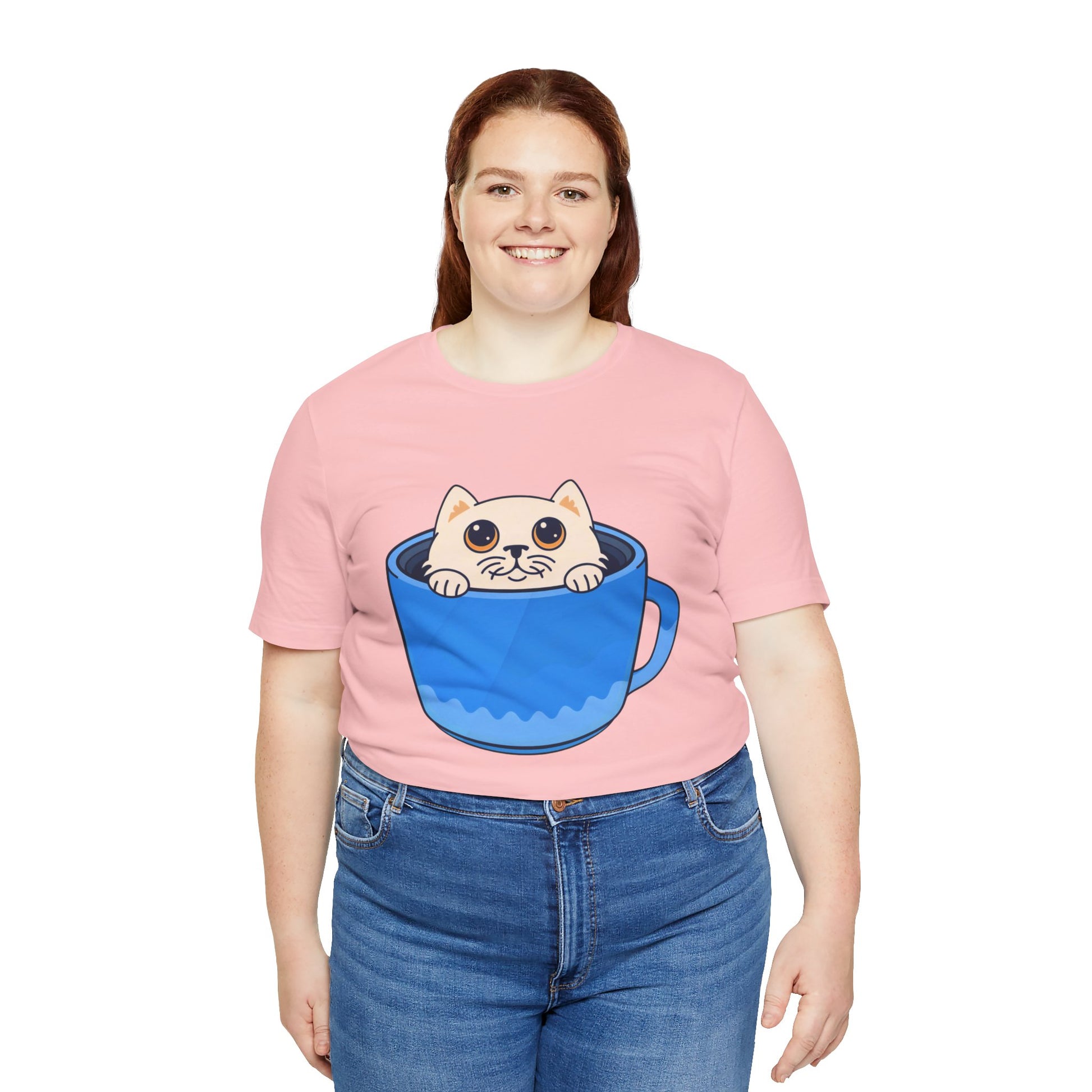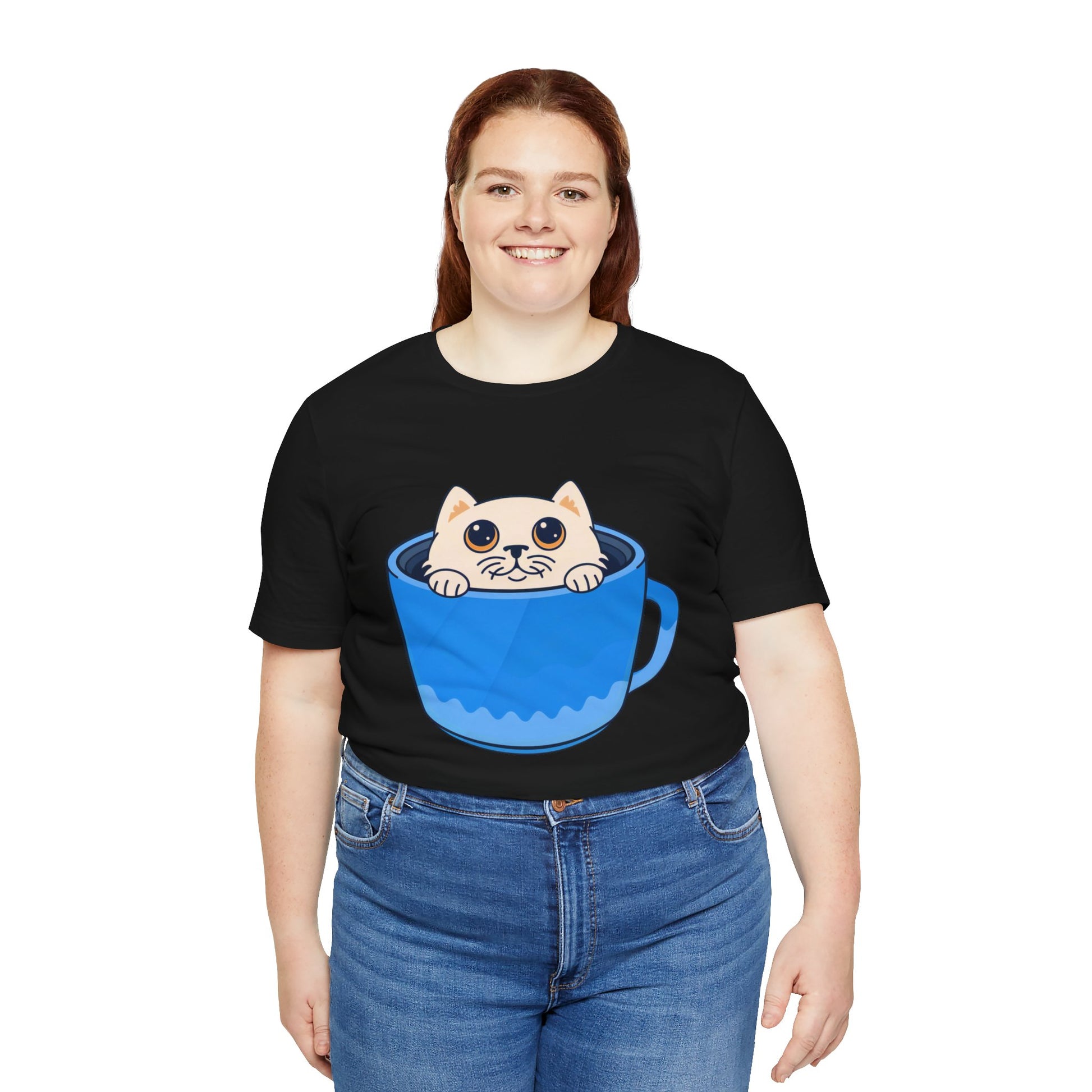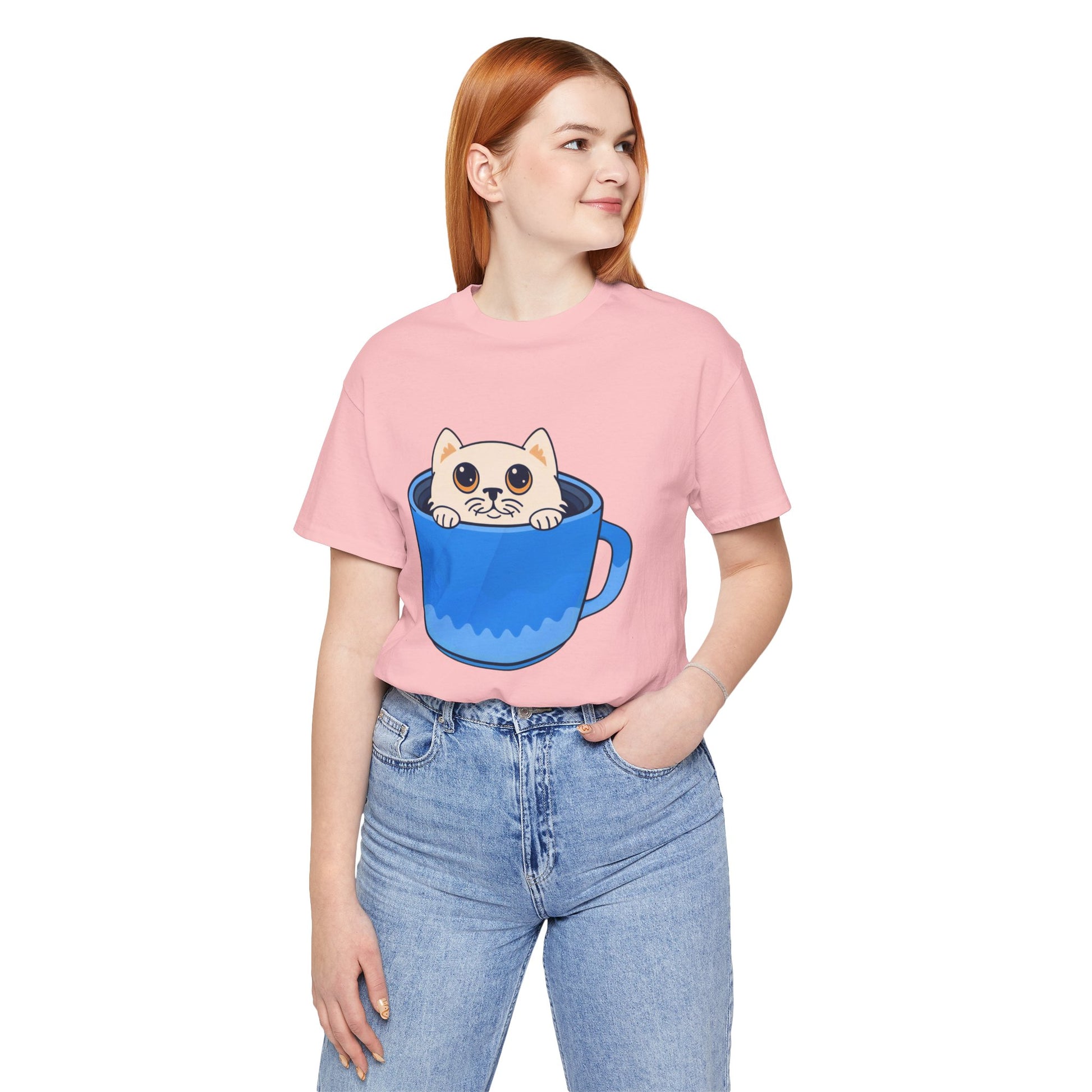 A lightweight, soft cotton tee that brings a little daily delight to casual outfits. A wide-eyed kitten peeks out from inside a bright blue mug, printed with clean lines and vivid color so the playful illustration stands out on the chest. Wear it on relaxed mornings with jeans and slippers, layered under a cardigan for coffee dates, or out with friends when you want a subtle, whimsical statement. The crew neck and retail cut keep the silhouette neat and easy to accessorize. This shirt feels like a small, warm moment — cozy, cheerful, and a little mischievous.