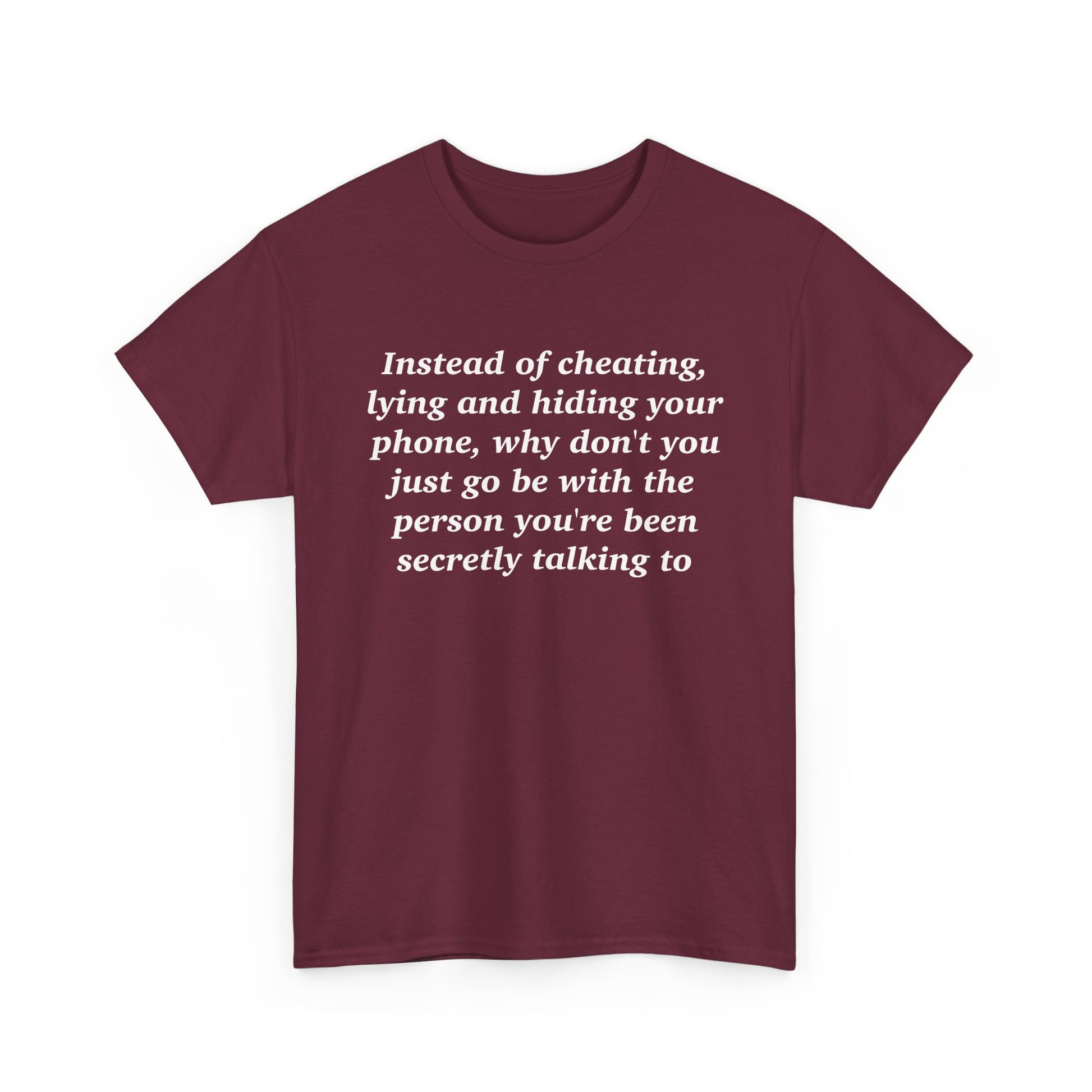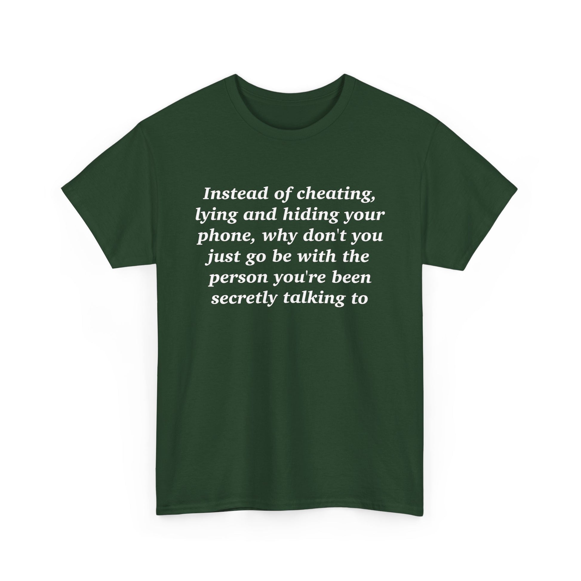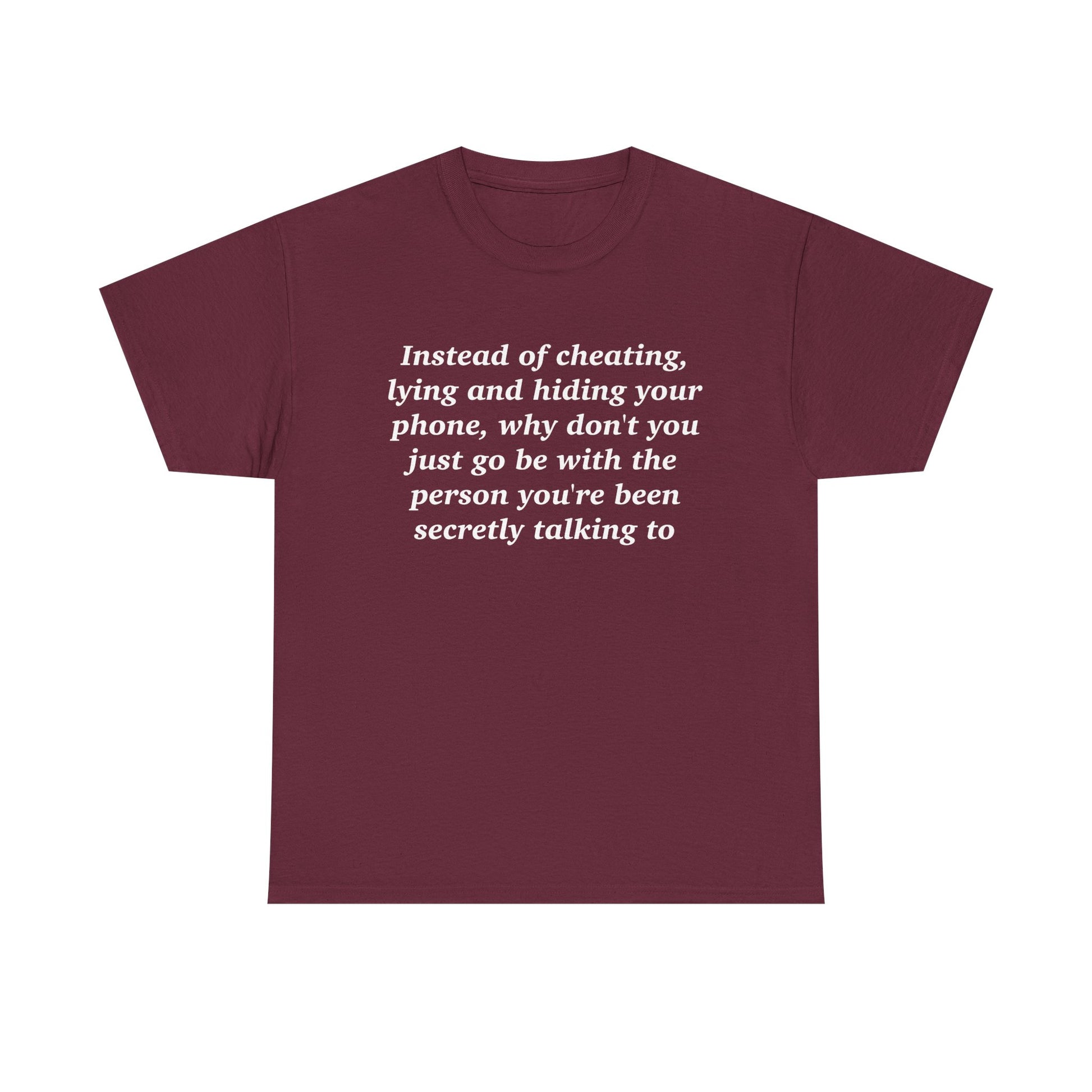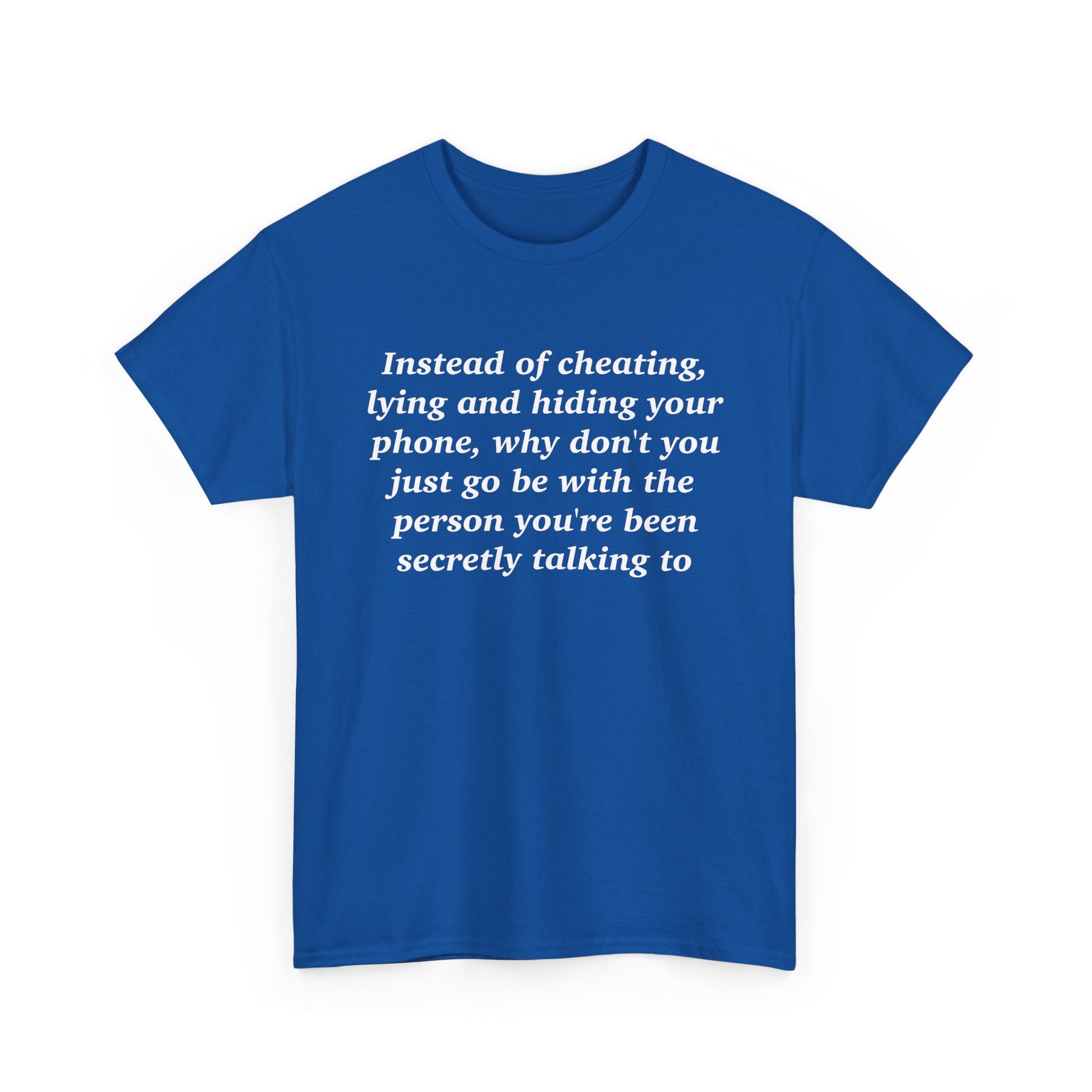 Introducing the perfect blend of comfort and style with this Unisex Heavy Cotton Tee. This shirt emanates a relaxed, laid-back vibe that seamlessly fits into any casual wardrobe or semi-formal occasion. Its classic crew neckline and timeless design make it a versatile addition to anyone's closet—ideal for everyday wear or for making a statement with its unique printed message. Perfect for adults who appreciate comfort and self-expression, this tee is great for gifting on holidays, birthdays, or just because. Celebrate memorable moments or casual outings while showcasing your personality with this essential wardrobe staple. Cheating Quote - Relationship Humor Shirt, Gift for Friends, Couples, Casual Wear, Funny T-Shirt