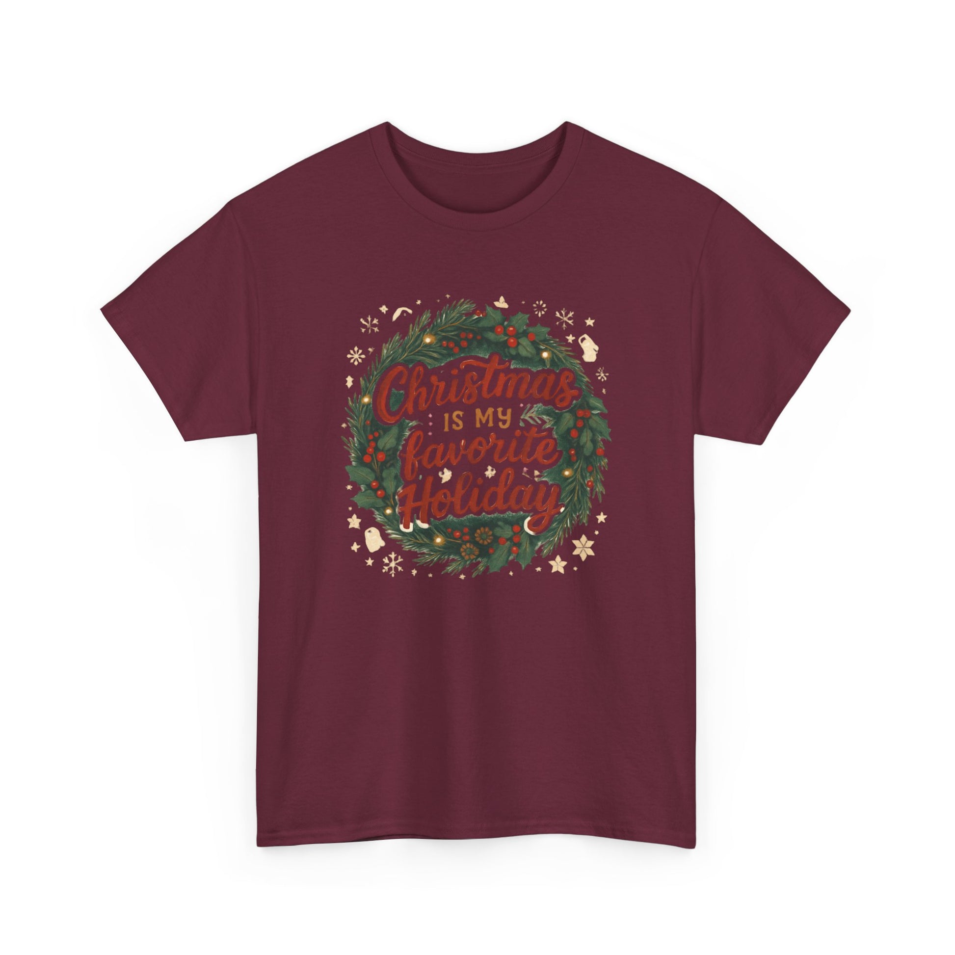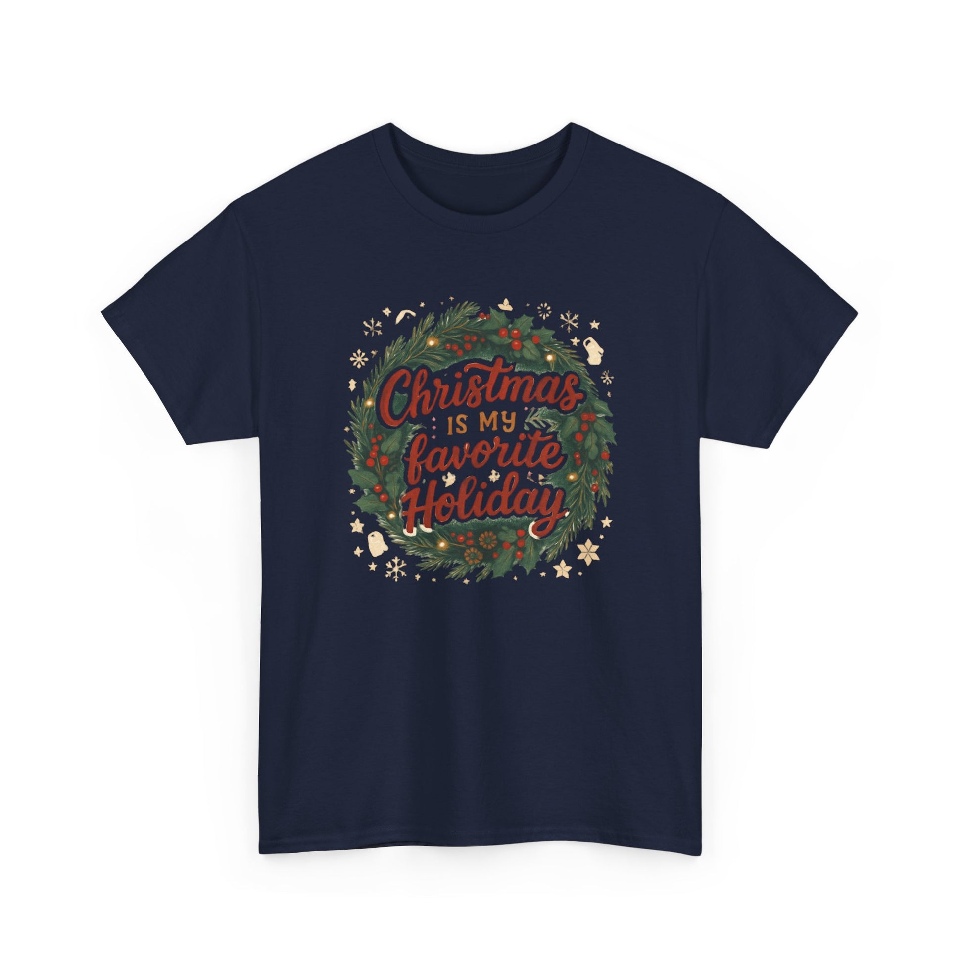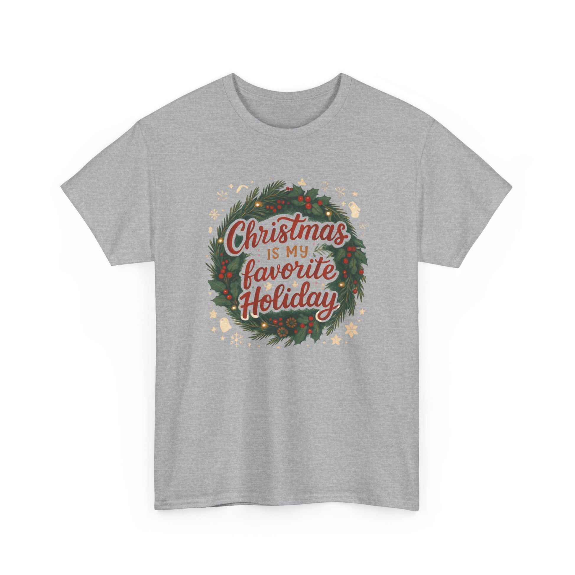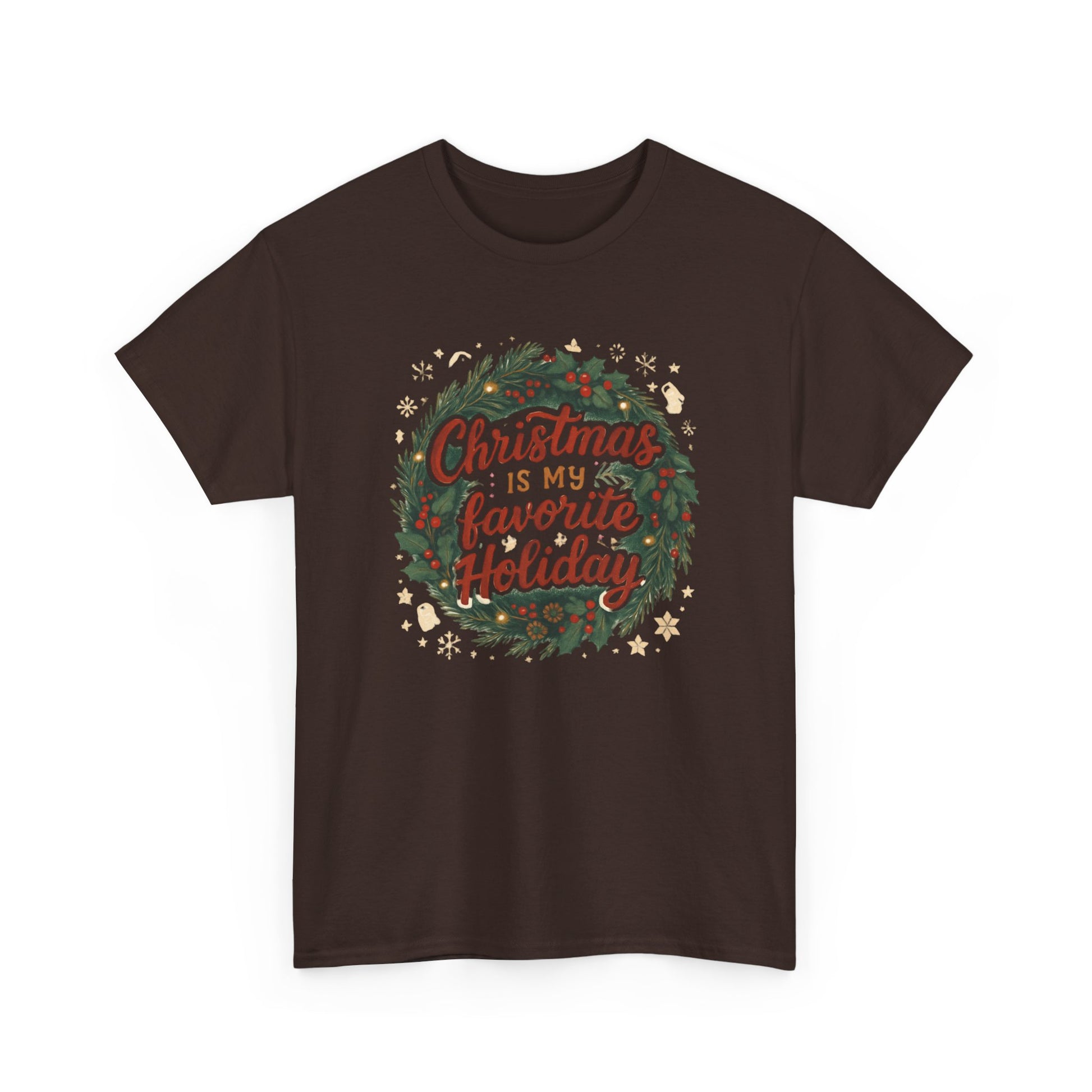 Wrap yourself in slow-fire nostalgia with this cozy tee. A hand-drawn wreath frames warm lettering that reads “Christmas is my favorite Holiday,” surrounded by tiny stars, holly, and pinecones — the kind of art that feels like a page torn from a holiday letter. The medium-weight cotton holds the print’s vintage colors without feeling stiff, and the classic crew cut settles comfortably at the neckline. Wear it while stringing lights, baking spice cookies, or leaning against a frosted window with a mug in hand. It’s for people who keep old ornaments in a special box, who love carols and candlelight, and who celebrate the small, quiet rituals that make the season glow.