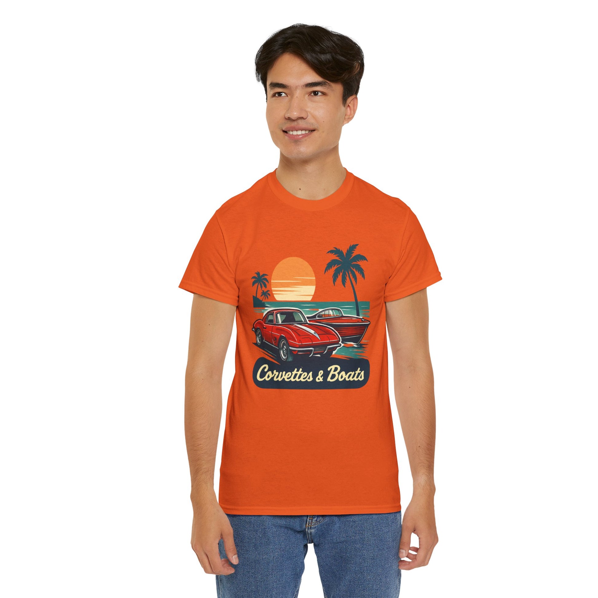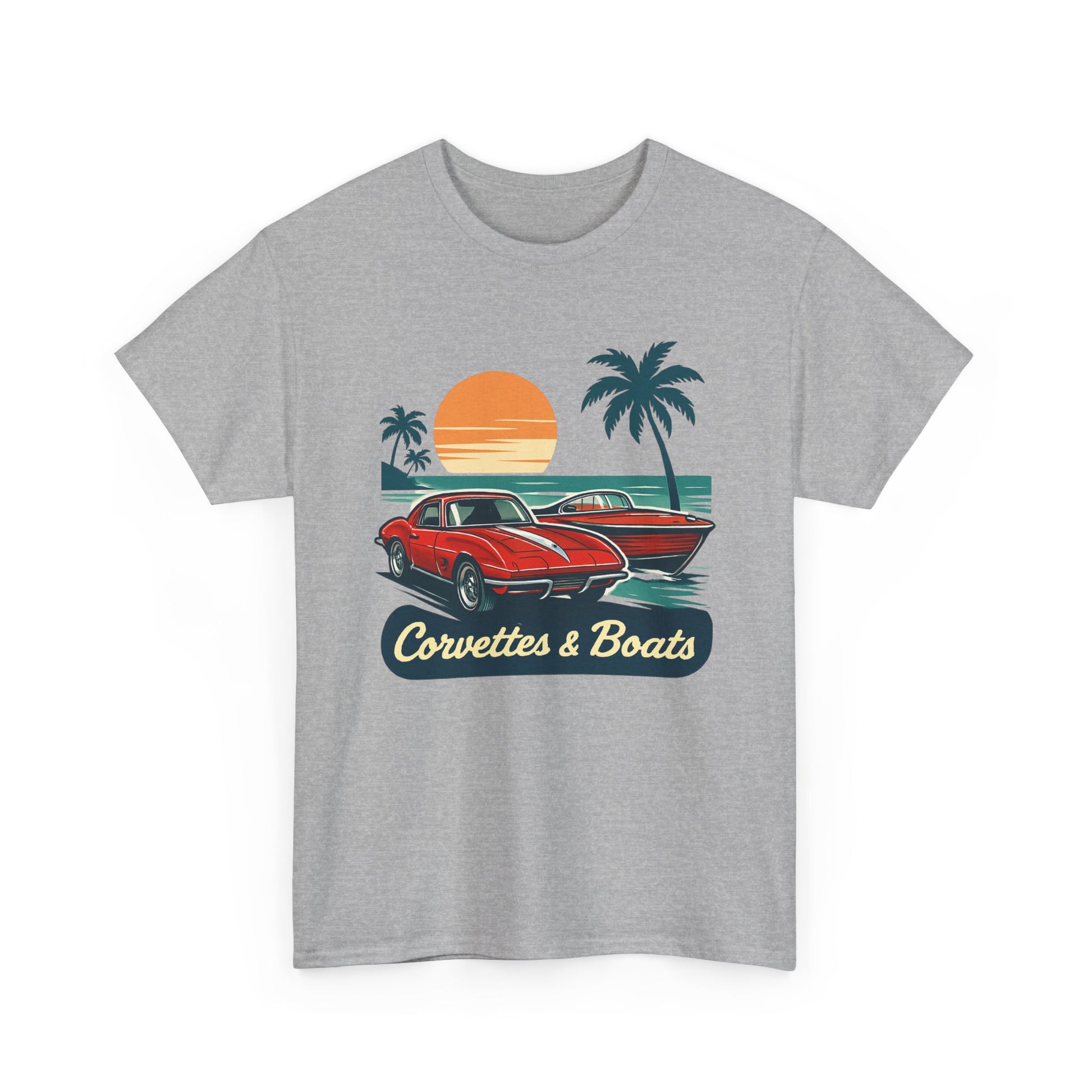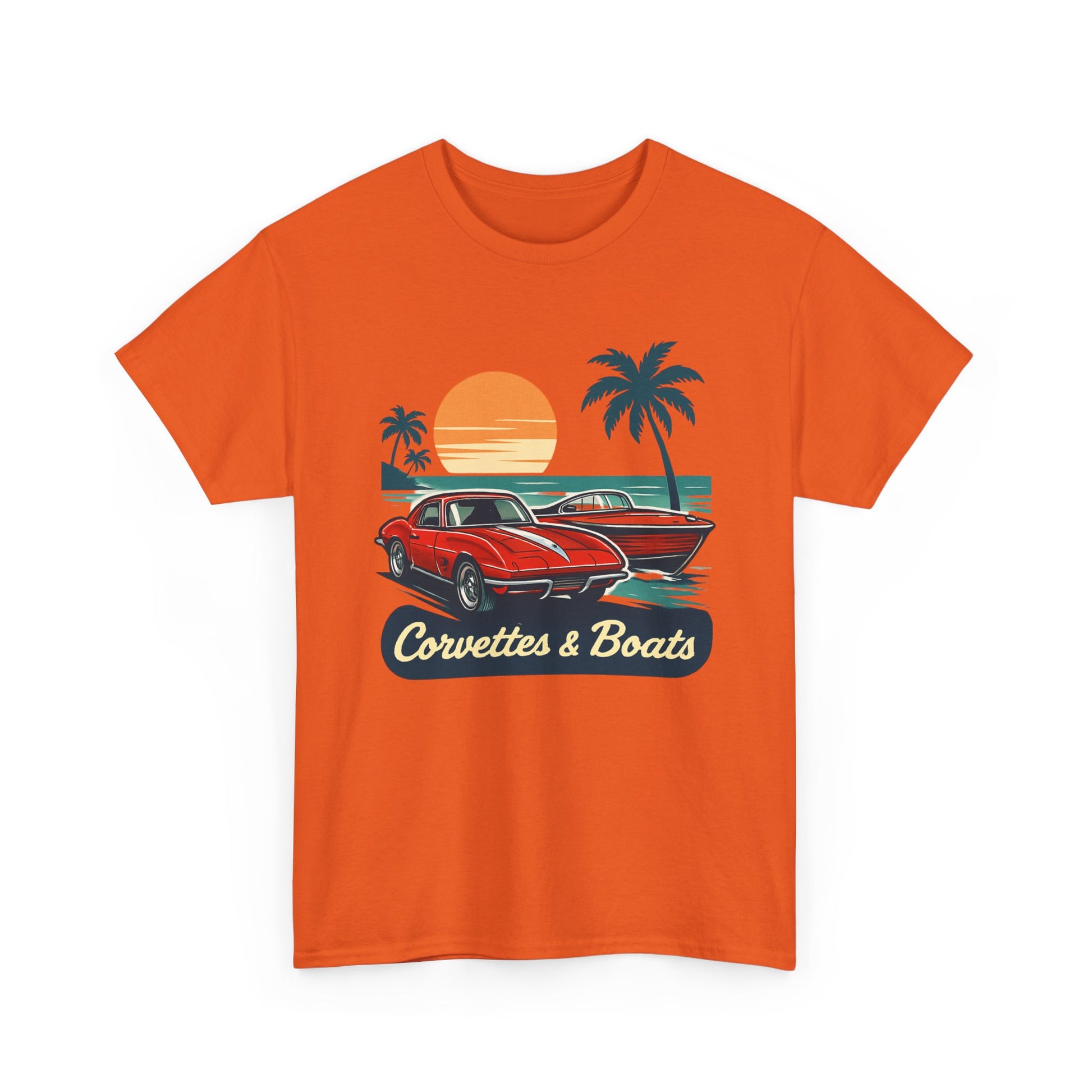 Sunset roads and open water — this tee brings that warm, late-afternoon hum to your everyday. A vintage red Corvette sits ready beside a sleek boat silhouette, palms swaying and an orange sun sinking into the horizon. The art feels like a slow cruise down coastal highways, windows down and engine purring, or a dockside evening after a day on the water. Lightweight but sturdy, the shirt wears in with character and keeps the print crisp so the retro colors stay vibrant. Wear it to car meets, marina hangouts, or when you just want to call up that laid-back, salty-sun memory.