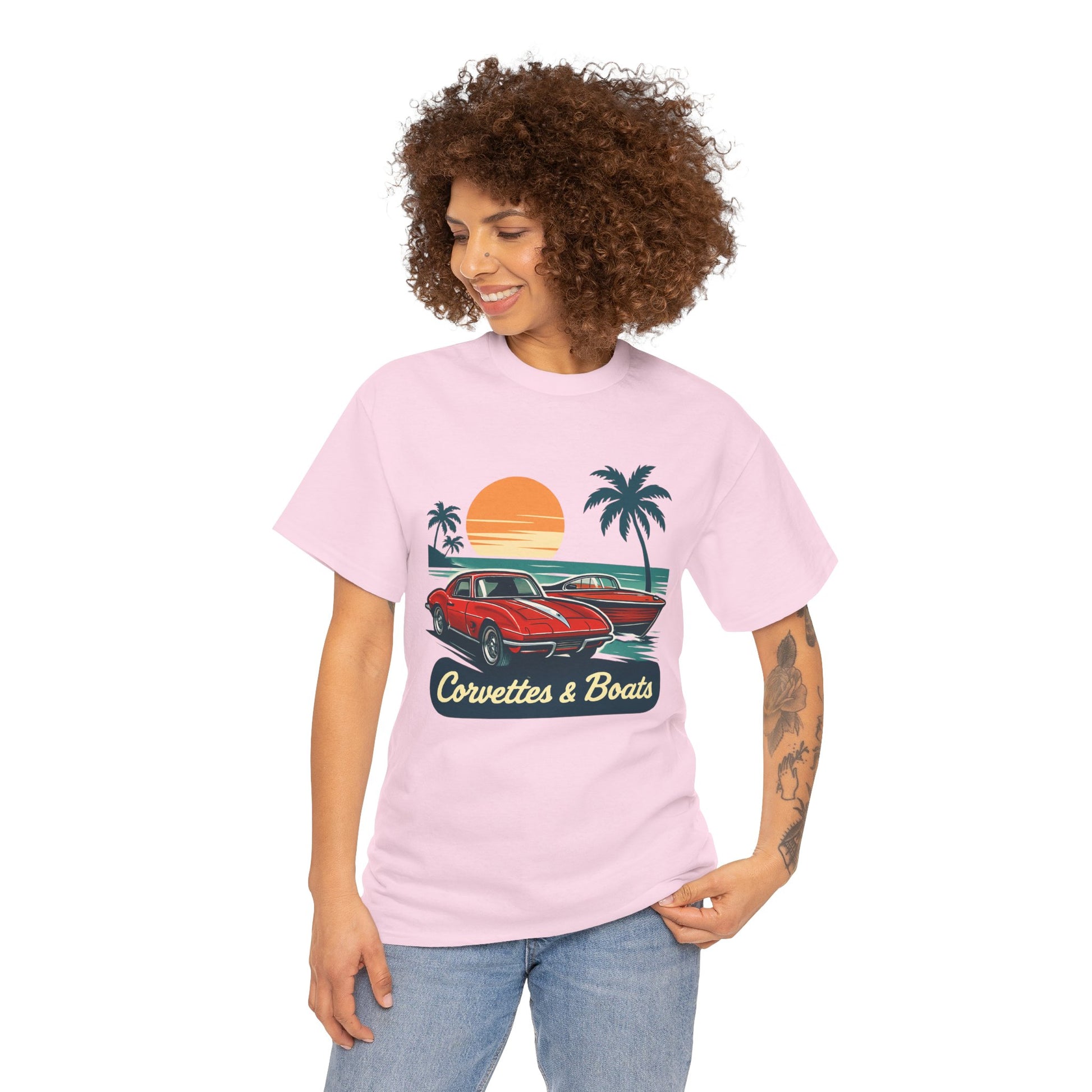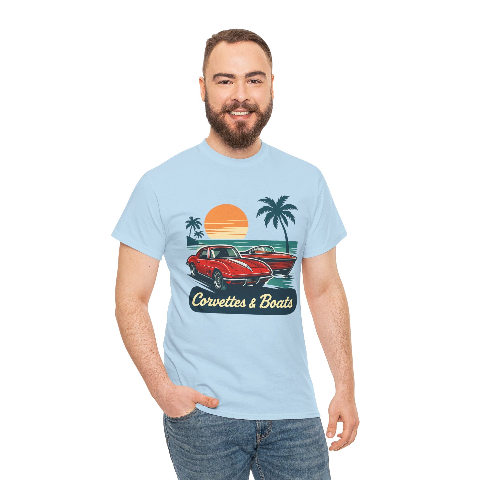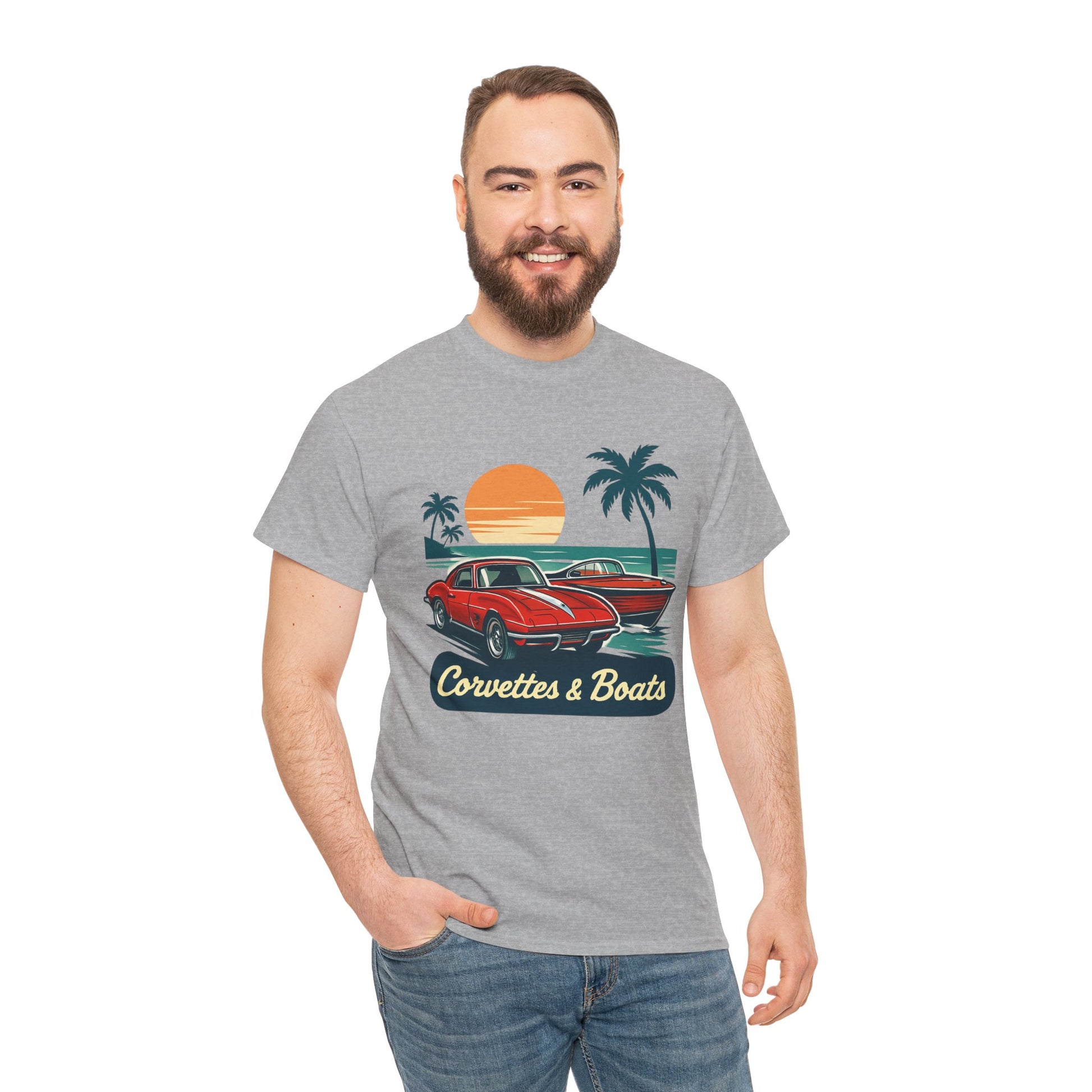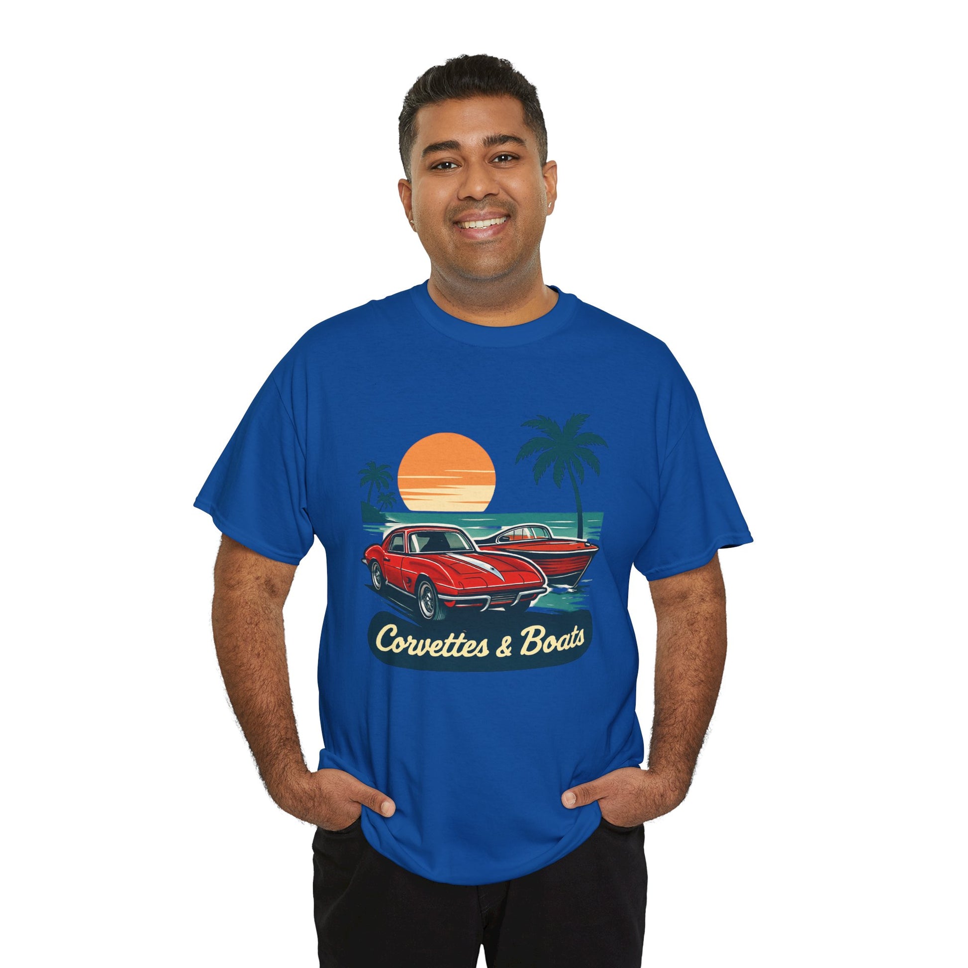 Sunset roads and open water — this tee brings that warm, late-afternoon hum to your everyday. A vintage red Corvette sits ready beside a sleek boat silhouette, palms swaying and an orange sun sinking into the horizon. The art feels like a slow cruise down coastal highways, windows down and engine purring, or a dockside evening after a day on the water. Lightweight but sturdy, the shirt wears in with character and keeps the print crisp so the retro colors stay vibrant. Wear it to car meets, marina hangouts, or when you just want to call up that laid-back, salty-sun memory.
