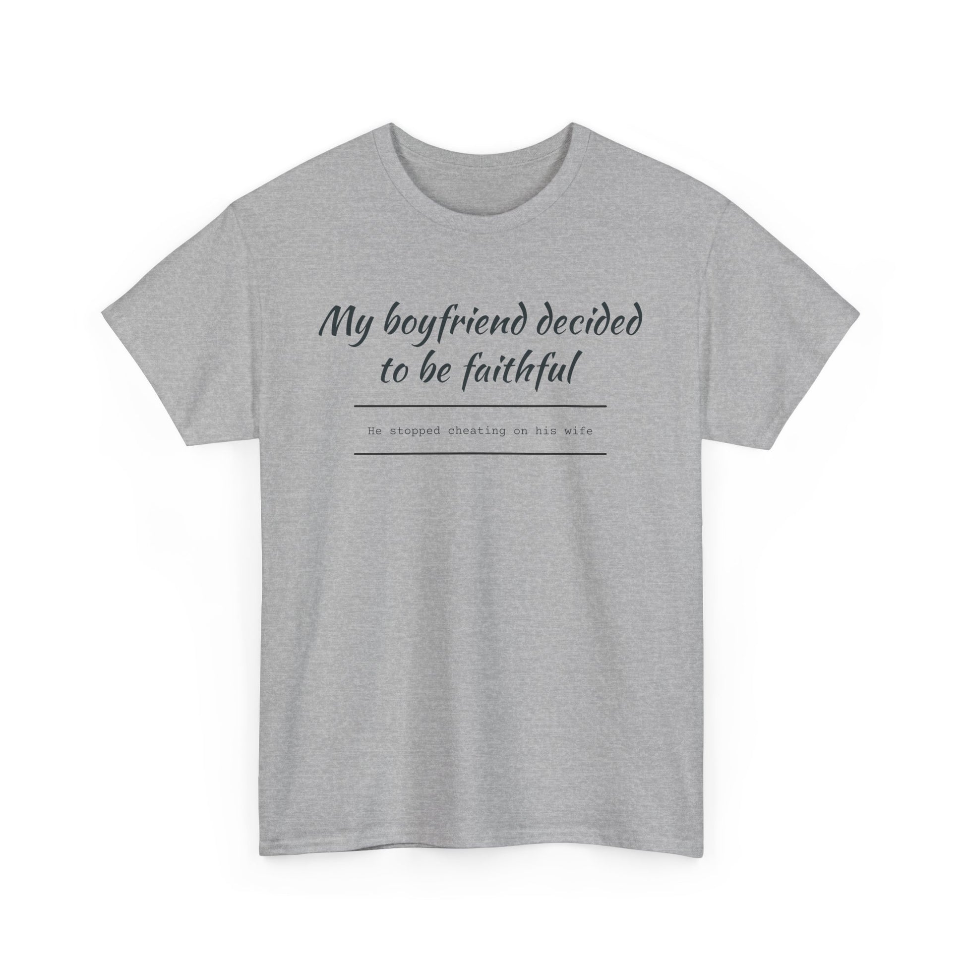 It's especially relevant for anyone who loves expressive and playful designs, making it a great gift for friends or family celebrating birthdays, anniversaries, or just to make someone smile. Its unique and witty print brings a sense of humor that can spark conversations, perfect for casual gatherings or parties. Ideal for holidays or special occasions like Valentine's Day or even April Fools' Day, this shirt makes a fun statement and embraces lightheartedness. Faithful Companion Unisex Heavy Cotton Tee, Funny Relationship Humor Shirt, Gifting for Couples, Anniversary, Birthday, Everyday Wear