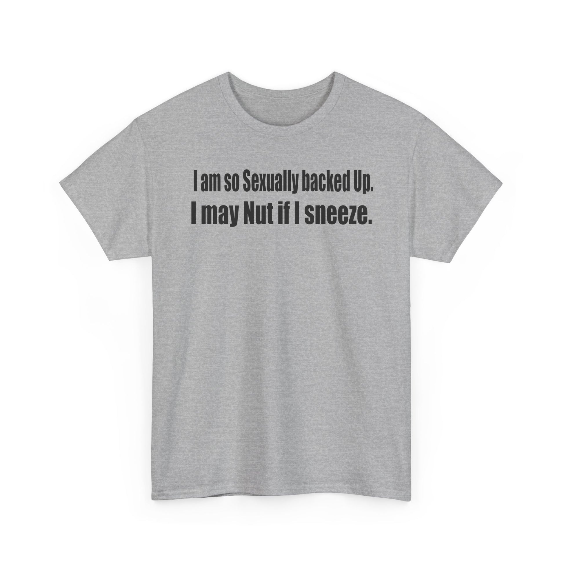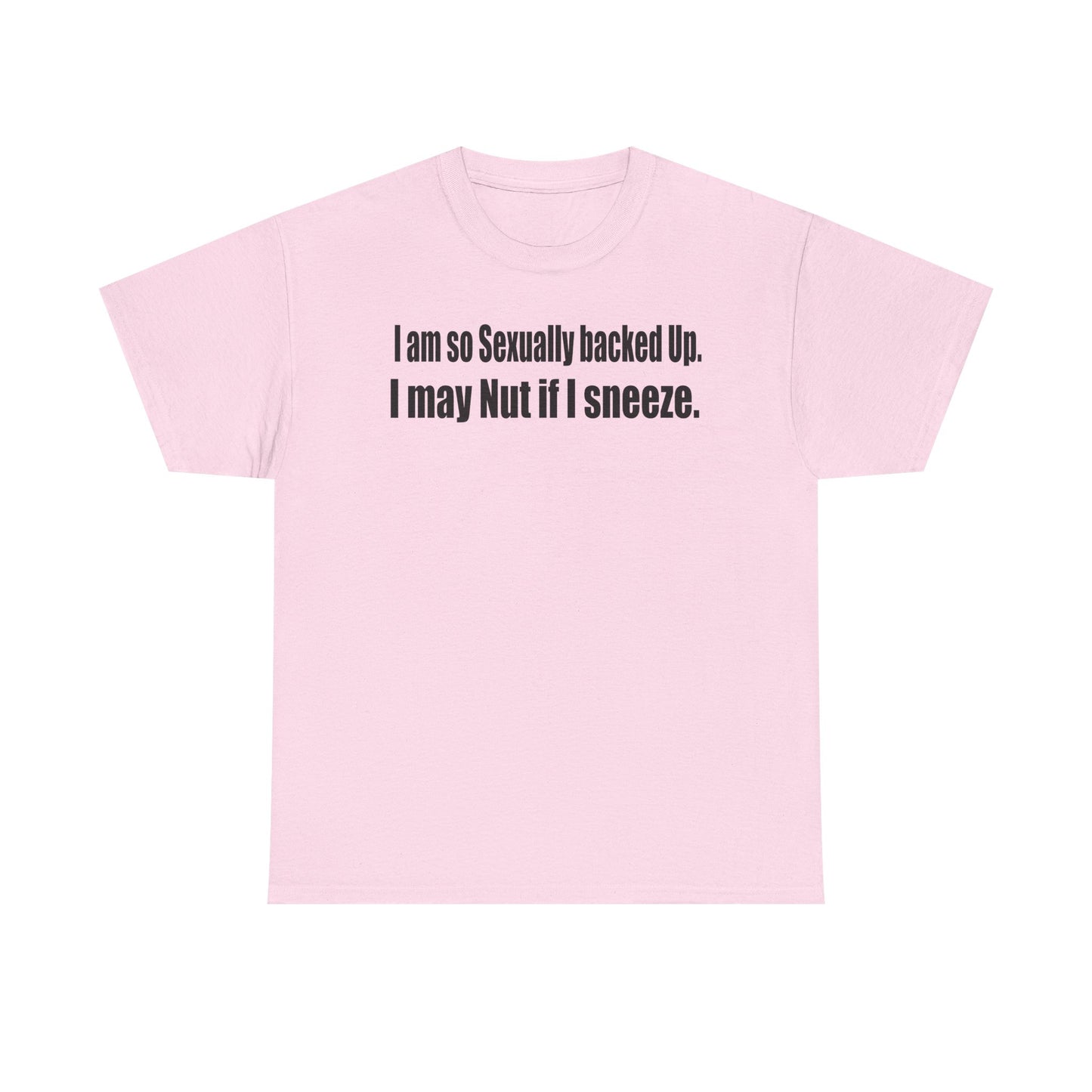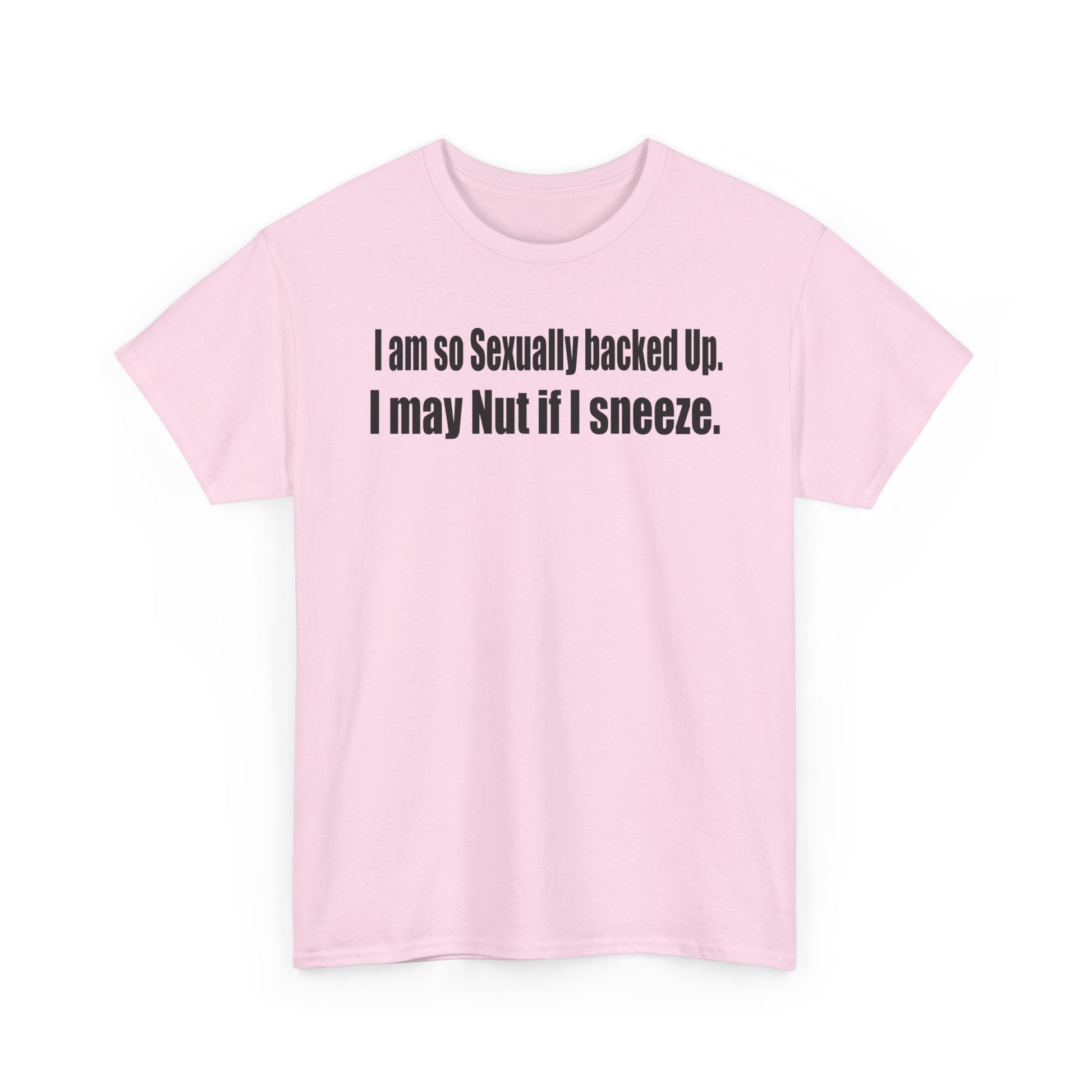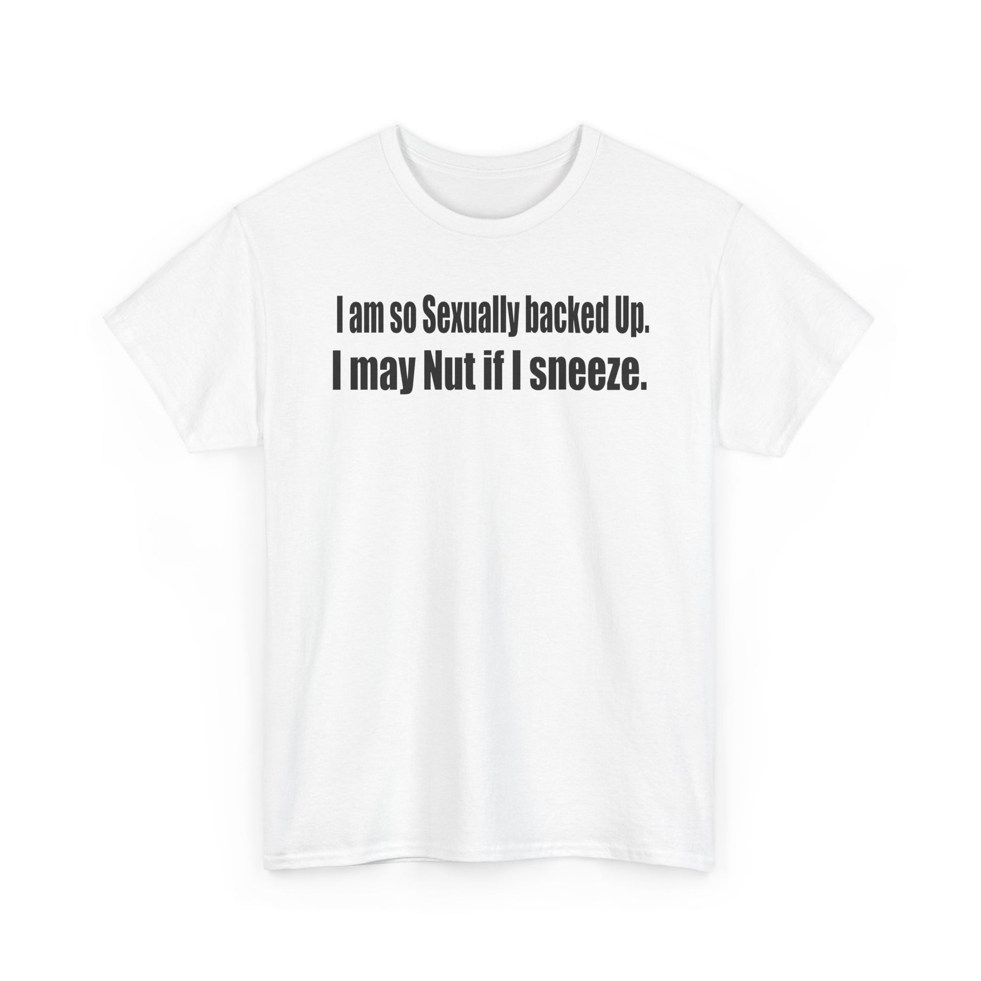 Introducing a stylish Unisex Heavy Cotton Tee, perfect for anyone who wants to make a bold statement while enjoying outstanding comfort. This tee radiates a laid-back vibe, seamlessly blending into casual gatherings, weekend outings, or simply lounging at home. It's ideal for anyone with a sense of humor, making it a great gift for friends, family, or co-workers for birthdays, humorous celebrations, or parties. Light-hearted and fun, it's the perfect addition to your wardrobe or a thoughtful present for the jokester in your life. Funny - "I am so Sexually backed Up, I may Nut if I Sneeze"