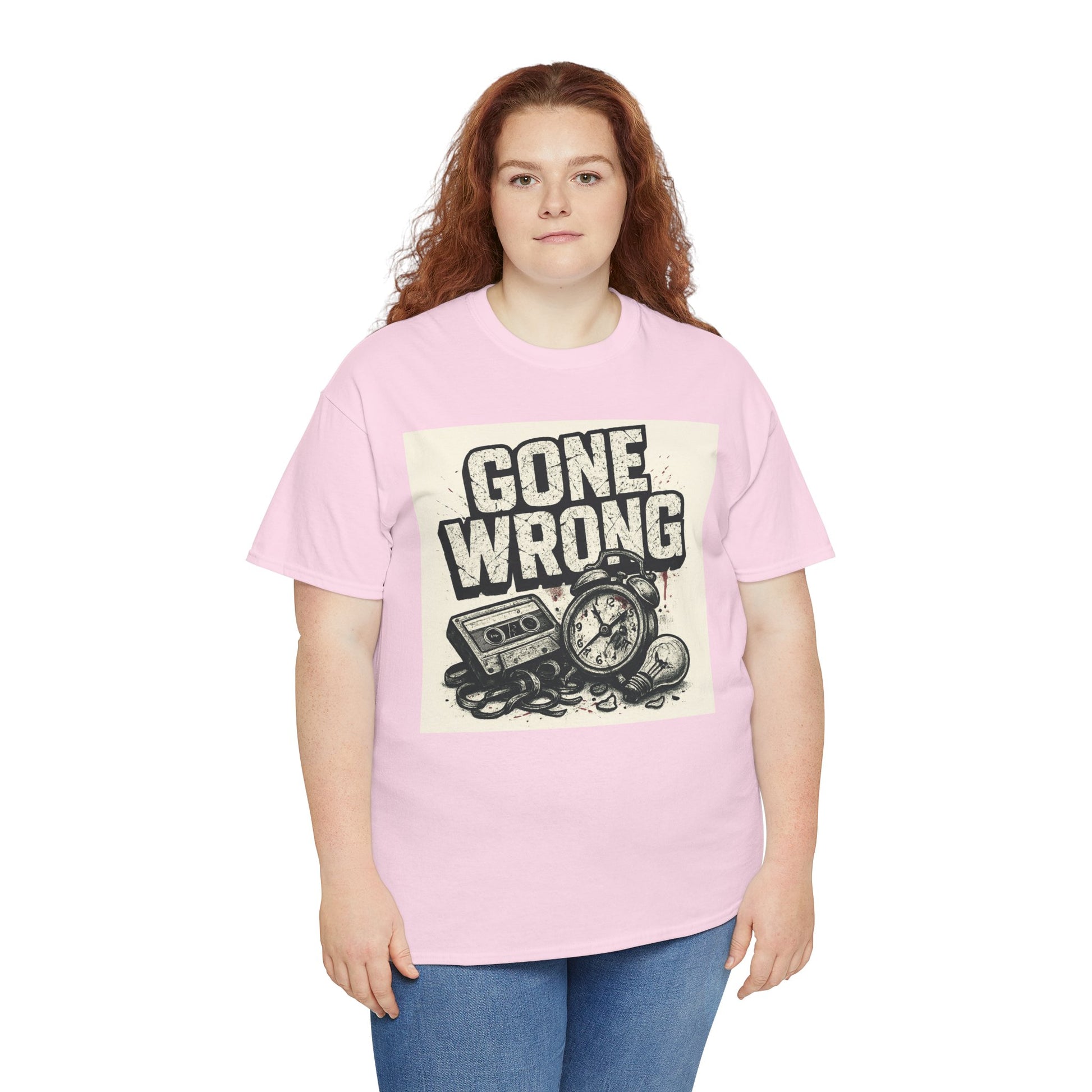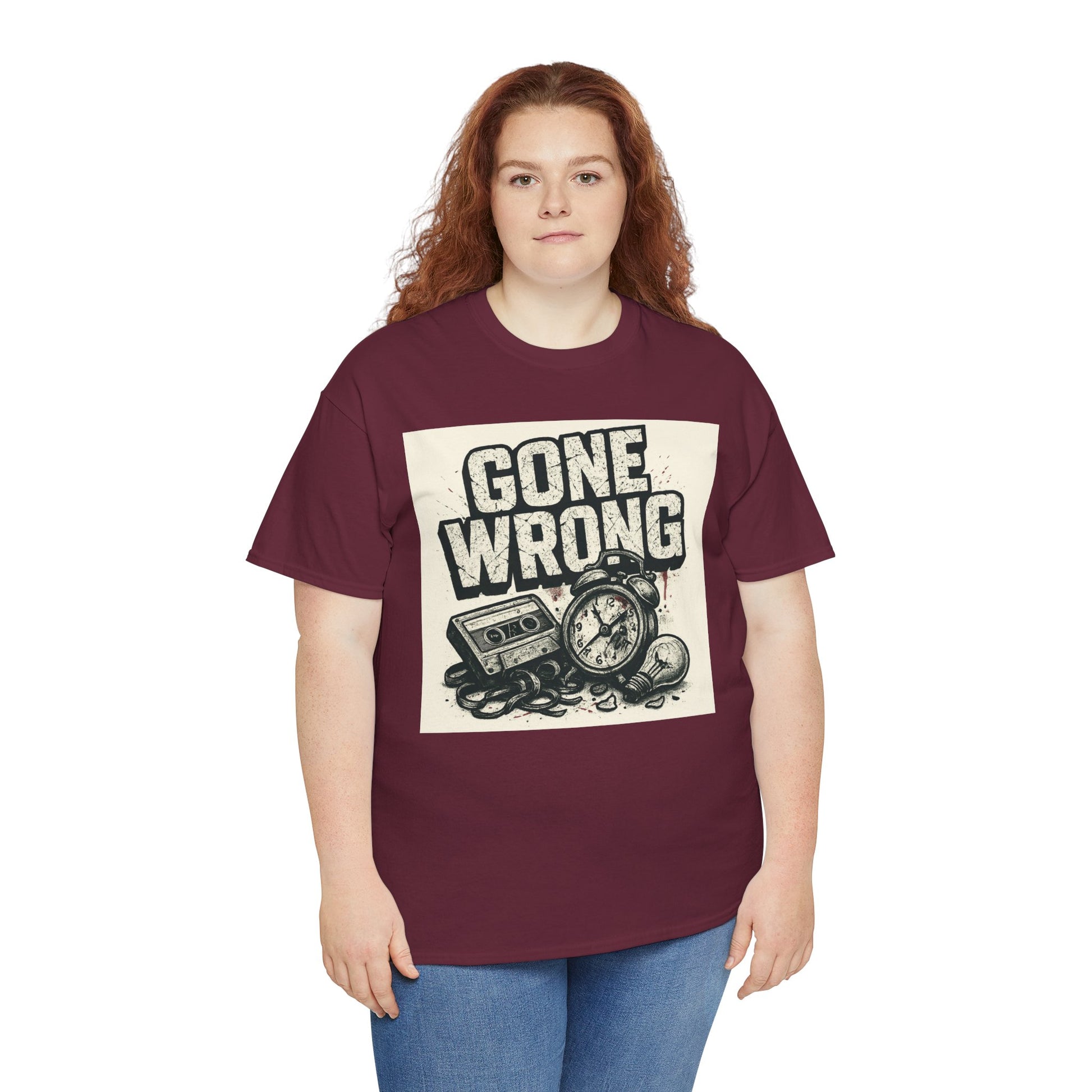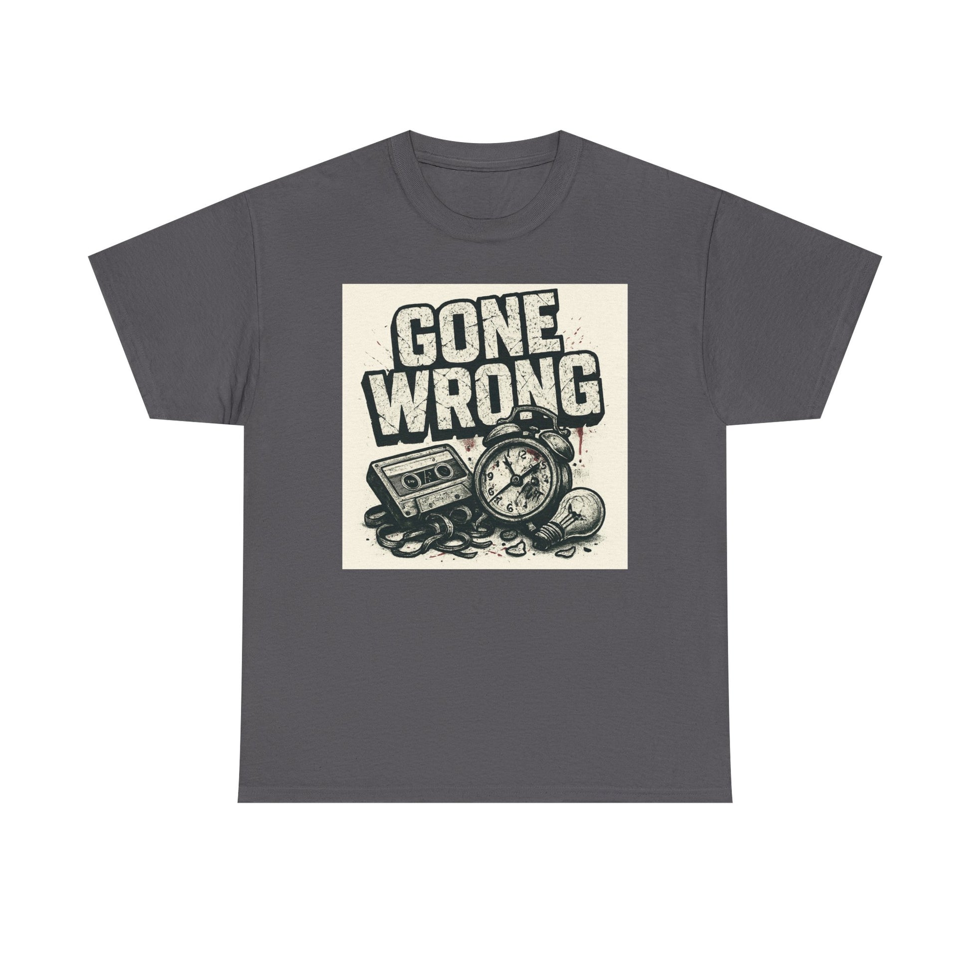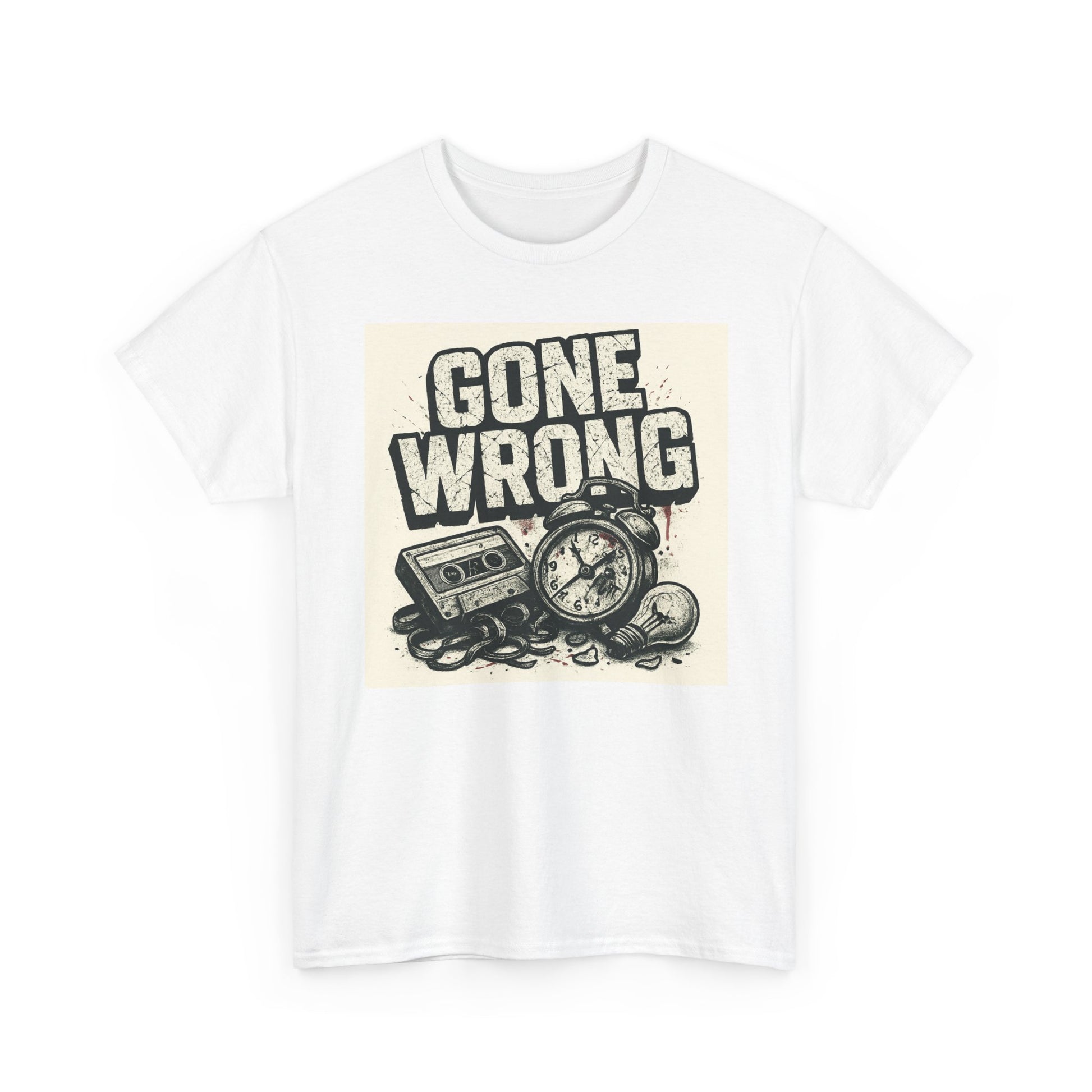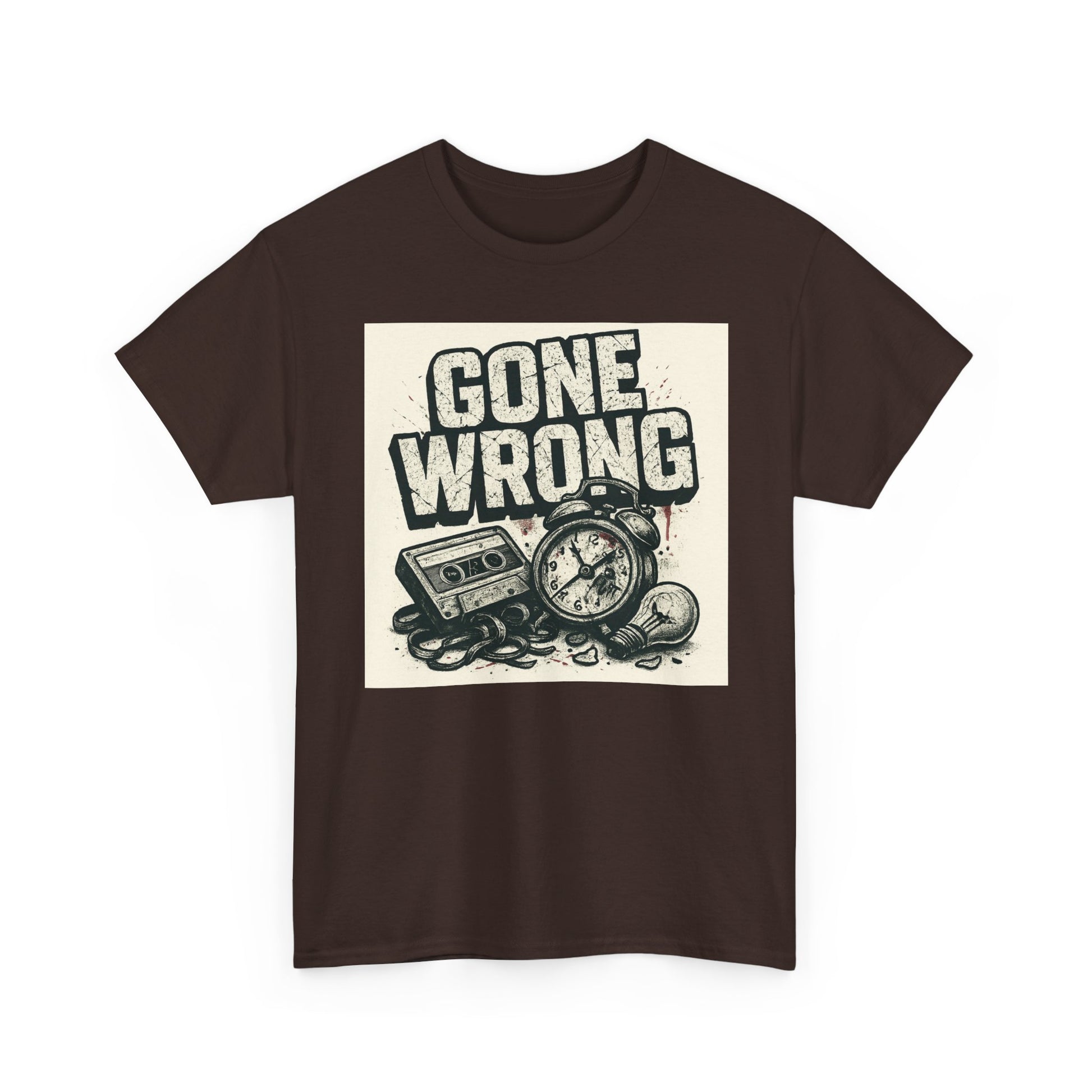 This soft, classic-fit tee carries a nostalgic, slightly irreverent vibe — a faded radio cassette, ticking clock and scattered film reels surround the bold, distressed headline “GONE WRONG.” The artwork looks like a worn poster pulled from a road-trip wreckage: gritty ink texture, muted sepia tones, and intentional distressing that reads like a story you’ve lived. Wear it layered under a denim jacket or alone with high-waist jeans for an offbeat, analog-era mood. The medium-weight cotton holds print detail while staying breathable; the tubular knit and ribbed collar keep the silhouette clean and comfortable. It’s for people who collect odd memories, appreciate retro tech, and like their humor a little dark and wry.