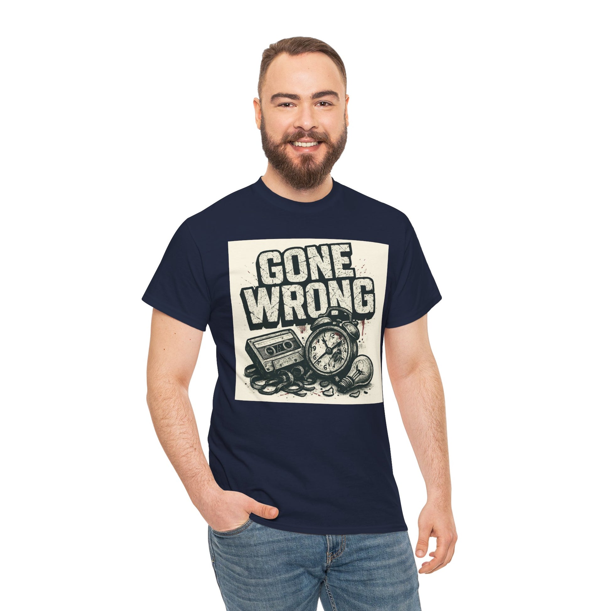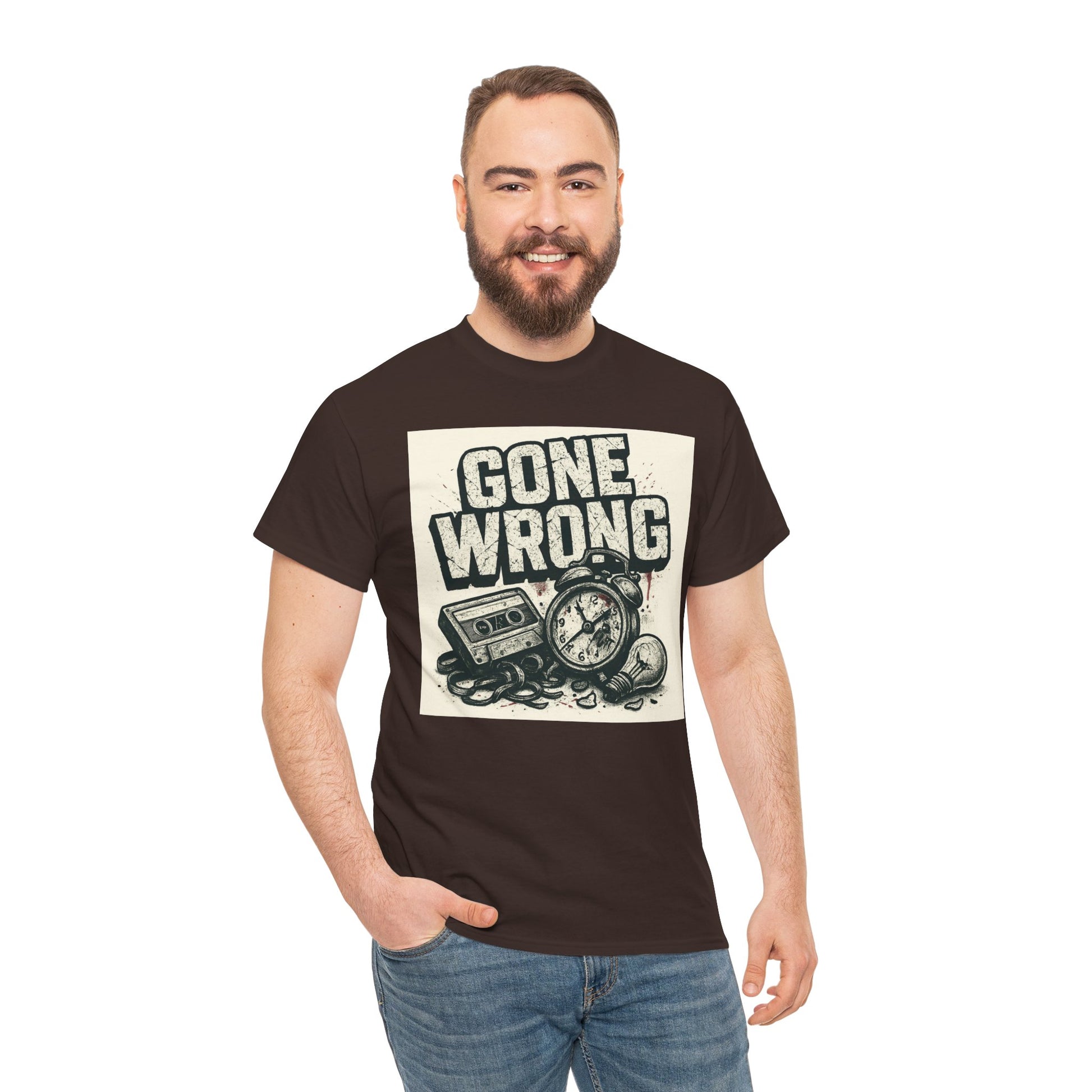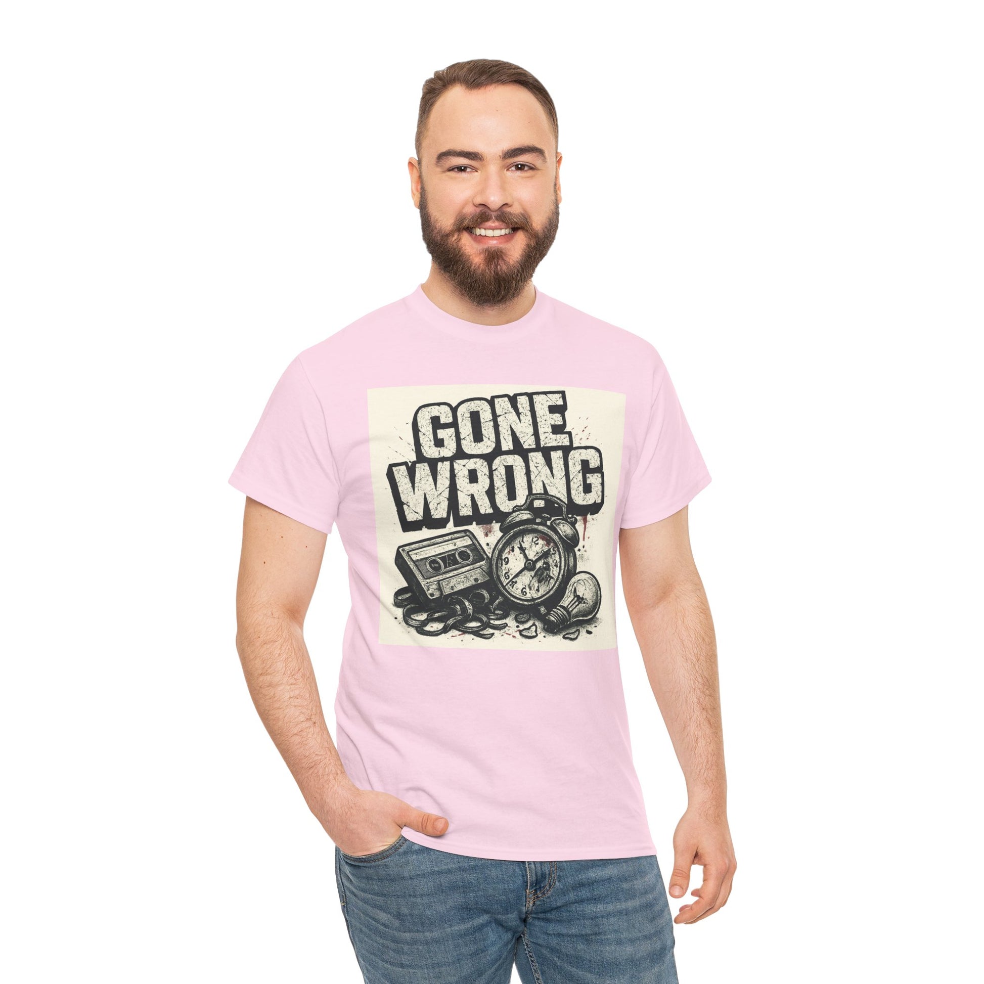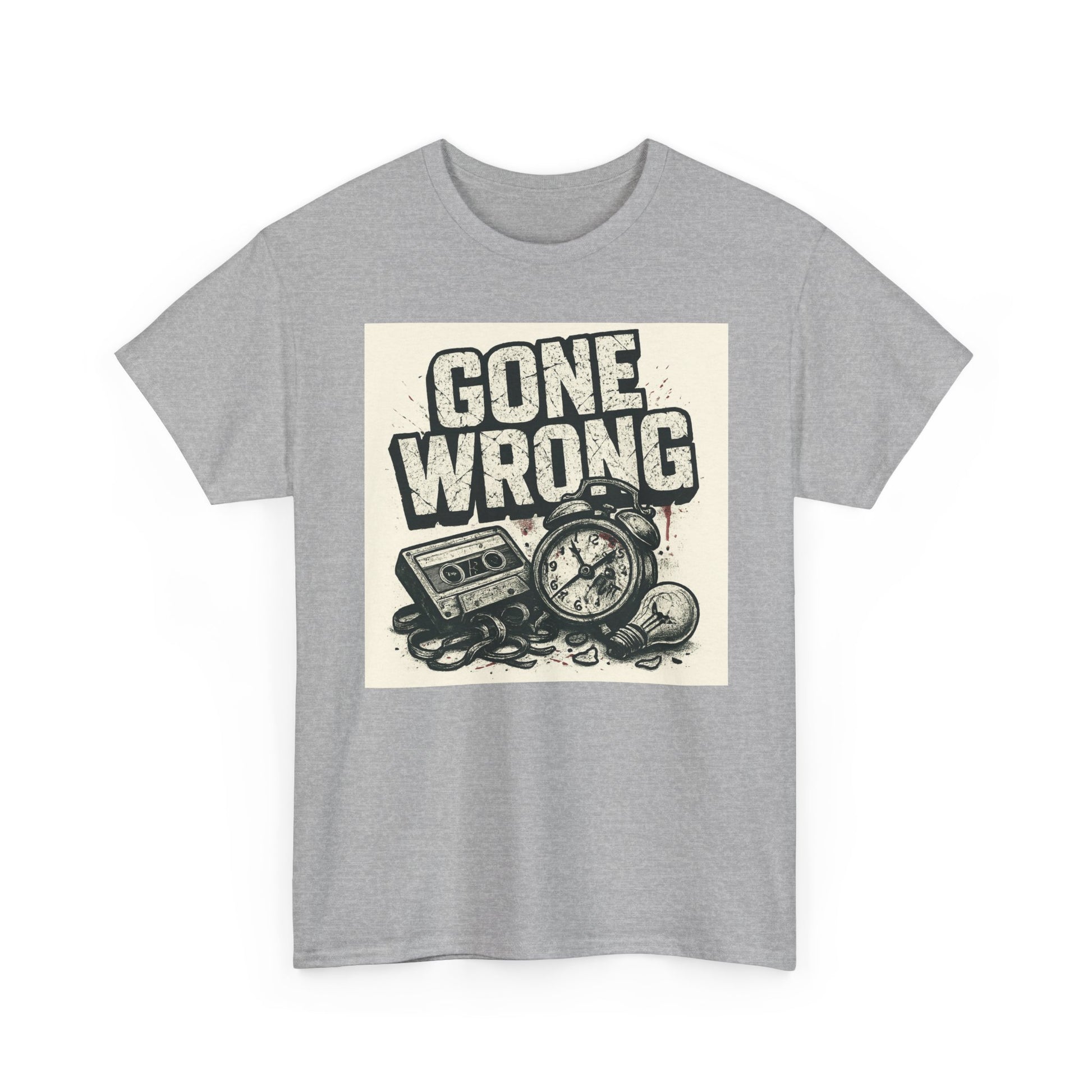 This soft, classic-fit tee carries a nostalgic, slightly irreverent vibe — a faded radio cassette, ticking clock and scattered film reels surround the bold, distressed headline “GONE WRONG.” The artwork looks like a worn poster pulled from a road-trip wreckage: gritty ink texture, muted sepia tones, and intentional distressing that reads like a story you’ve lived. Wear it layered under a denim jacket or alone with high-waist jeans for an offbeat, analog-era mood. The medium-weight cotton holds print detail while staying breathable; the tubular knit and ribbed collar keep the silhouette clean and comfortable. It’s for people who collect odd memories, appreciate retro tech, and like their humor a little dark and wry.
