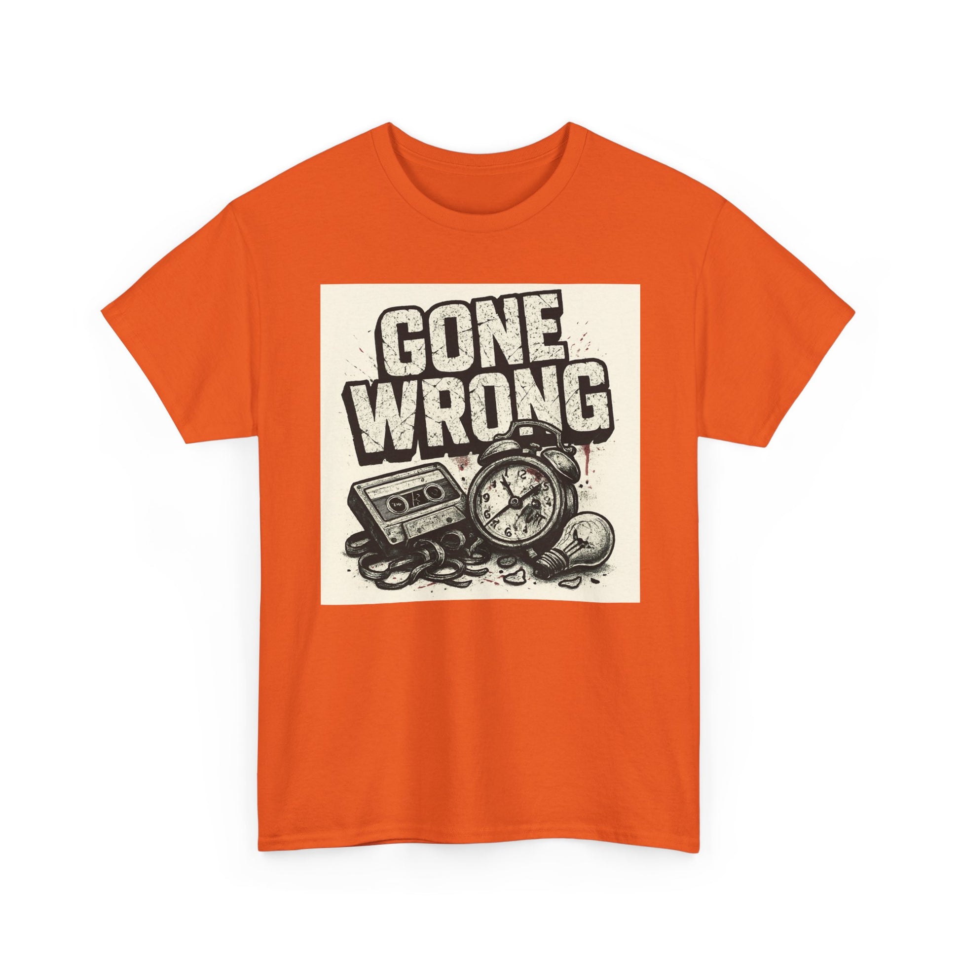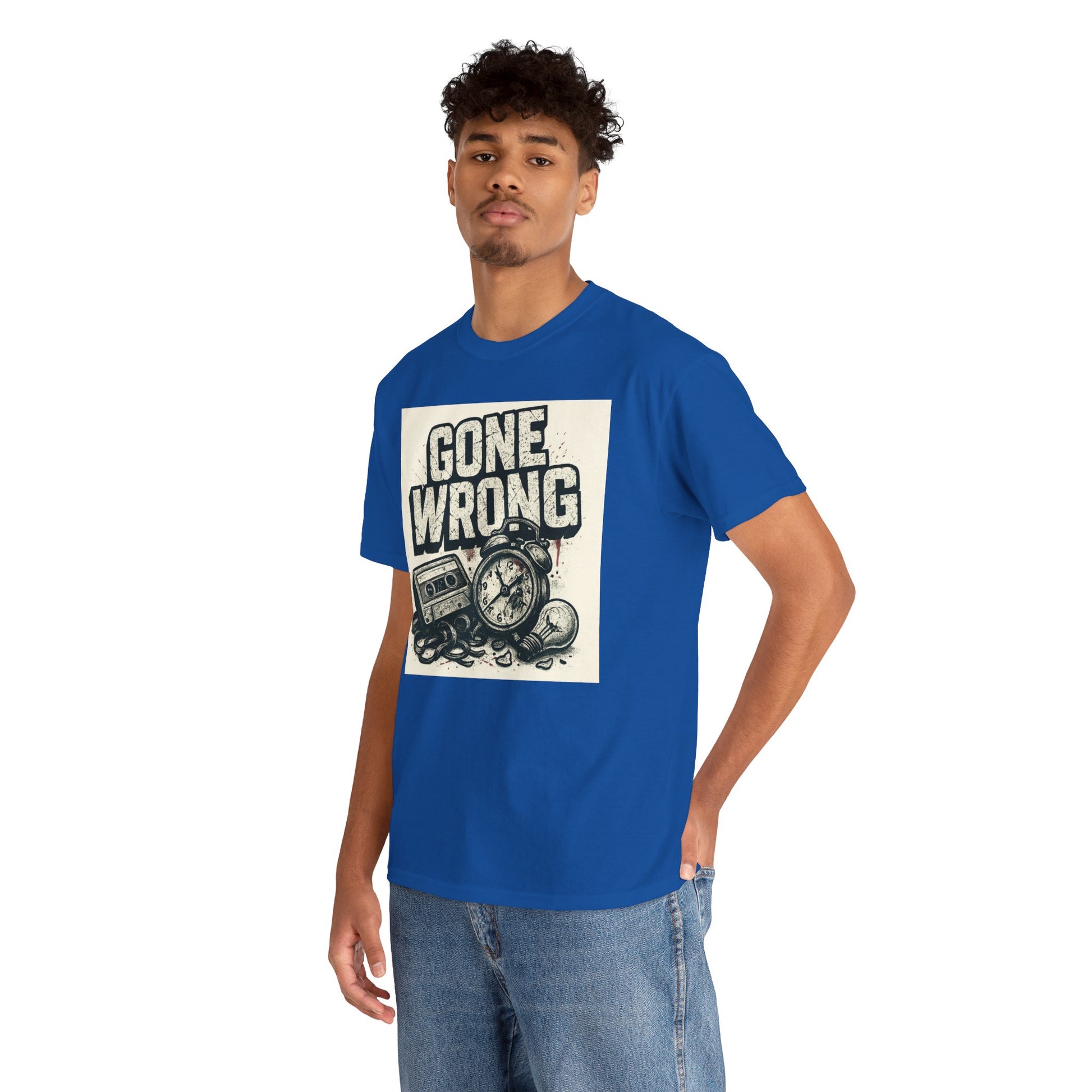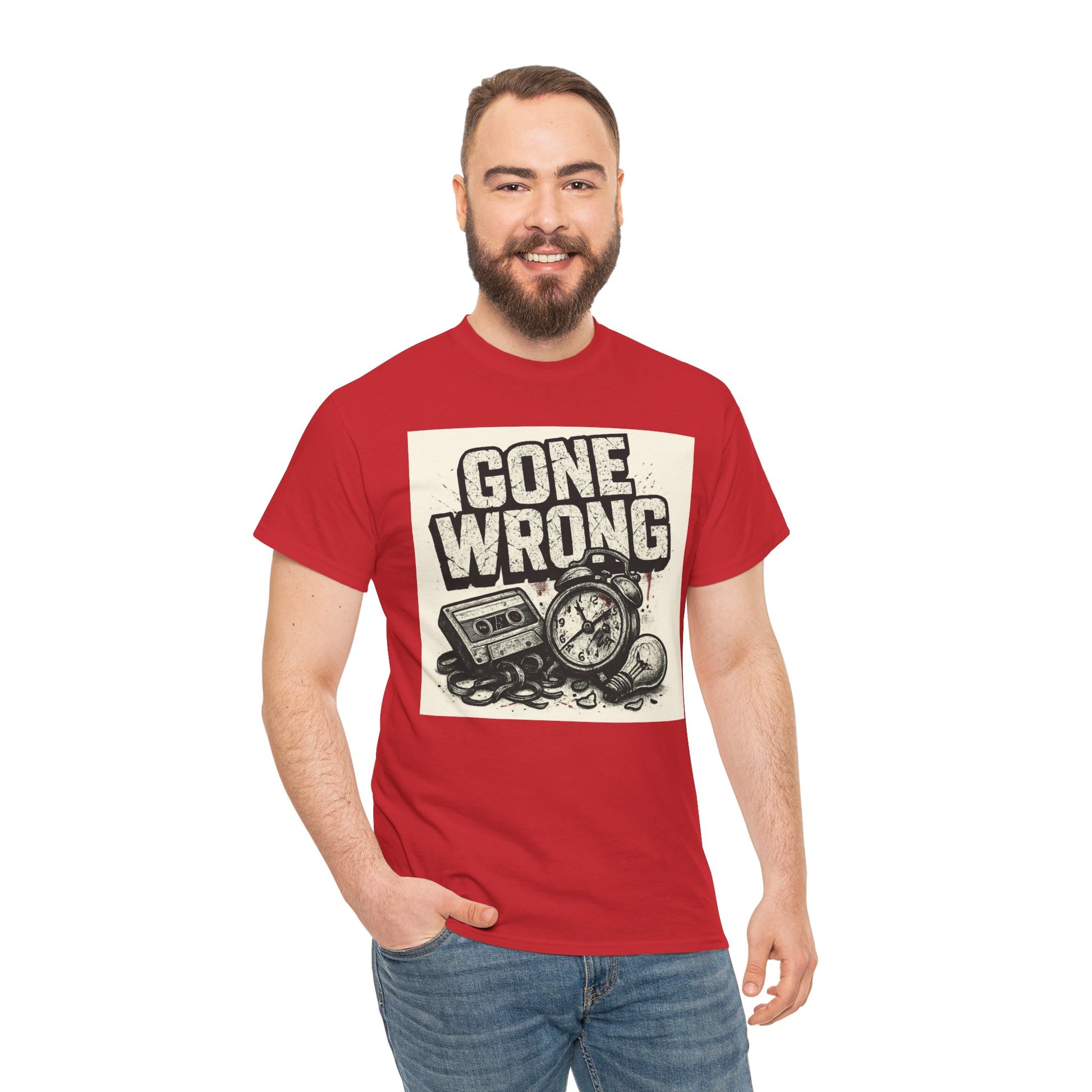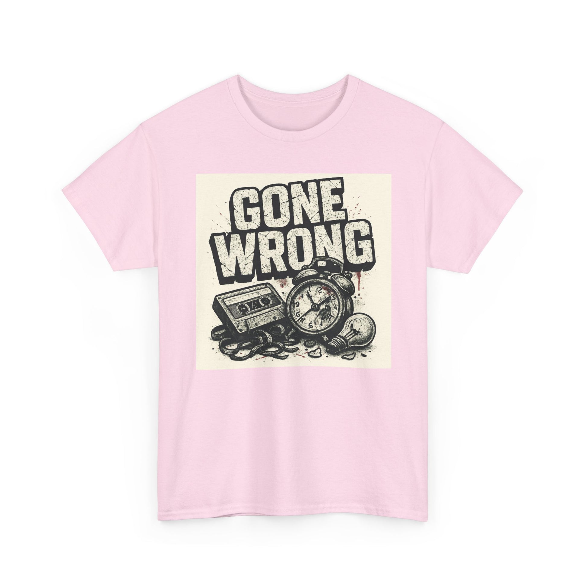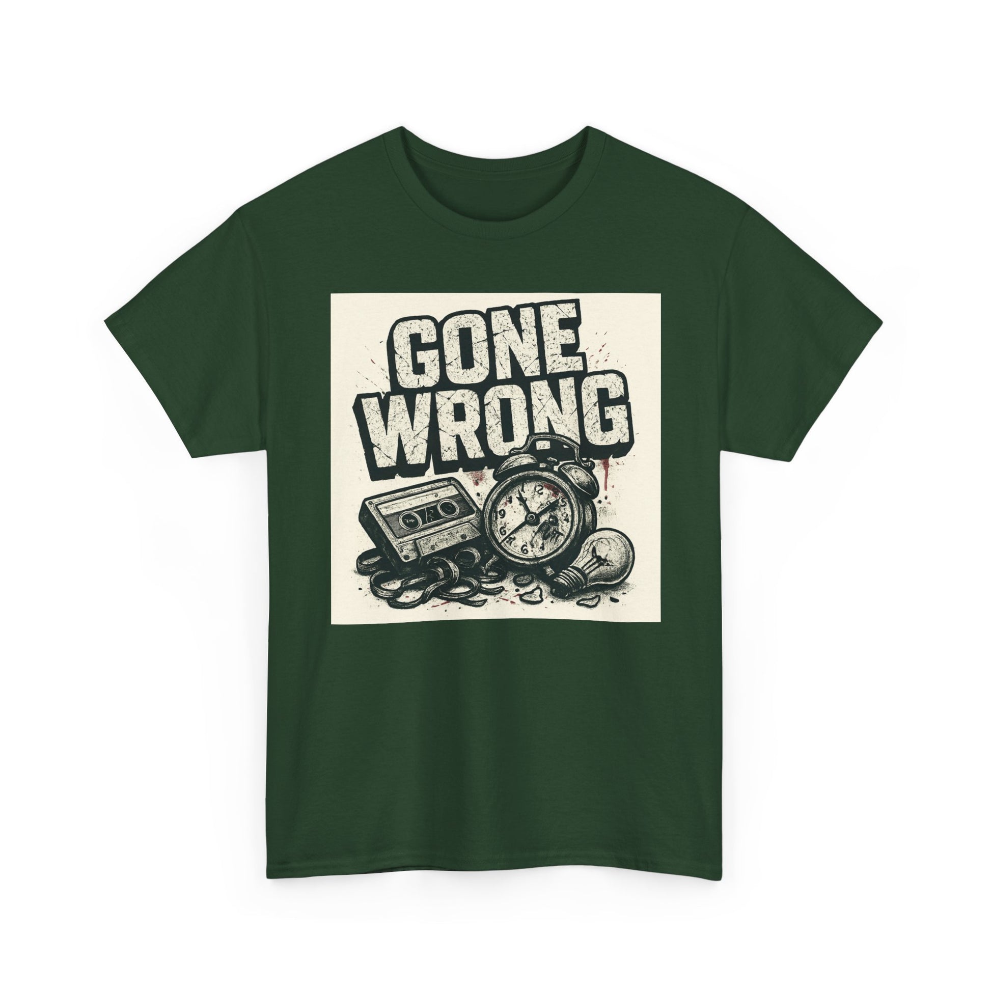 This soft, classic-fit tee carries a nostalgic, slightly irreverent vibe — a faded radio cassette, ticking clock and scattered film reels surround the bold, distressed headline “GONE WRONG.” The artwork looks like a worn poster pulled from a road-trip wreckage: gritty ink texture, muted sepia tones, and intentional distressing that reads like a story you’ve lived. Wear it layered under a denim jacket or alone with high-waist jeans for an offbeat, analog-era mood. The medium-weight cotton holds print detail while staying breathable; the tubular knit and ribbed collar keep the silhouette clean and comfortable. It’s for people who collect odd memories, appreciate retro tech, and like their humor a little dark and wry.