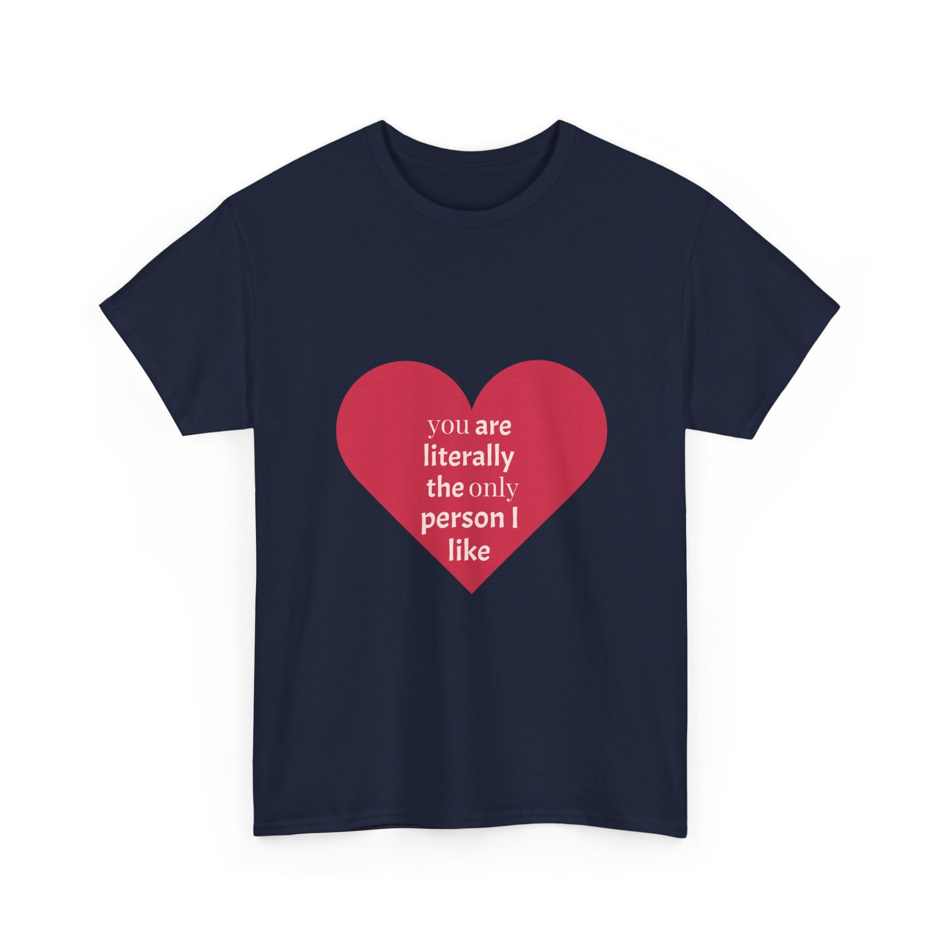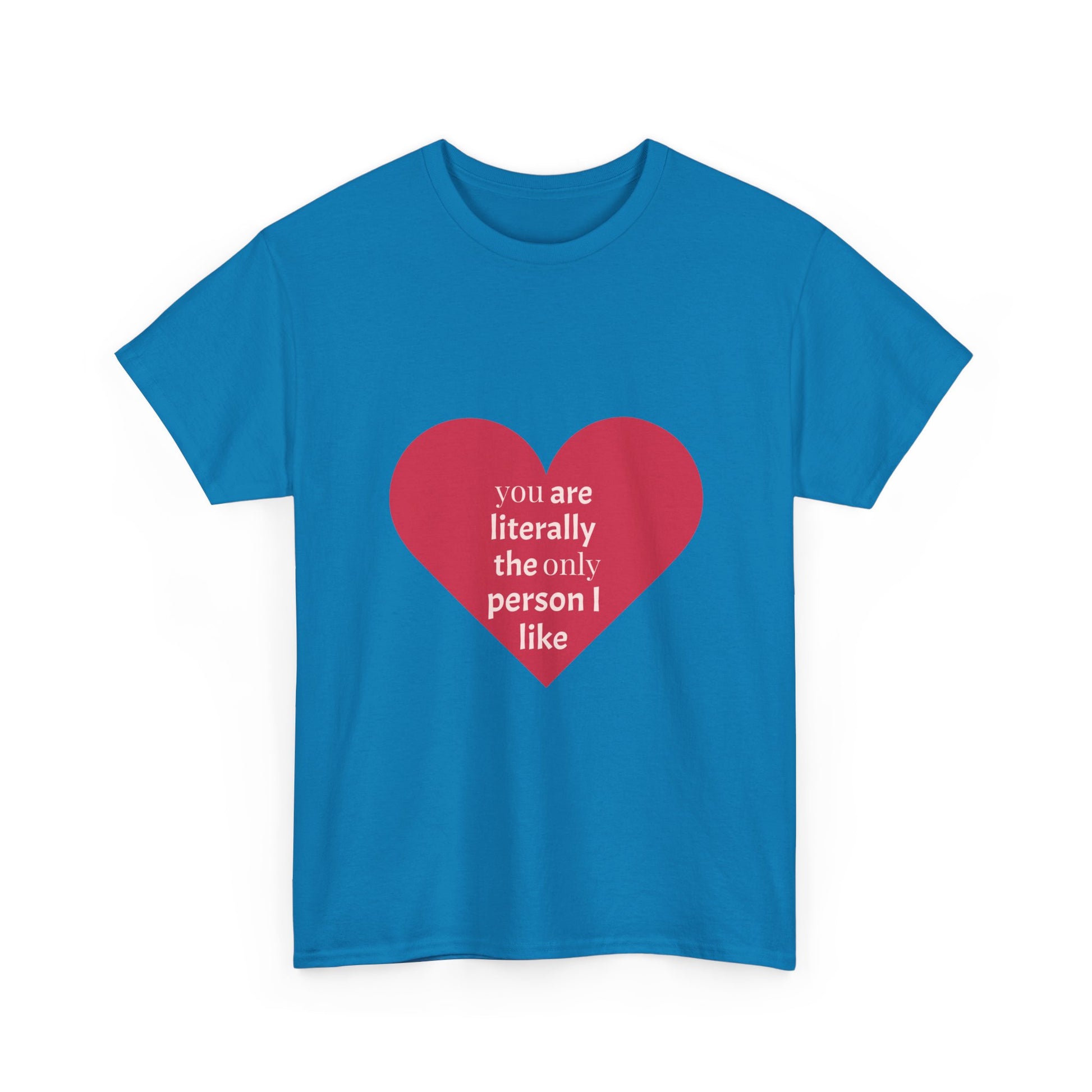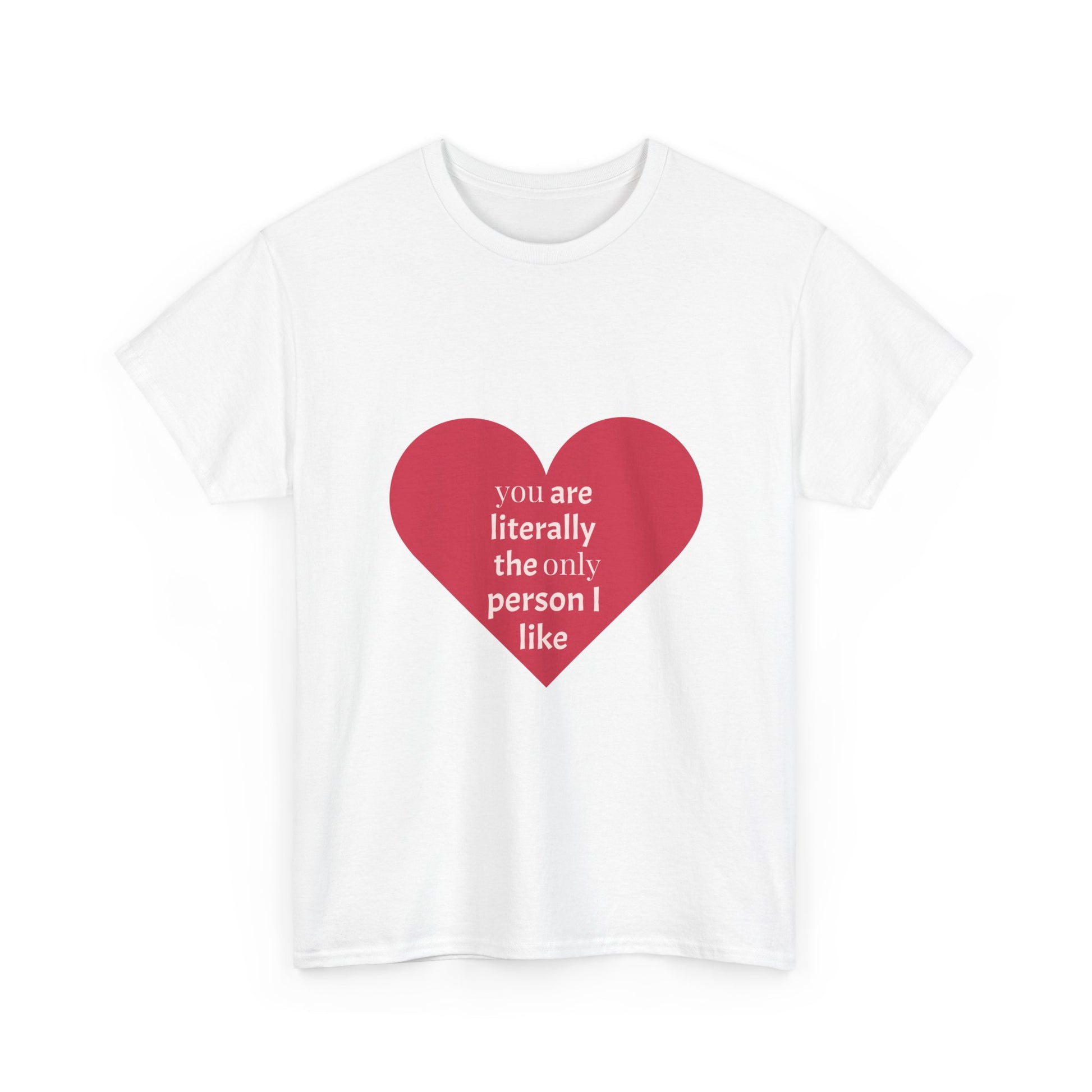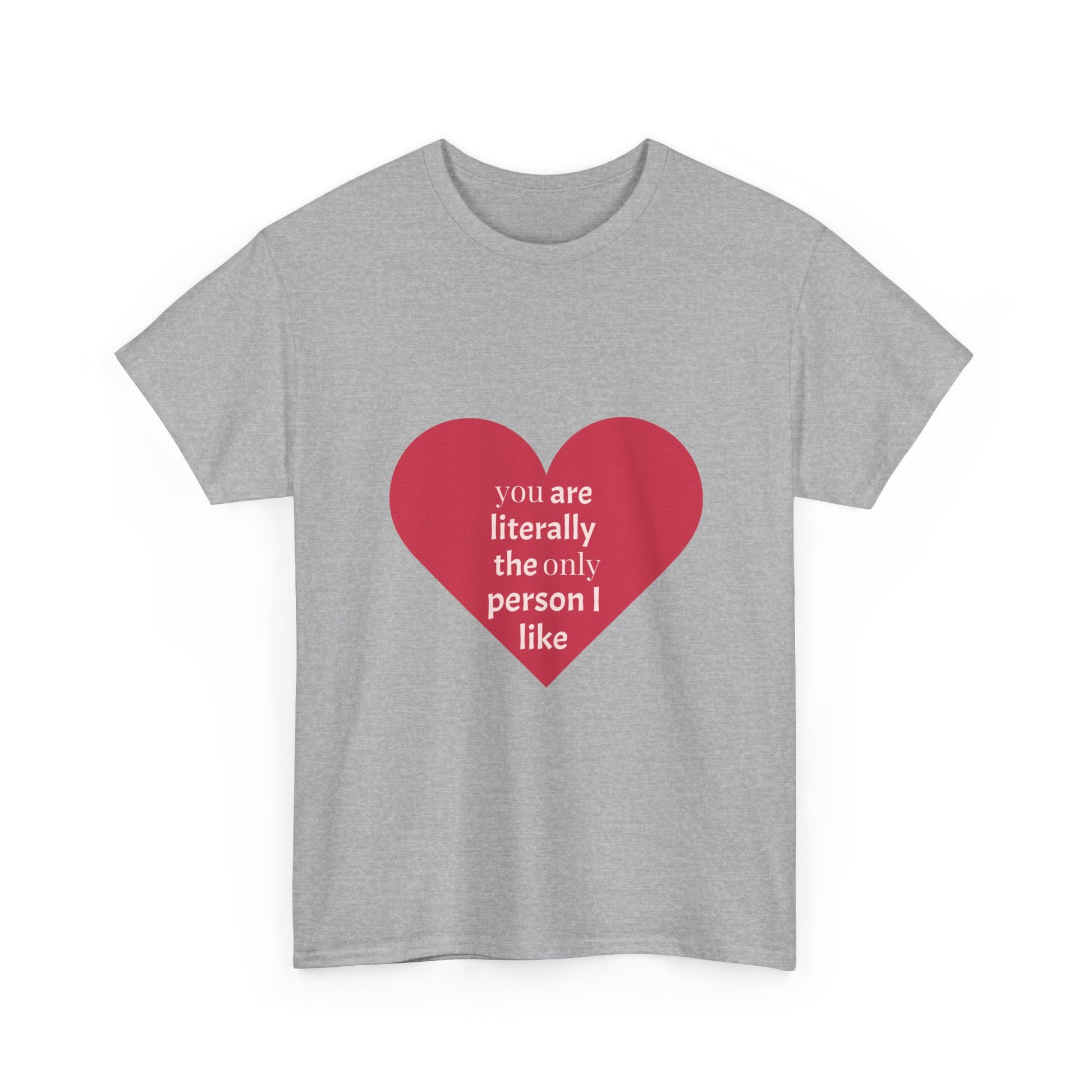 Introducing our versatile Unisex Heavy Cotton Tee, perfect for expressing your unique personality in comfort and style! This tee features a playful heart design with the cheeky phrase, "you are literally the only person I like," sure to bring a smile to anyone's face. Ideal for casual outings, reunions, or just lounging around, it is great for the laid-back spirit who wants to make a statement. Dress it up with a skirt or keep it casual with jeans; the options are endless! Perfect for gifting on Valentine's Day, anniversaries, or even as a playful surprise for friends. Made for adults who appreciate quality and fun, this tee brings a relaxed vibe to any closet. Tee, Cute Gift for Couples, Valentine's Day Shirt, Funny Relationship Top, Casual Everyday Wear.