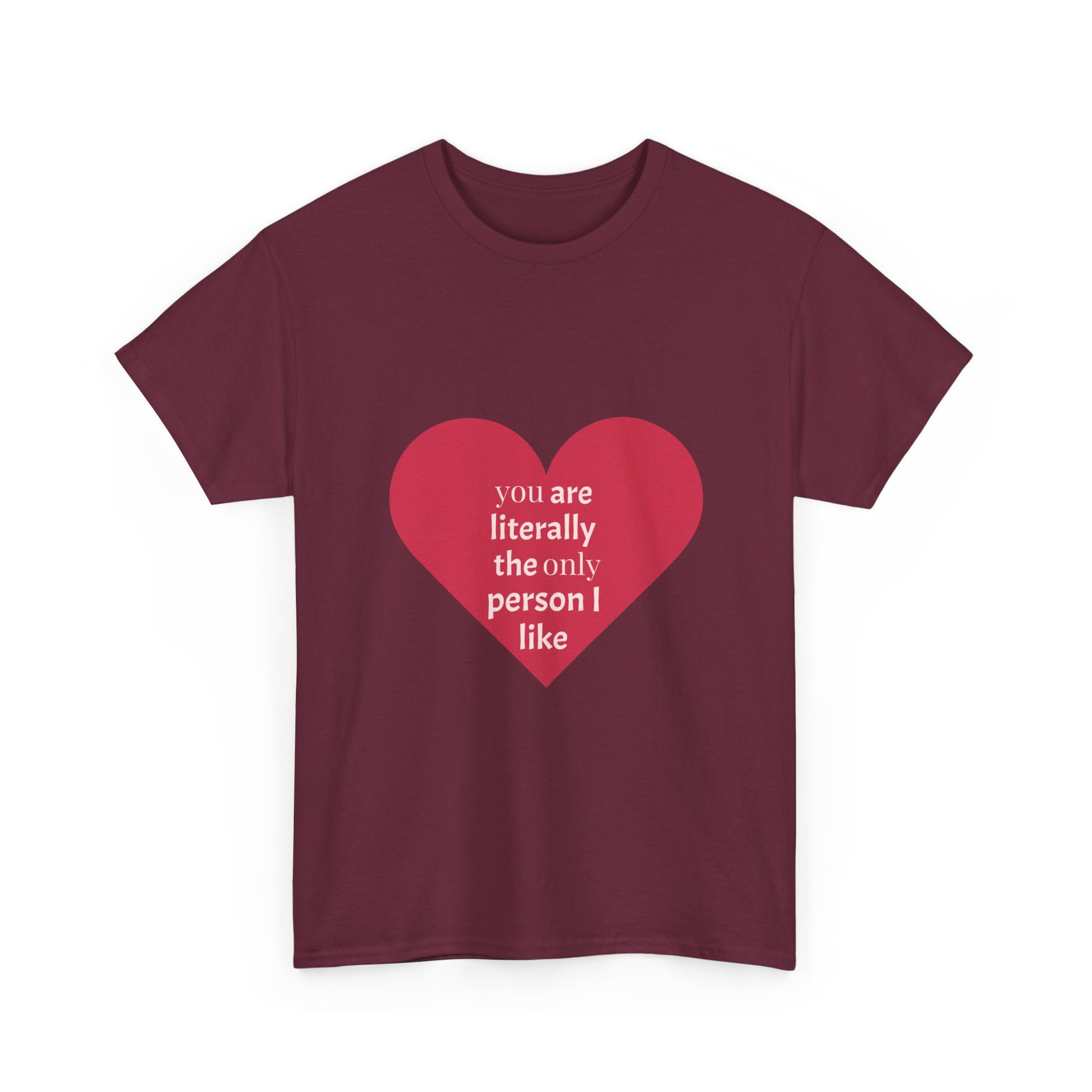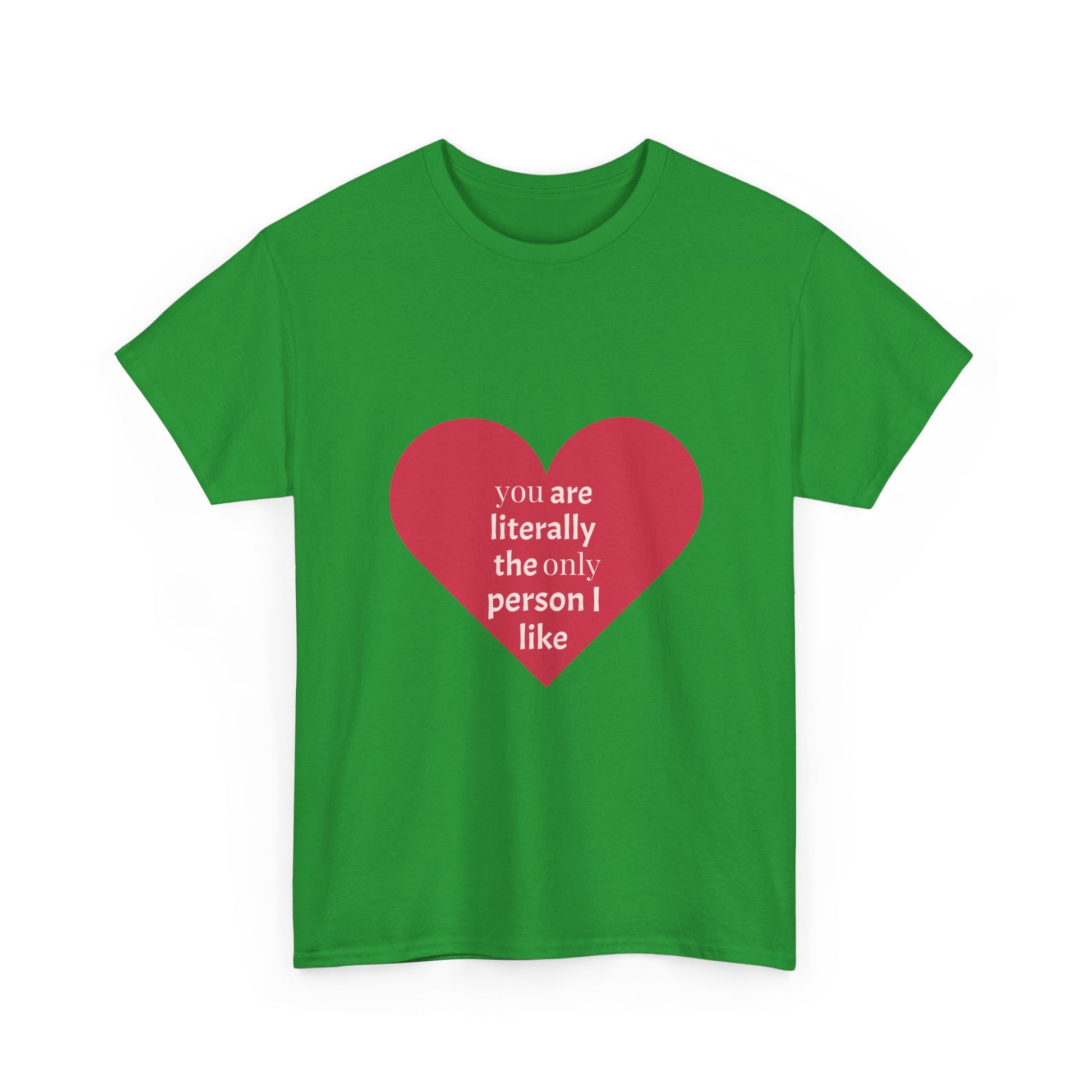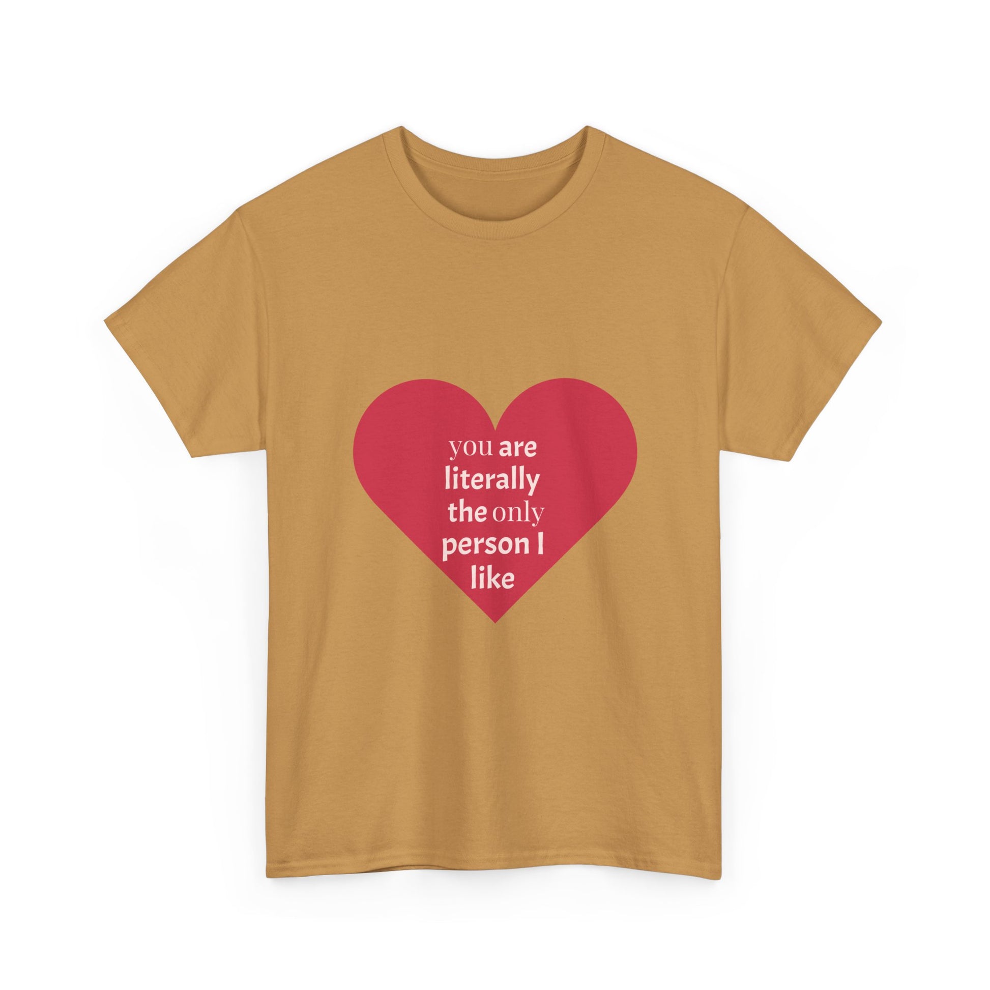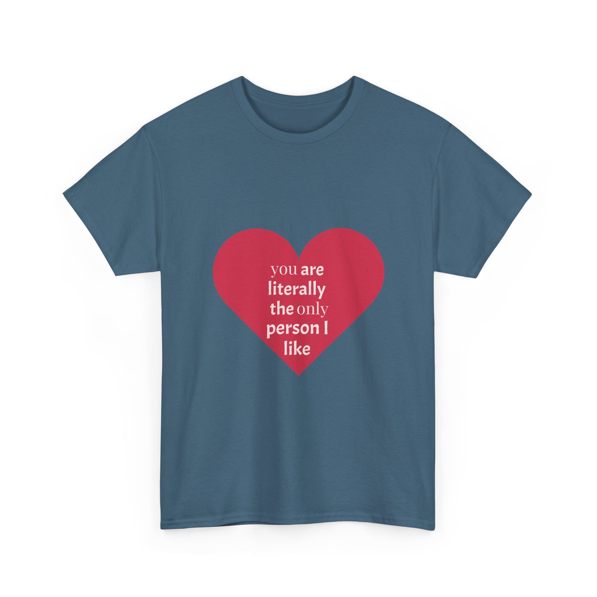 Introducing our versatile Unisex Heavy Cotton Tee, perfect for expressing your unique personality in comfort and style! This tee features a playful heart design with the cheeky phrase, "you are literally the only person I like," sure to bring a smile to anyone's face. Ideal for casual outings, reunions, or just lounging around, it is great for the laid-back spirit who wants to make a statement. Dress it up with a skirt or keep it casual with jeans; the options are endless! Perfect for gifting on Valentine's Day, anniversaries, or even as a playful surprise for friends. Made for adults who appreciate quality and fun, this tee brings a relaxed vibe to any closet. Tee, Cute Gift for Couples, Valentine's Day Shirt, Funny Relationship Top, Casual Everyday Wear.