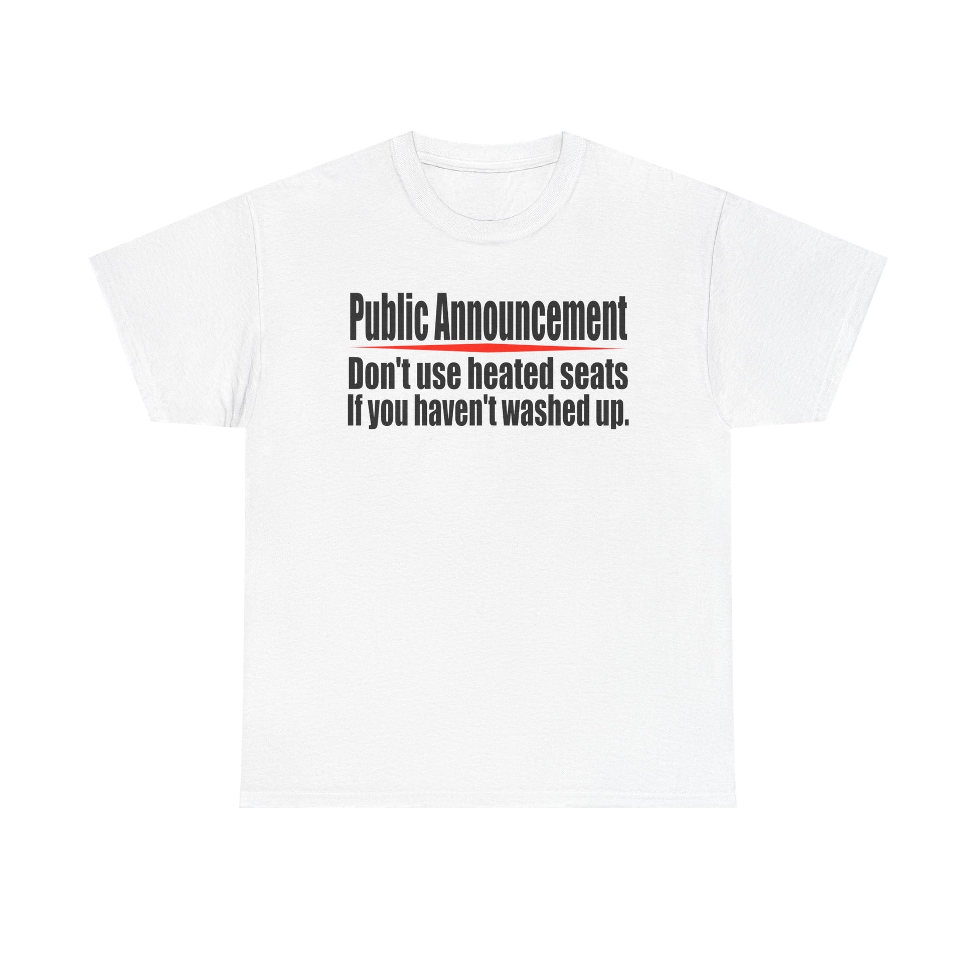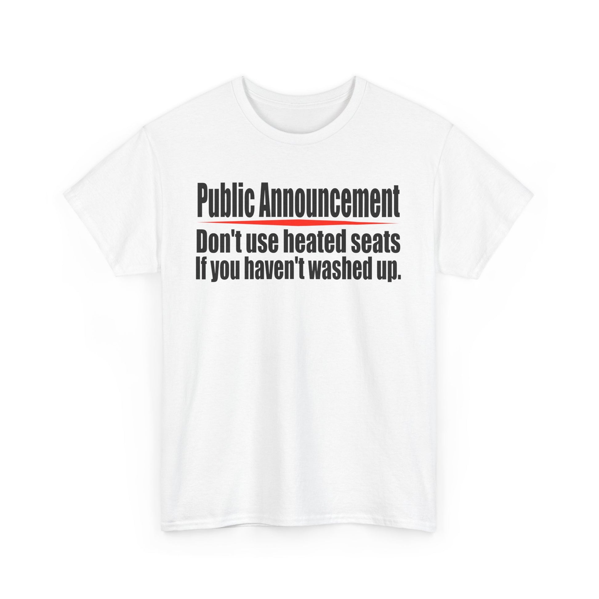 Humorous Heavy Cotton Tee - 'Public Announcement: Don't Use Heated Seats If You Haven't Washed Up'