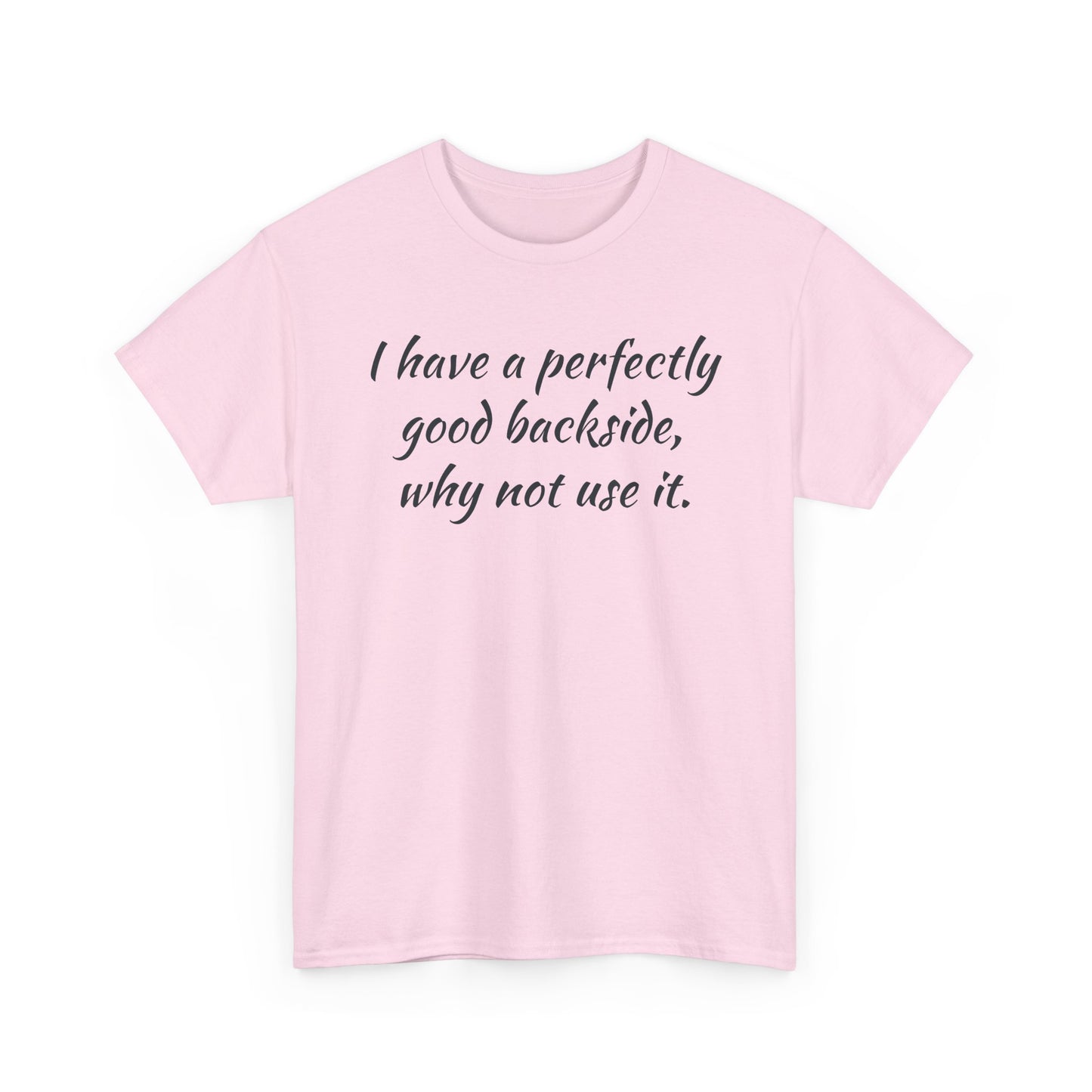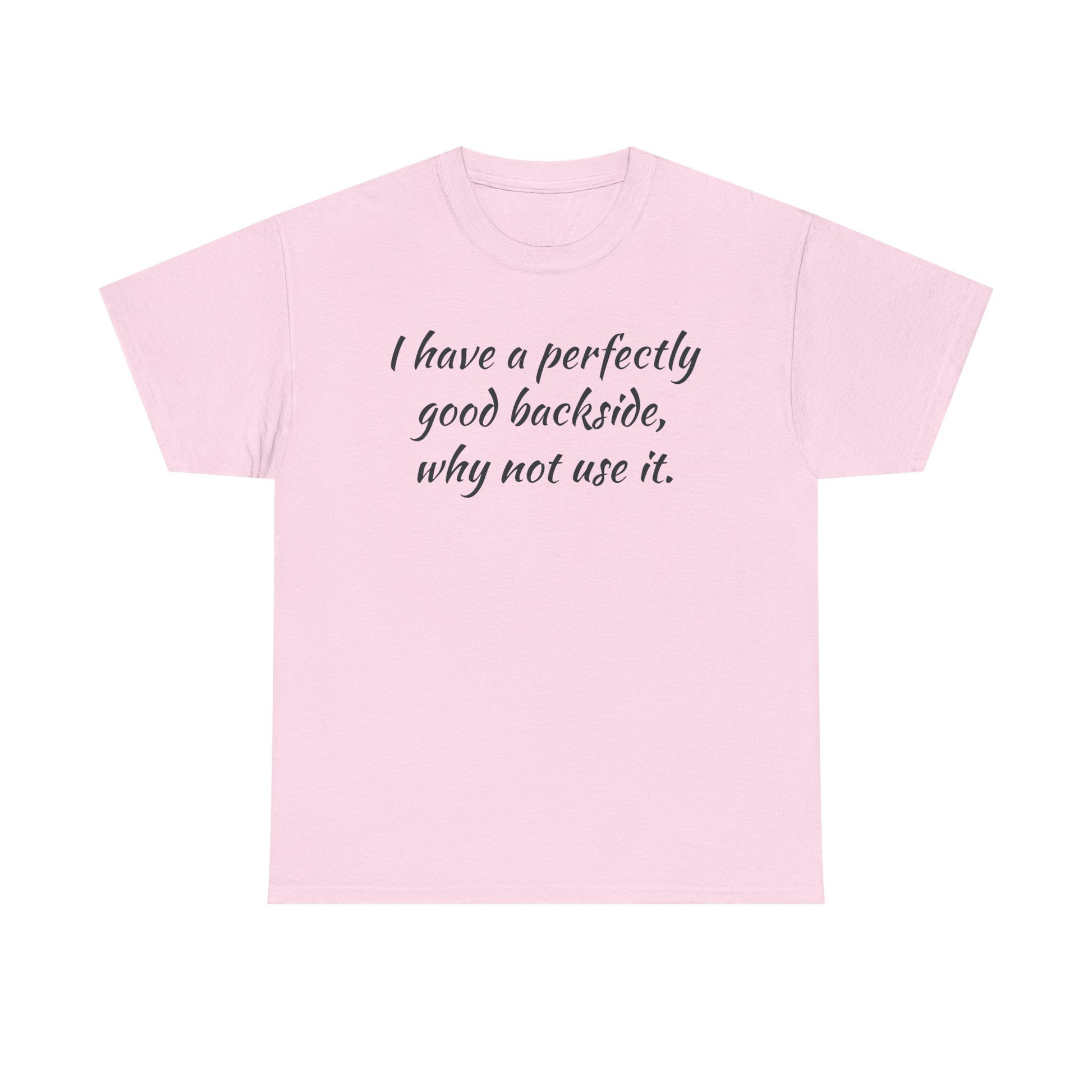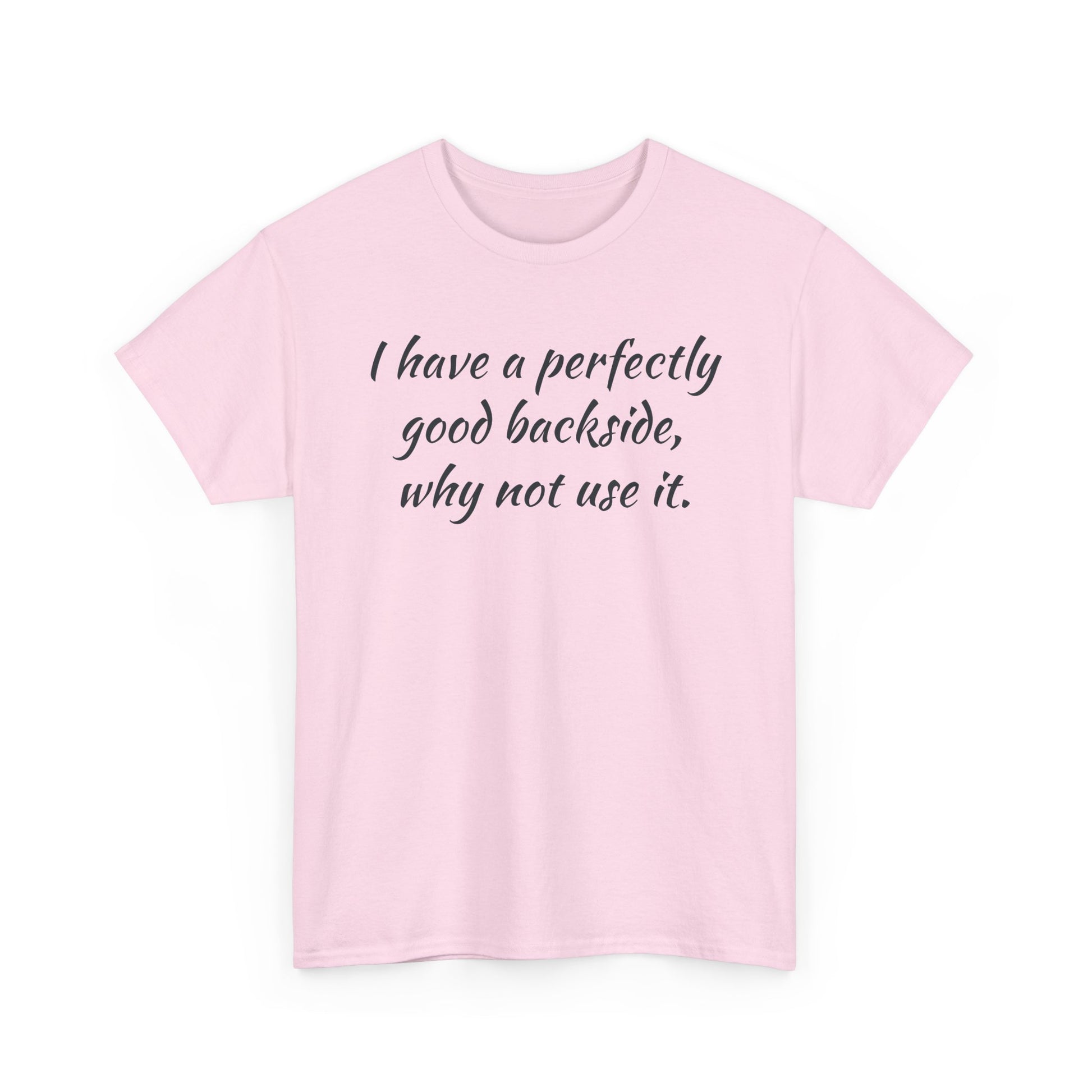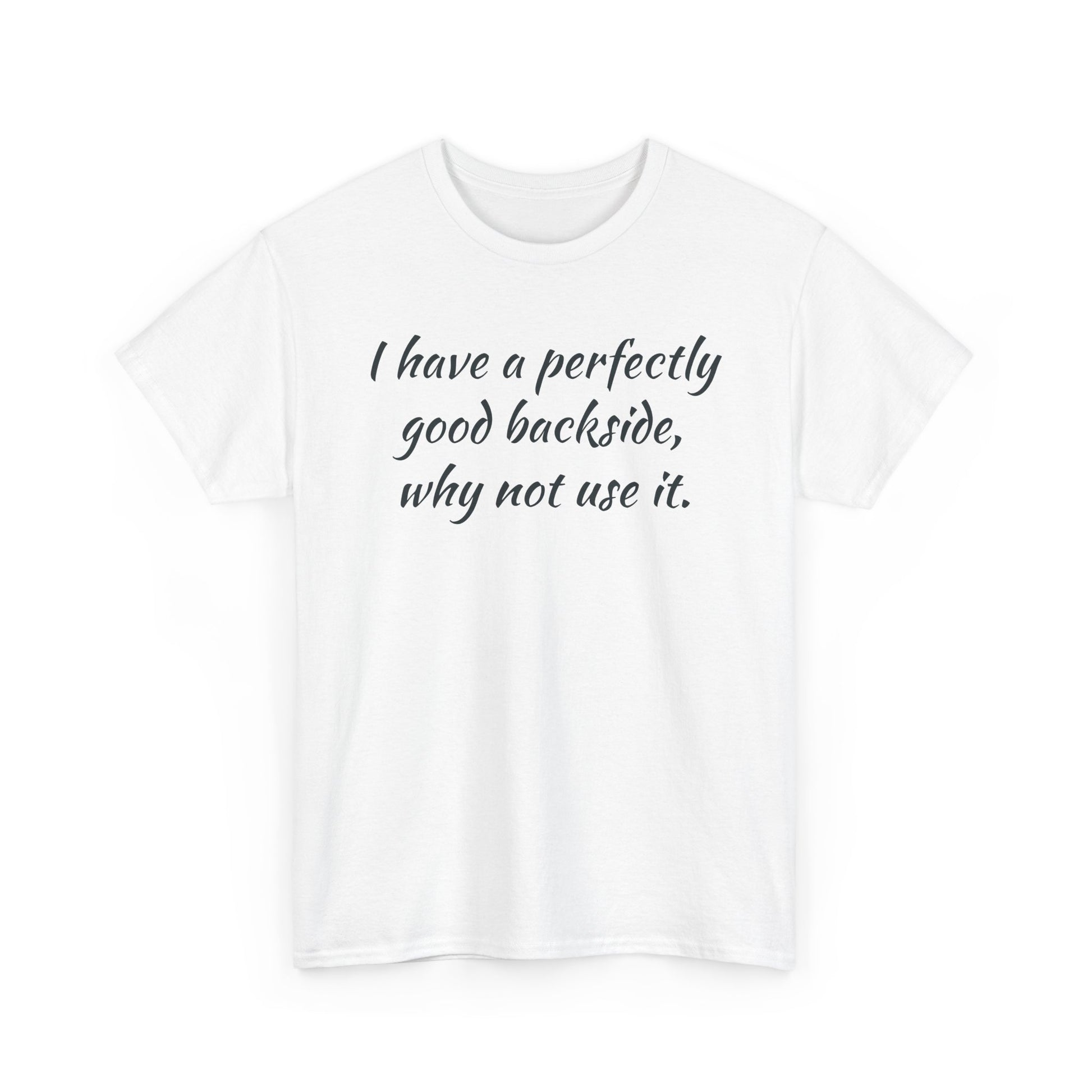 Embrace your playful side with our Unisex Heavy Cotton Tee. This tee exudes a casual, relaxed vibe, perfect for weekend outings, cozy gatherings, or simply lounging at home. Its humorous message adds a fun twist, making it a great conversation starter. Ideal for adults who enjoy a good laugh and appreciate comfort in their wardrobe. This tee is versatile enough for various occasions, including birthdays, casual meet-ups, and even holiday festivities. It brings a light-hearted spirit to any outfit, and it’s perfect for gifting to friends who love unique fashion statements. Humorous Quote Tee - Perfectly Good Backside T-Shirt, Funny Gift, Casual Wear, Everyday Cotton Tee, Unisex Graphic Tee, Gift for Him or Her