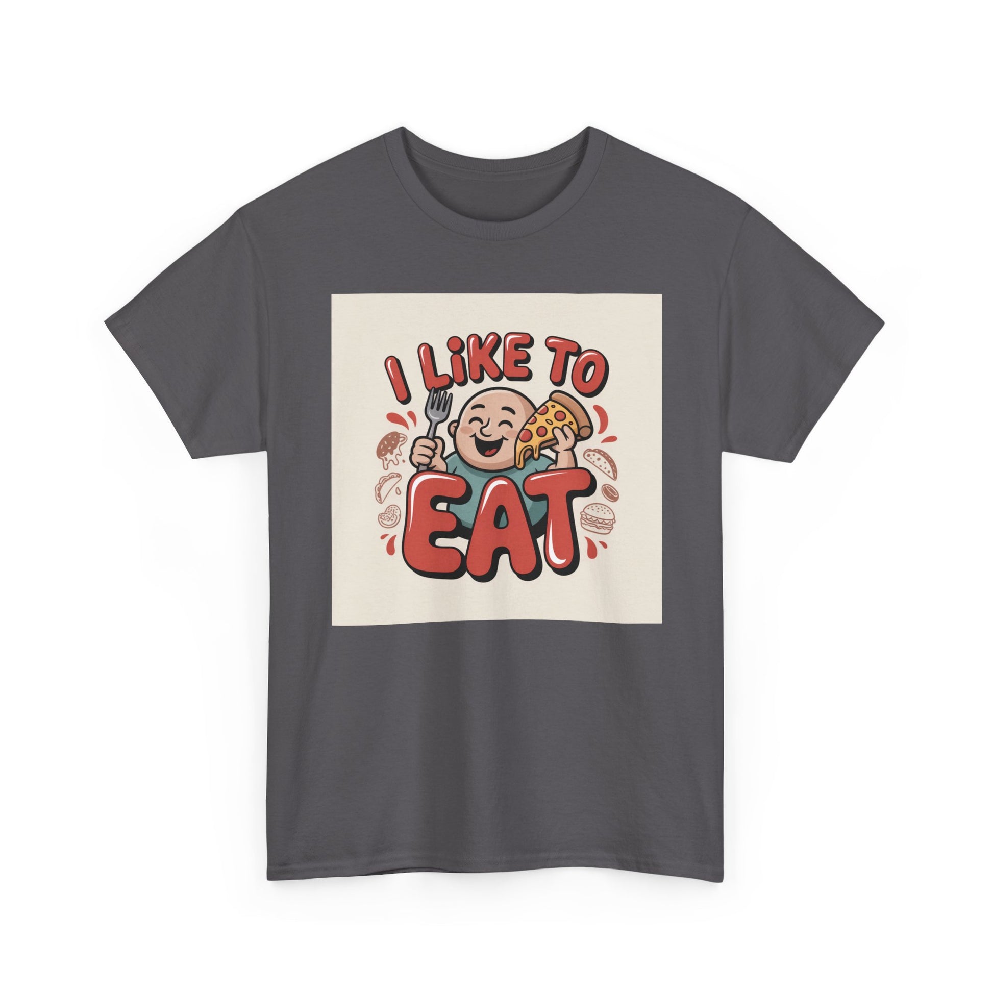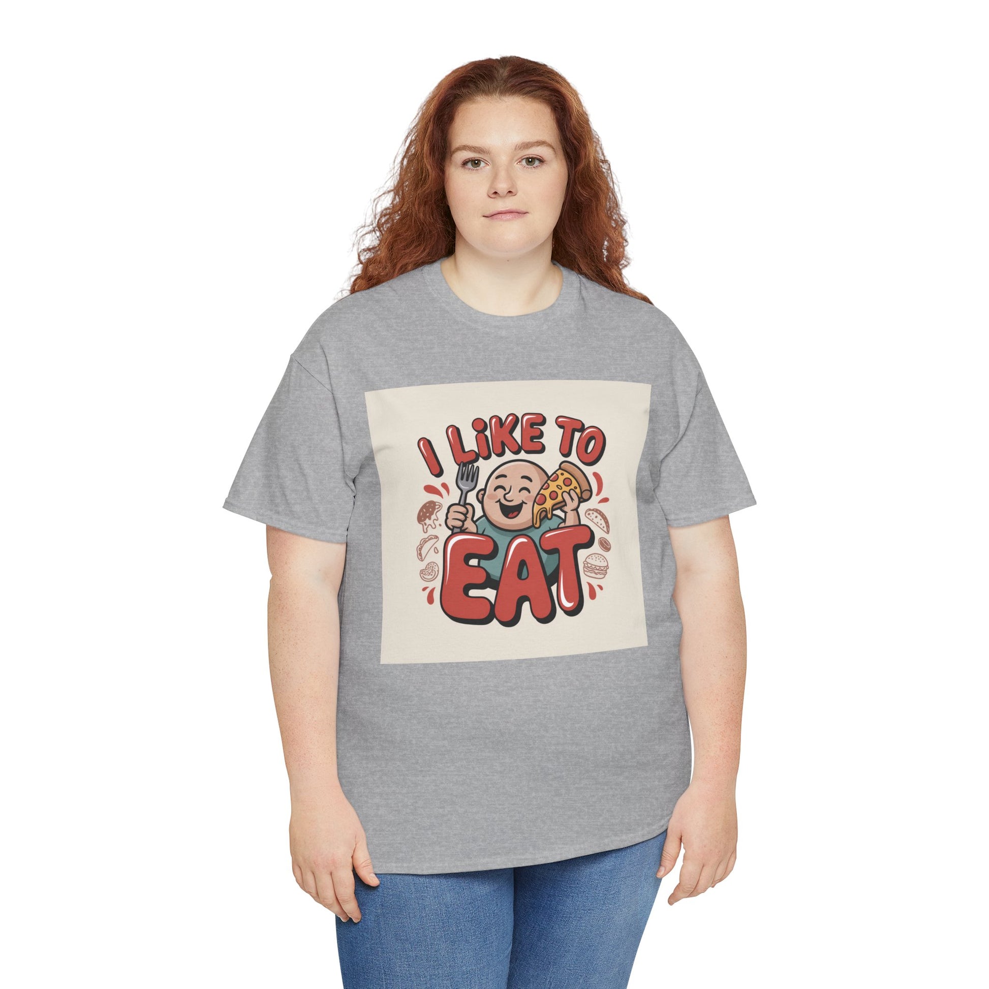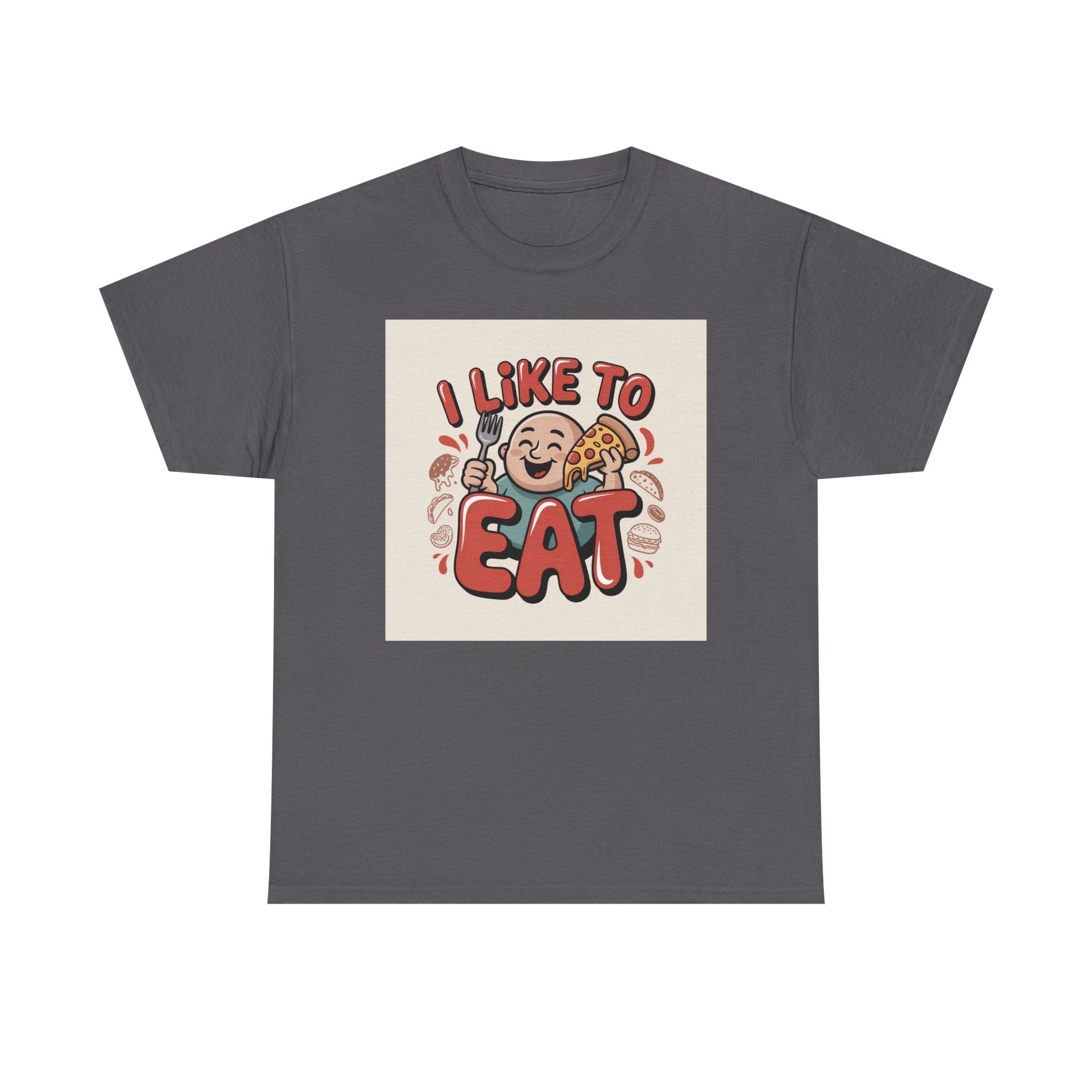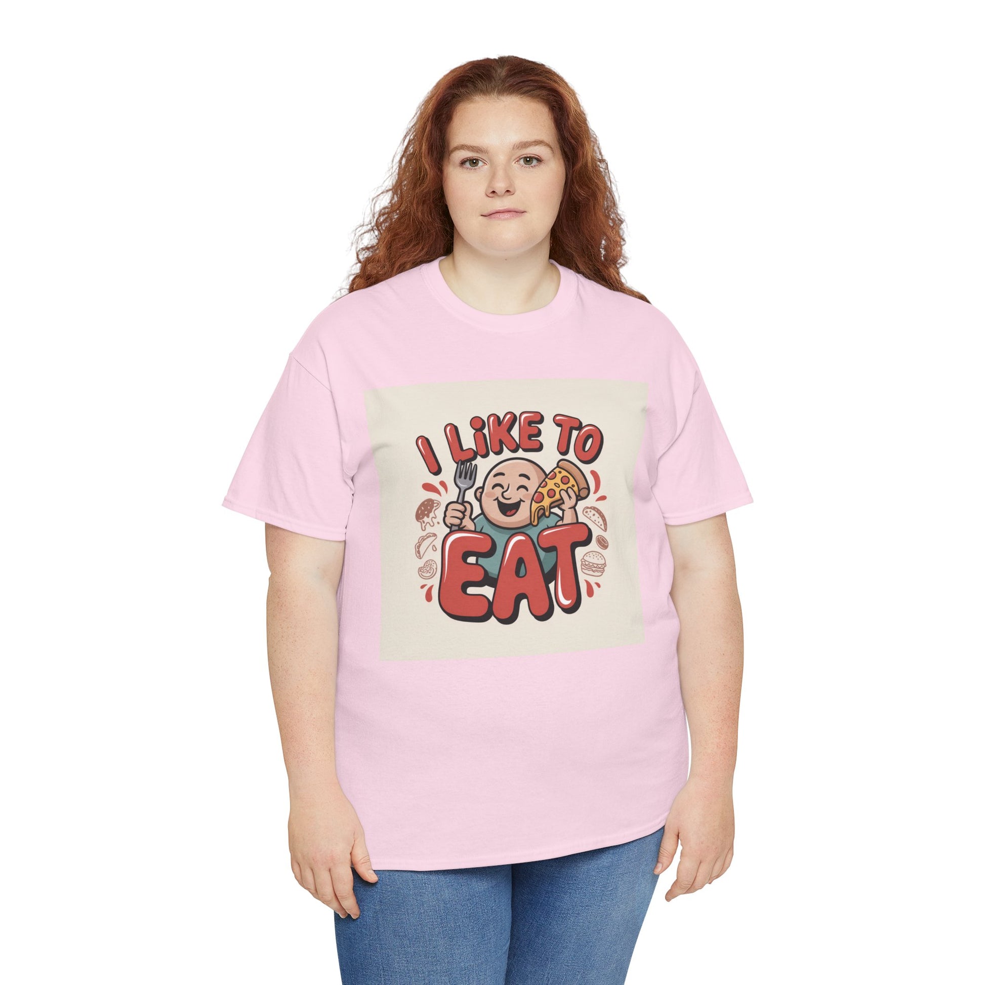 This relaxed, classic-fit tee carries a playful, food-loving vibe. The front features a cheerful cartoon character with bold, rounded lettering that reads “I LIKE TO EAT,” rendered in warm, appetizing colors. Soft, medium-weight cotton drapes comfortably while ribbed neckline and shoulder tape add structure that keeps the shirt looking good after many wears. The print blends DTG and DTF techniques for crisp color and fine detail — the illustration stays bright and lively wash after wash. Wear it to casual meetups, brunch runs, or lazy weekend cooking sessions; it reads like an honest declaration for anyone who celebrates food with a grin.