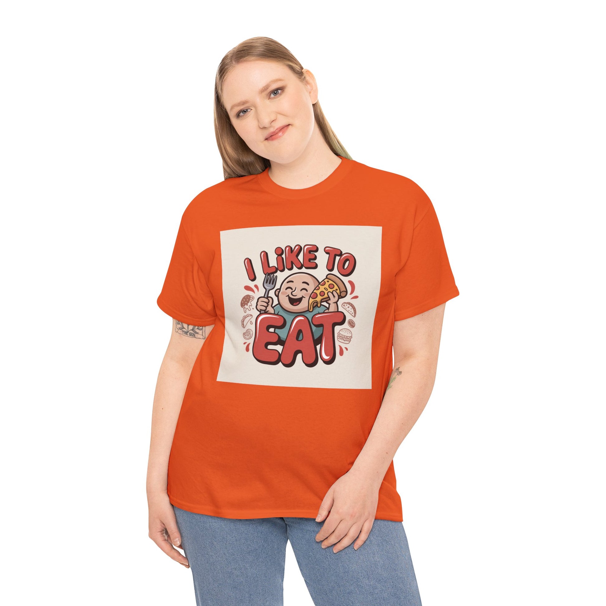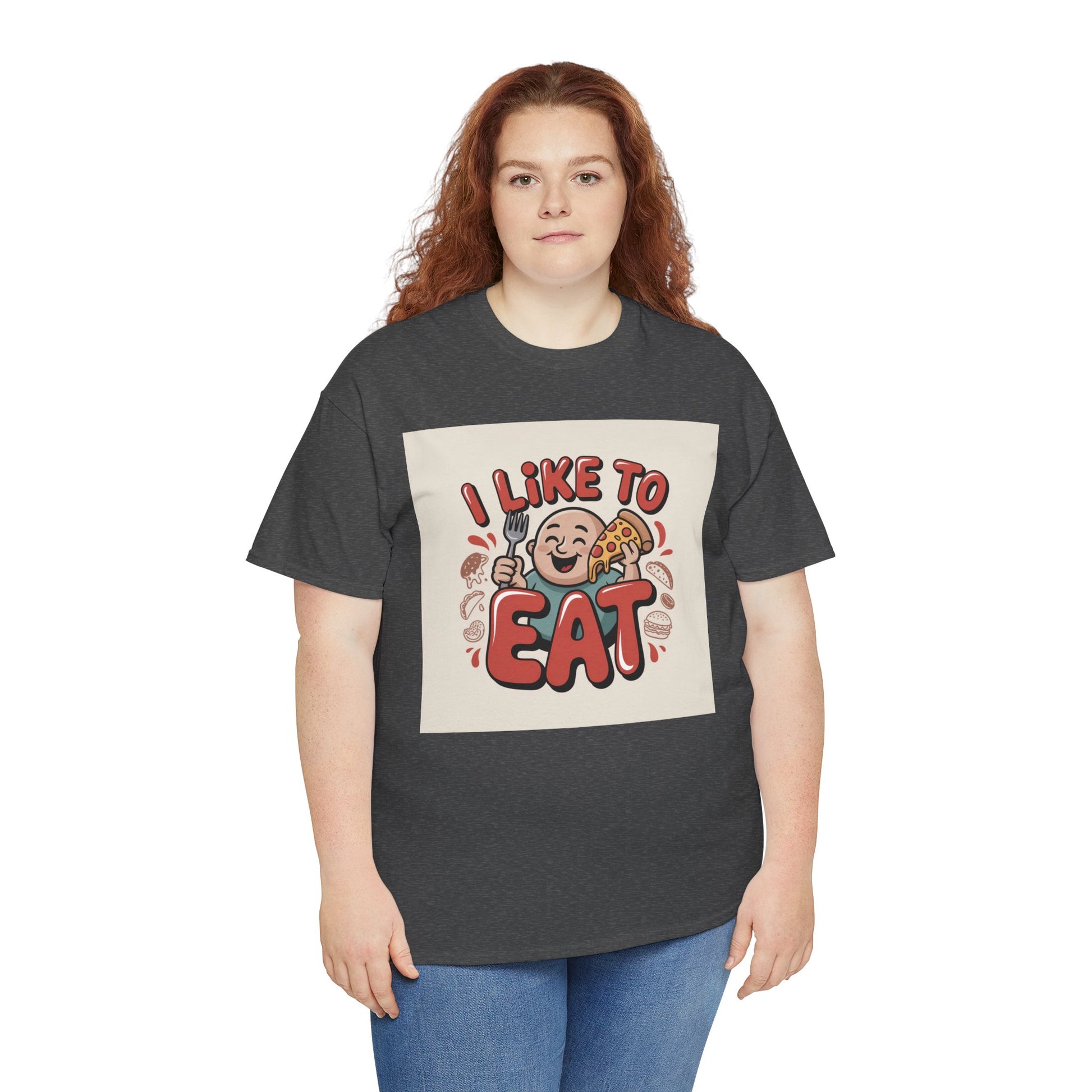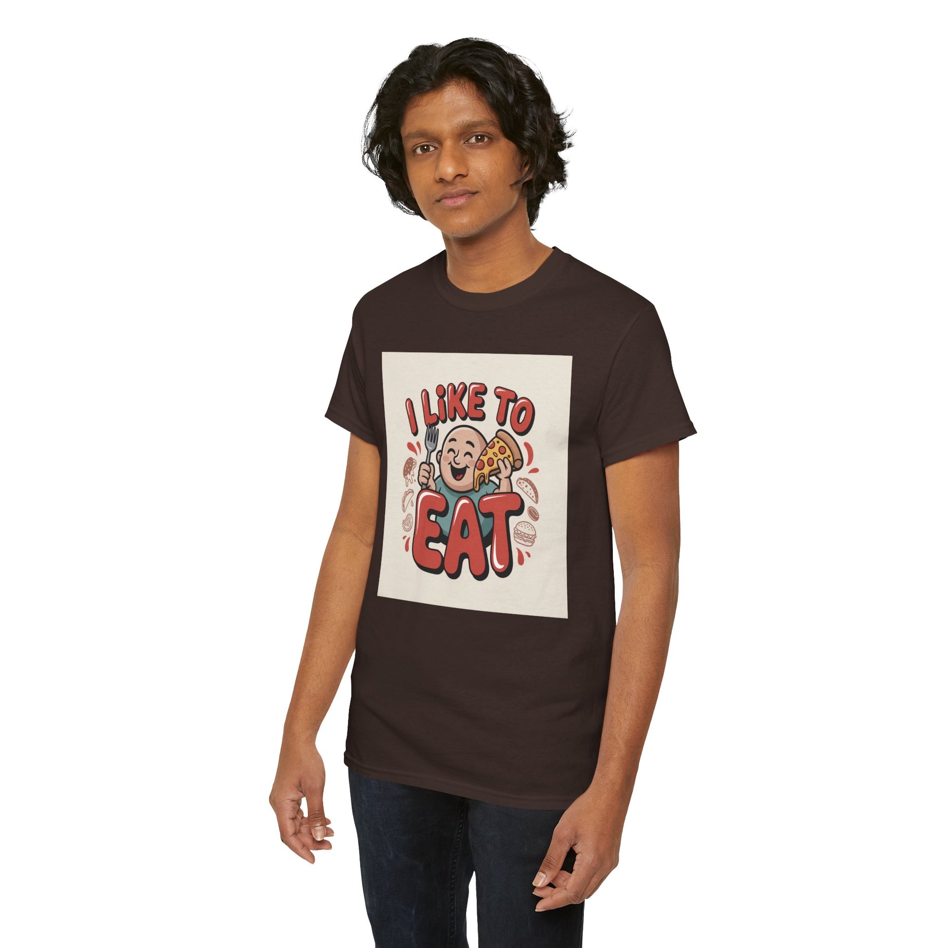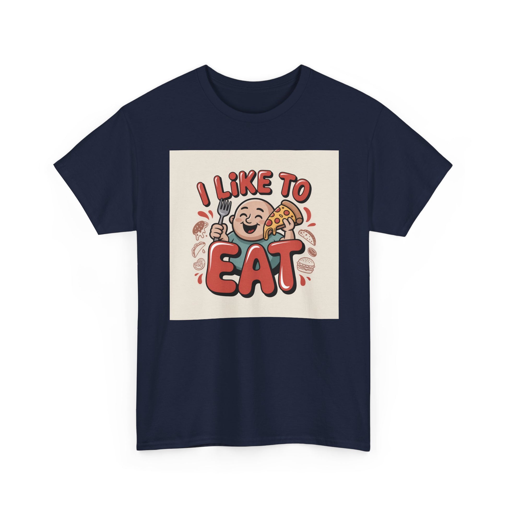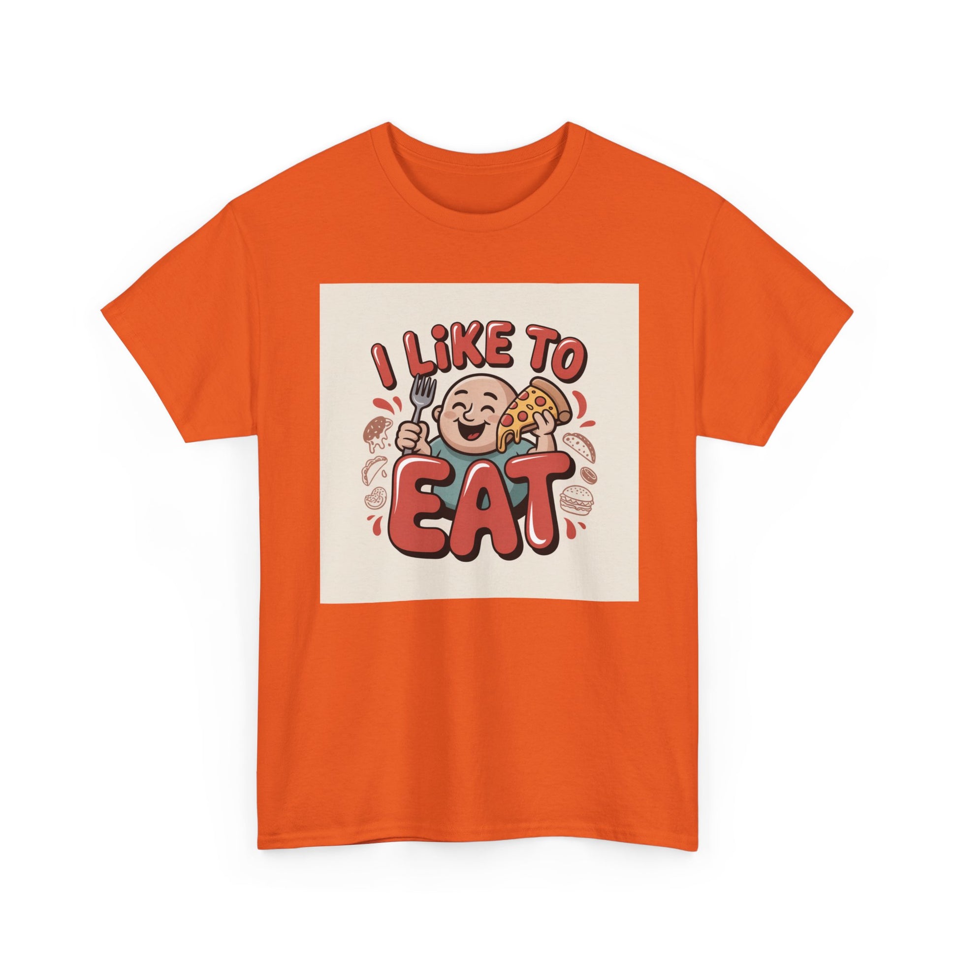 This relaxed, classic-fit tee carries a playful, food-loving vibe. The front features a cheerful cartoon character with bold, rounded lettering that reads “I LIKE TO EAT,” rendered in warm, appetizing colors. Soft, medium-weight cotton drapes comfortably while ribbed neckline and shoulder tape add structure that keeps the shirt looking good after many wears. The print blends DTG and DTF techniques for crisp color and fine detail — the illustration stays bright and lively wash after wash. Wear it to casual meetups, brunch runs, or lazy weekend cooking sessions; it reads like an honest declaration for anyone who celebrates food with a grin.