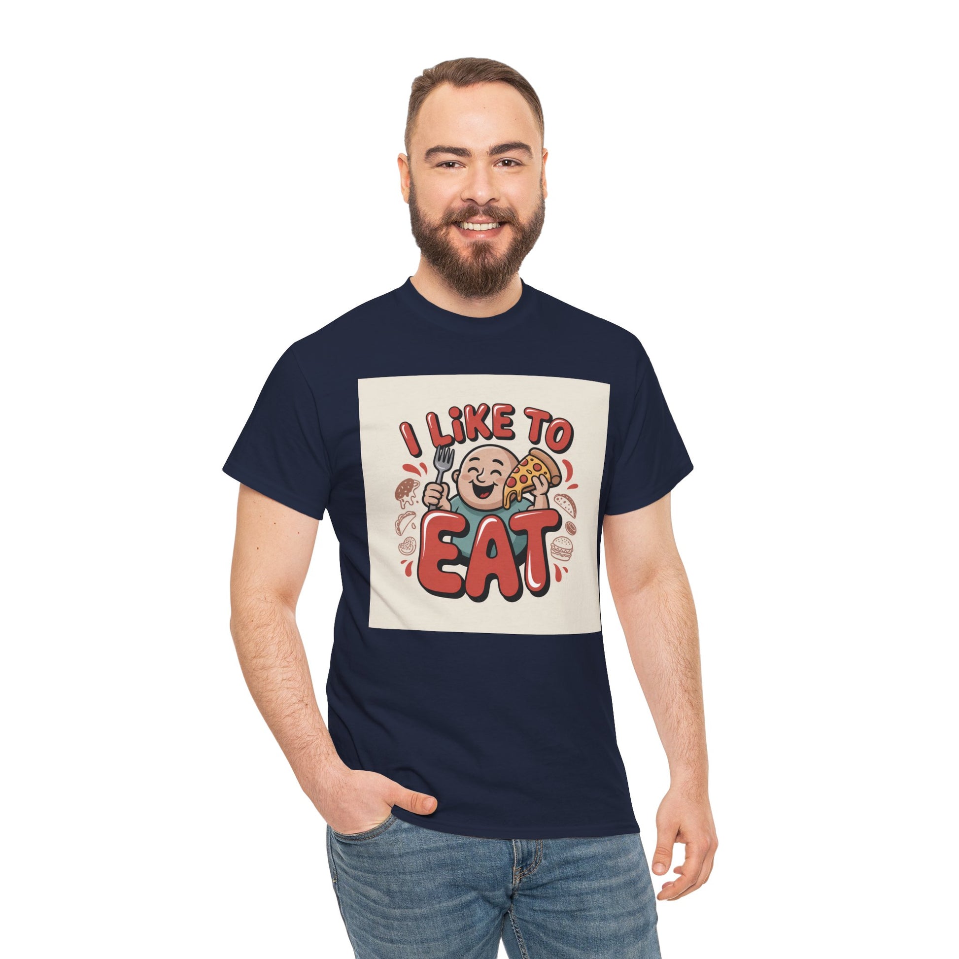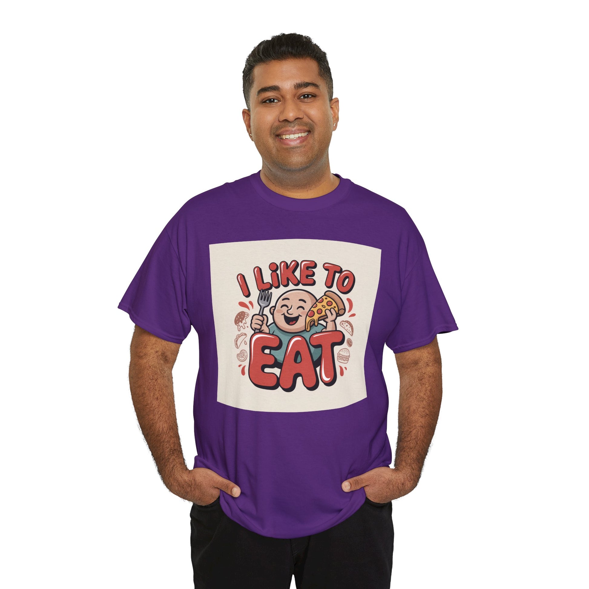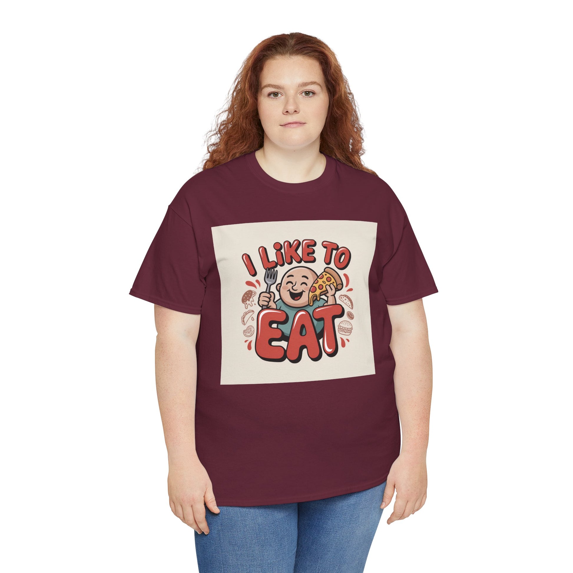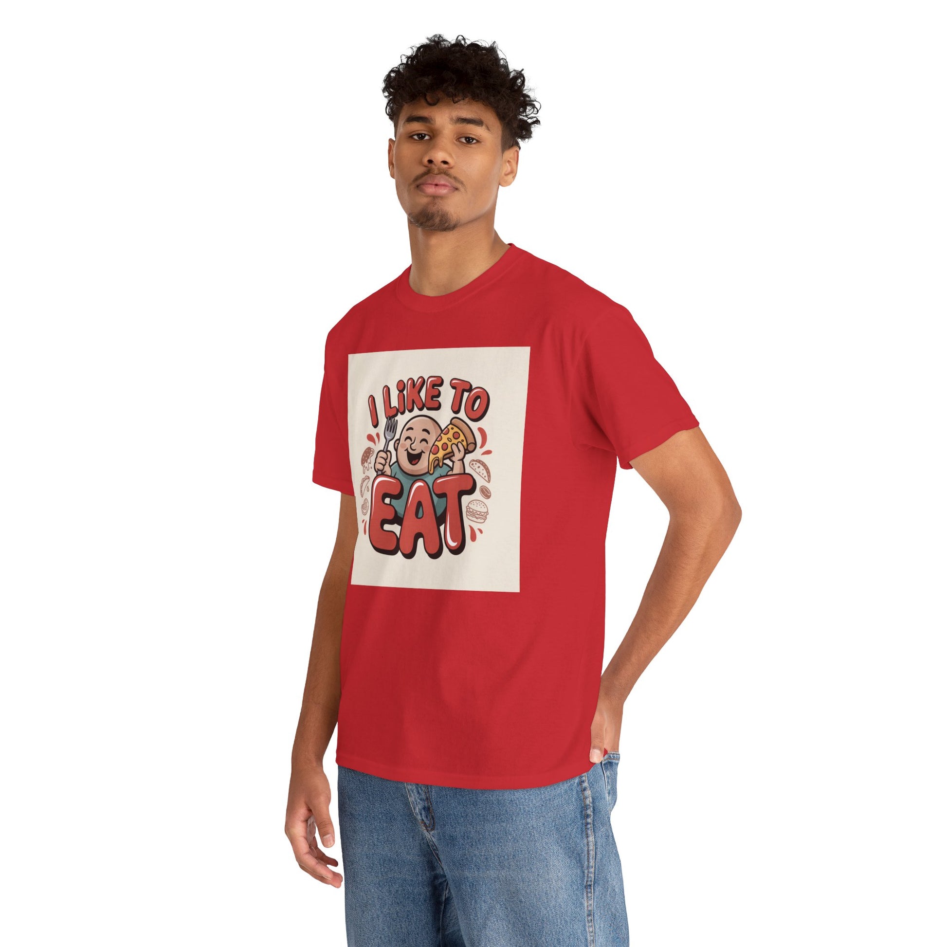This relaxed, classic-fit tee carries a playful, food-loving vibe. The front features a cheerful cartoon character with bold, rounded lettering that reads “I LIKE TO EAT,” rendered in warm, appetizing colors. Soft, medium-weight cotton drapes comfortably while ribbed neckline and shoulder tape add structure that keeps the shirt looking good after many wears. The print blends DTG and DTF techniques for crisp color and fine detail — the illustration stays bright and lively wash after wash. Wear it to casual meetups, brunch runs, or lazy weekend cooking sessions; it reads like an honest declaration for anyone who celebrates food with a grin.