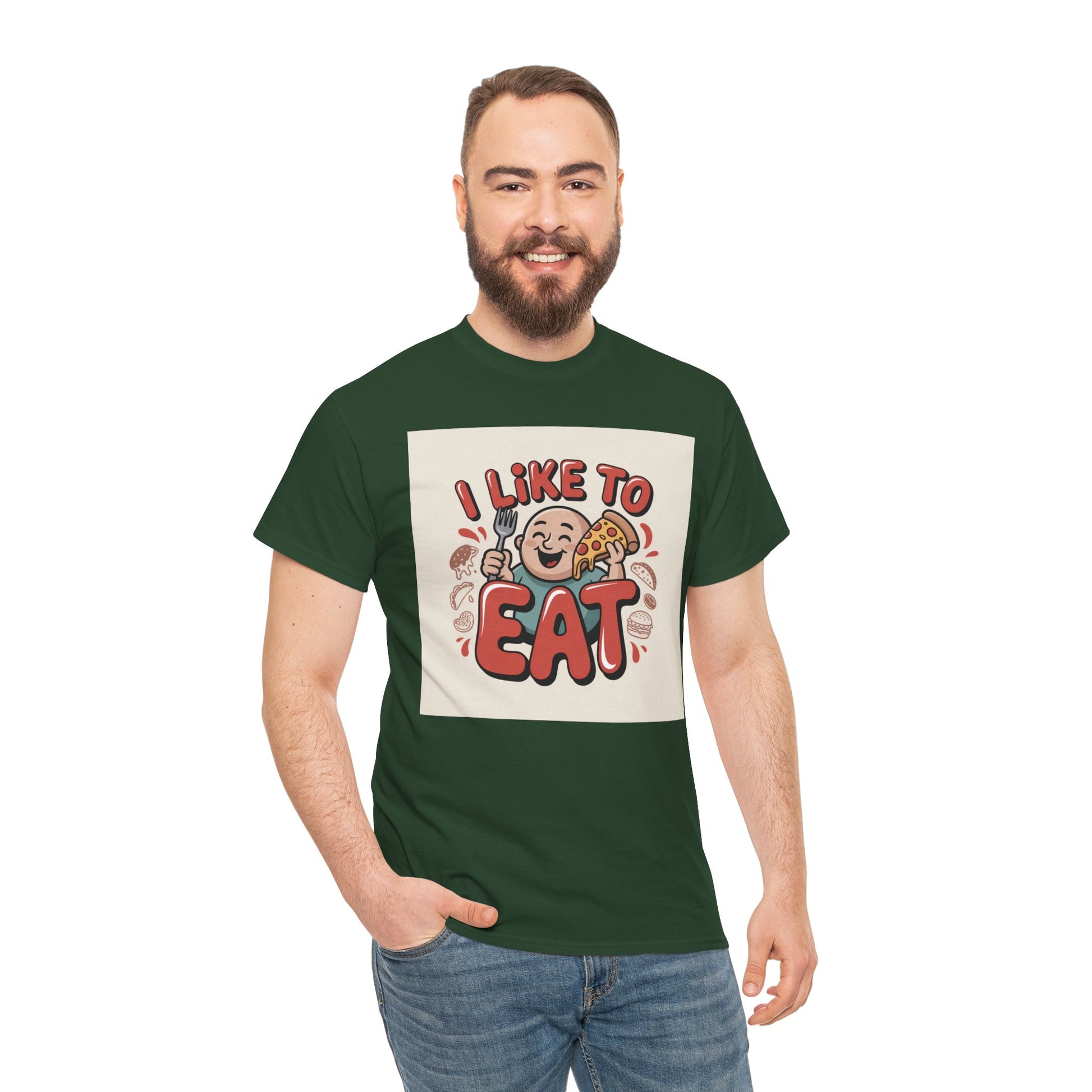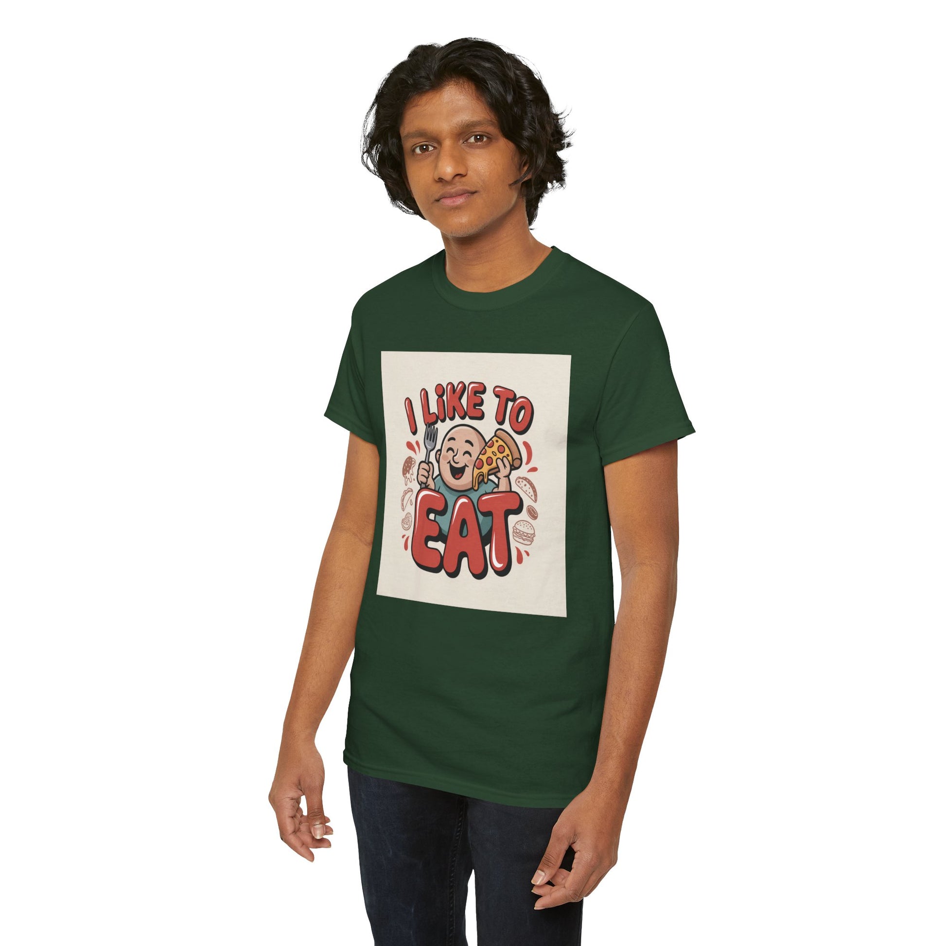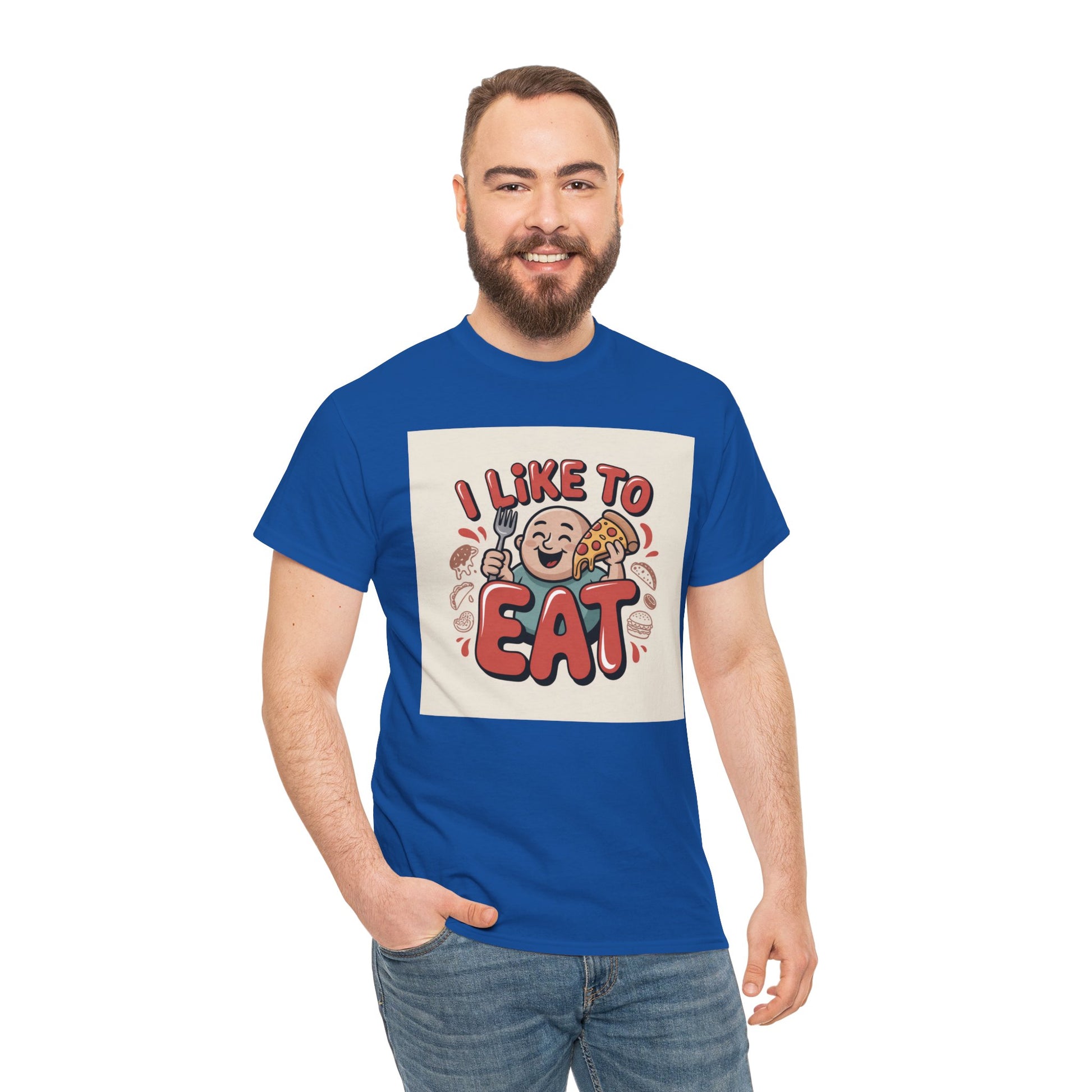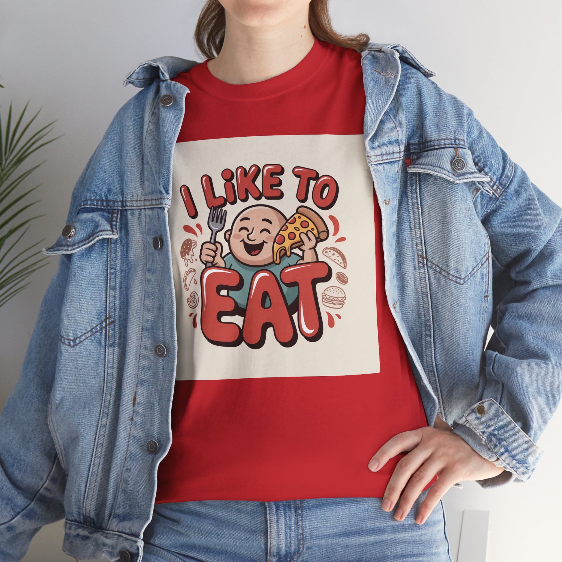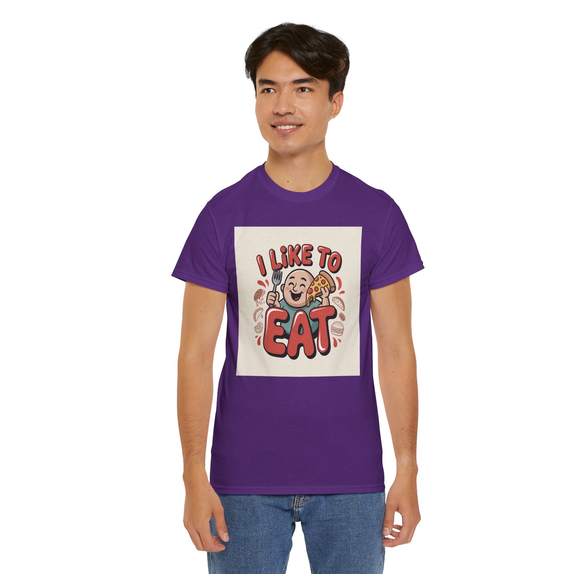 This relaxed, classic-fit tee carries a playful, food-loving vibe. The front features a cheerful cartoon character with bold, rounded lettering that reads “I LIKE TO EAT,” rendered in warm, appetizing colors. Soft, medium-weight cotton drapes comfortably while ribbed neckline and shoulder tape add structure that keeps the shirt looking good after many wears. The print blends DTG and DTF techniques for crisp color and fine detail — the illustration stays bright and lively wash after wash. Wear it to casual meetups, brunch runs, or lazy weekend cooking sessions; it reads like an honest declaration for anyone who celebrates food with a grin.