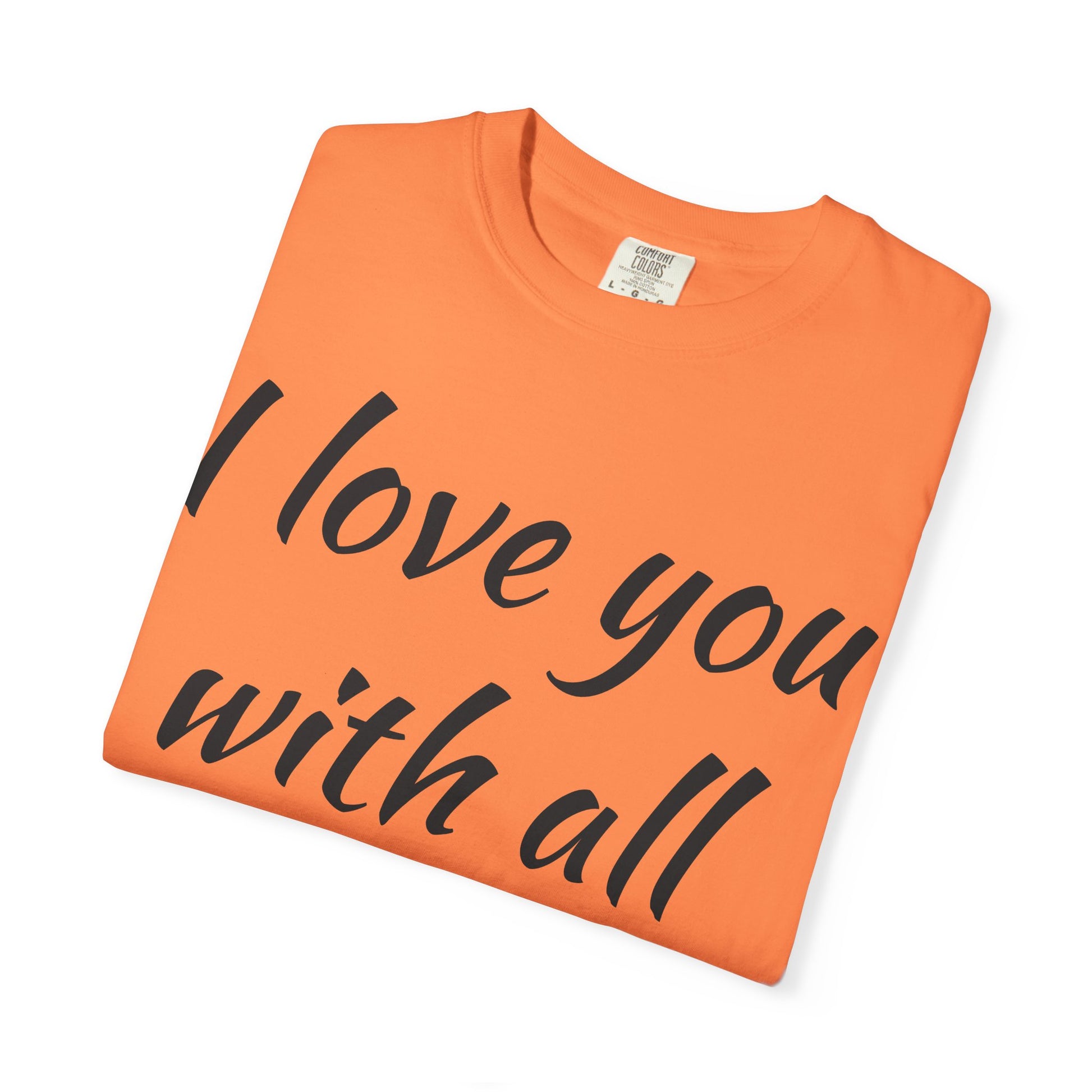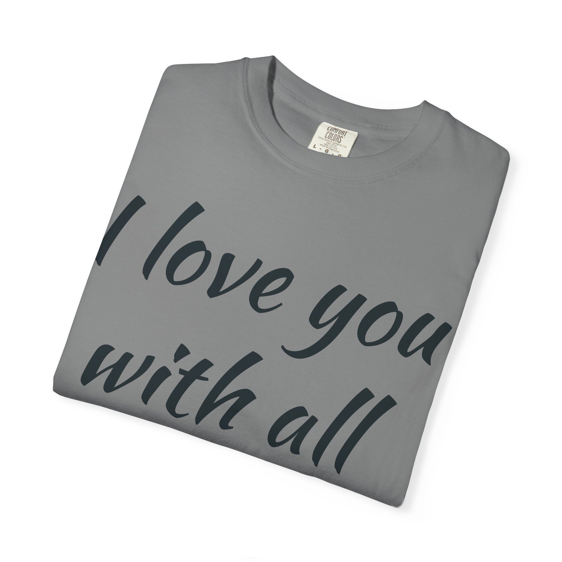 This relaxed fit T-shirt is the perfect blend of comfort and style. Made from 100% ring-spun US cotton, it offers a soft and breathable feel for all-day wear. The garment-dyed fabric gives it a unique and vibrant color that stands out while still feeling laid-back. Ideal for casual outings or semi-formal gatherings, this T-shirt adds a touch of fun to your wardrobe with its playful slogan. Perfect for gift-giving during holidays like Valentine’s Day, birthdays, or simply as a treat for yourself or a loved one who appreciates humor and comfort in their attire. Its versatility makes it a great fit for friends, family, or anyone looking to express their personality through fashion. Funny Love Quote T-Shirt, Cute Gift for Couples, Casual Wear, Birthday Gift, Humor Tee