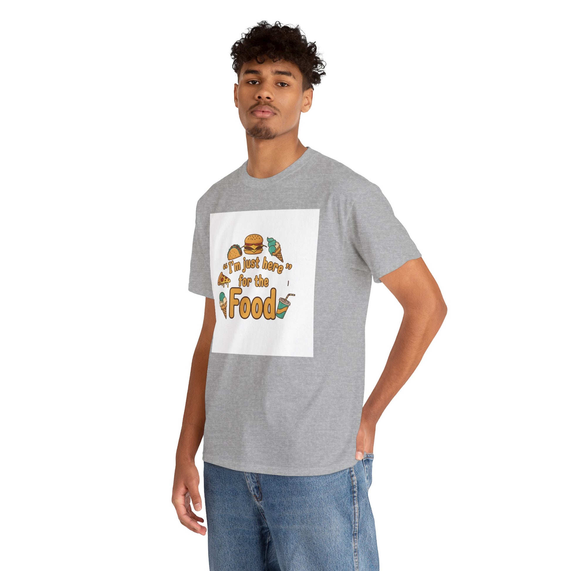 Lighthearted and cozy, this tee speaks to the simple joy of showing up for the snacks. Soft, mid-weight cotton holds a playful, food-themed illustration at the chest — burgers, fries, ice cream and a soda surround the phrase “I’m just here for the Food.” Wear it to backyard cookouts, casual hangouts, or food-festival strolls when you want to keep the vibe easy and a little silly. The classic crew silhouette and relaxed fit layer well under a shirt jacket or stand on their own with jeans. Thoughtfully made details like a ribbed, shape‑retaining collar, shoulder tape for stability, and a tear‑away label keep comfort front and center so the message is what gets noticed — not the shirt.