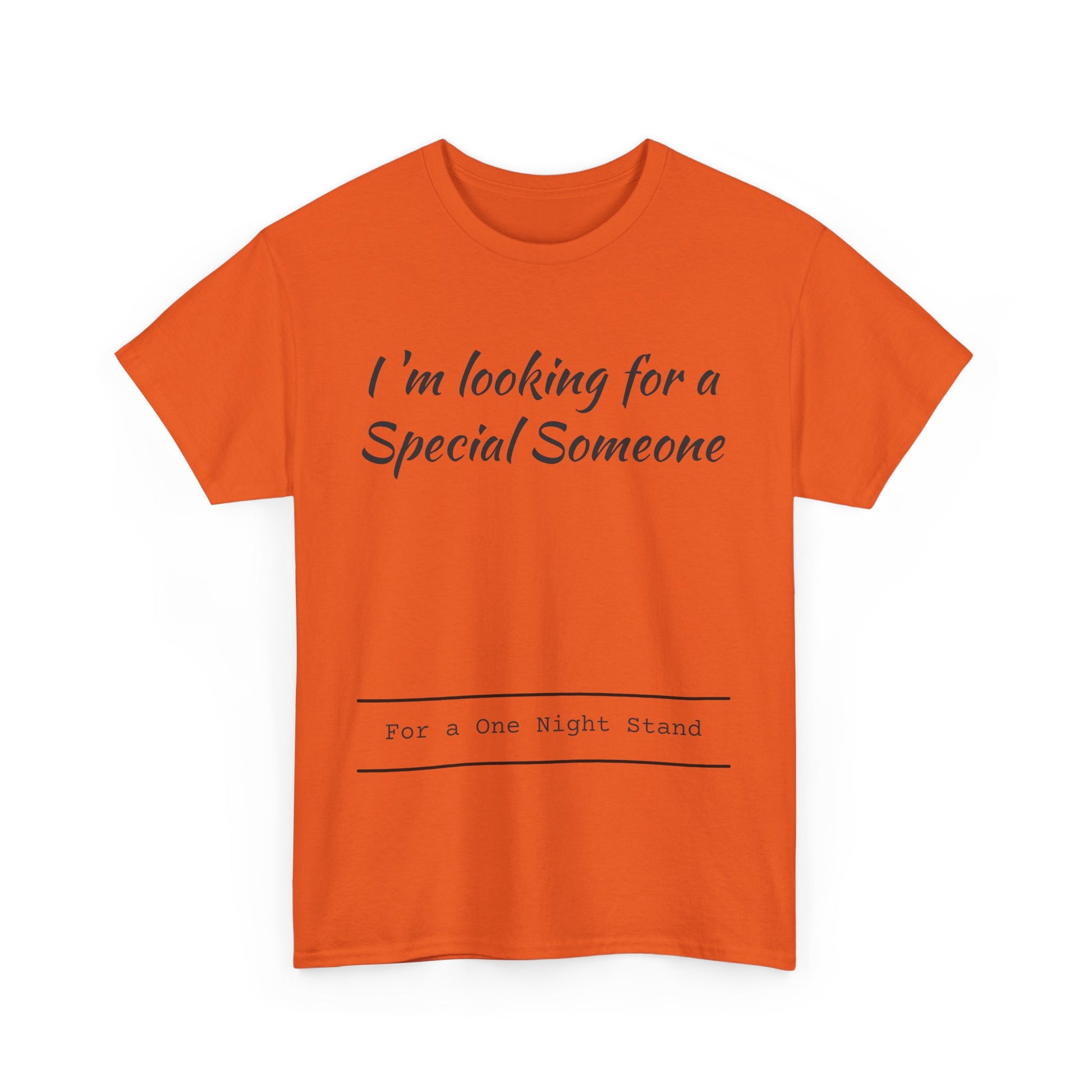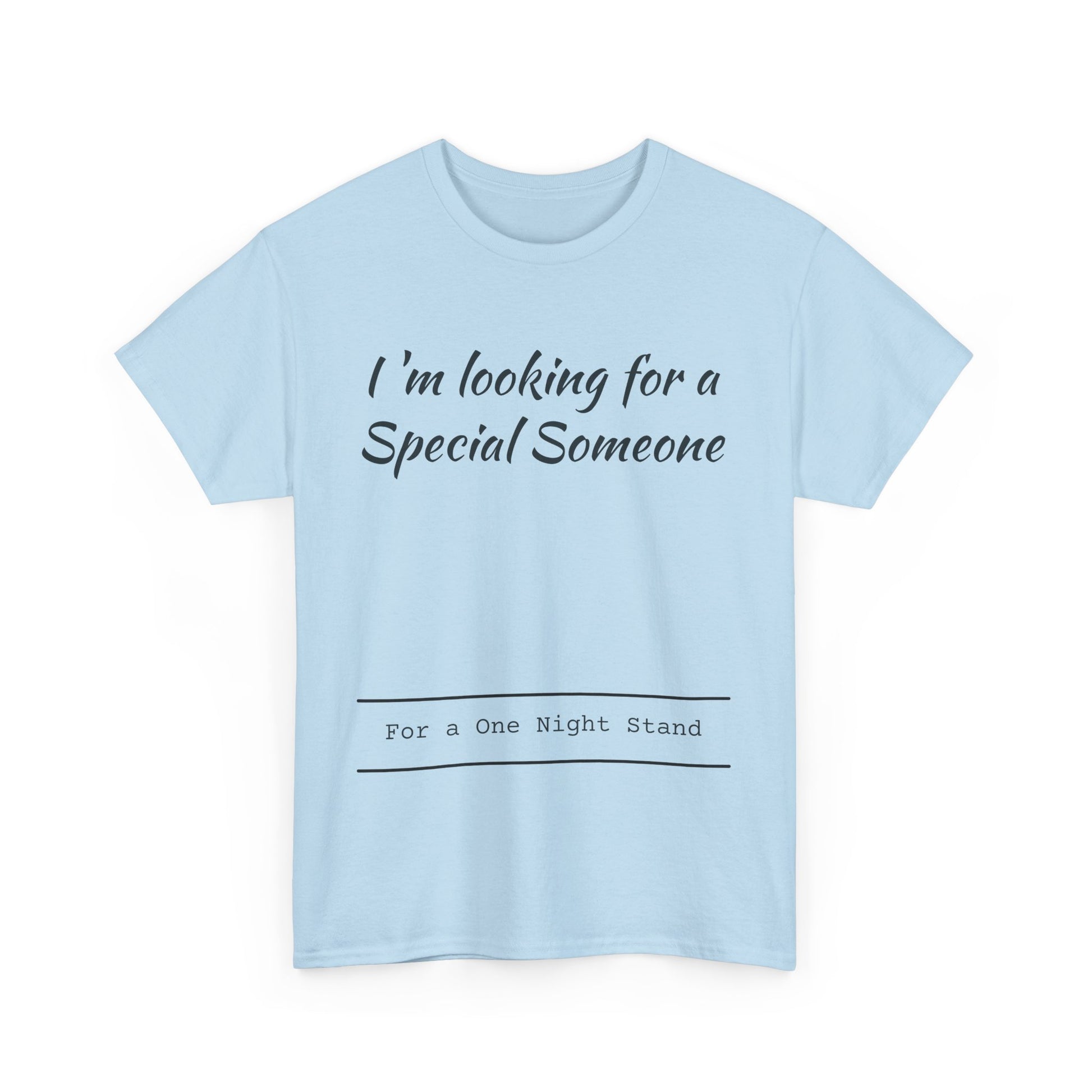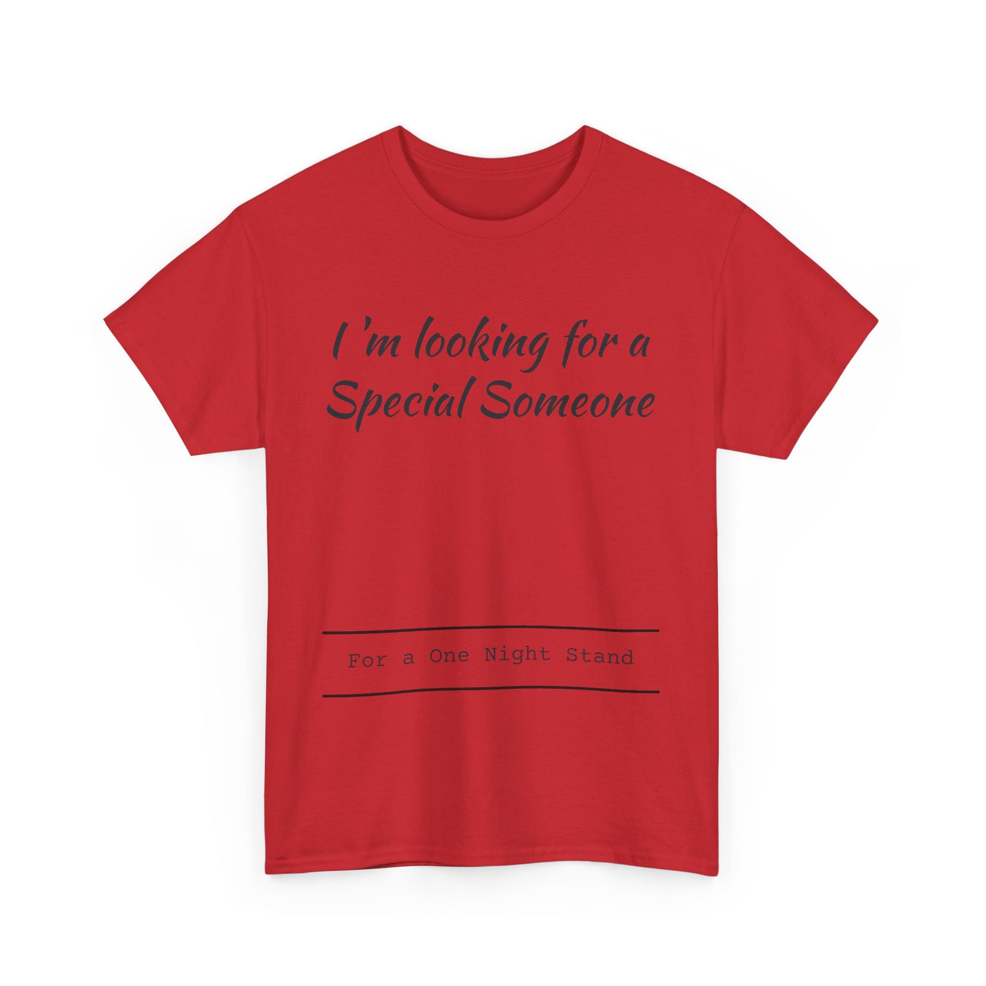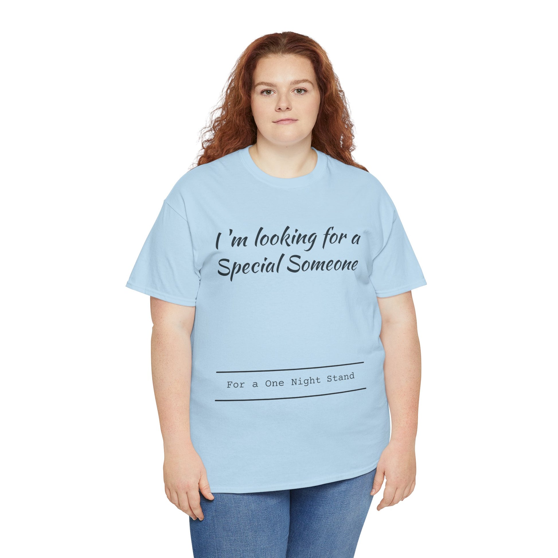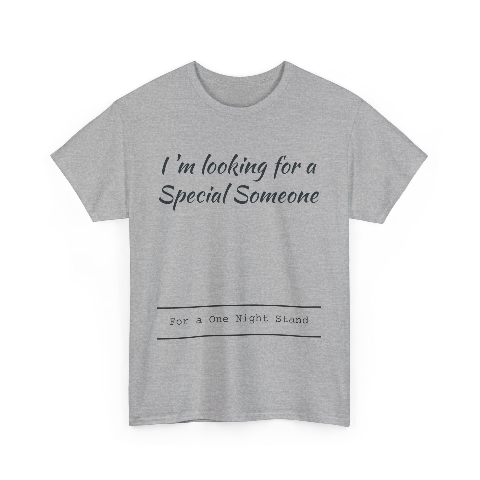 Introducing a classic Unisex Heavy Cotton Tee that merges comfort with a playful sense of humor. This shirt radiates a lighthearted vibe that’s perfect for casual outings or laid-back gatherings with friends. Whether you're going to a party, a barbecue, or just lounging at home, this tee adds a touch of fun to your wardrobe. It's ideal for young adults looking to make a statement or share a laugh, particularly around events like singles parties or casual get-togethers. This shirt also makes a quirky gift for Birthdays, Valentine's Day, or any celebration where you want to spread smiles. Funny Unisex Heavy Cotton Tee - "I'm Looking For A Special Someone" T-Shirt, Gift for Singles, Party Wear, Date Night, Humor Shirt