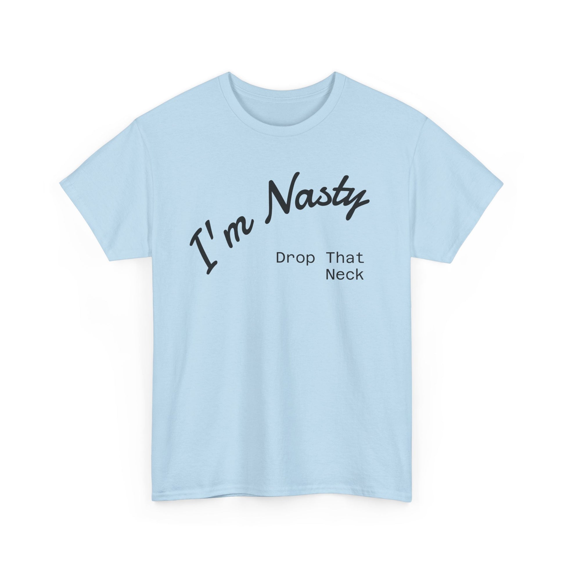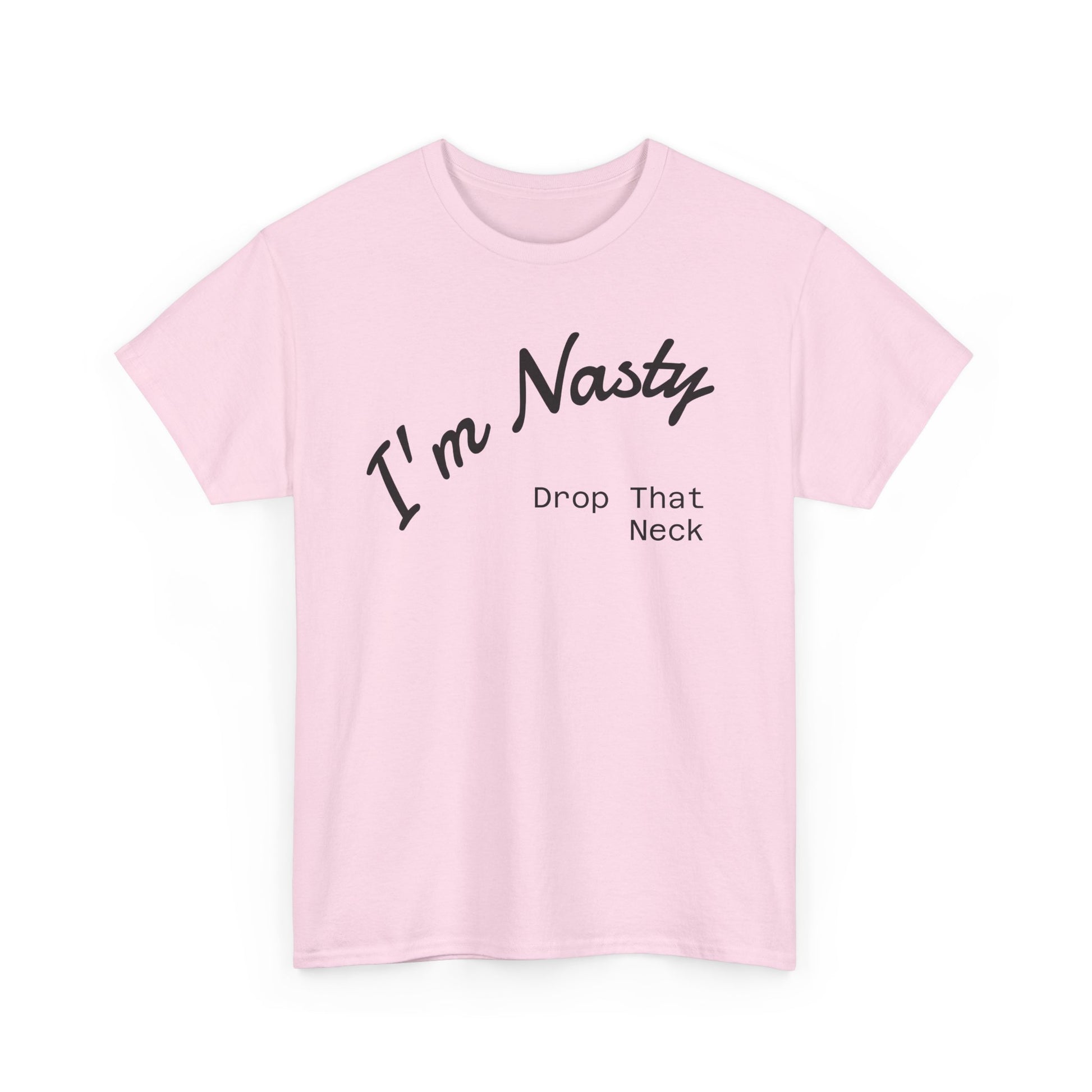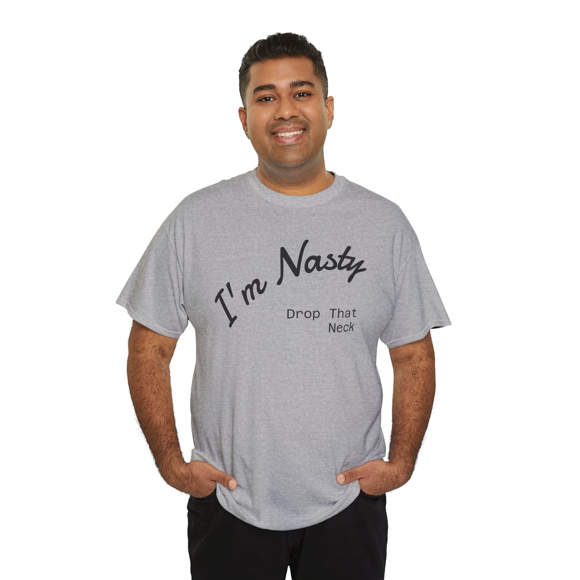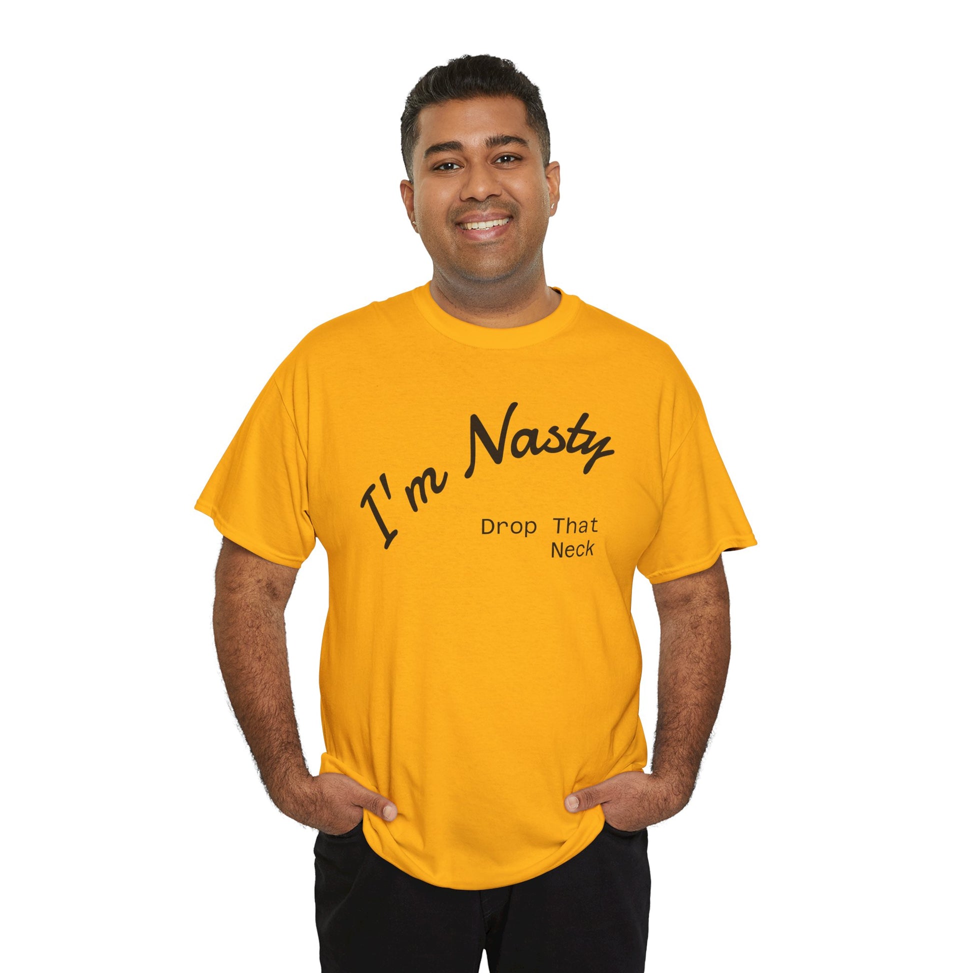 Introducing the ultimate Unisex Heavy Cotton Tee, perfect for those who dare to express themselves. This tee radiates a fun and carefree vibe, ideal for casual outings, parties, or just lounging at home. Its classic fit makes it a versatile addition to any wardrobe—easily paired with jeans, shorts, or skirts, making it suitable for both men and women. Whether you're celebrating a birthday, a casual summer event, or just looking to showcase your unique personality, this shirt fits right in. It's a great gift for friends or family members who appreciate a blend of humor and style. Unisex Graphic Tee, I'm Nasty Drop That Neck Shirt, Casual Wear, Gift for Friends, Funny T-Shirt