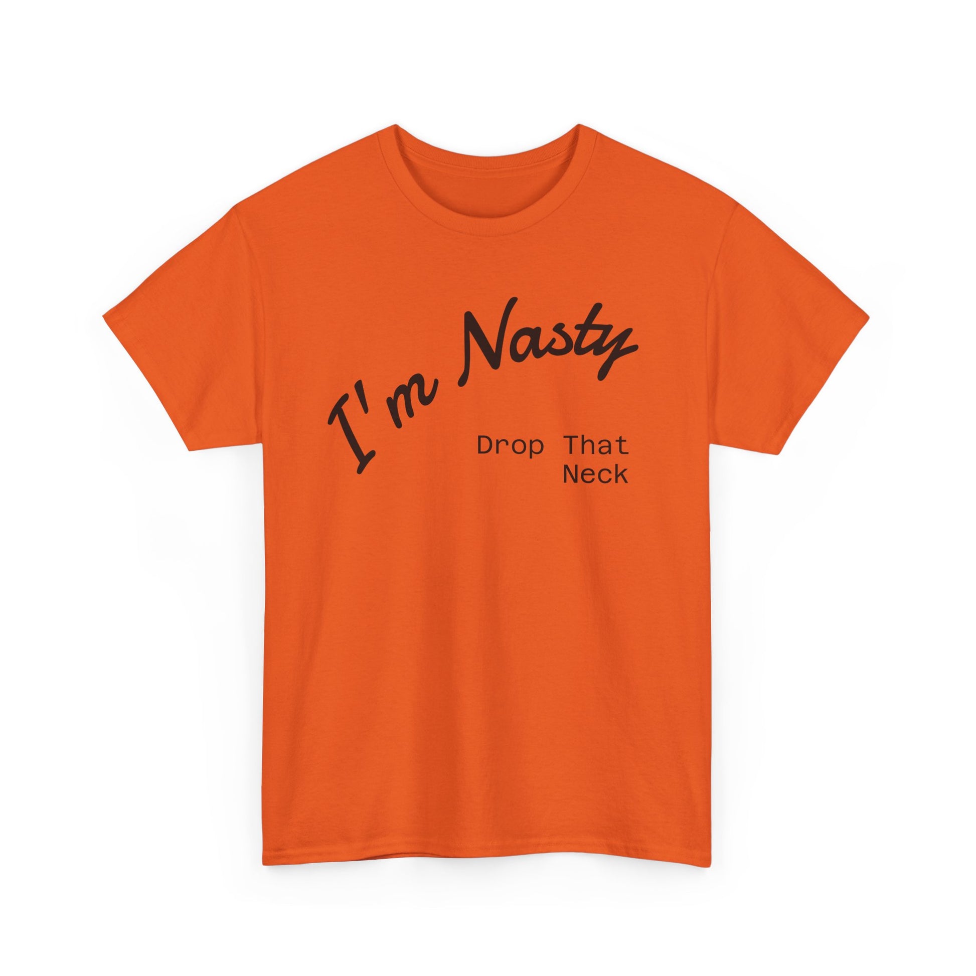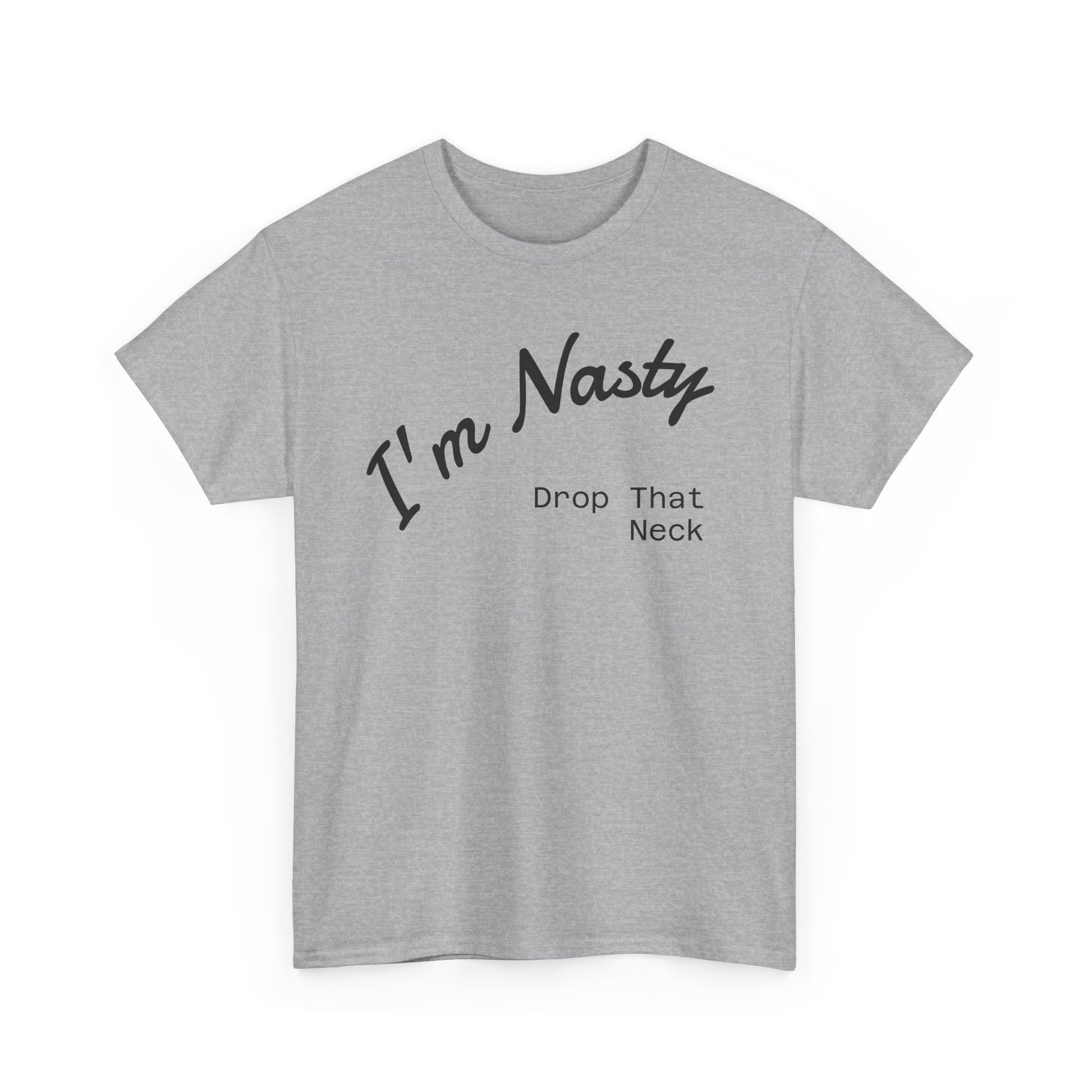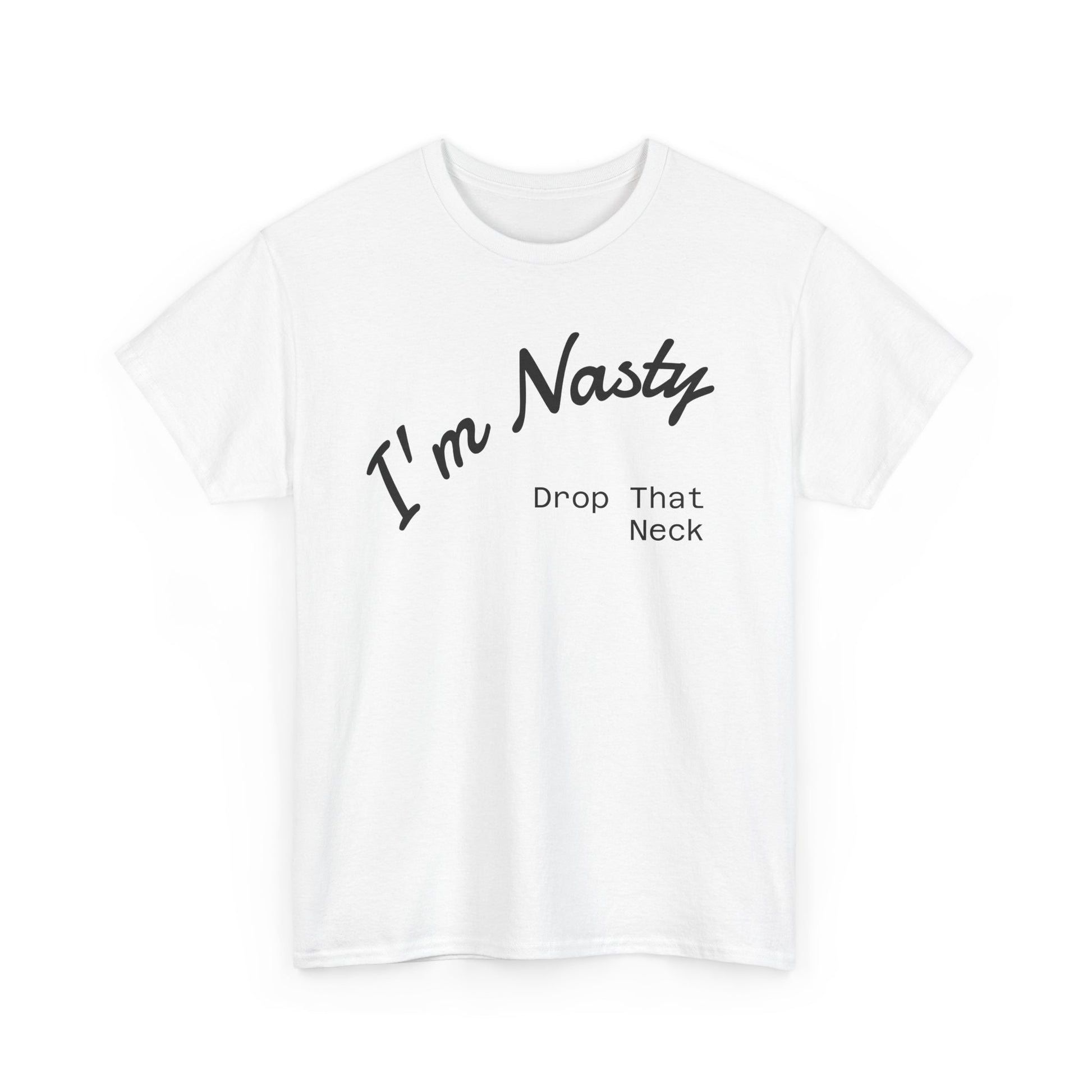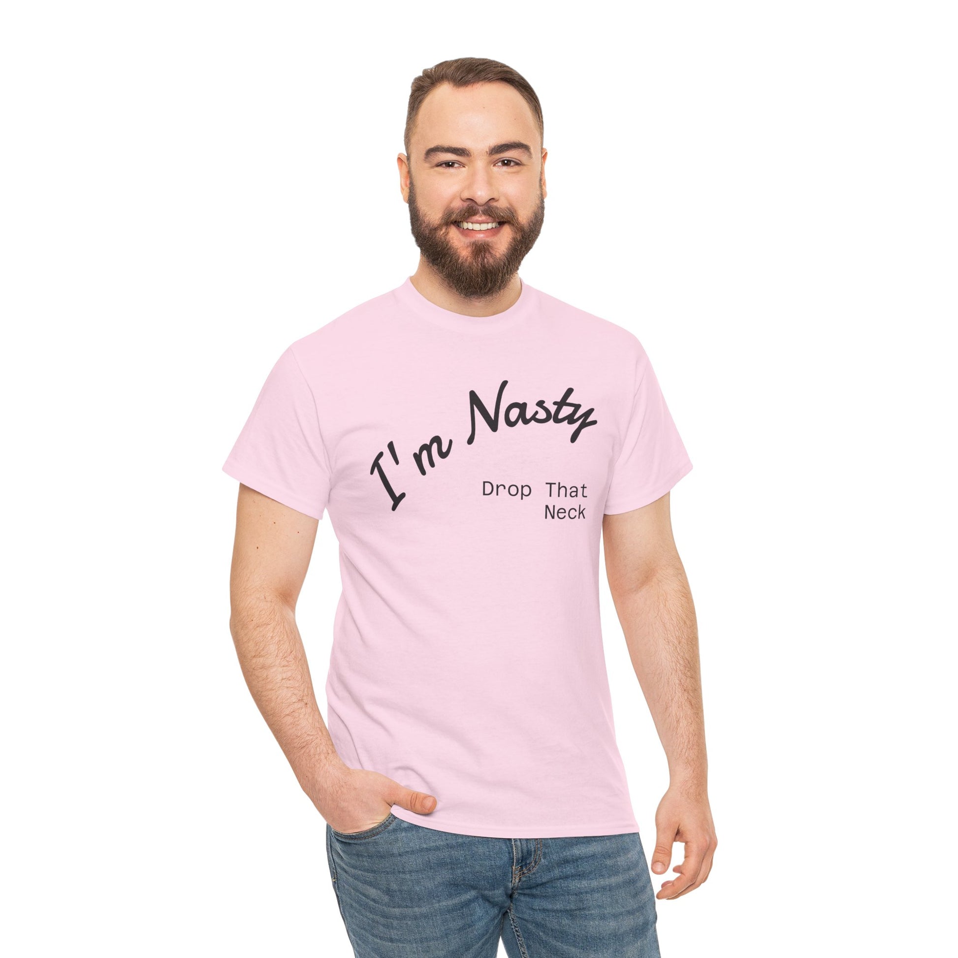 Introducing the ultimate Unisex Heavy Cotton Tee, perfect for those who dare to express themselves. This tee radiates a fun and carefree vibe, ideal for casual outings, parties, or just lounging at home. Its classic fit makes it a versatile addition to any wardrobe—easily paired with jeans, shorts, or skirts, making it suitable for both men and women. Whether you're celebrating a birthday, a casual summer event, or just looking to showcase your unique personality, this shirt fits right in. It's a great gift for friends or family members who appreciate a blend of humor and style. Unisex Graphic Tee, I'm Nasty Drop That Neck Shirt, Casual Wear, Gift for Friends, Funny T-Shirt