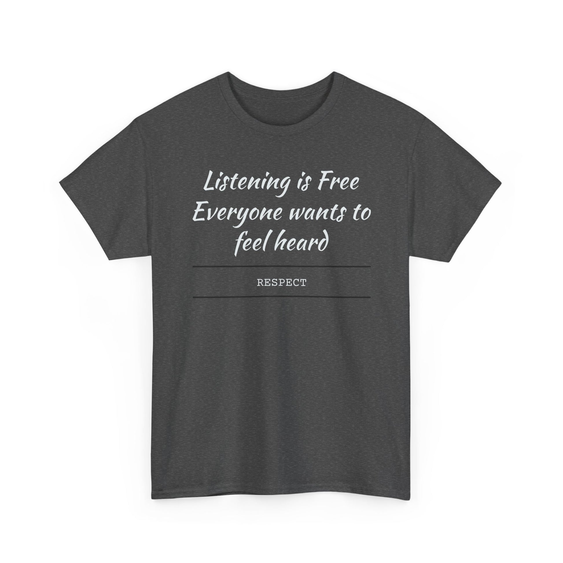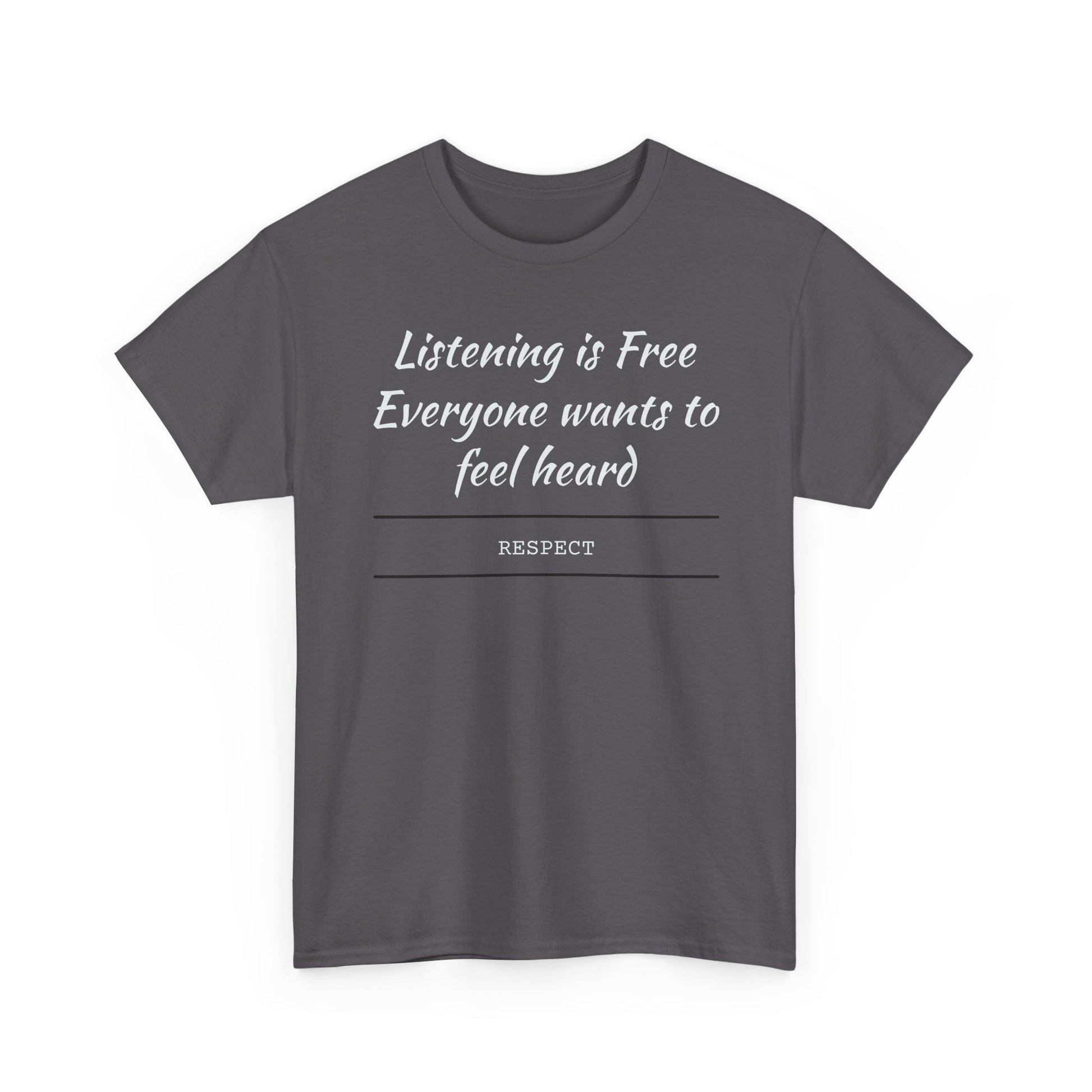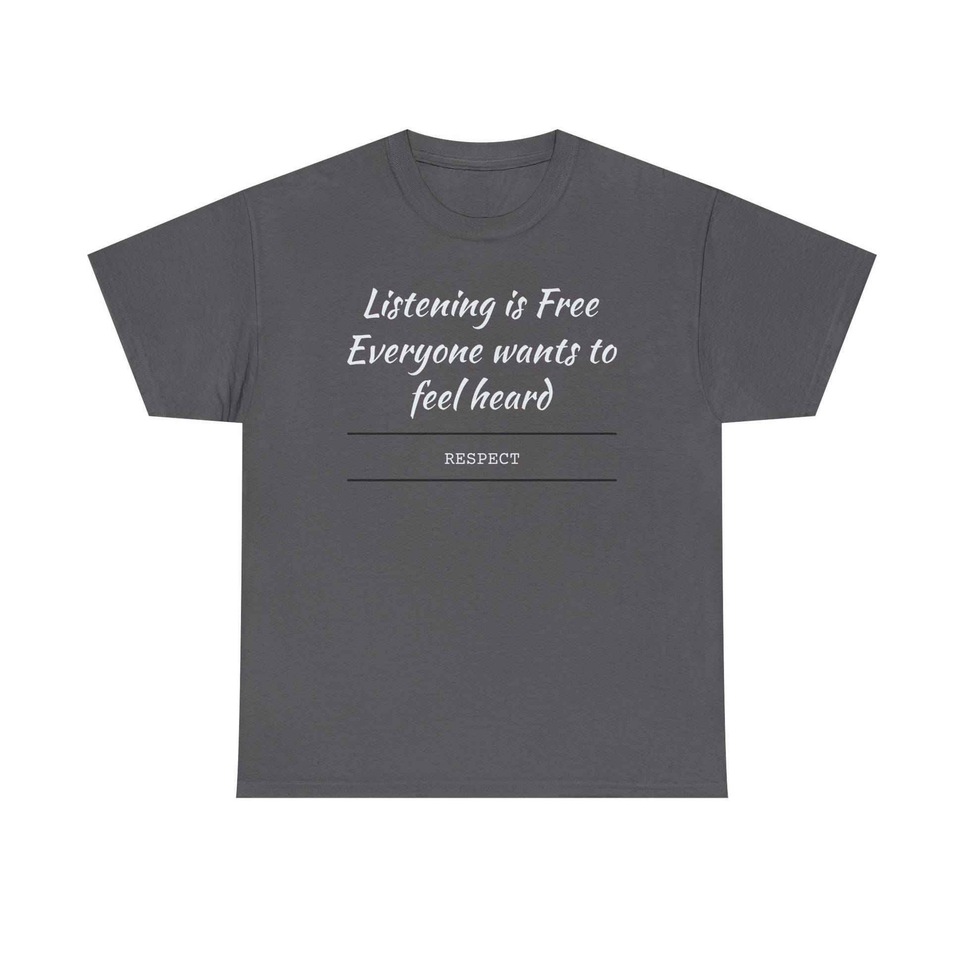 Whether you're gifting it for a birthday, celebrating a holiday, or simply treating yourself, this tee is relevant for occasions like International Day of Listening or National Kindness Day. It's a versatile wardrobe staple for adults who appreciate thoughtful designs and comfortable wear, making it a fantastic addition to anyone's closet. Empowering Message Tee - Listening is Free, Feel Heard, Unisex Heavy Cotton Shirt for Advocates, Gifts, Self-Care, Awareness Events