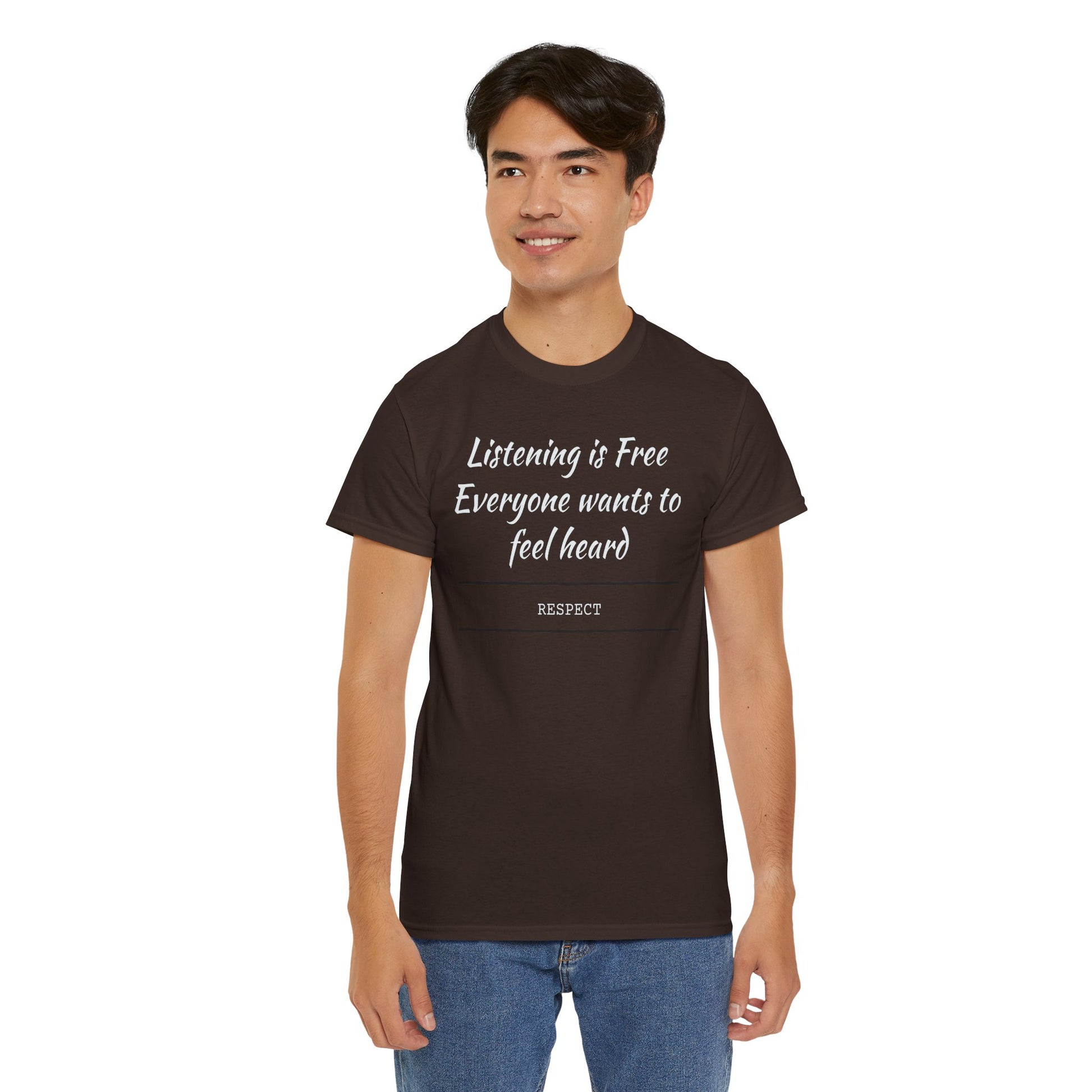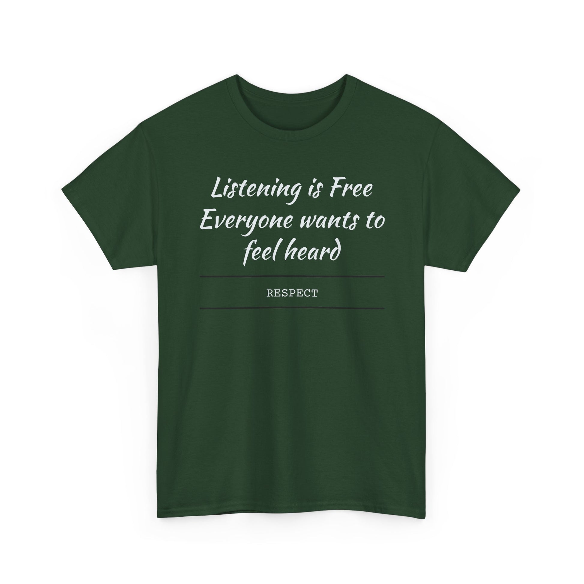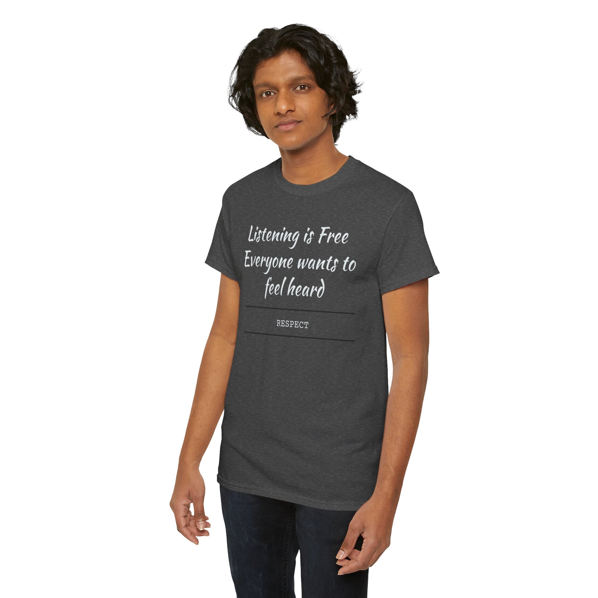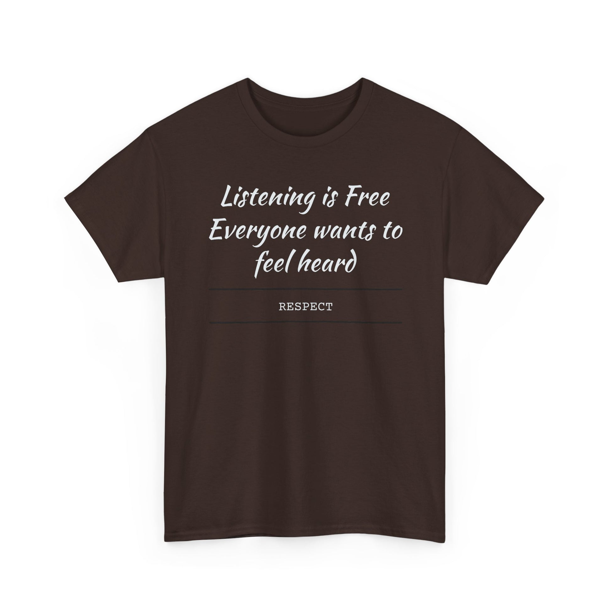 Whether you're gifting it for a birthday, celebrating a holiday, or simply treating yourself, this tee is relevant for occasions like International Day of Listening or National Kindness Day. It's a versatile wardrobe staple for adults who appreciate thoughtful designs and comfortable wear, making it a fantastic addition to anyone's closet. Empowering Message Tee - Listening is Free, Feel Heard, Unisex Heavy Cotton Shirt for Advocates, Gifts, Self-Care, Awareness Events