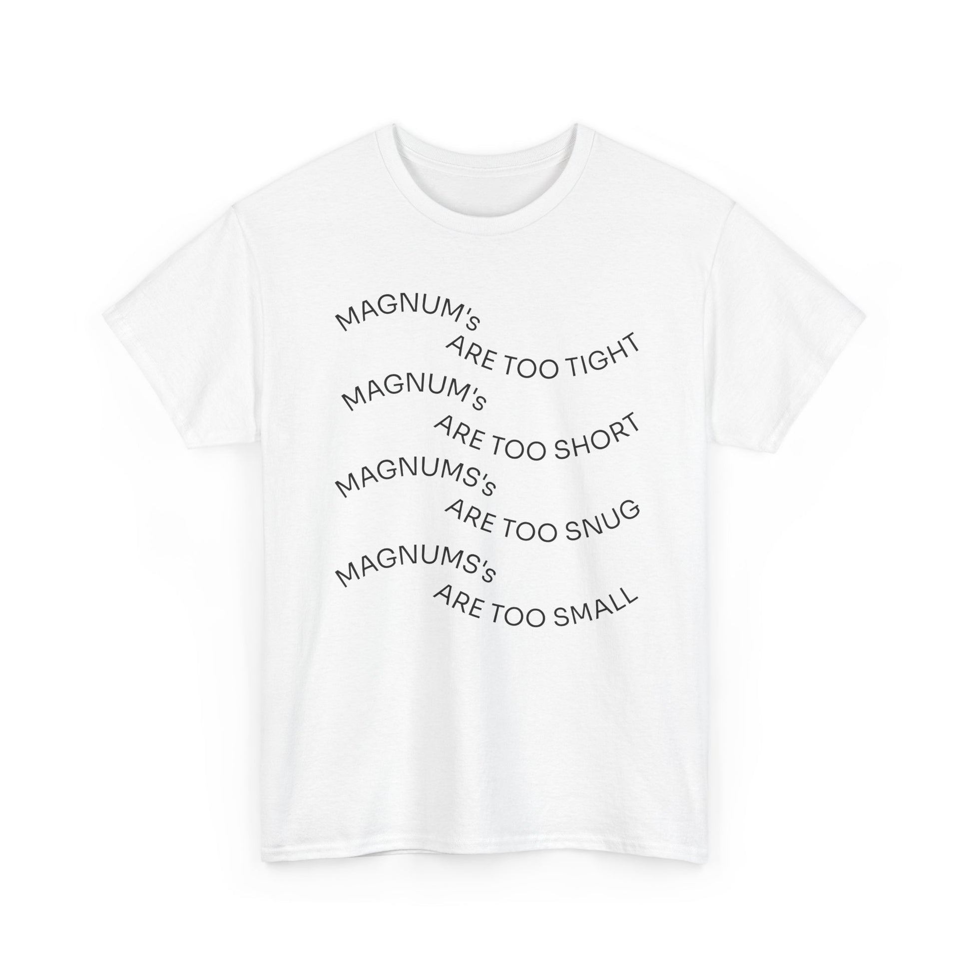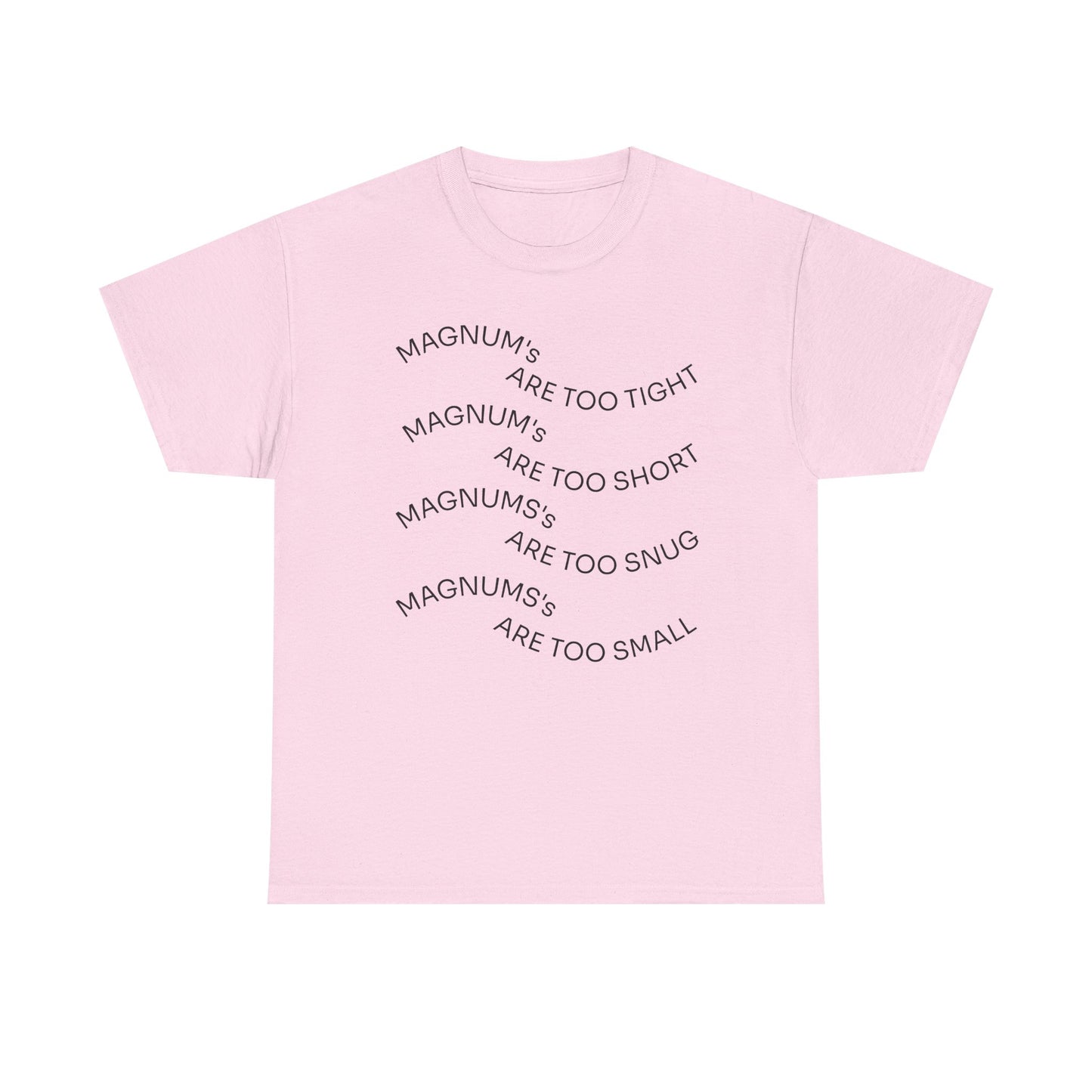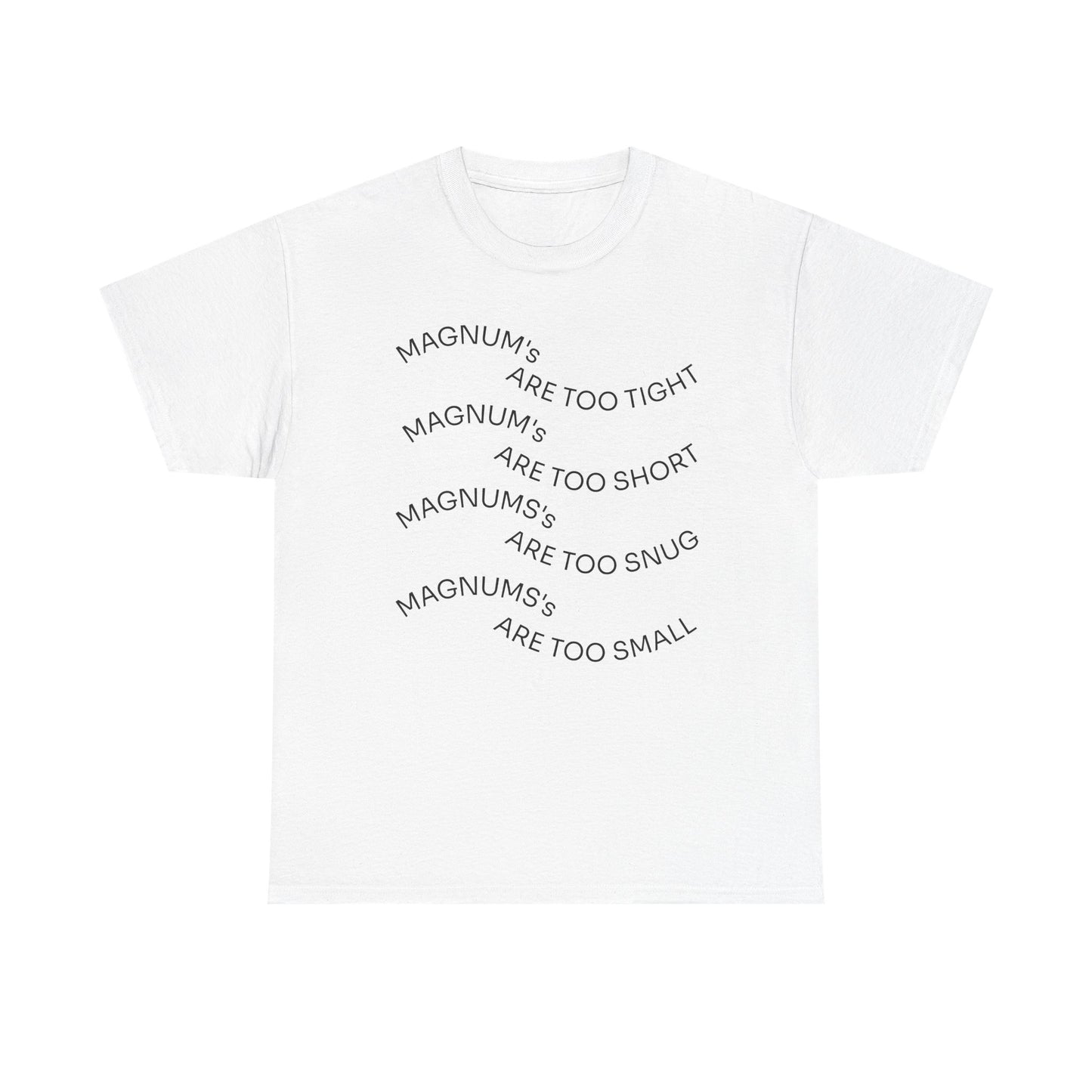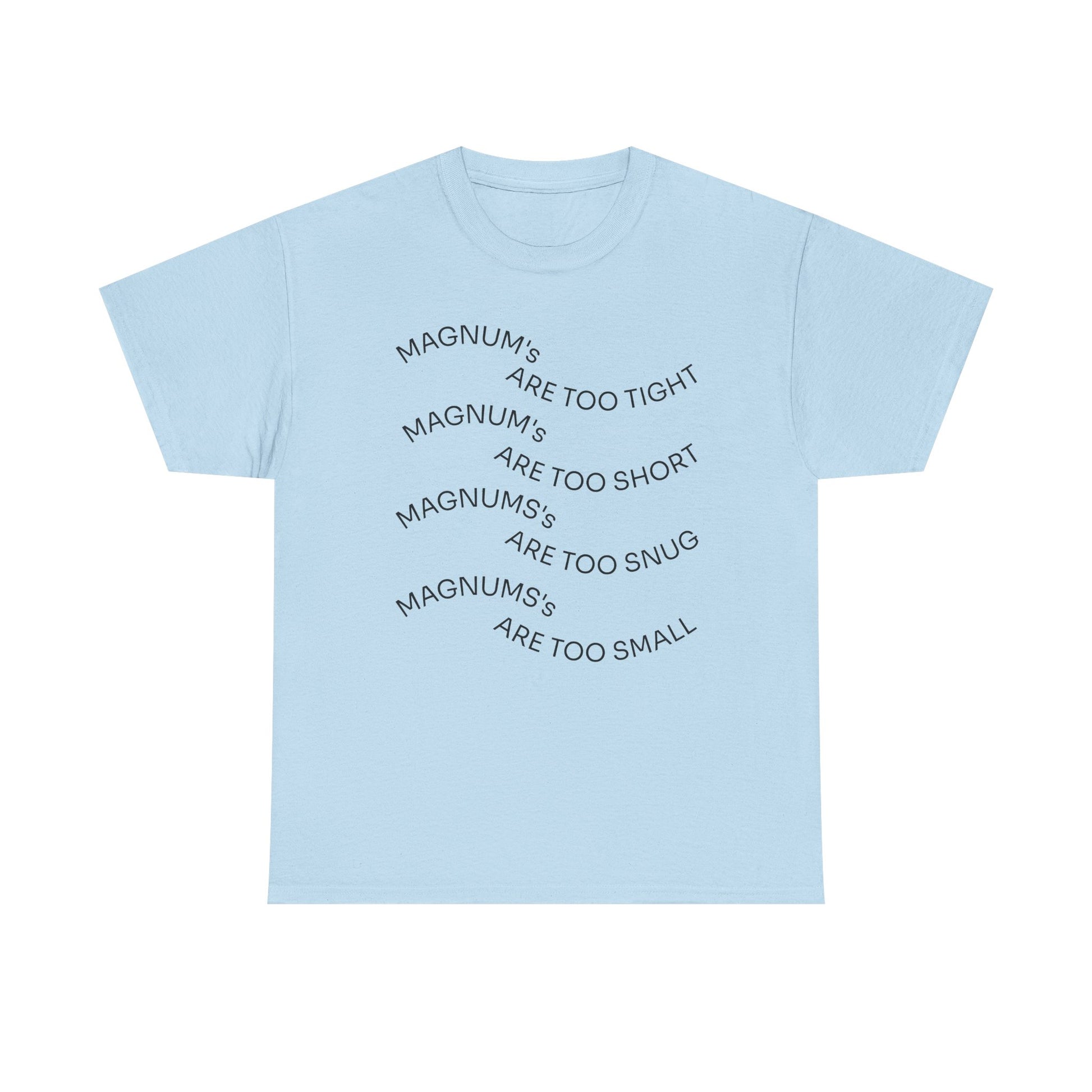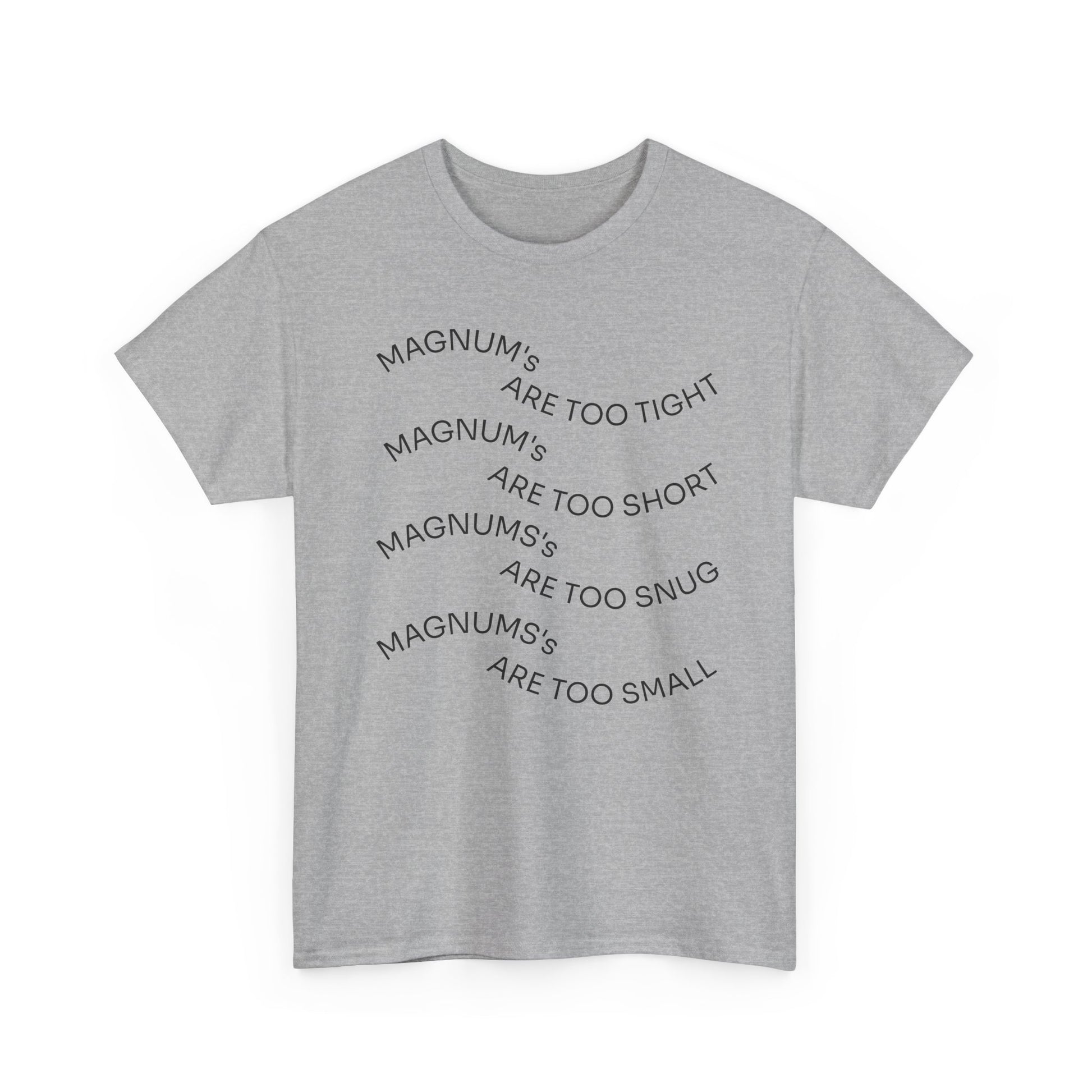 Introducing a versatile Unisex Heavy Cotton Tee that effortlessly bridges the gap between comfort and style. This tee is perfect for relaxed outings or casual gatherings, offering a laid-back vibe that suits any lifestyle. Its classic fit and crew neckline make it an excellent choice for all occasions, from weekend brunches to casual Fridays at the office. Ideal for anyone who appreciates quality and sustainability, this tee is a thoughtful gift for friends and family during holidays like birthdays, anniversaries, or just as a surprise treat. It’s a staple piece that caters to those who love to express their unique style without compromising on comfort. Funny Unisex Heavy Cotton Tee - 'Magnum's Are Too Tight, Short, Snug' T-Shirt, Humorous Gift, Casual Wear, Birthday Tee, Comfy Everyday