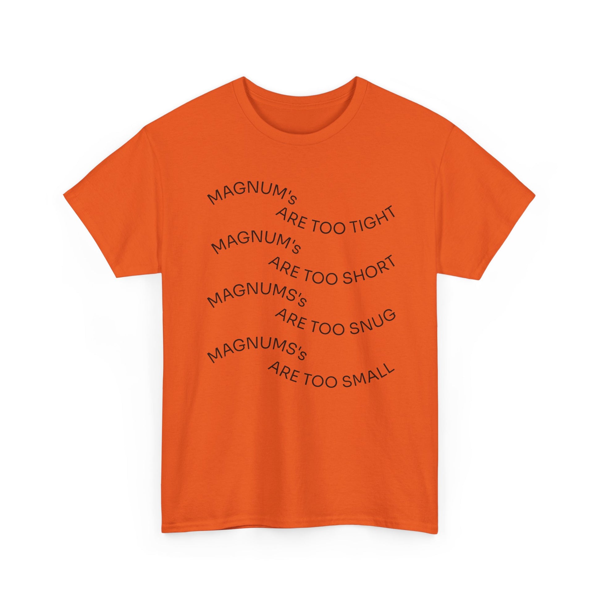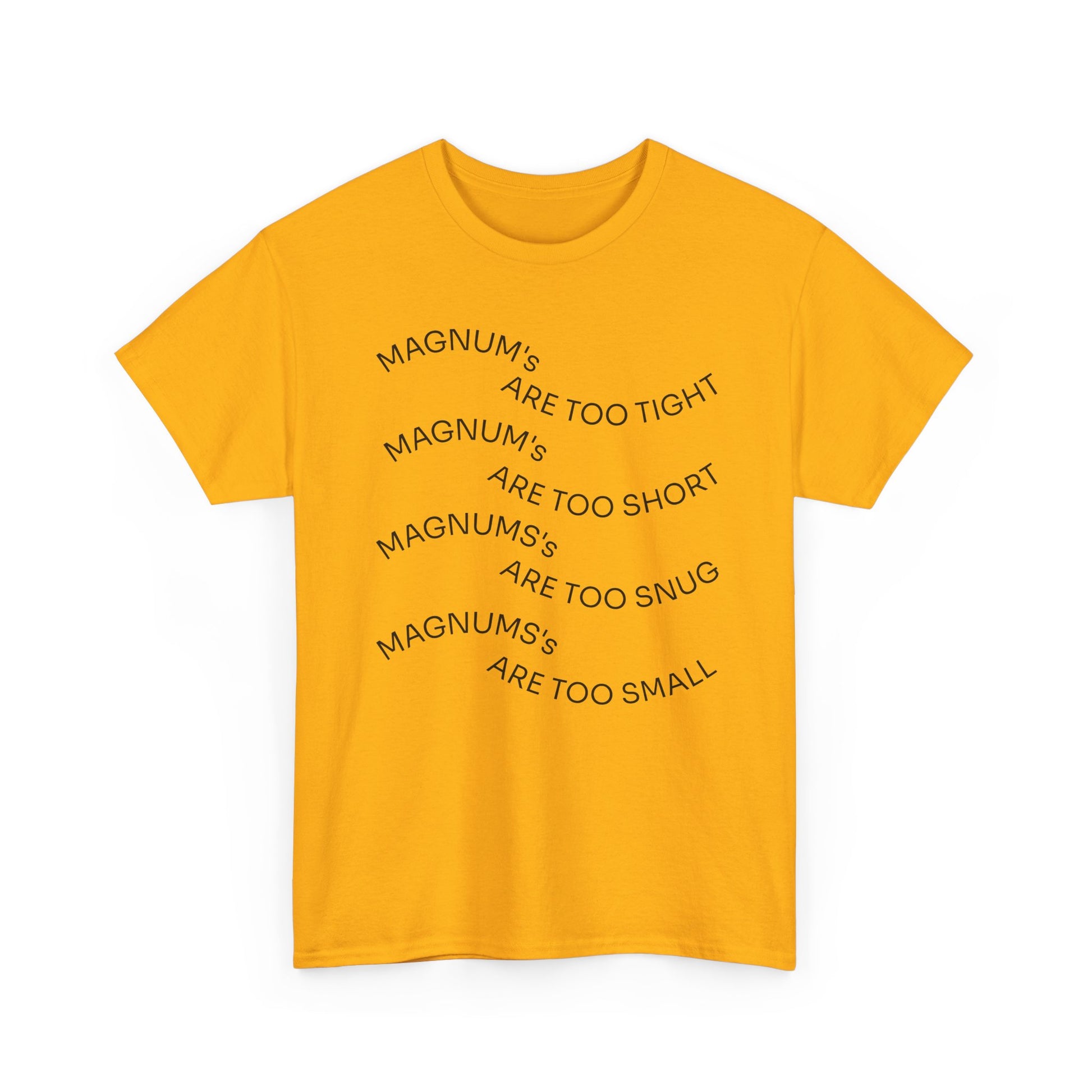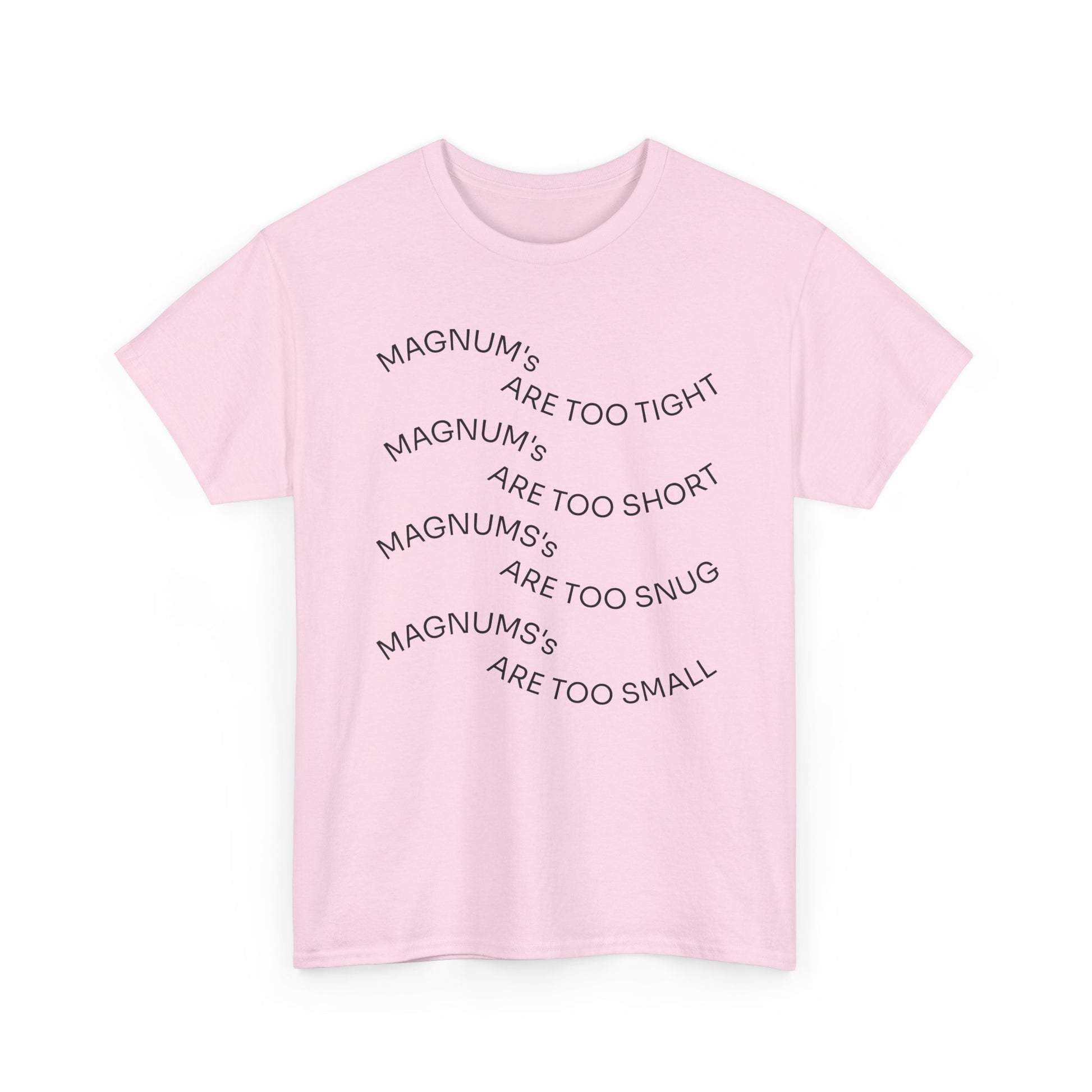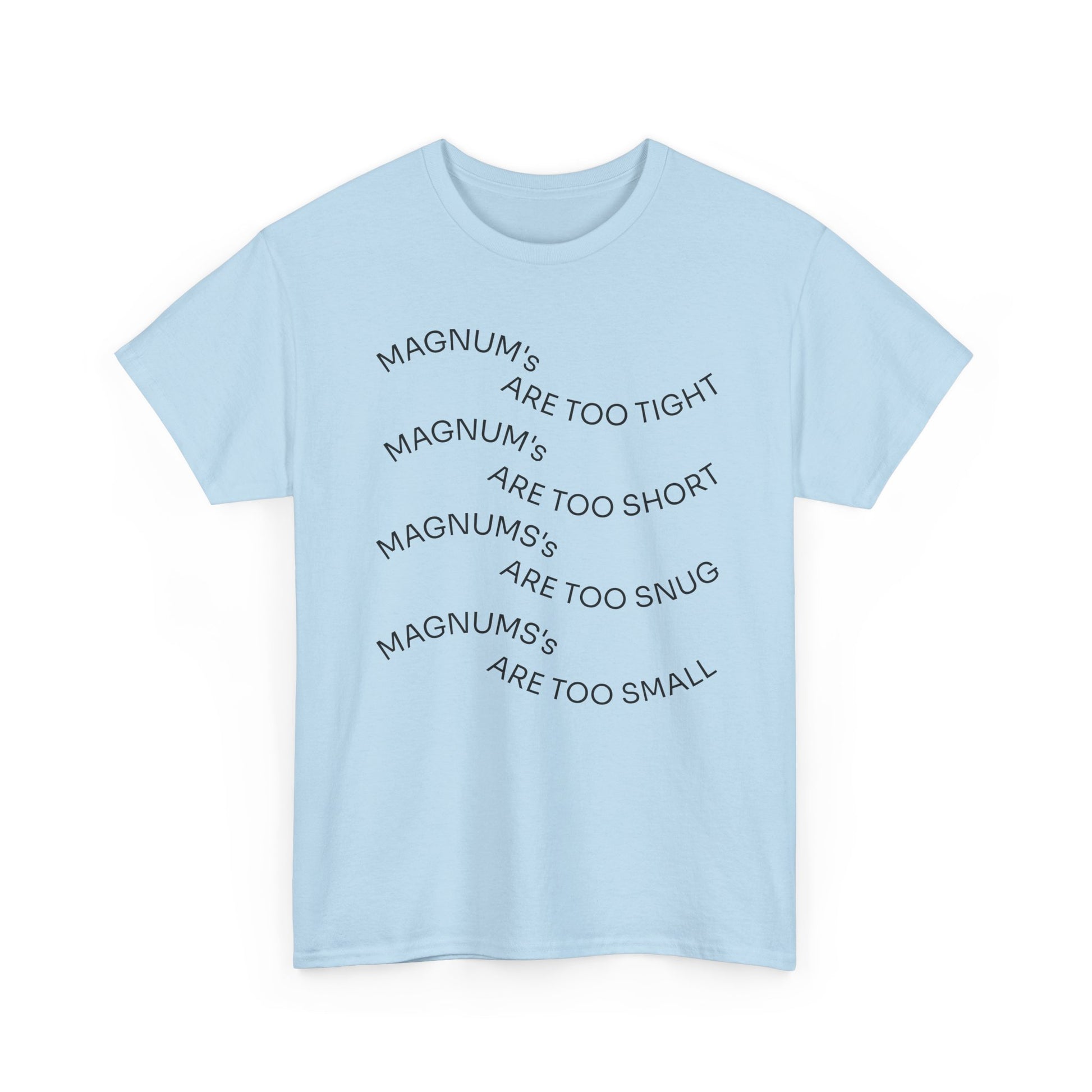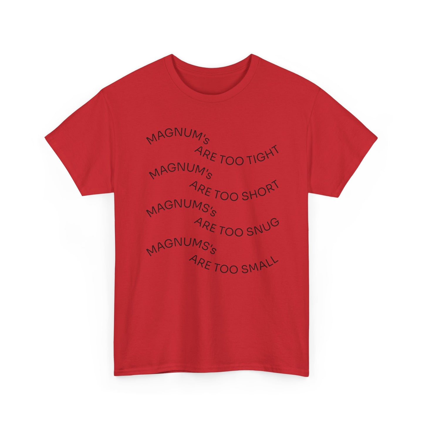 Introducing a versatile Unisex Heavy Cotton Tee that effortlessly bridges the gap between comfort and style. This tee is perfect for relaxed outings or casual gatherings, offering a laid-back vibe that suits any lifestyle. Its classic fit and crew neckline make it an excellent choice for all occasions, from weekend brunches to casual Fridays at the office. Ideal for anyone who appreciates quality and sustainability, this tee is a thoughtful gift for friends and family during holidays like birthdays, anniversaries, or just as a surprise treat. It’s a staple piece that caters to those who love to express their unique style without compromising on comfort. Funny Unisex Heavy Cotton Tee - 'Magnum's Are Too Tight, Short, Snug' T-Shirt, Humorous Gift, Casual Wear, Birthday Tee, Comfy Everyday