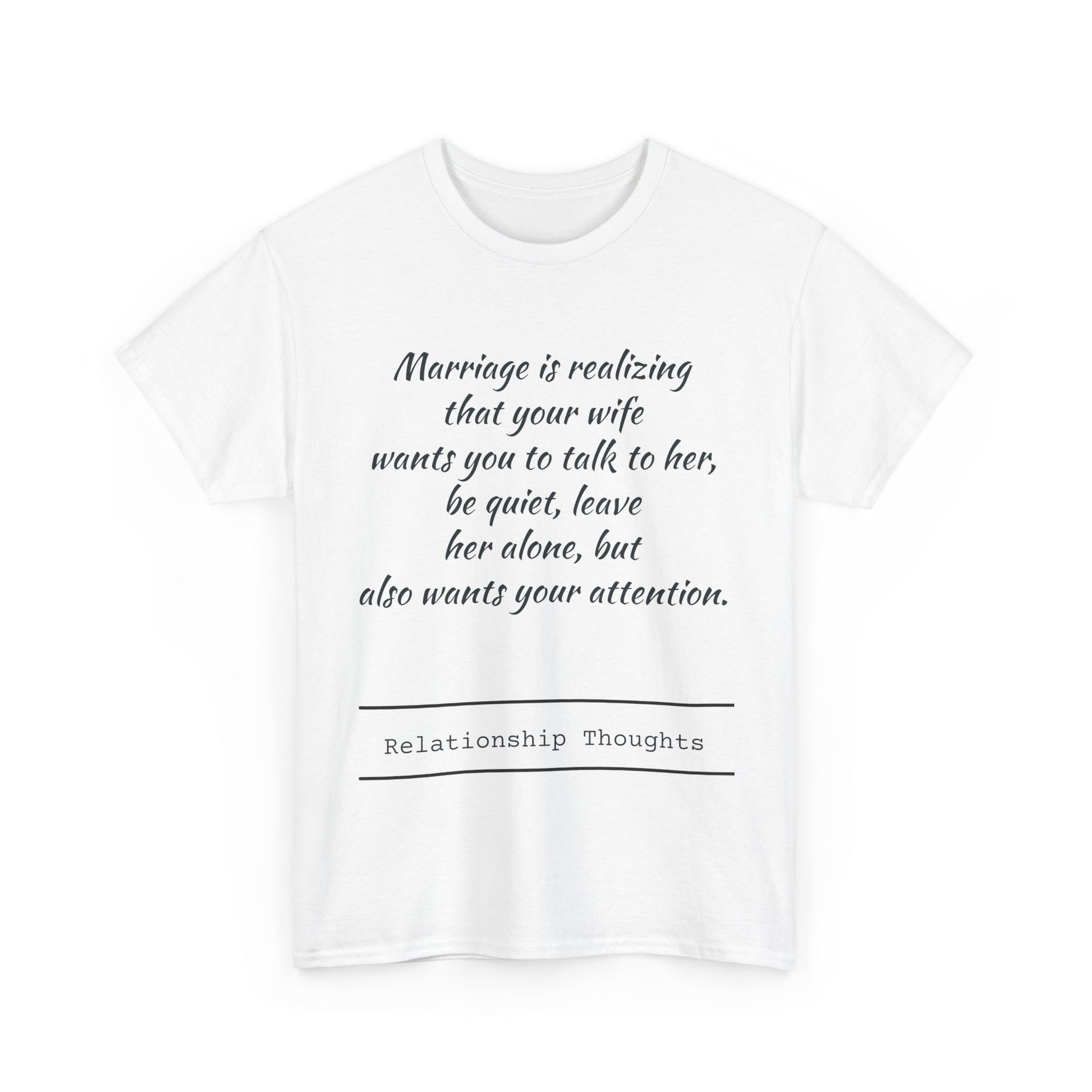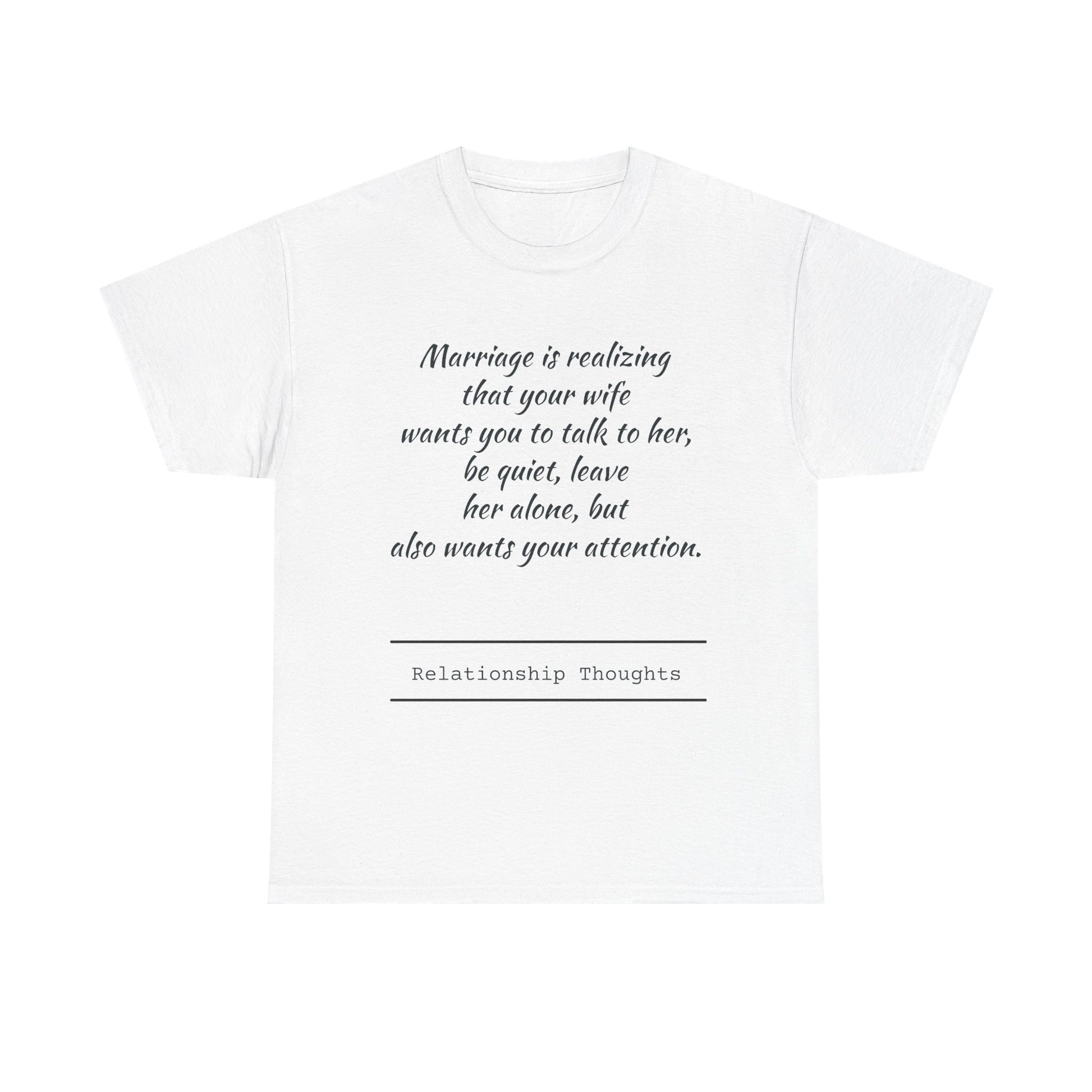 Introducing the Unisex Heavy Cotton Tee, a perfect blend of comfort and style that enhances any wardrobe. This tee embodies a laid-back, versatile vibe, making it suitable for casual outings, gatherings, or simply lounging at home. With its timeless crew neckline and classic fit, it easily transitions from day to night. This product is ideal for adults who enjoy expressing their individuality and sense of humor. Great for occasions like birthdays, anniversaries, and casual get-togethers, it's a thoughtful gift for loved ones that brings a smile. Celebrate everyday moments with a tee that feels as good as it looks! Funny Relationship Thoughts Tee, Unisex Cotton T-Shirt, Gift for Couples, Marriage Humor Shirt, Love Quotes Tee, Casual Wear.