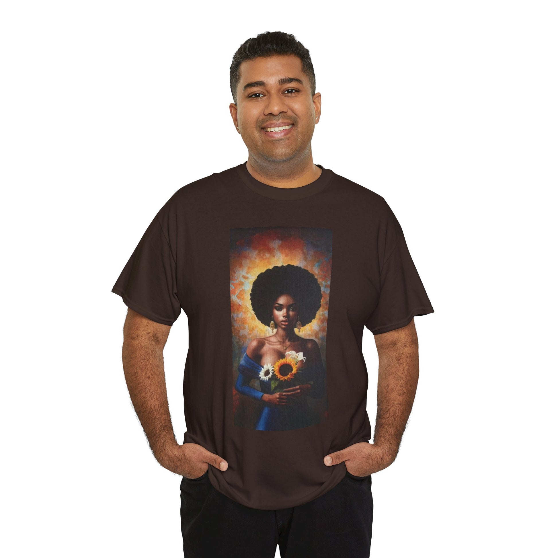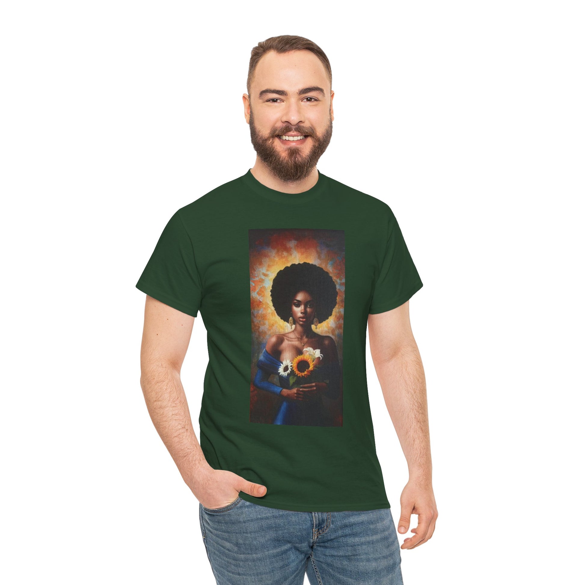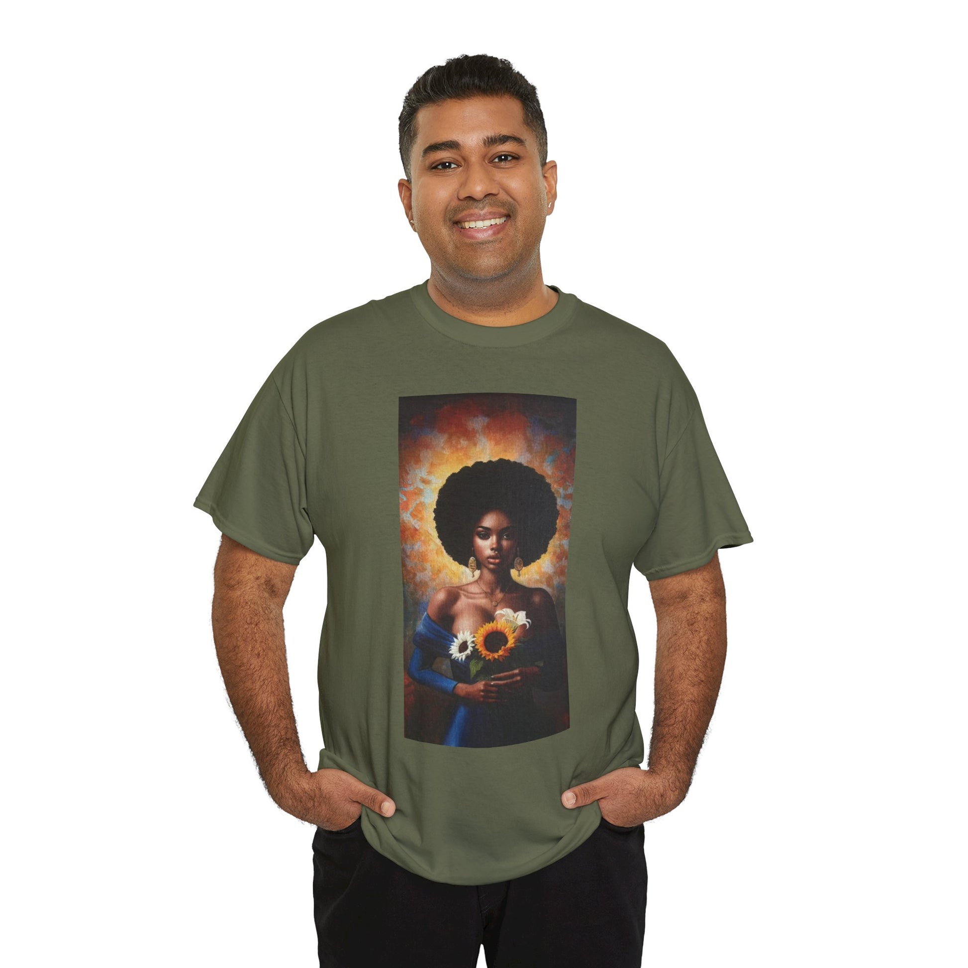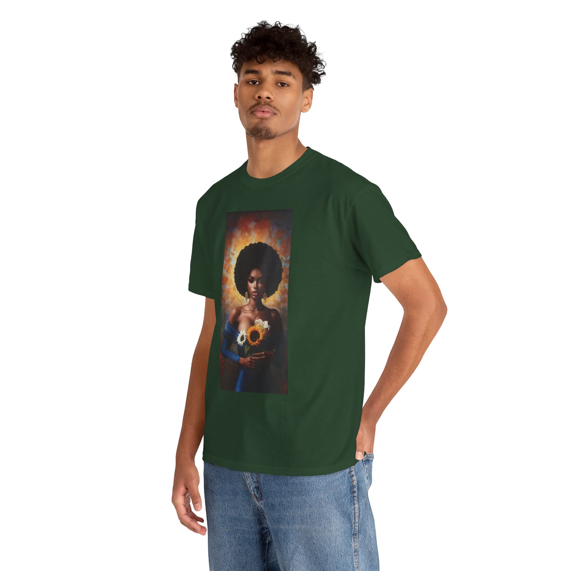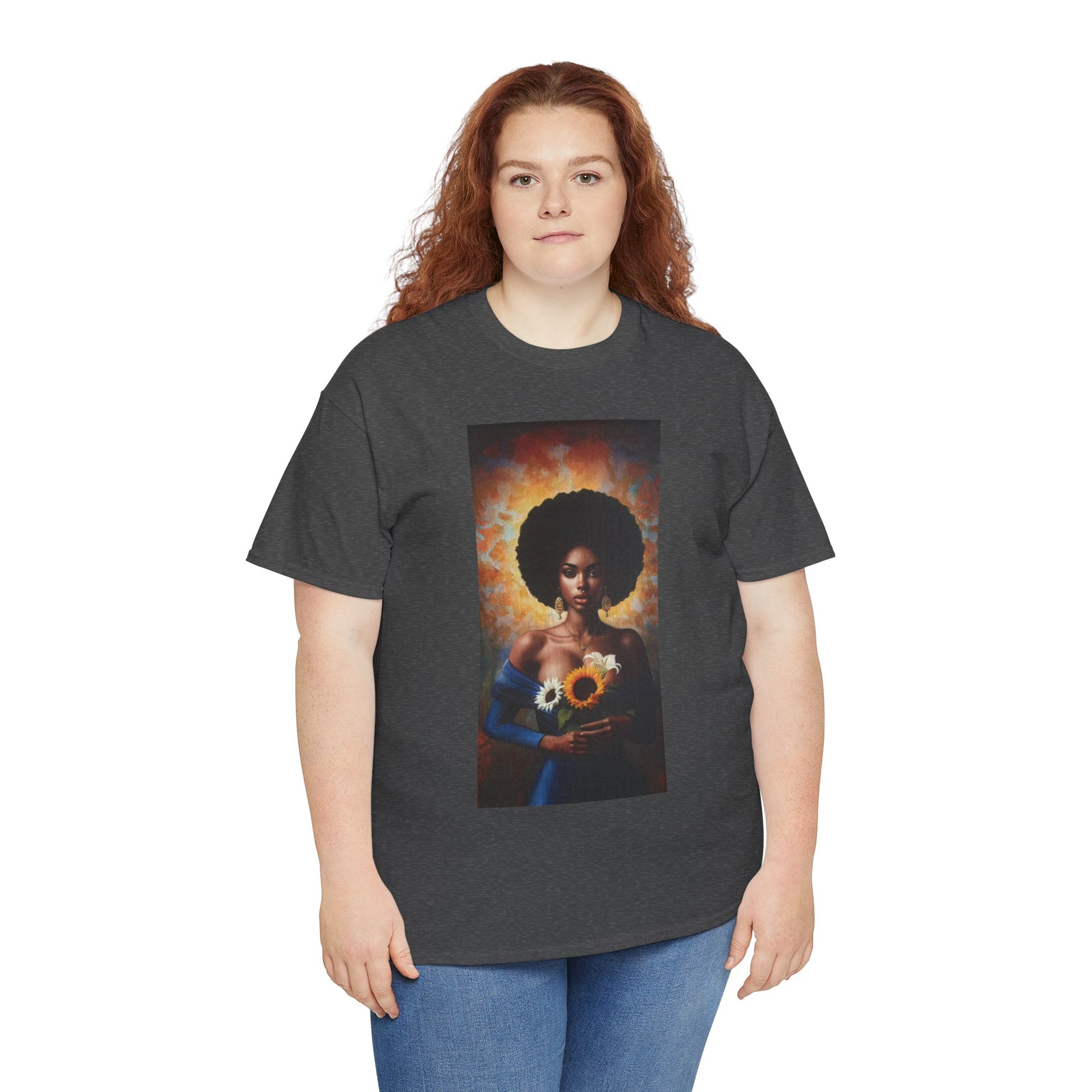 Elevate your wardrobe with this unisex heavy cotton tee, a perfect blend of comfort and style. With its classic fit and timeless crew neckline, this shirt easily transitions from casual outings to semi-formal occasions. The vibrant design adds a unique touch, making it an ideal choice for those who appreciate artistic expression. Whether you're celebrating a birthday, attending a festival, or simply looking to make a fashion statement, this tee is designed for everyone. Crafted from ethically sourced cotton, it not only looks good but also feels great against your skin. Share it as a thoughtful gift or keep it for yourself to express your individuality at family gatherings, picnics, or everyday wear. Sunflower Goddess Unisex Heavy Cotton Tee, Floral T-Shirt, Black Woman Artwork Tee, Gift for Her, Casual Everyday Wear