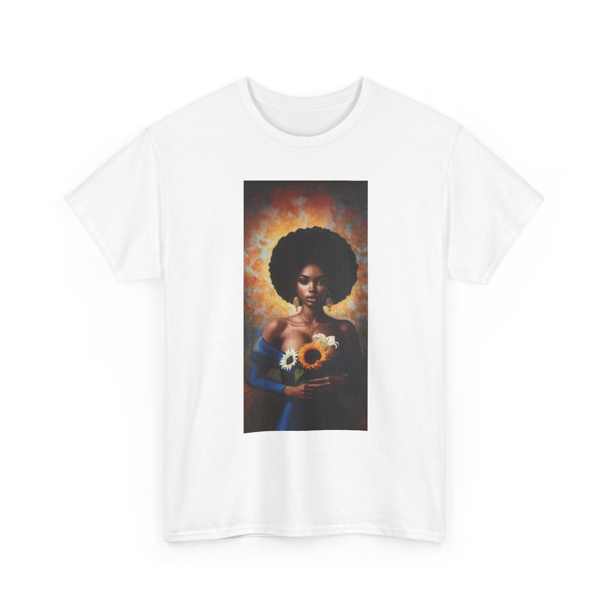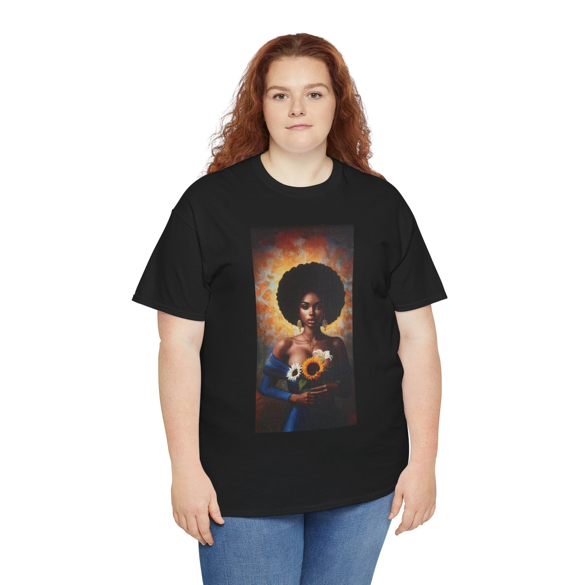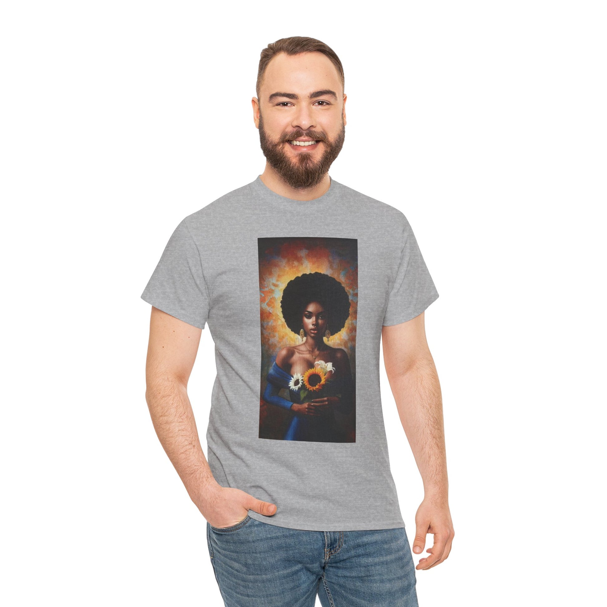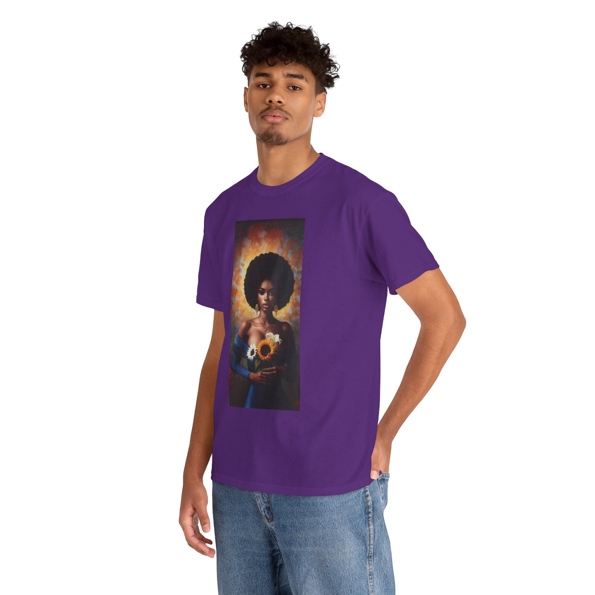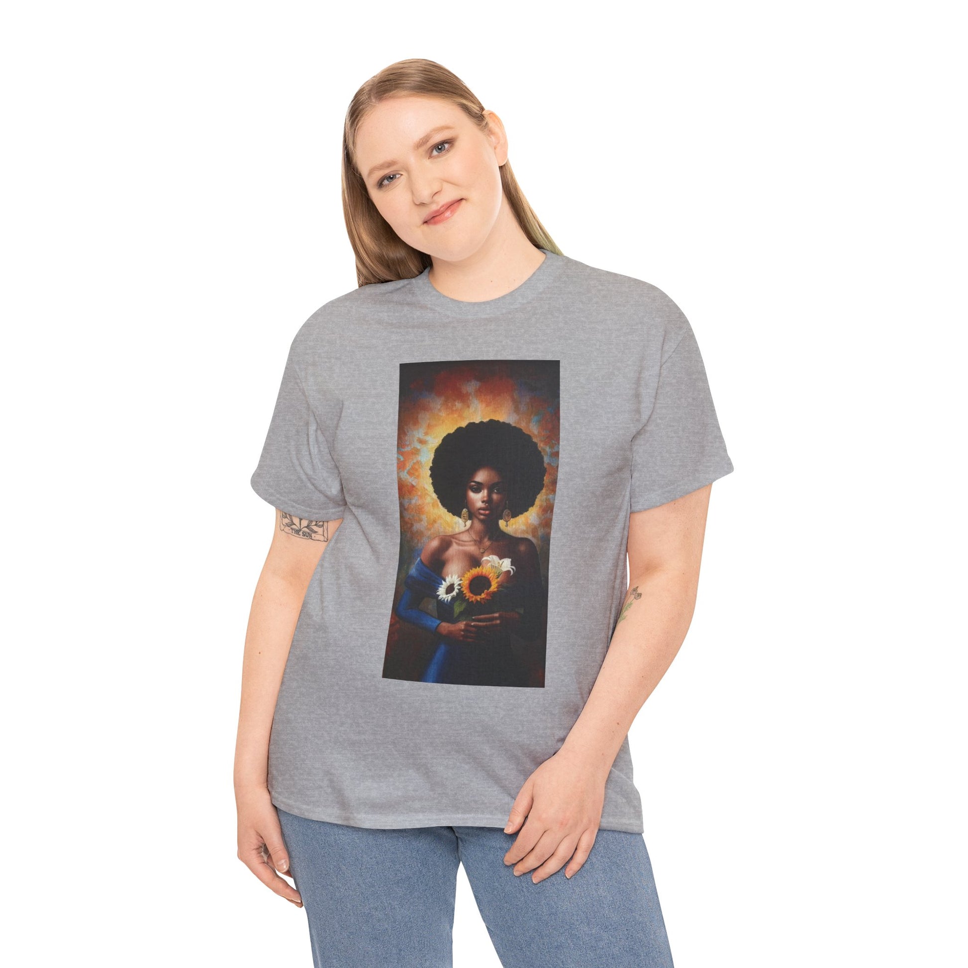 Elevate your wardrobe with this unisex heavy cotton tee, a perfect blend of comfort and style. With its classic fit and timeless crew neckline, this shirt easily transitions from casual outings to semi-formal occasions. The vibrant design adds a unique touch, making it an ideal choice for those who appreciate artistic expression. Whether you're celebrating a birthday, attending a festival, or simply looking to make a fashion statement, this tee is designed for everyone. Crafted from ethically sourced cotton, it not only looks good but also feels great against your skin. Share it as a thoughtful gift or keep it for yourself to express your individuality at family gatherings, picnics, or everyday wear. Sunflower Goddess Unisex Heavy Cotton Tee, Floral T-Shirt, Black Woman Artwork Tee, Gift for Her, Casual Everyday Wear