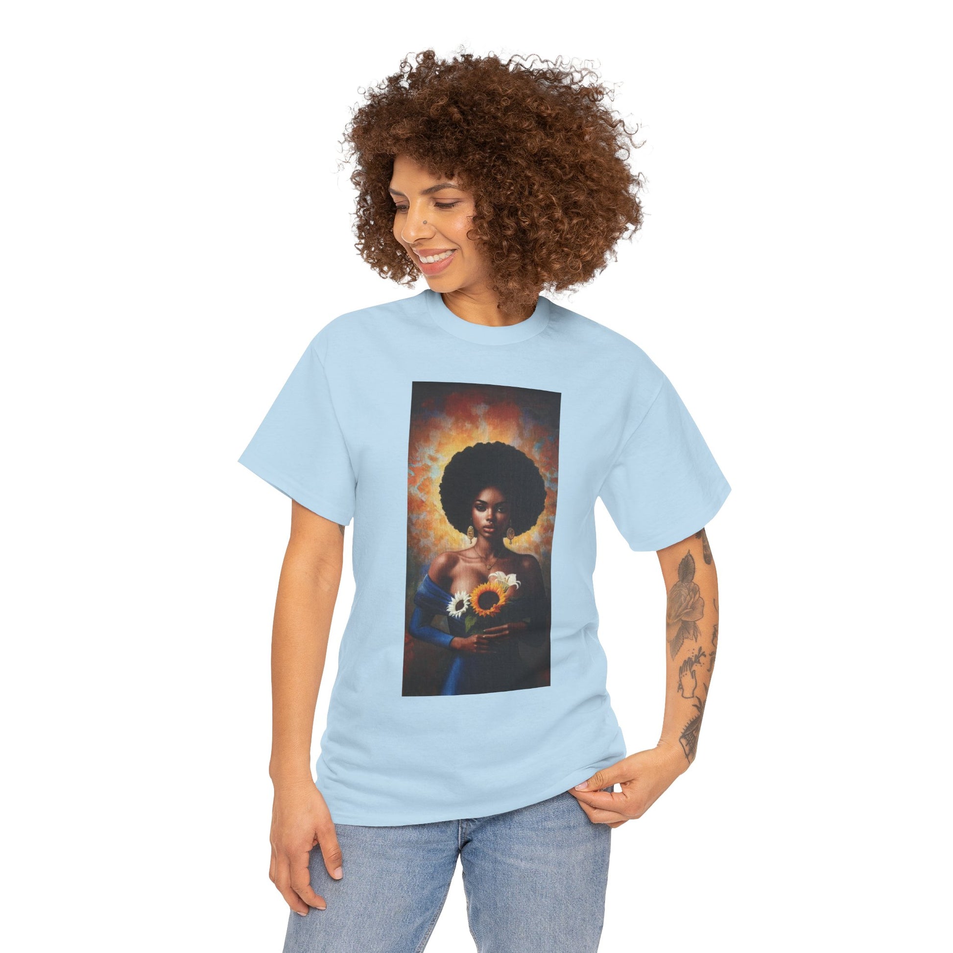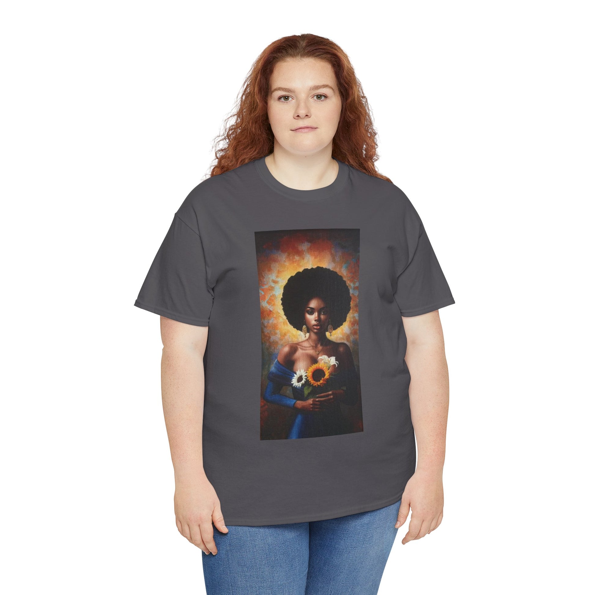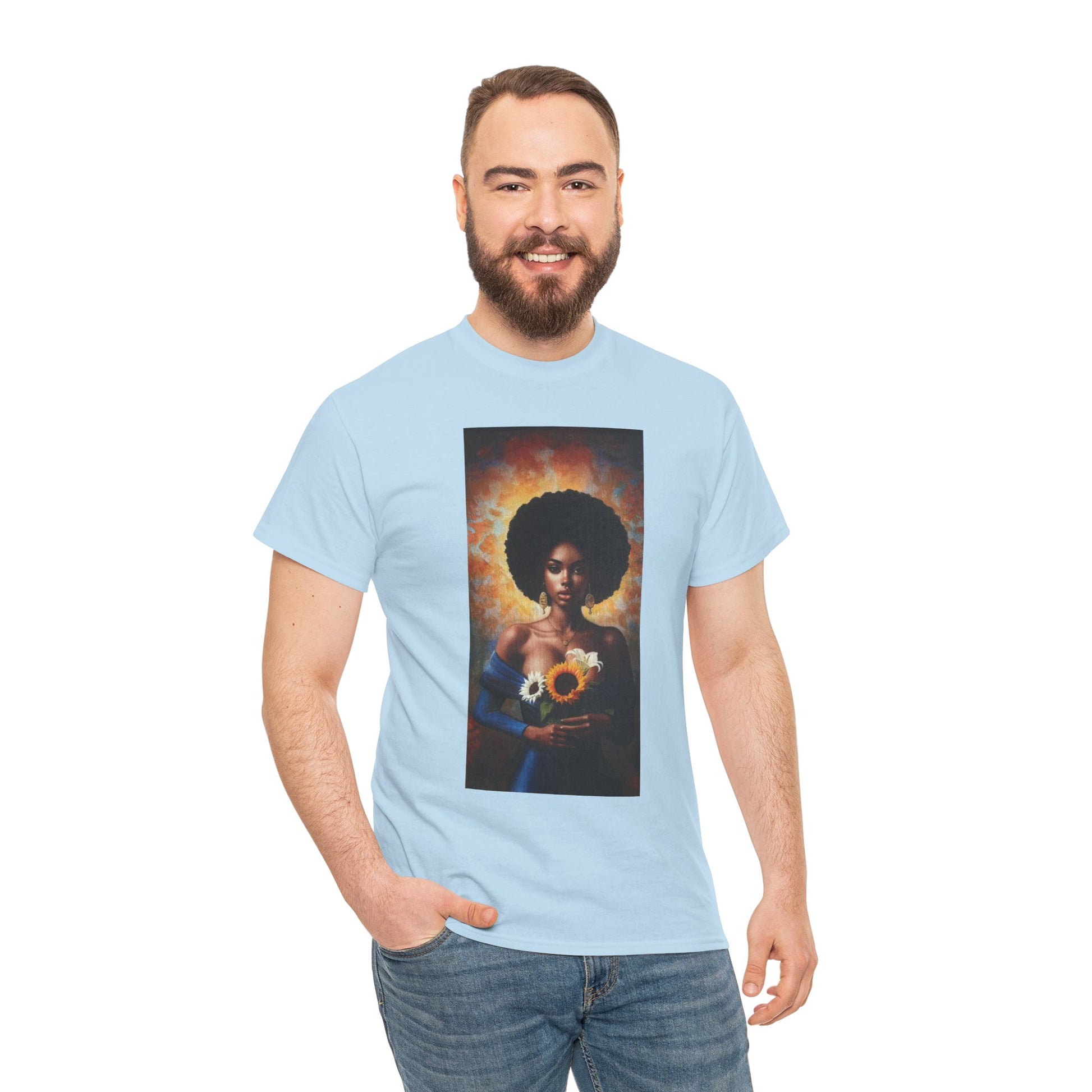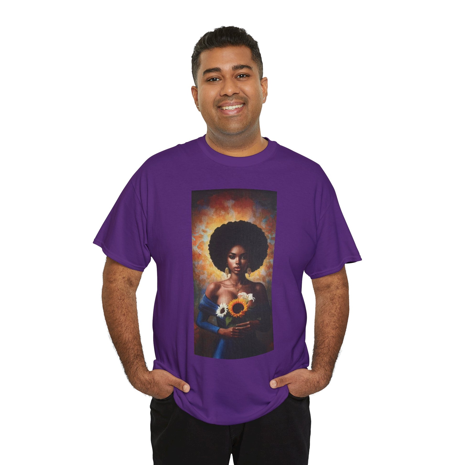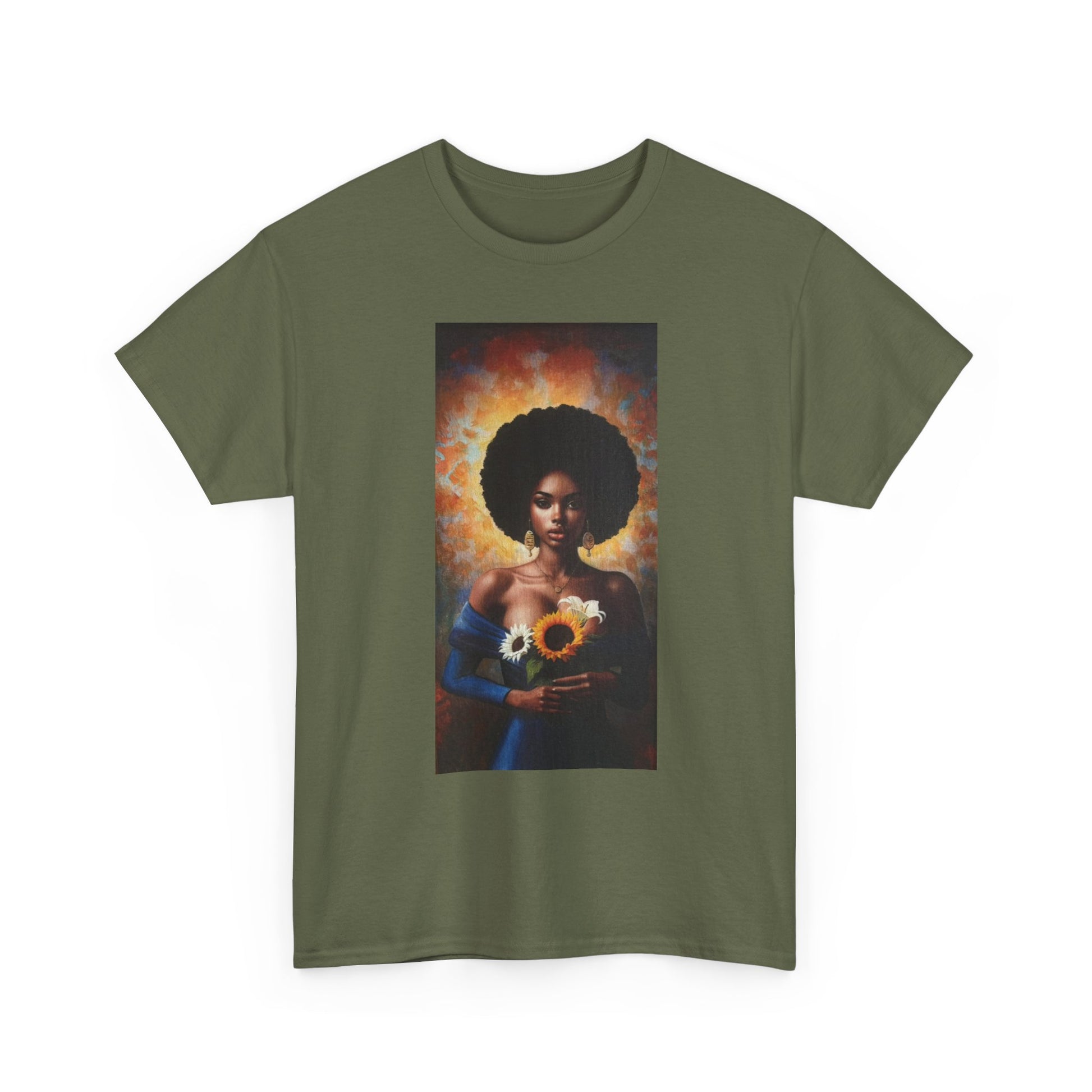 Elevate your wardrobe with this unisex heavy cotton tee, a perfect blend of comfort and style. With its classic fit and timeless crew neckline, this shirt easily transitions from casual outings to semi-formal occasions. The vibrant design adds a unique touch, making it an ideal choice for those who appreciate artistic expression. Whether you're celebrating a birthday, attending a festival, or simply looking to make a fashion statement, this tee is designed for everyone. Crafted from ethically sourced cotton, it not only looks good but also feels great against your skin. Share it as a thoughtful gift or keep it for yourself to express your individuality at family gatherings, picnics, or everyday wear. Sunflower Goddess Unisex Heavy Cotton Tee, Floral T-Shirt, Black Woman Artwork Tee, Gift for Her, Casual Everyday Wear