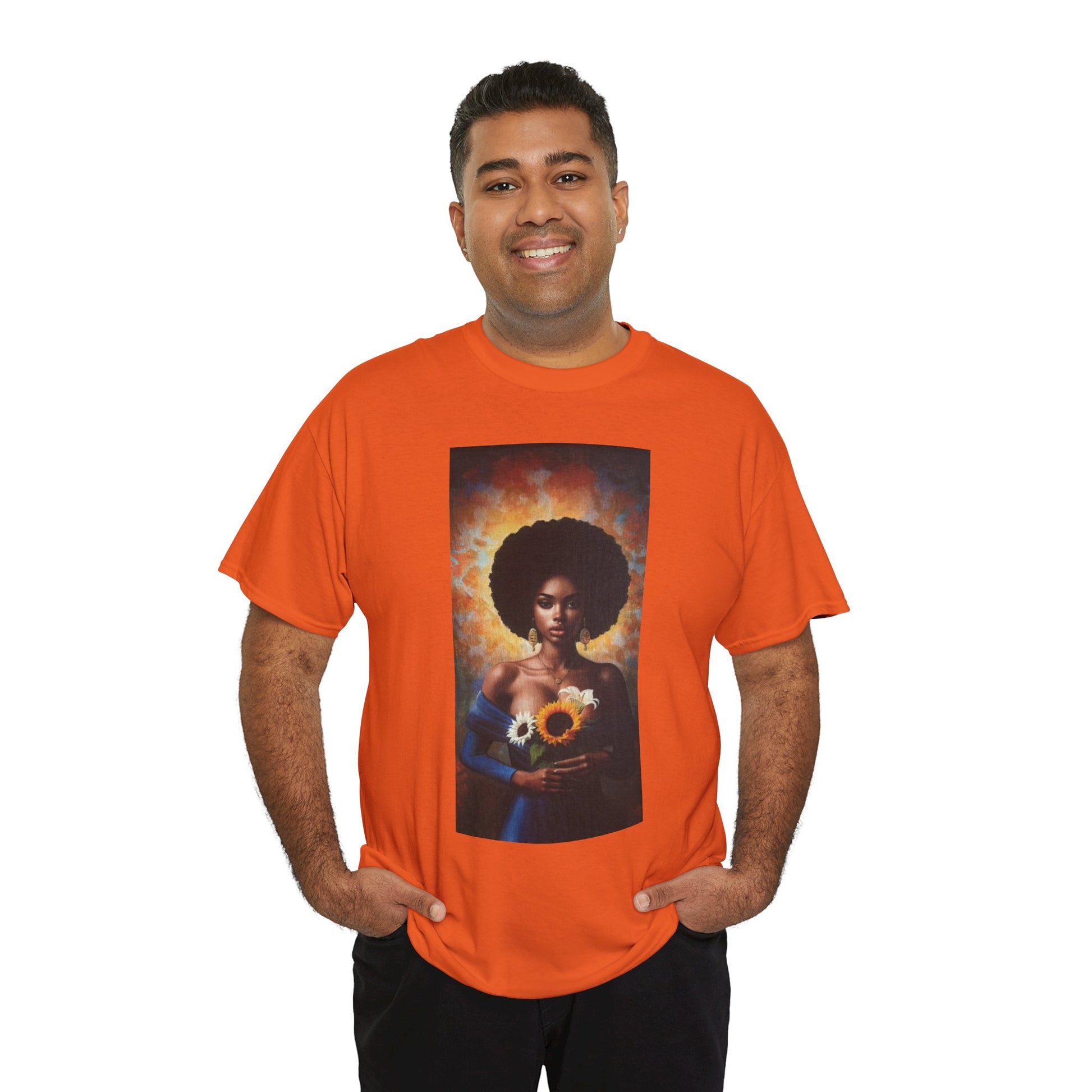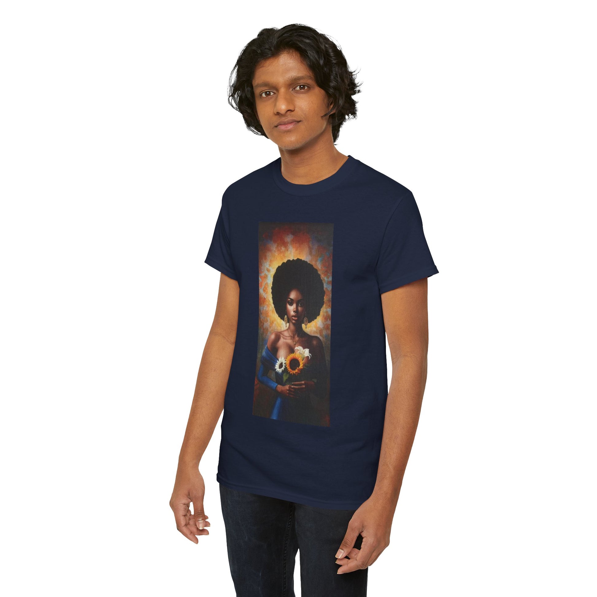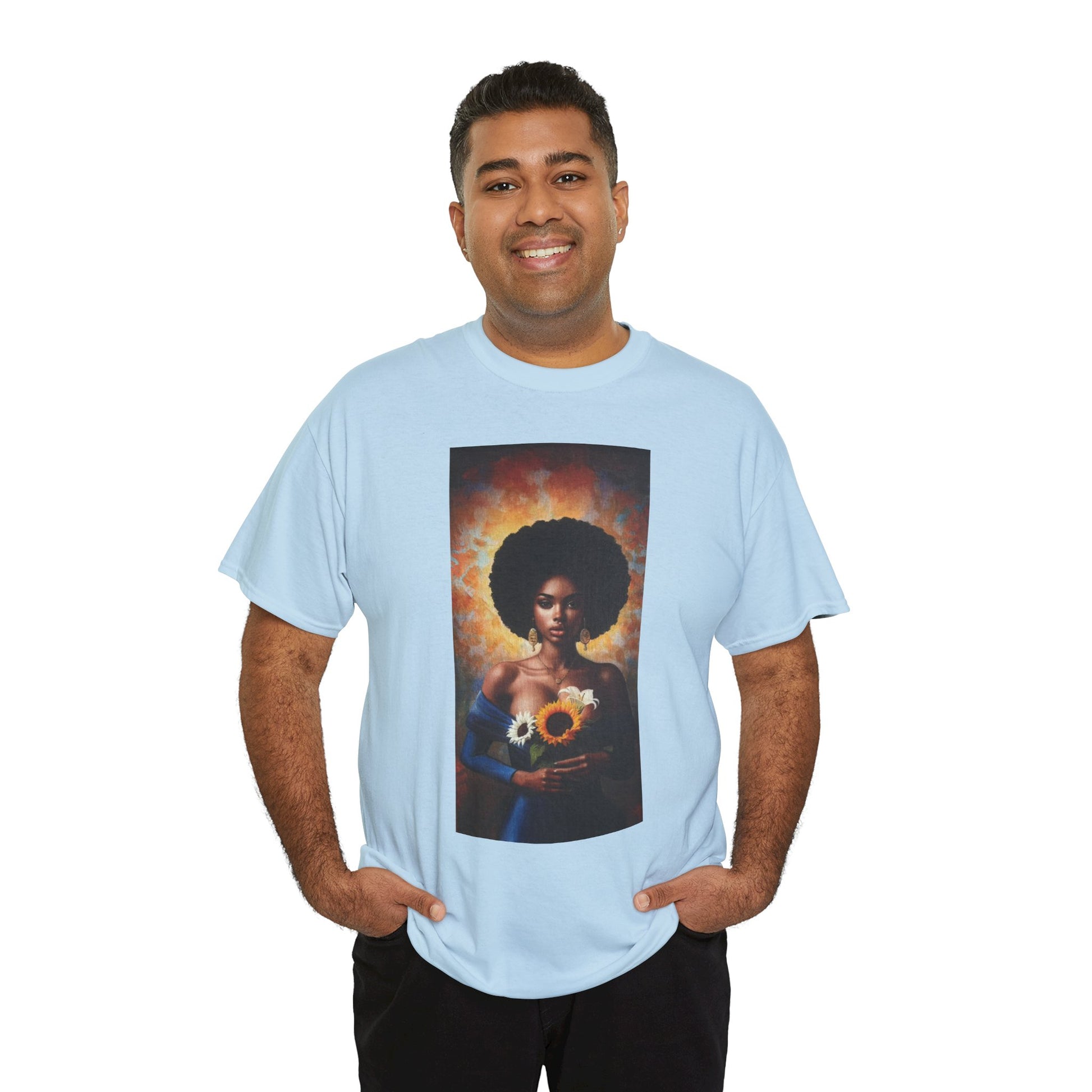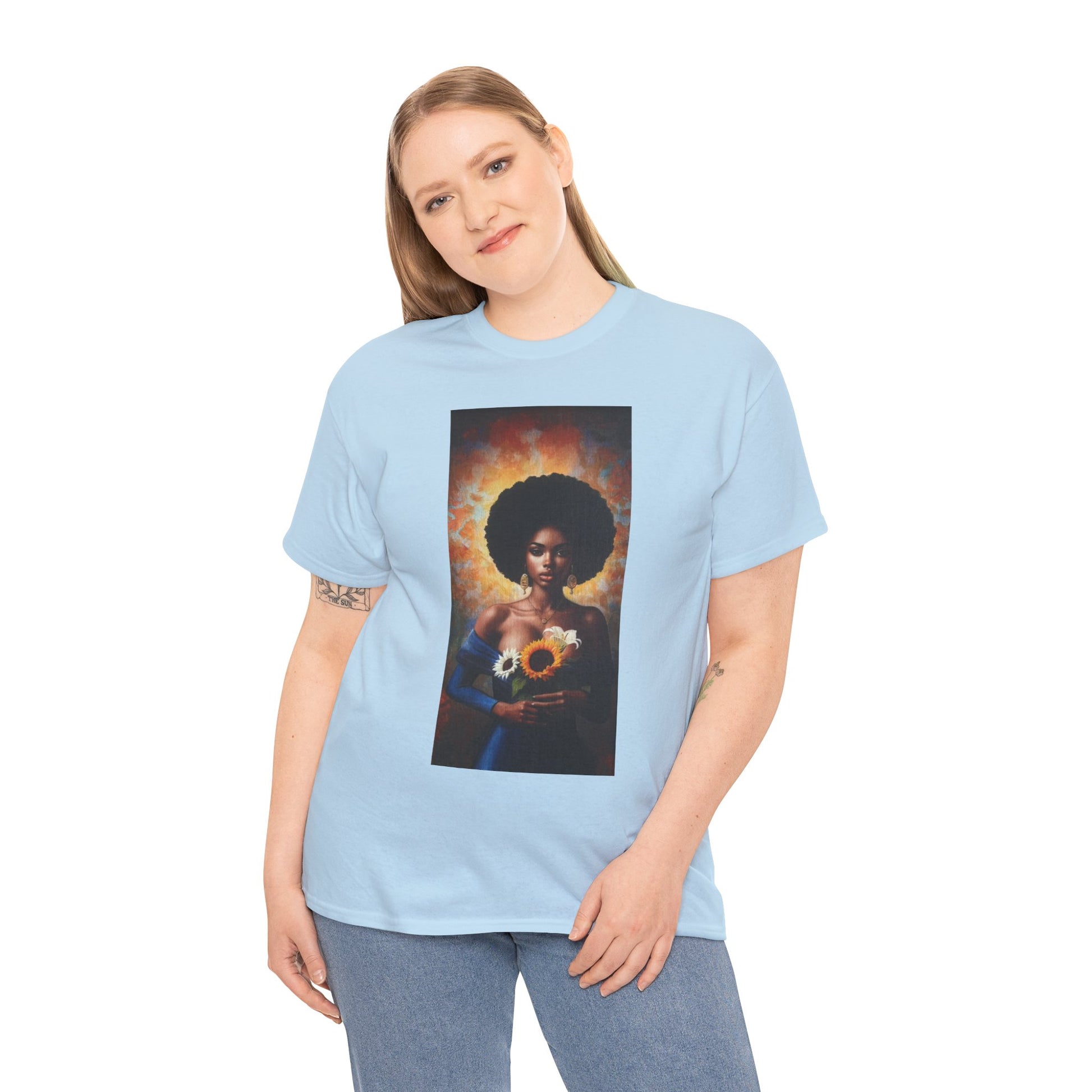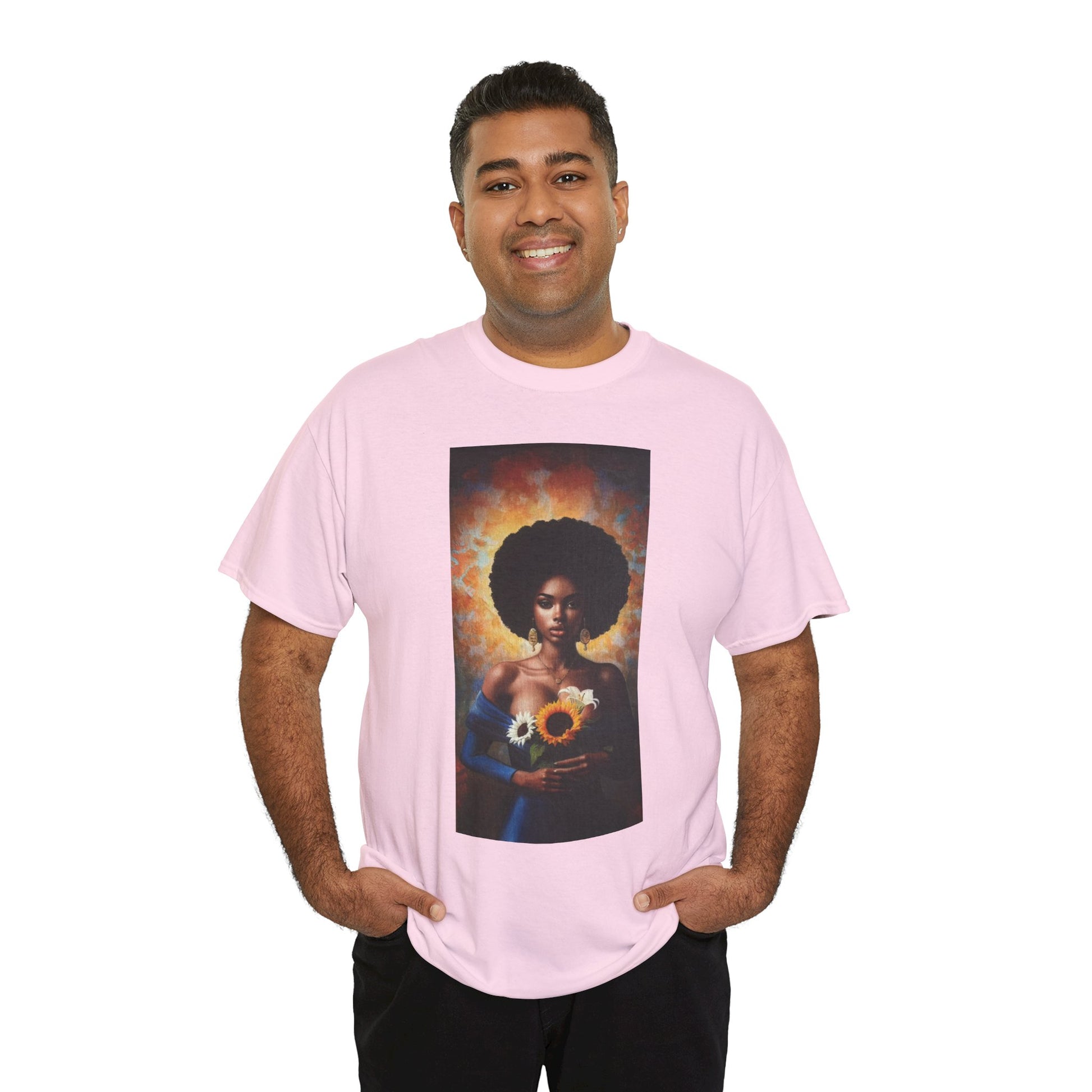 Elevate your wardrobe with this unisex heavy cotton tee, a perfect blend of comfort and style. With its classic fit and timeless crew neckline, this shirt easily transitions from casual outings to semi-formal occasions. The vibrant design adds a unique touch, making it an ideal choice for those who appreciate artistic expression. Whether you're celebrating a birthday, attending a festival, or simply looking to make a fashion statement, this tee is designed for everyone. Crafted from ethically sourced cotton, it not only looks good but also feels great against your skin. Share it as a thoughtful gift or keep it for yourself to express your individuality at family gatherings, picnics, or everyday wear. Sunflower Goddess Unisex Heavy Cotton Tee, Floral T-Shirt, Black Woman Artwork Tee, Gift for Her, Casual Everyday Wear