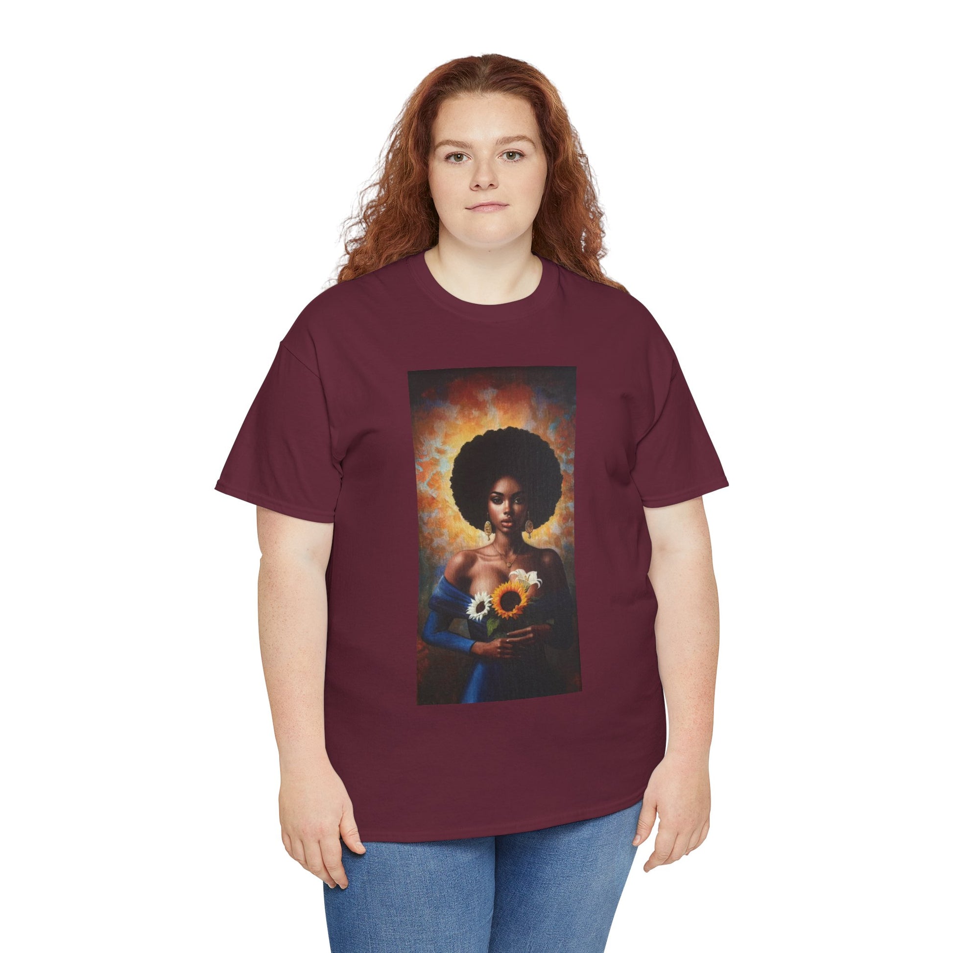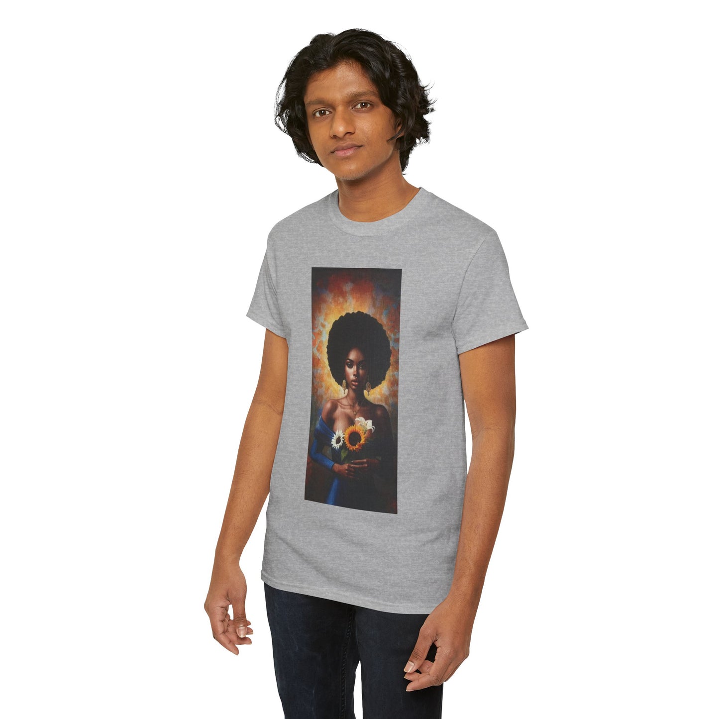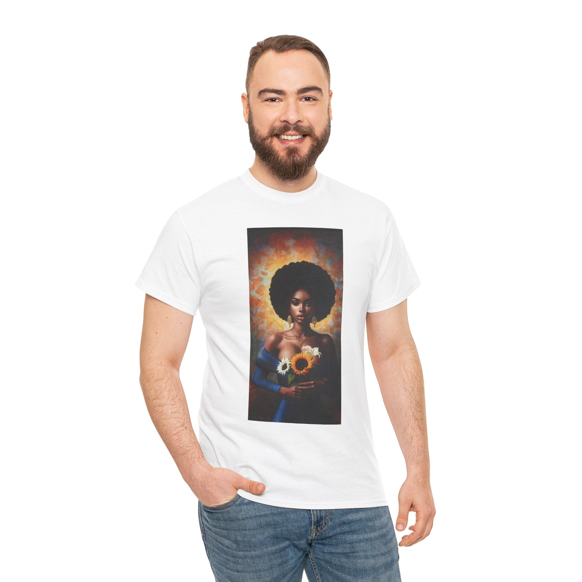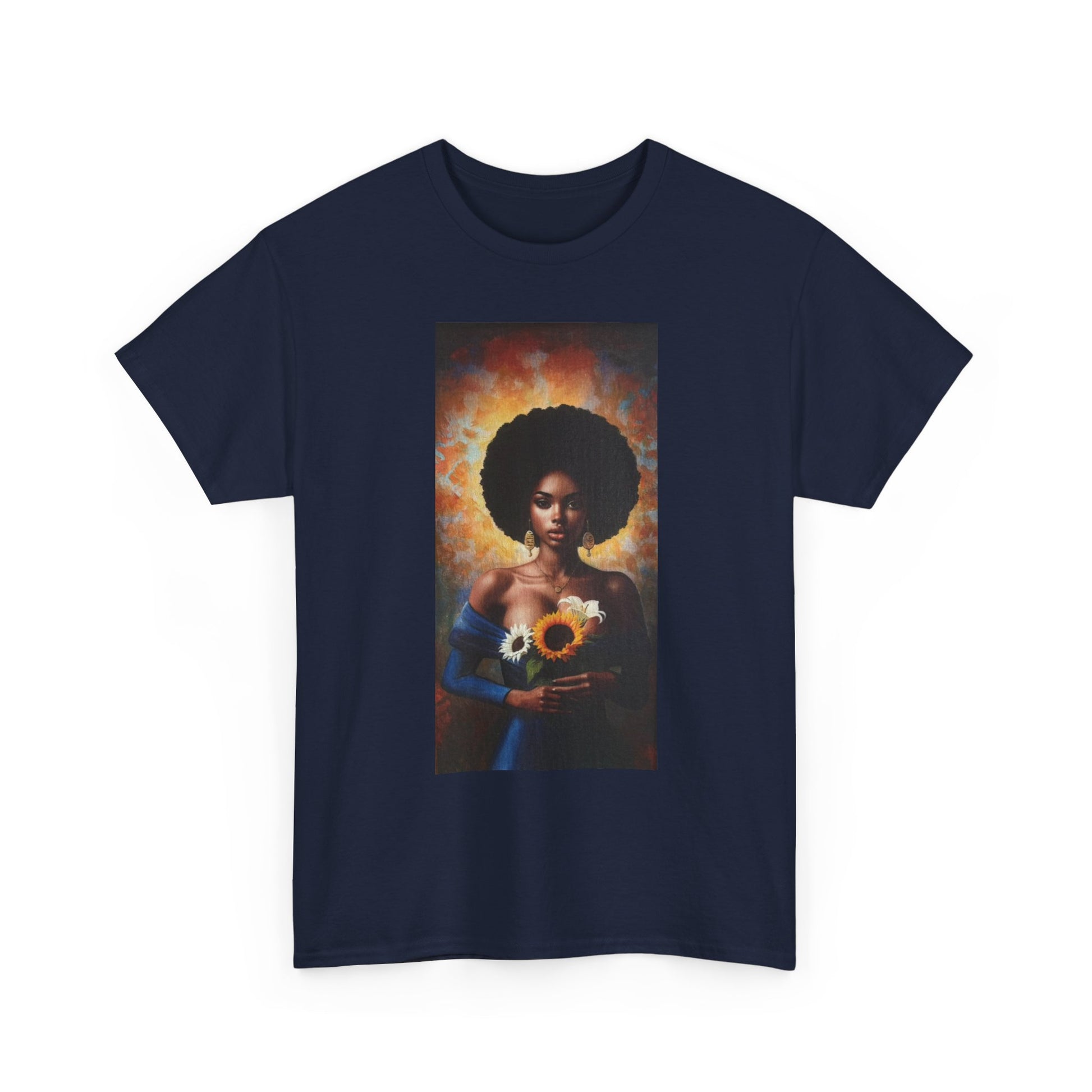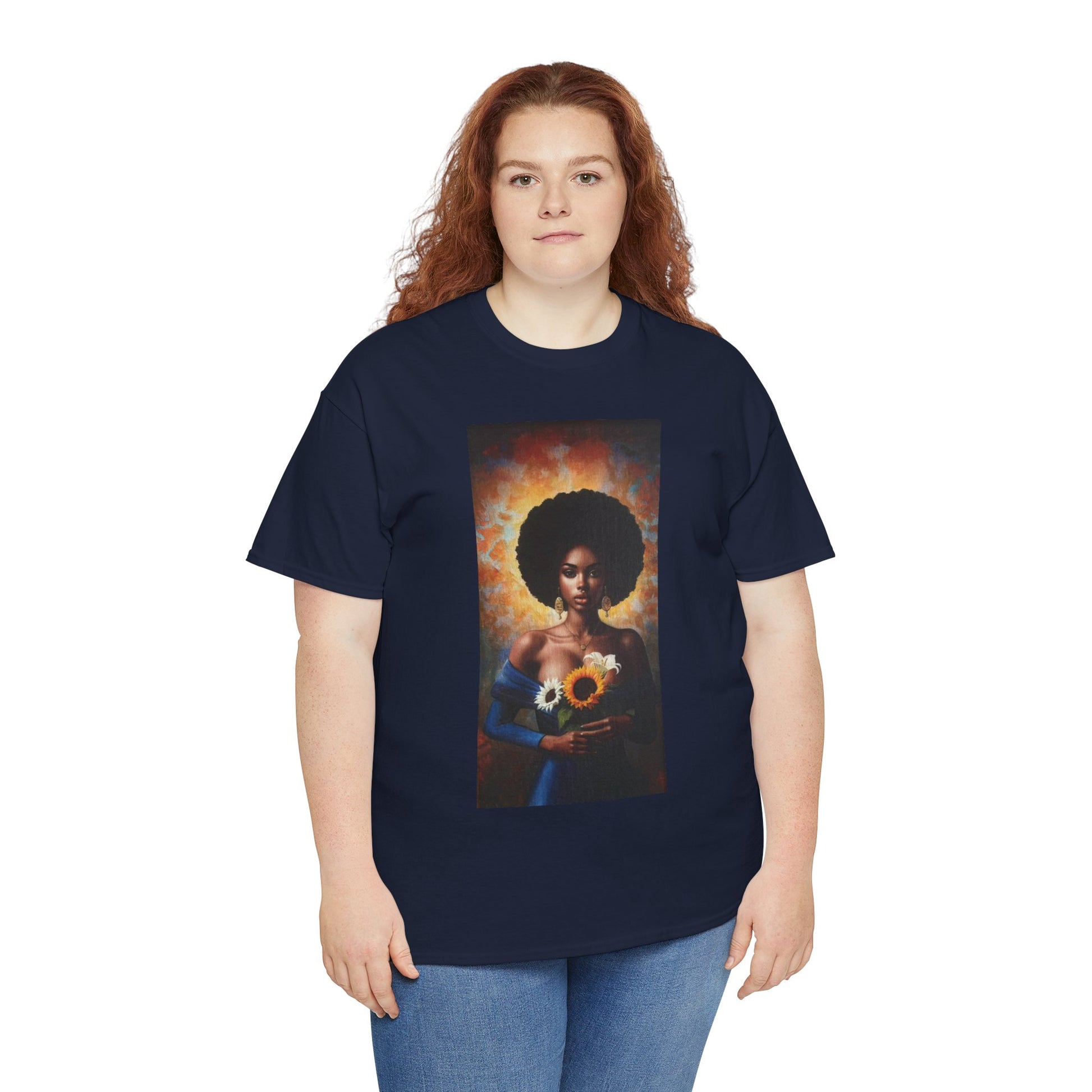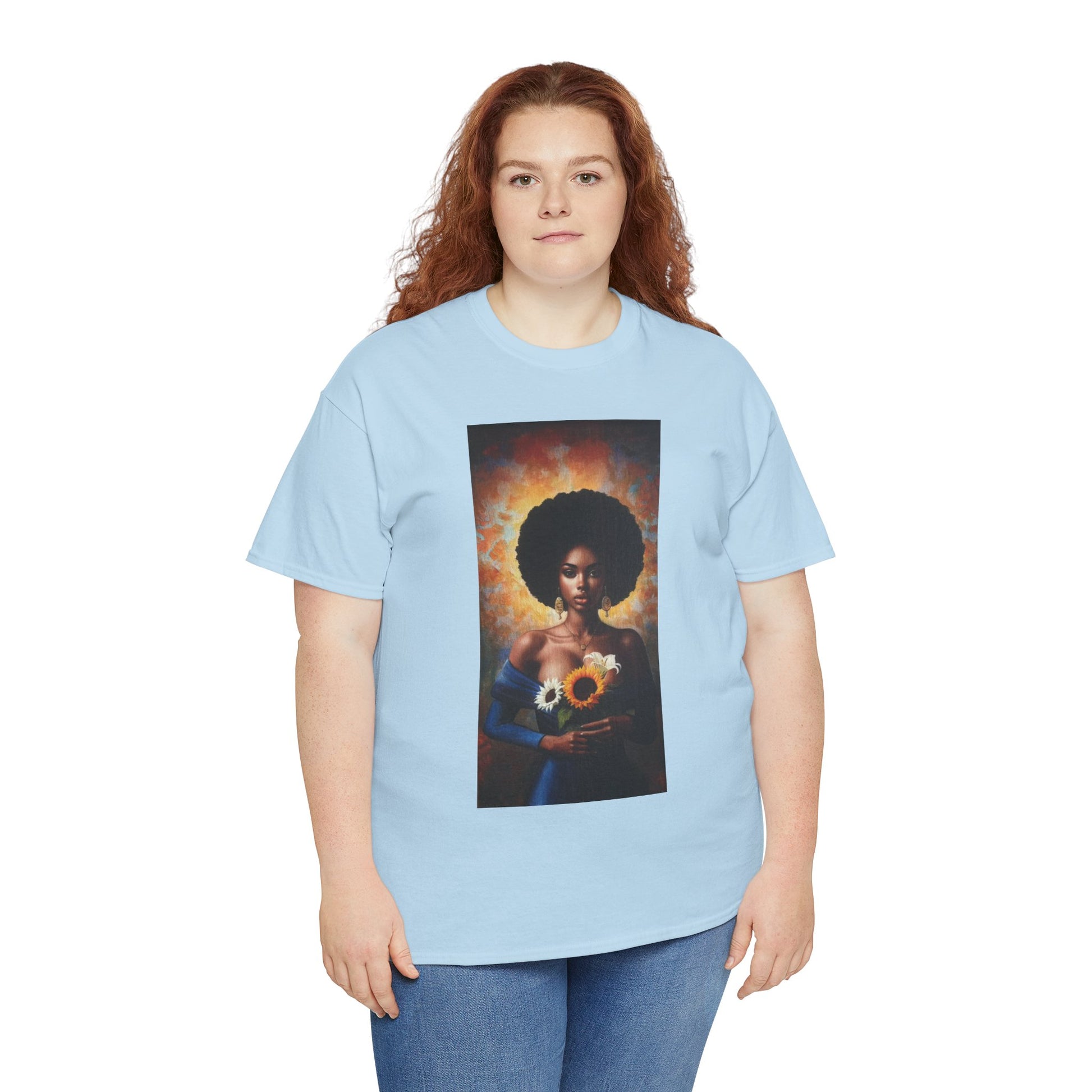 Elevate your wardrobe with this unisex heavy cotton tee, a perfect blend of comfort and style. With its classic fit and timeless crew neckline, this shirt easily transitions from casual outings to semi-formal occasions. The vibrant design adds a unique touch, making it an ideal choice for those who appreciate artistic expression. Whether you're celebrating a birthday, attending a festival, or simply looking to make a fashion statement, this tee is designed for everyone. Crafted from ethically sourced cotton, it not only looks good but also feels great against your skin. Share it as a thoughtful gift or keep it for yourself to express your individuality at family gatherings, picnics, or everyday wear. Sunflower Goddess Unisex Heavy Cotton Tee, Floral T-Shirt, Black Woman Artwork Tee, Gift for Her, Casual Everyday Wear