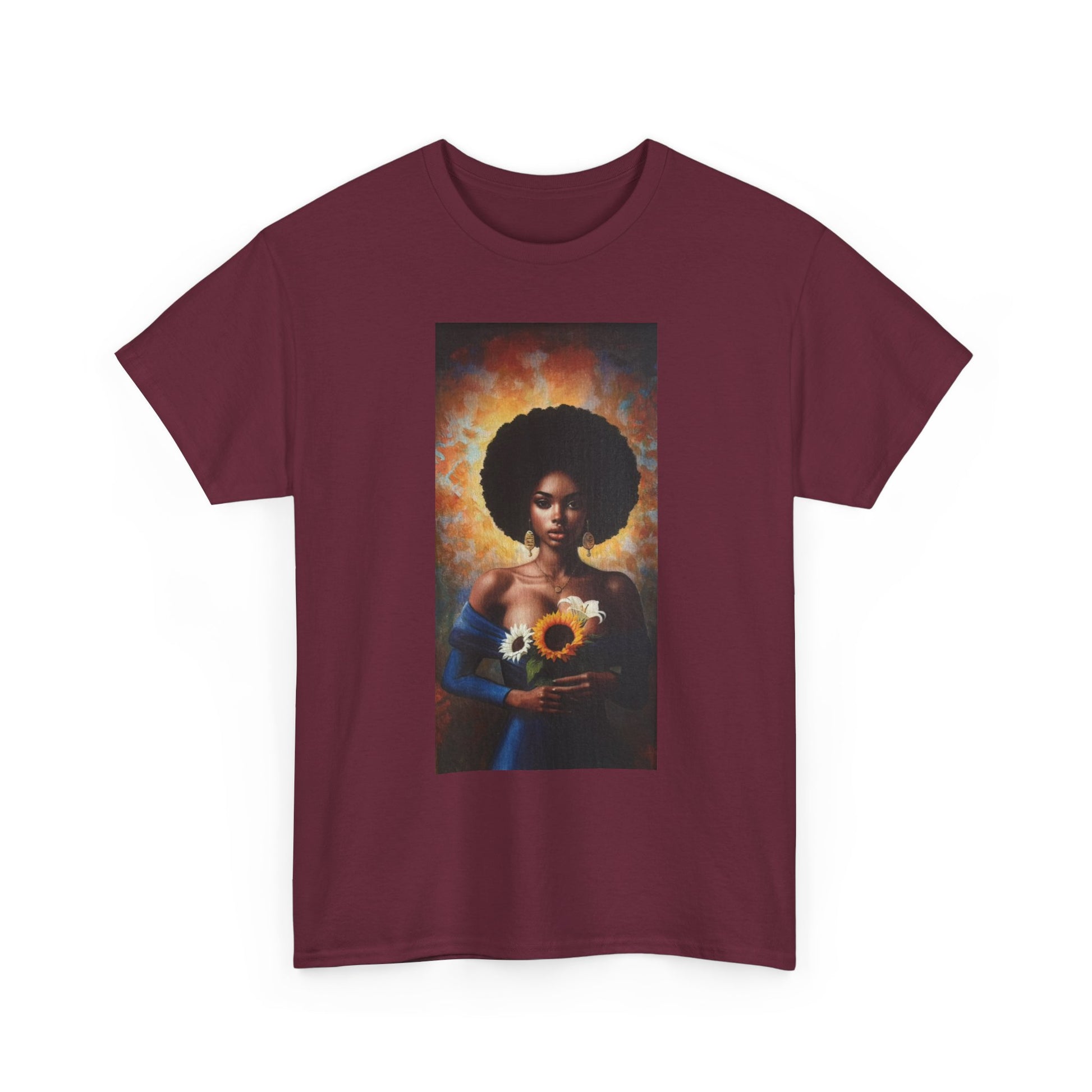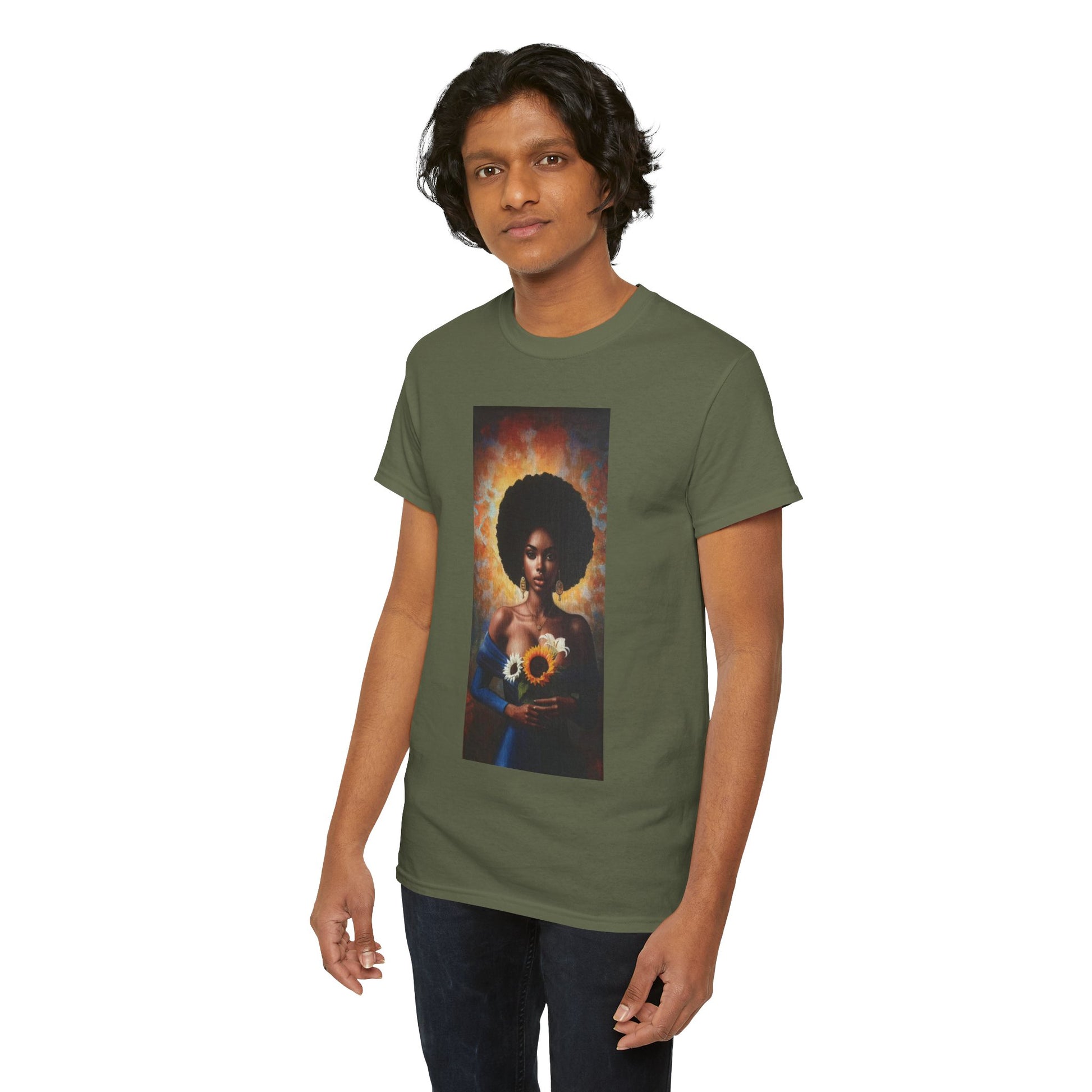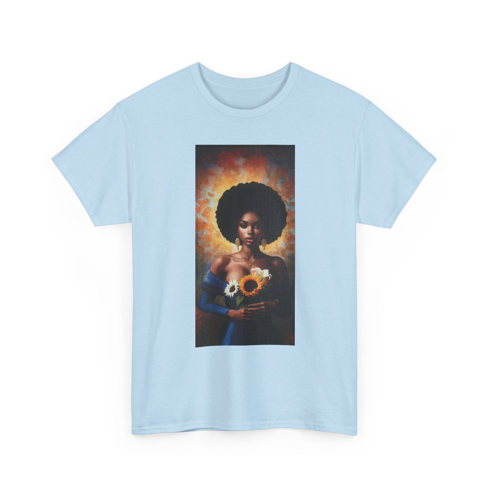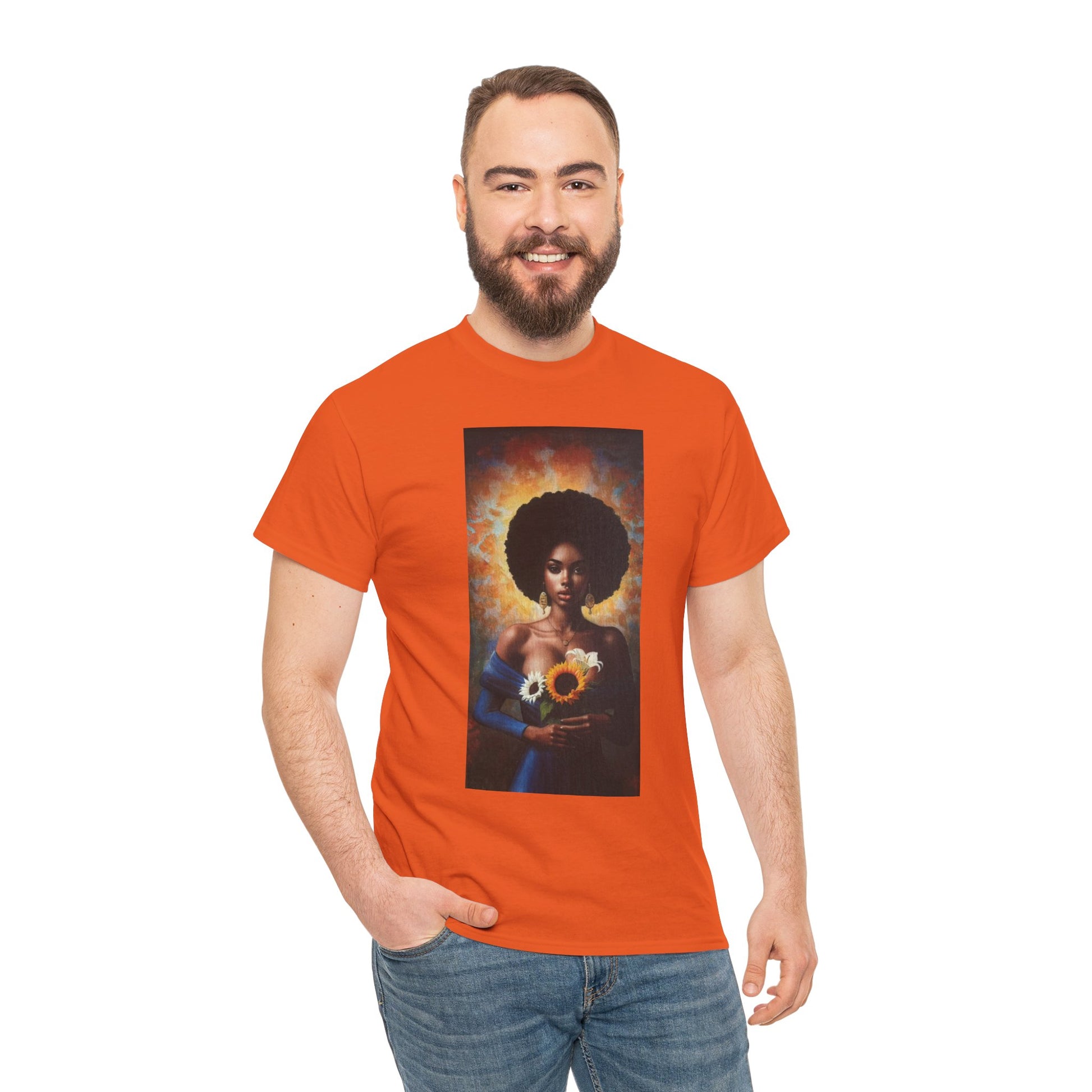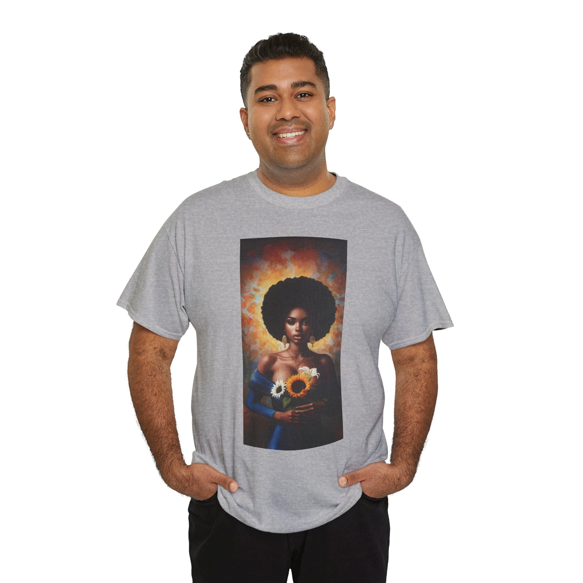 Elevate your wardrobe with this unisex heavy cotton tee, a perfect blend of comfort and style. With its classic fit and timeless crew neckline, this shirt easily transitions from casual outings to semi-formal occasions. The vibrant design adds a unique touch, making it an ideal choice for those who appreciate artistic expression. Whether you're celebrating a birthday, attending a festival, or simply looking to make a fashion statement, this tee is designed for everyone. Crafted from ethically sourced cotton, it not only looks good but also feels great against your skin. Share it as a thoughtful gift or keep it for yourself to express your individuality at family gatherings, picnics, or everyday wear. Sunflower Goddess Unisex Heavy Cotton Tee, Floral T-Shirt, Black Woman Artwork Tee, Gift for Her, Casual Everyday Wear