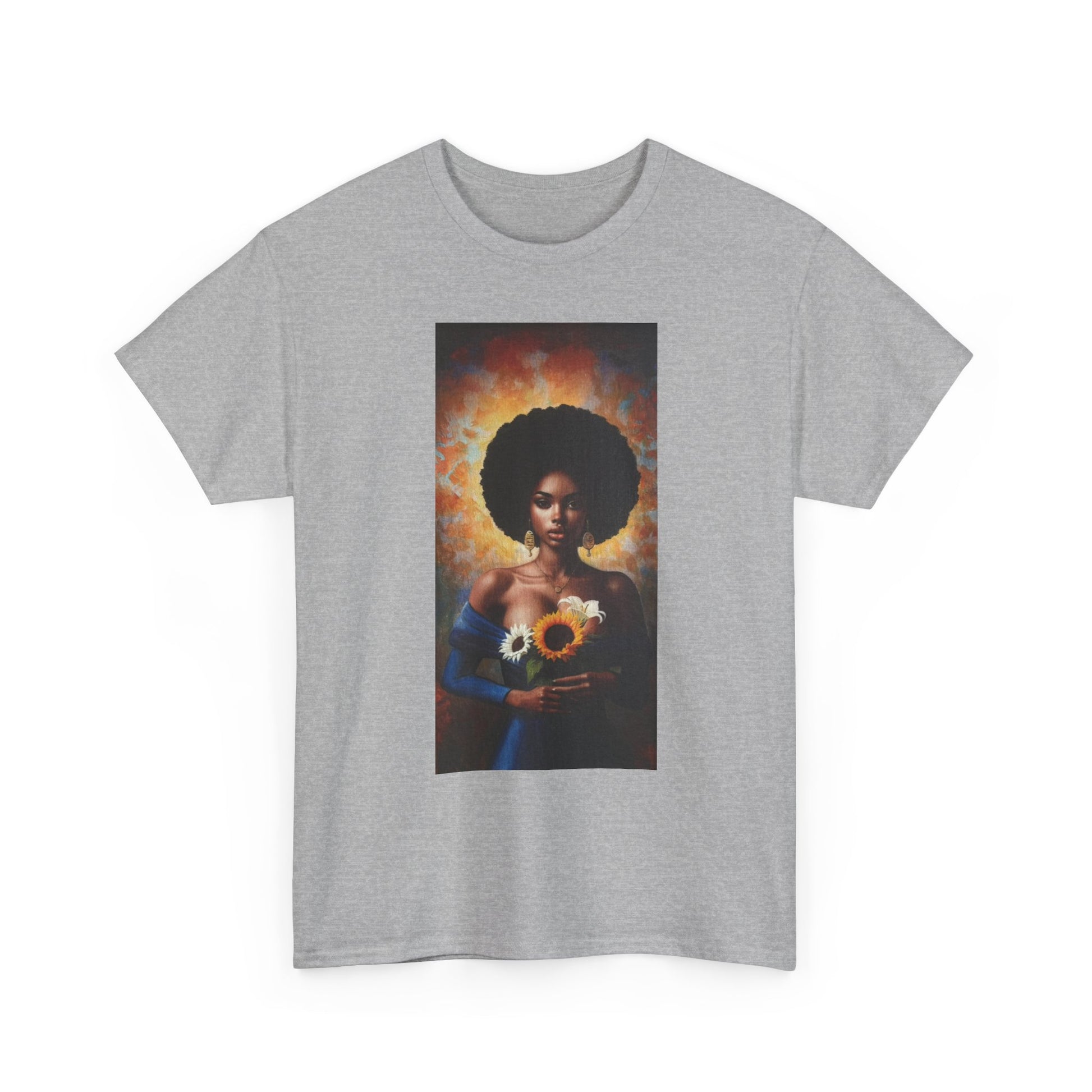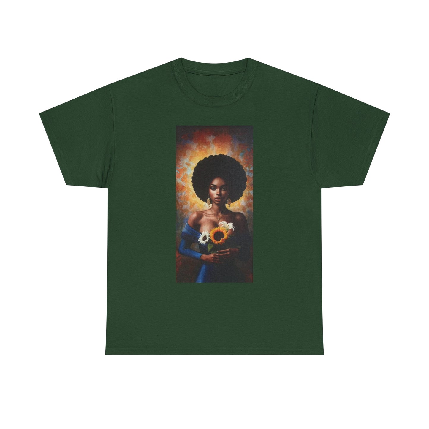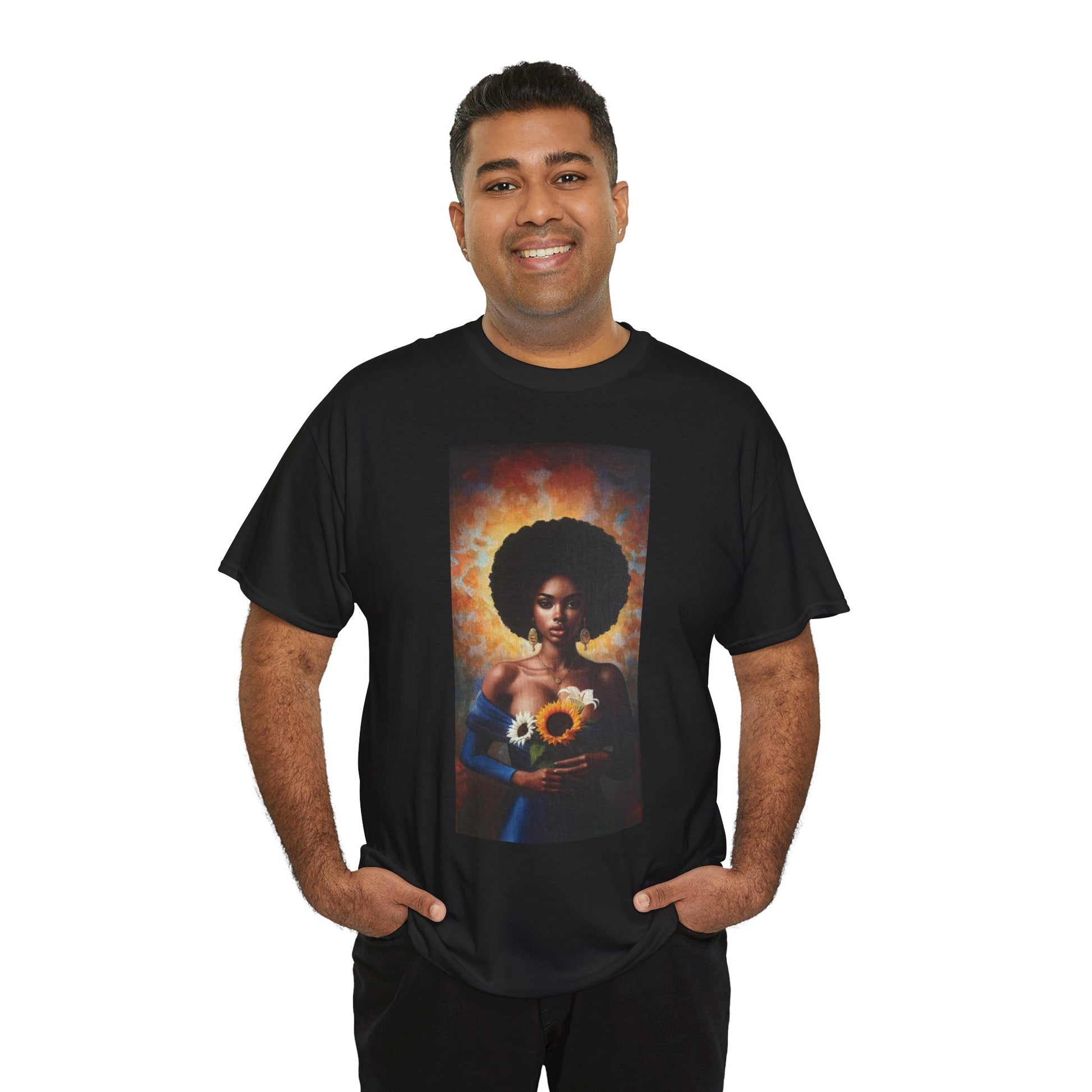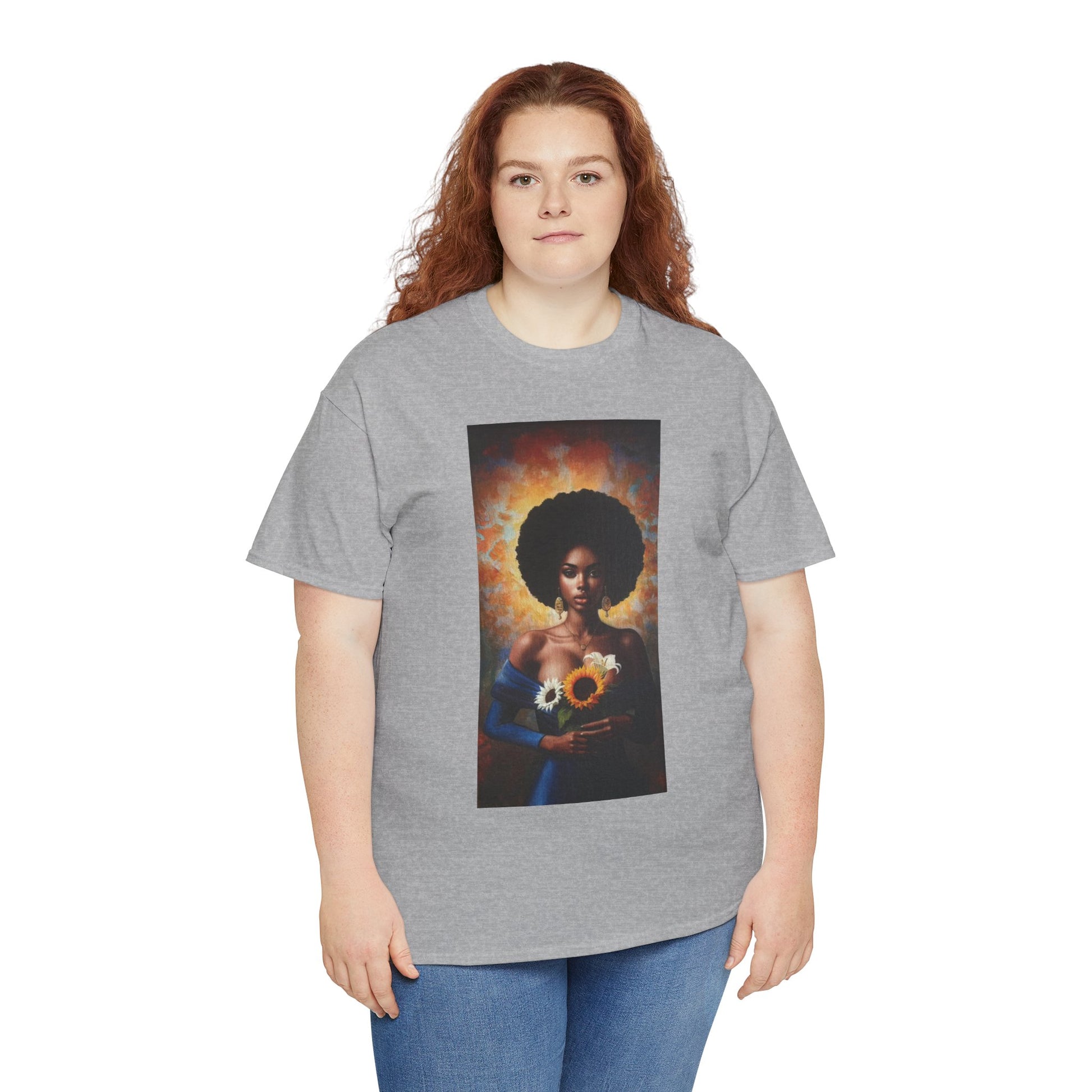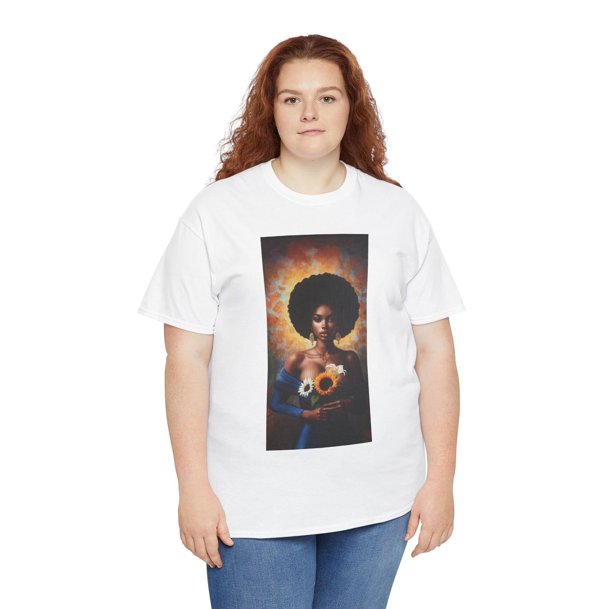 Elevate your wardrobe with this unisex heavy cotton tee, a perfect blend of comfort and style. With its classic fit and timeless crew neckline, this shirt easily transitions from casual outings to semi-formal occasions. The vibrant design adds a unique touch, making it an ideal choice for those who appreciate artistic expression. Whether you're celebrating a birthday, attending a festival, or simply looking to make a fashion statement, this tee is designed for everyone. Crafted from ethically sourced cotton, it not only looks good but also feels great against your skin. Share it as a thoughtful gift or keep it for yourself to express your individuality at family gatherings, picnics, or everyday wear. Sunflower Goddess Unisex Heavy Cotton Tee, Floral T-Shirt, Black Woman Artwork Tee, Gift for Her, Casual Everyday Wear
