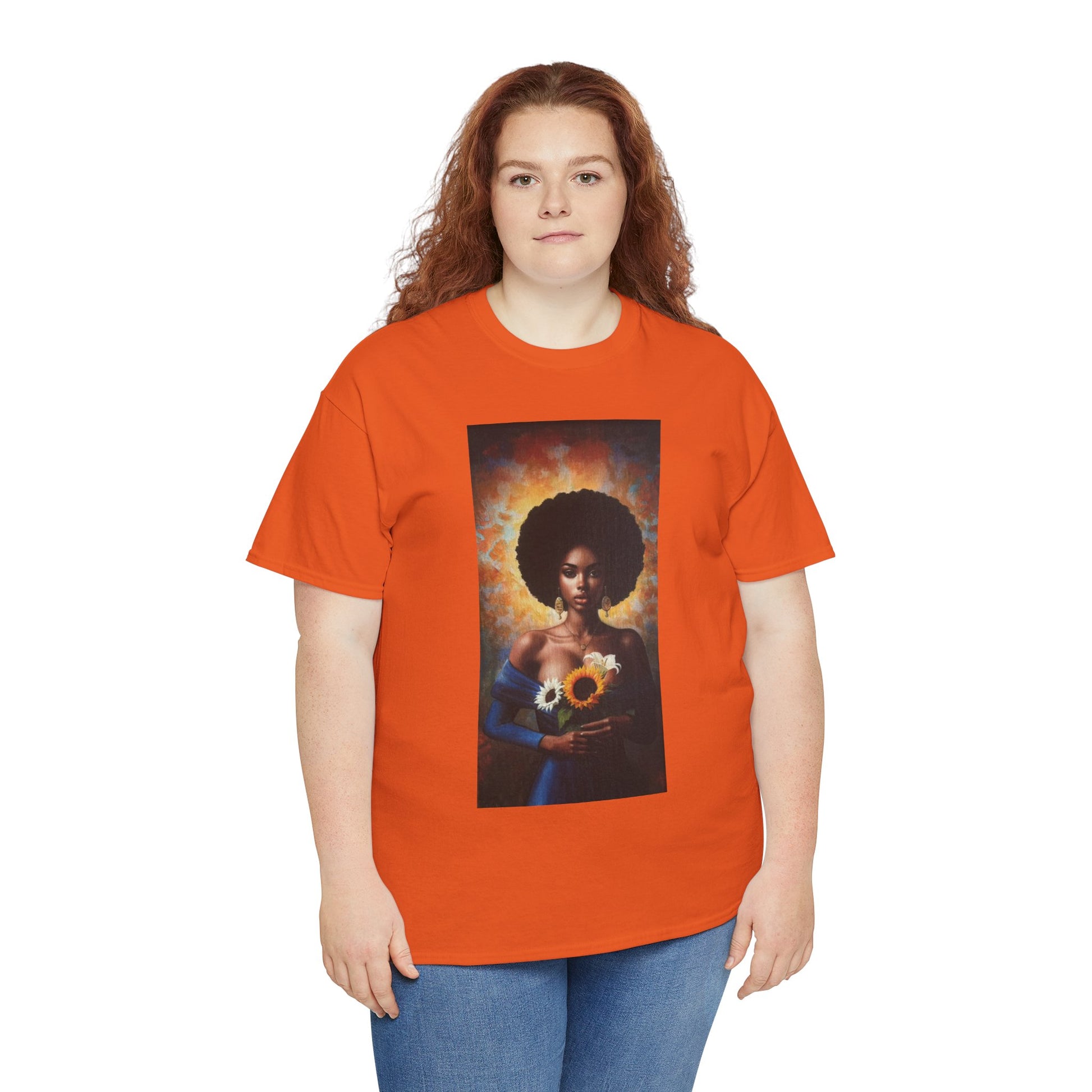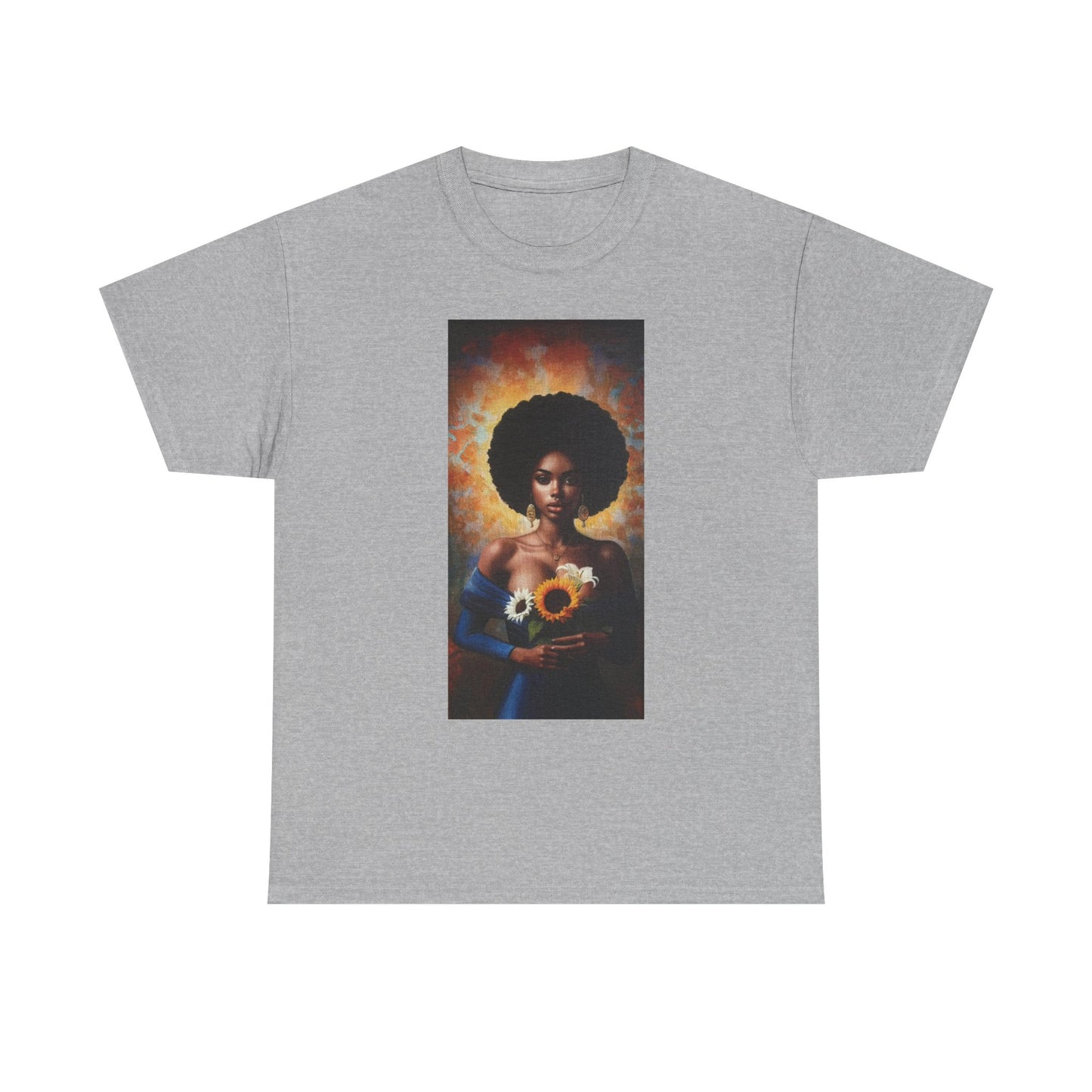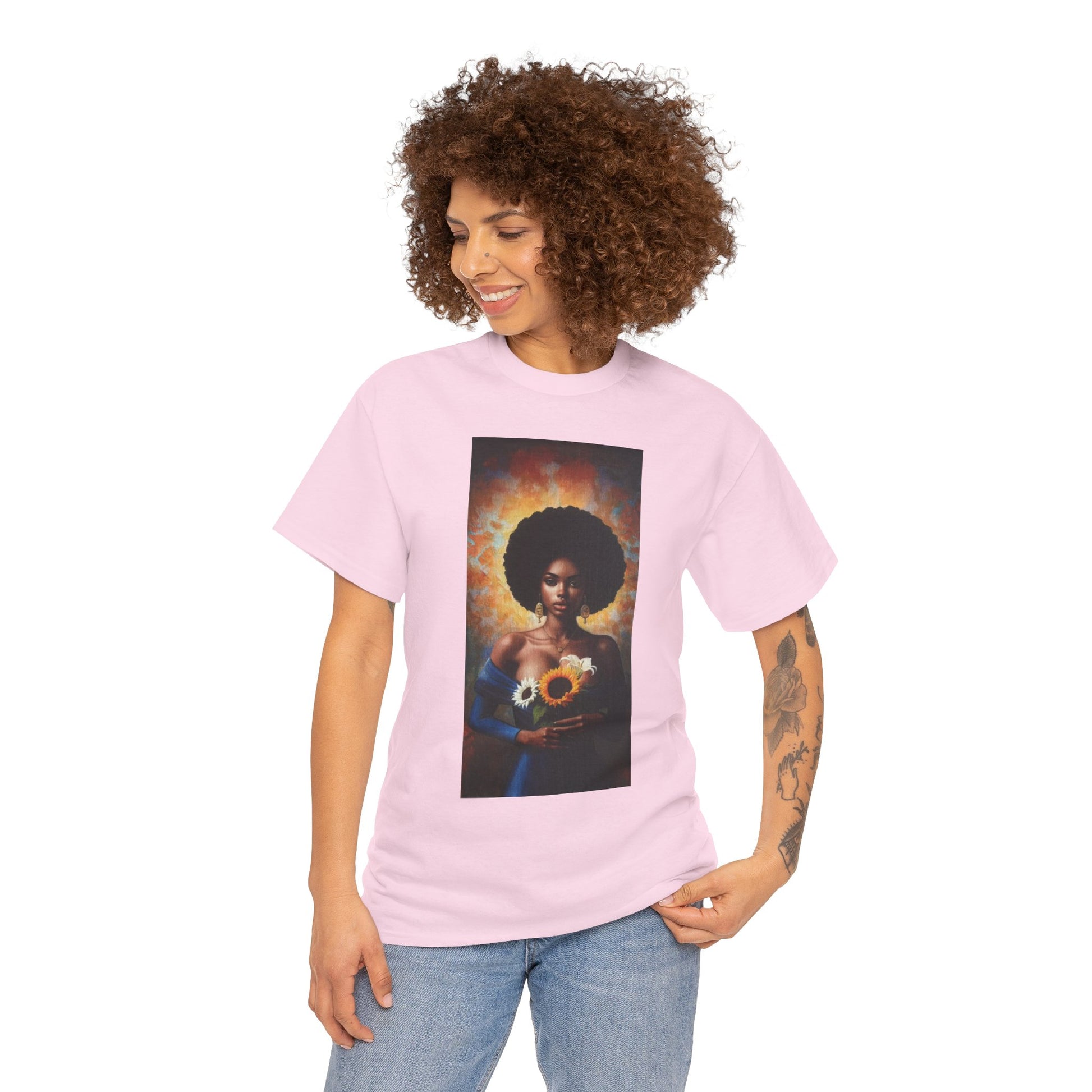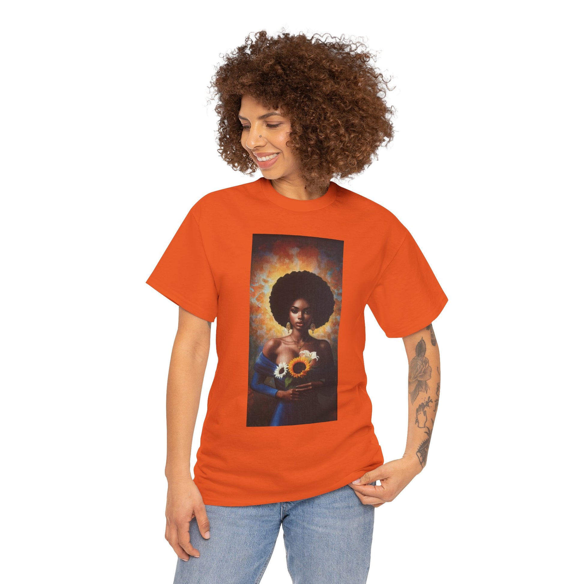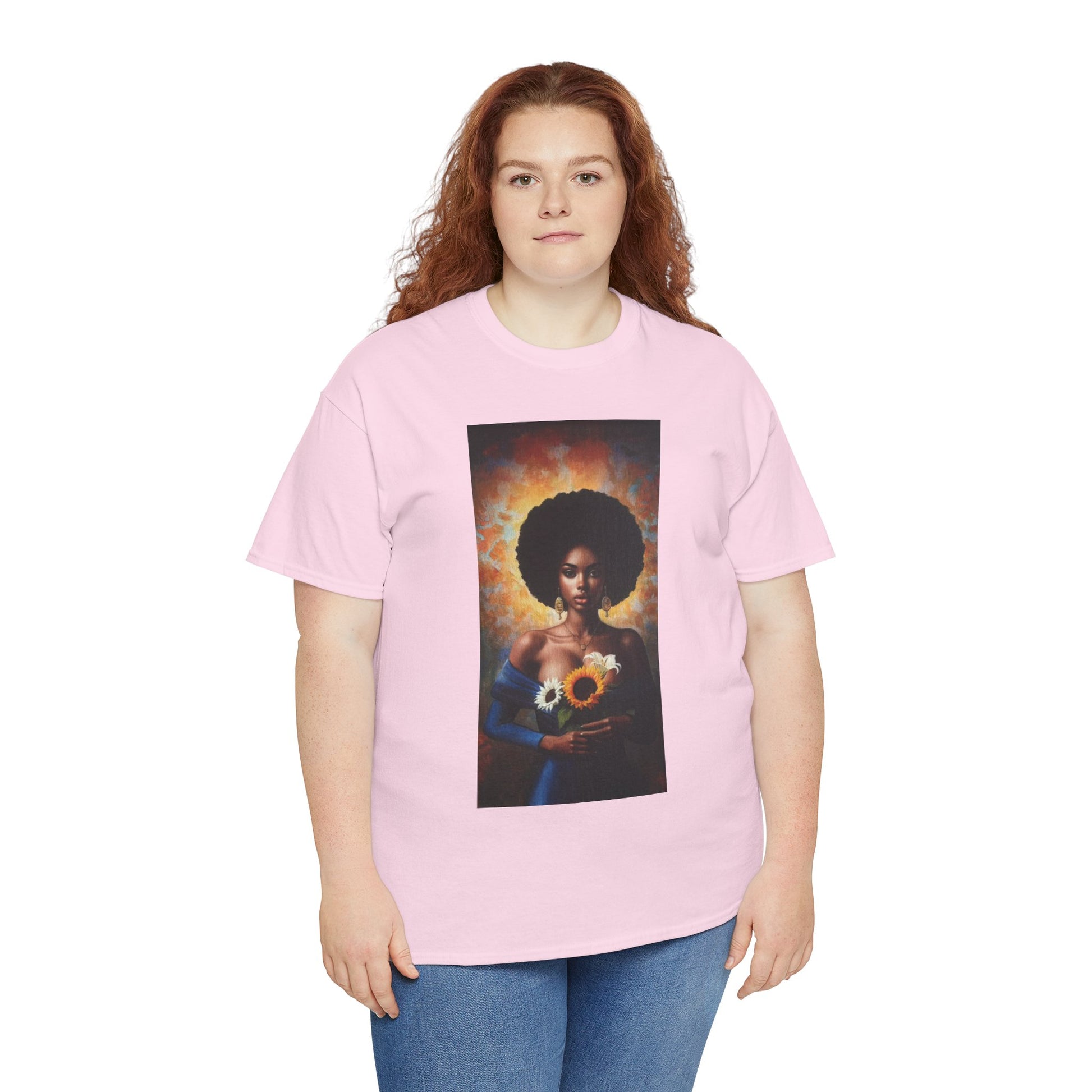 Elevate your wardrobe with this unisex heavy cotton tee, a perfect blend of comfort and style. With its classic fit and timeless crew neckline, this shirt easily transitions from casual outings to semi-formal occasions. The vibrant design adds a unique touch, making it an ideal choice for those who appreciate artistic expression. Whether you're celebrating a birthday, attending a festival, or simply looking to make a fashion statement, this tee is designed for everyone. Crafted from ethically sourced cotton, it not only looks good but also feels great against your skin. Share it as a thoughtful gift or keep it for yourself to express your individuality at family gatherings, picnics, or everyday wear. Sunflower Goddess Unisex Heavy Cotton Tee, Floral T-Shirt, Black Woman Artwork Tee, Gift for Her, Casual Everyday Wear