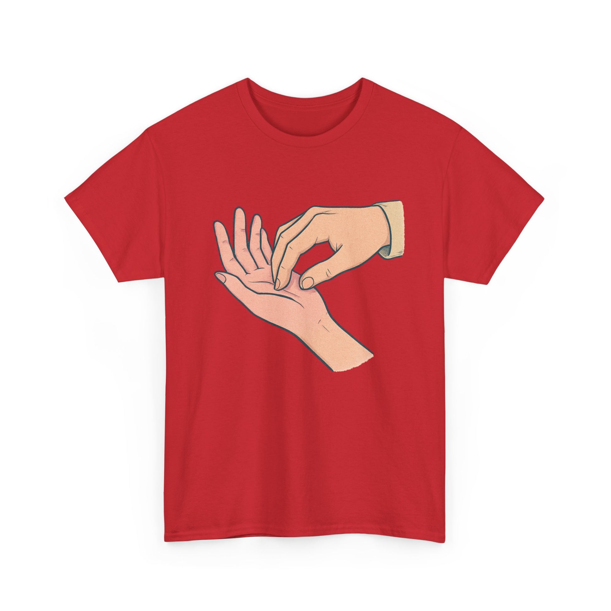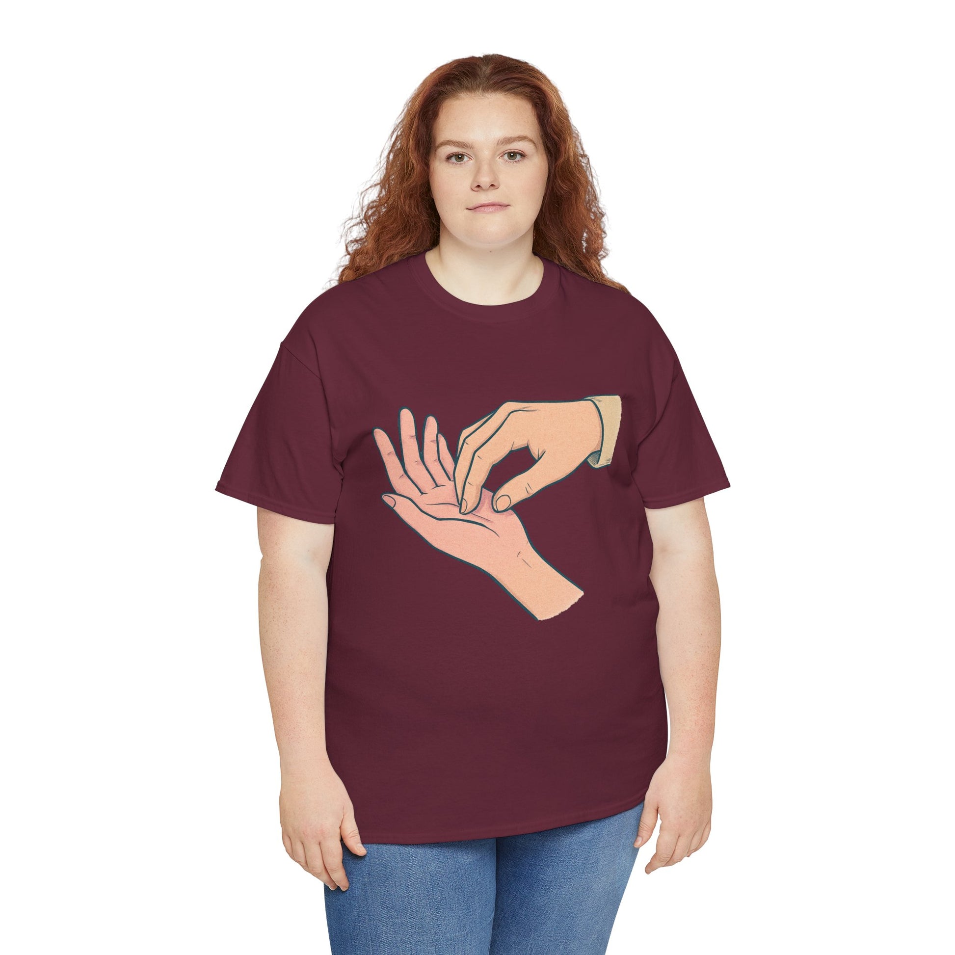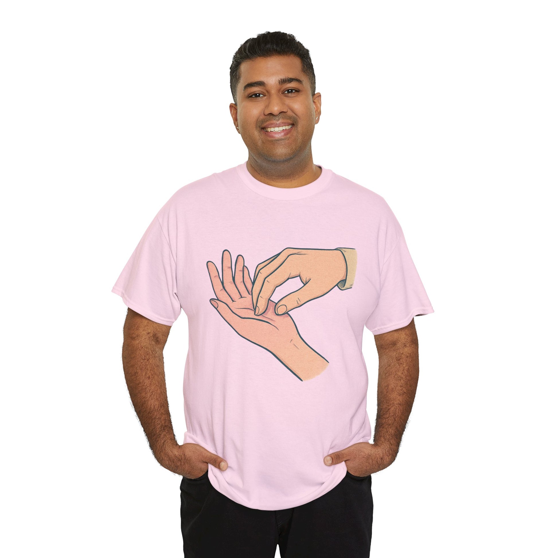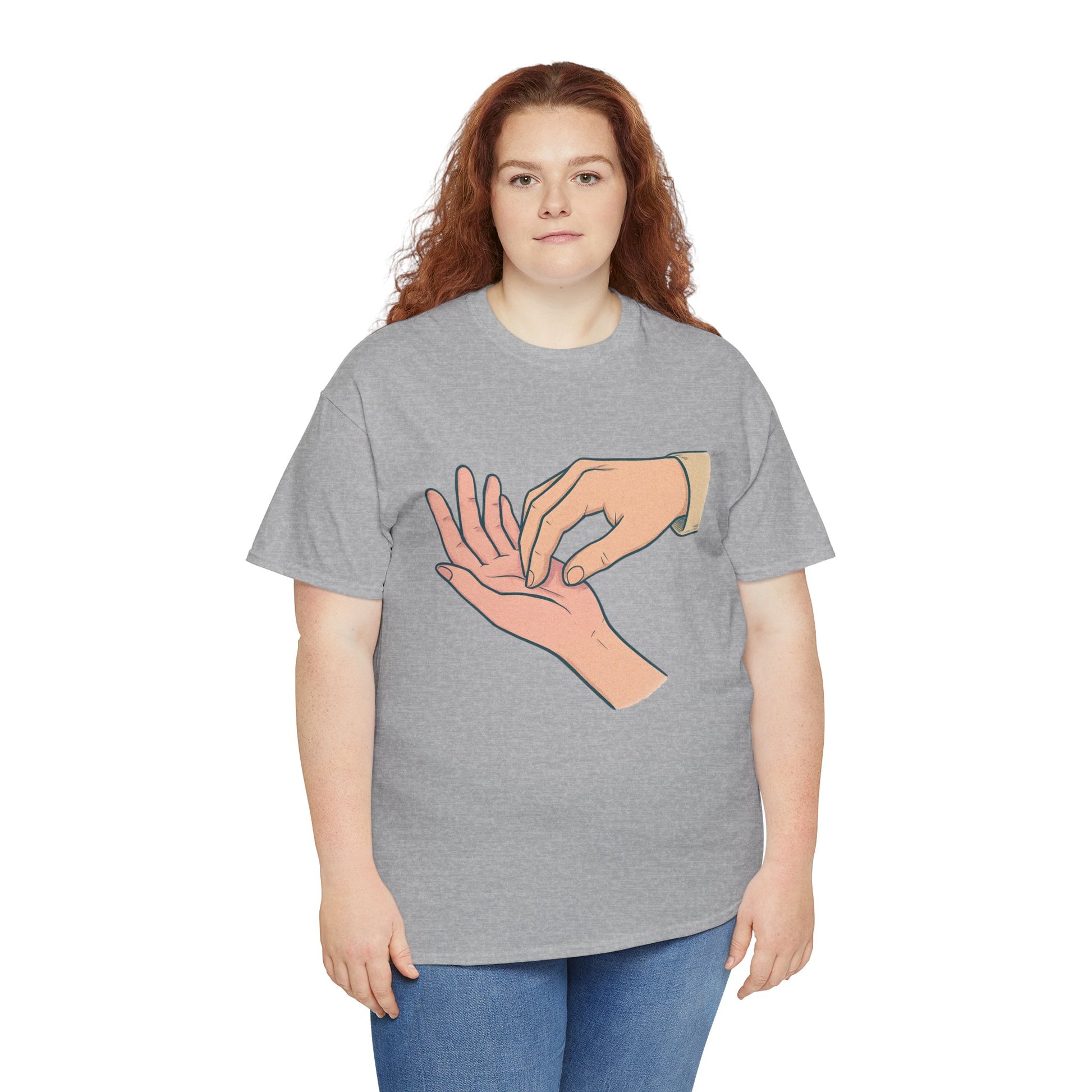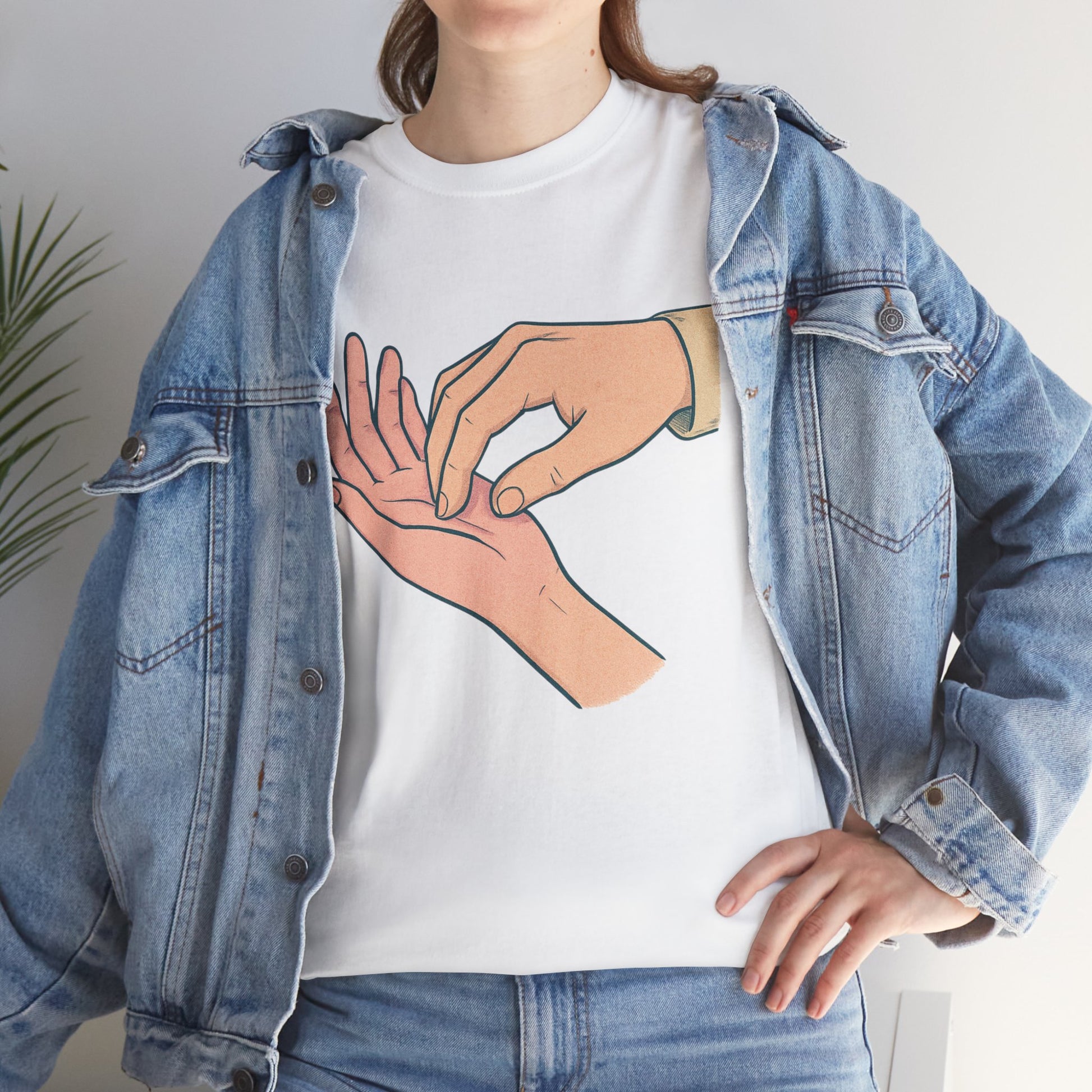 A soft, everyday tee that speaks quietly but clearly. The simple illustration—one hand gently pressing the fingertips of another—carries a tender, human moment: care, reassurance, and small rituals that anchor relationships. Worn alone or layered, this shirt fits into calm mornings, slow conversations, and the kind of afternoons where checking in with someone matters. Lightweight yet sturdy, its classic crew neck and relaxed cut let the design take center stage without fuss. This is for people who value subtle gestures and honest connection—clothes that feel like a thoughtful pause in a busy day.