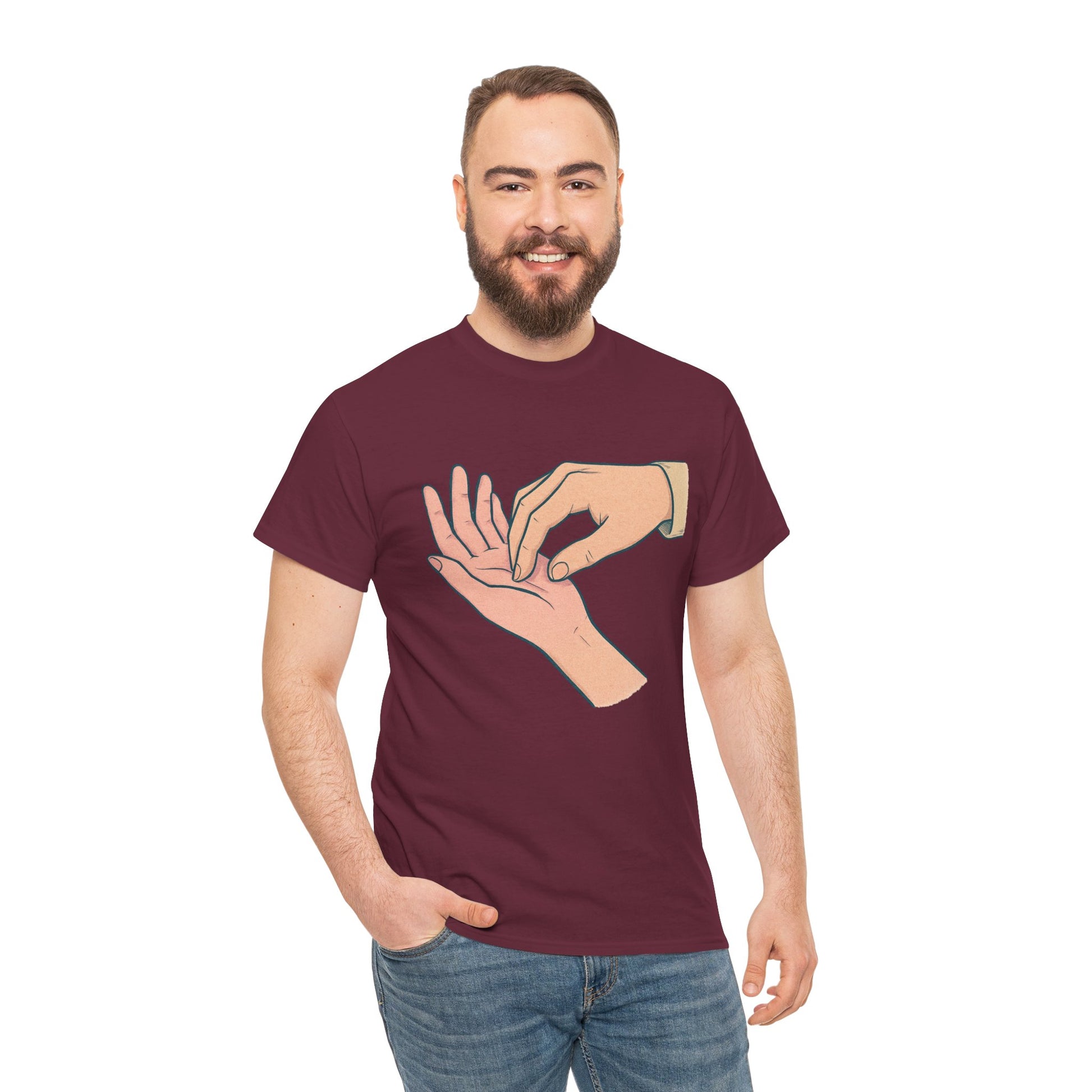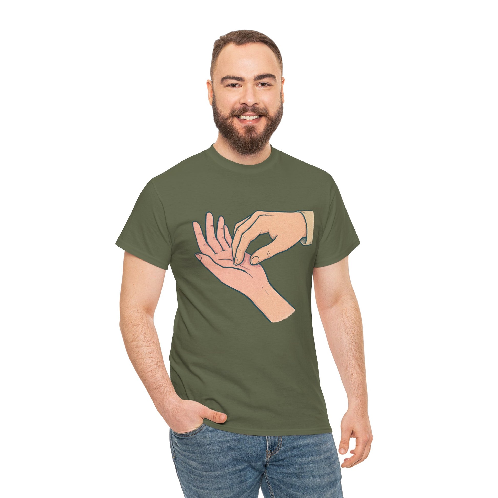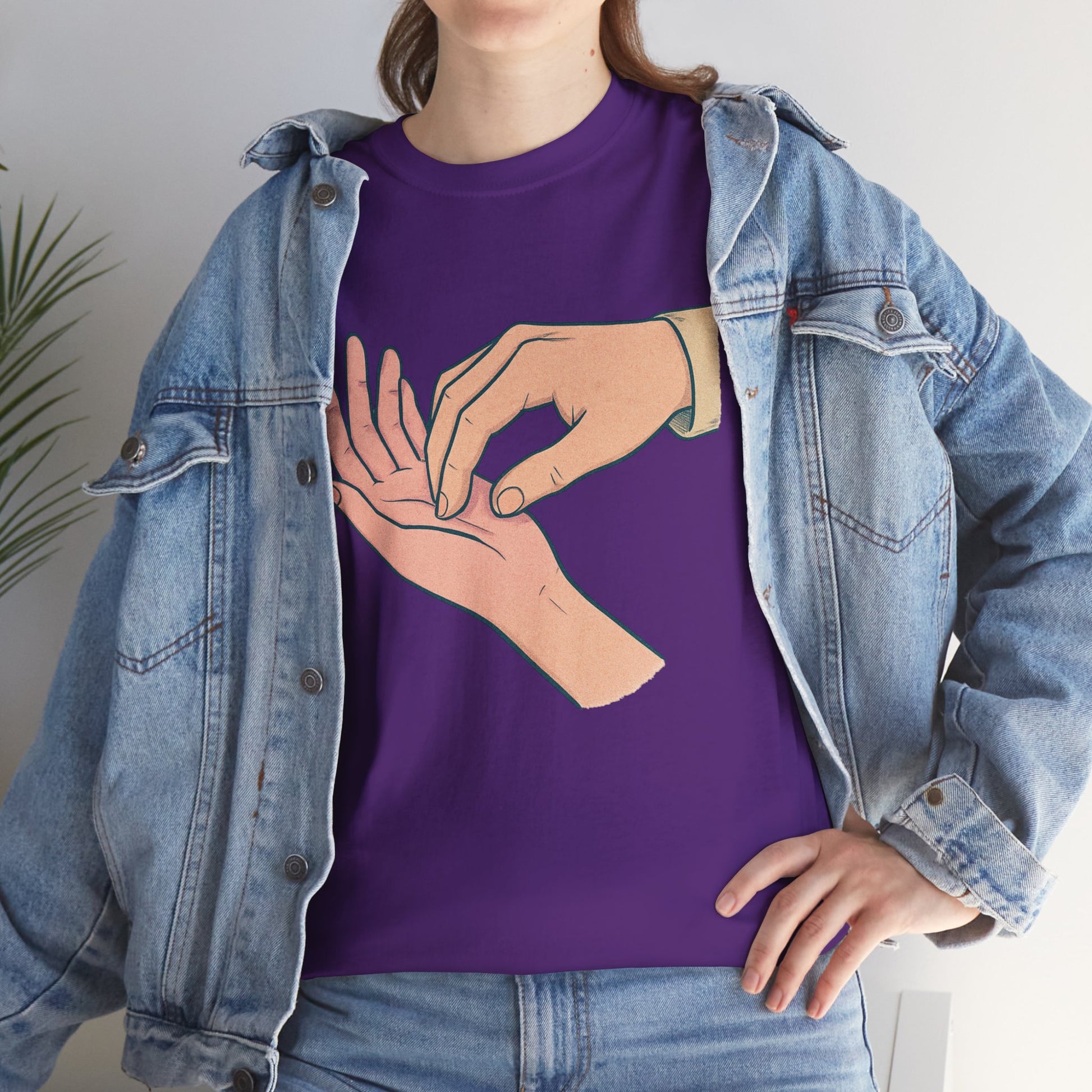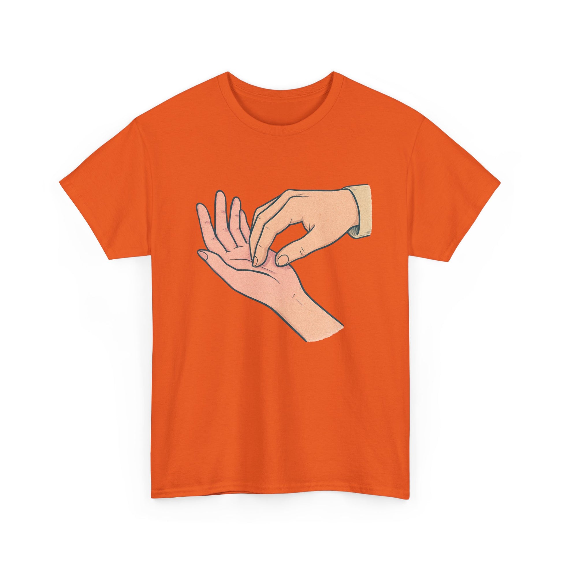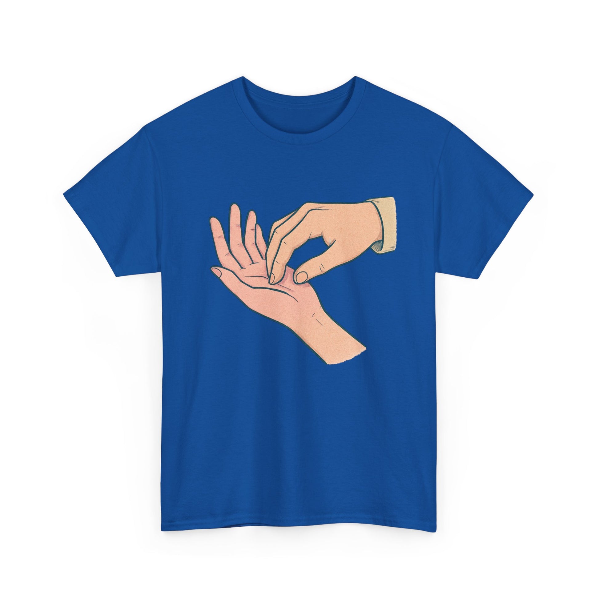 A soft, everyday tee that speaks quietly but clearly. The simple illustration—one hand gently pressing the fingertips of another—carries a tender, human moment: care, reassurance, and small rituals that anchor relationships. Worn alone or layered, this shirt fits into calm mornings, slow conversations, and the kind of afternoons where checking in with someone matters. Lightweight yet sturdy, its classic crew neck and relaxed cut let the design take center stage without fuss. This is for people who value subtle gestures and honest connection—clothes that feel like a thoughtful pause in a busy day.