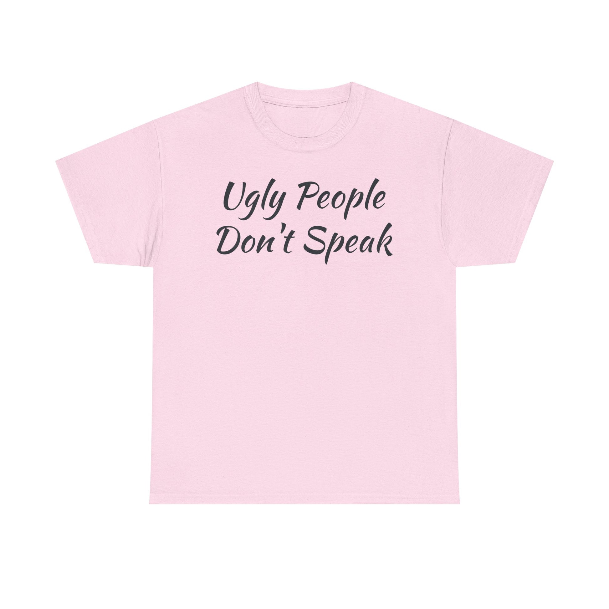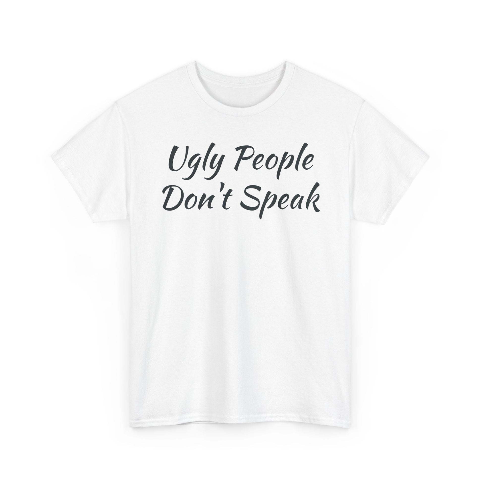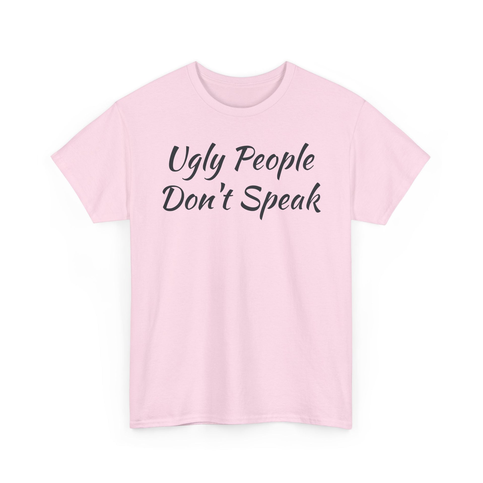 Introducing this stylish Unisex Heavy Cotton Tee, the perfect blend of comfort and edgy expression. Made from high-quality, specially spun fibers, this tee is not only soft to the touch, but also ensures durability for everyday wear. The classic fit and crew neckline make it a versatile choice, suitable for casual outings or more semi-formal occasions. Whether you're hanging out with friends or making a statement at a social gathering, this tee is designed to elevate your style effortlessly. It’s ideal for fashion enthusiasts, young adults, or anyone looking to inject a bit of fun into their wardrobe. Celebrate birthdays, parties, or just add a unique piece to your collection with this eye-catching design! Unisex Heavy Cotton Tee with "Ugly People Don't Speak" - Funny Gift, Casual Wear, Humor Shirt, Statement Tee, Birthday Gift