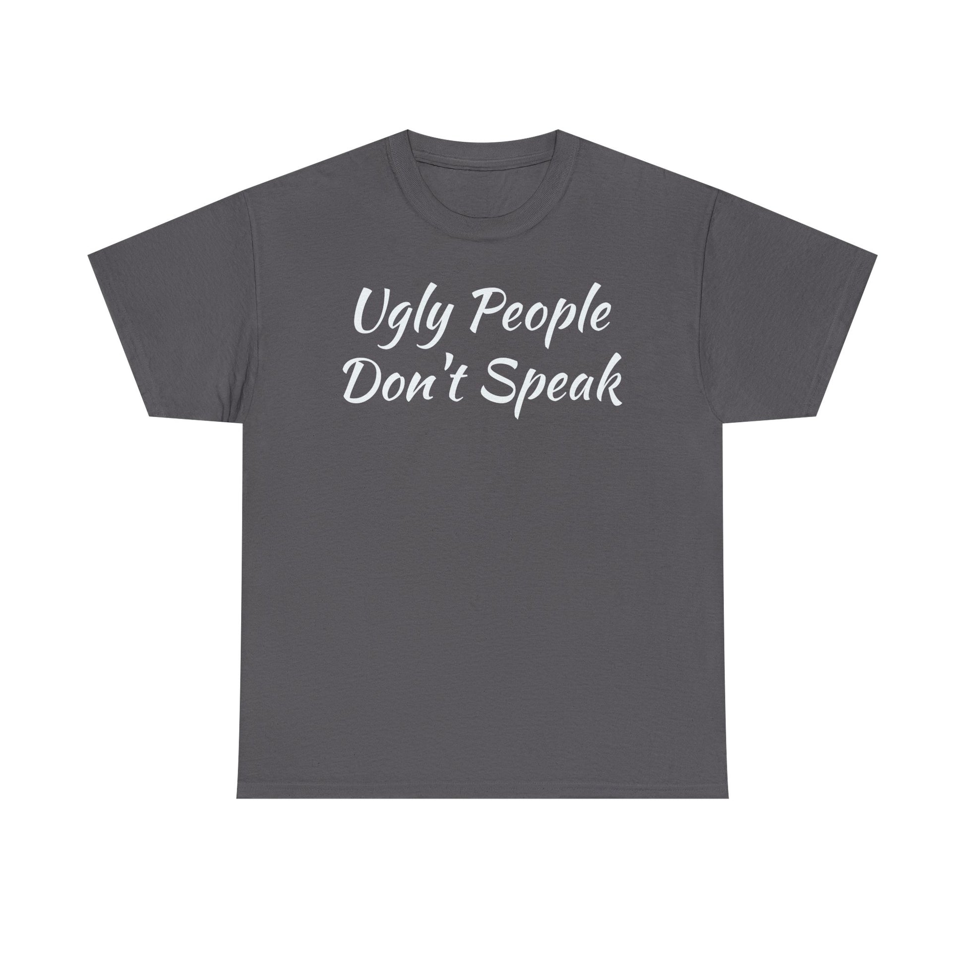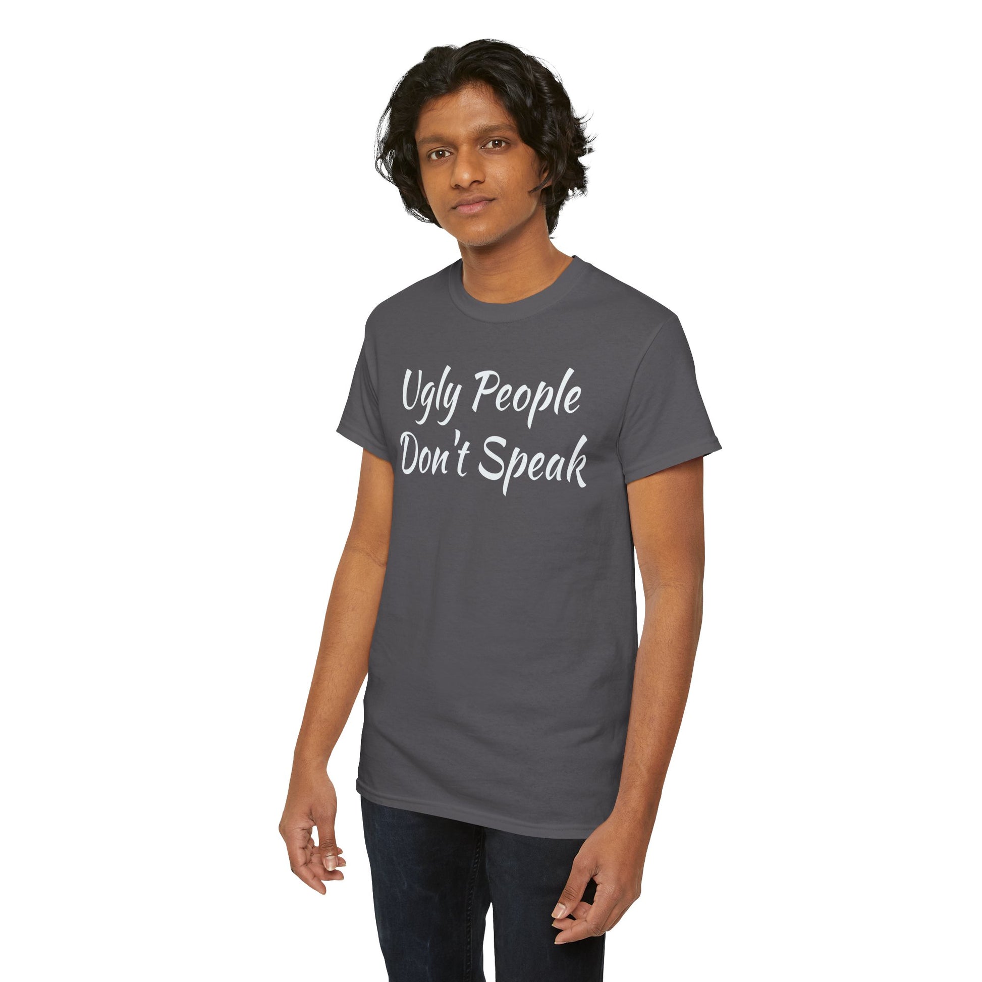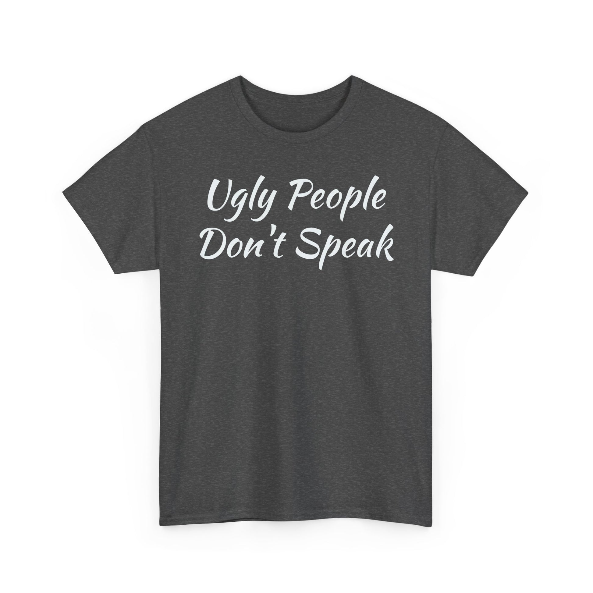 Introducing this stylish Unisex Heavy Cotton Tee, the perfect blend of comfort and edgy expression. Made from high-quality, specially spun fibers, this tee is not only soft to the touch, but also ensures durability for everyday wear. The classic fit and crew neckline make it a versatile choice, suitable for casual outings or more semi-formal occasions. Whether you're hanging out with friends or making a statement at a social gathering, this tee is designed to elevate your style effortlessly. It’s ideal for fashion enthusiasts, young adults, or anyone looking to inject a bit of fun into their wardrobe. Celebrate birthdays, parties, or just add a unique piece to your collection with this eye-catching design! Unisex Heavy Cotton Tee with "Ugly People Don't Speak" - Funny Gift, Casual Wear, Humor Shirt, Statement Tee, Birthday Gift