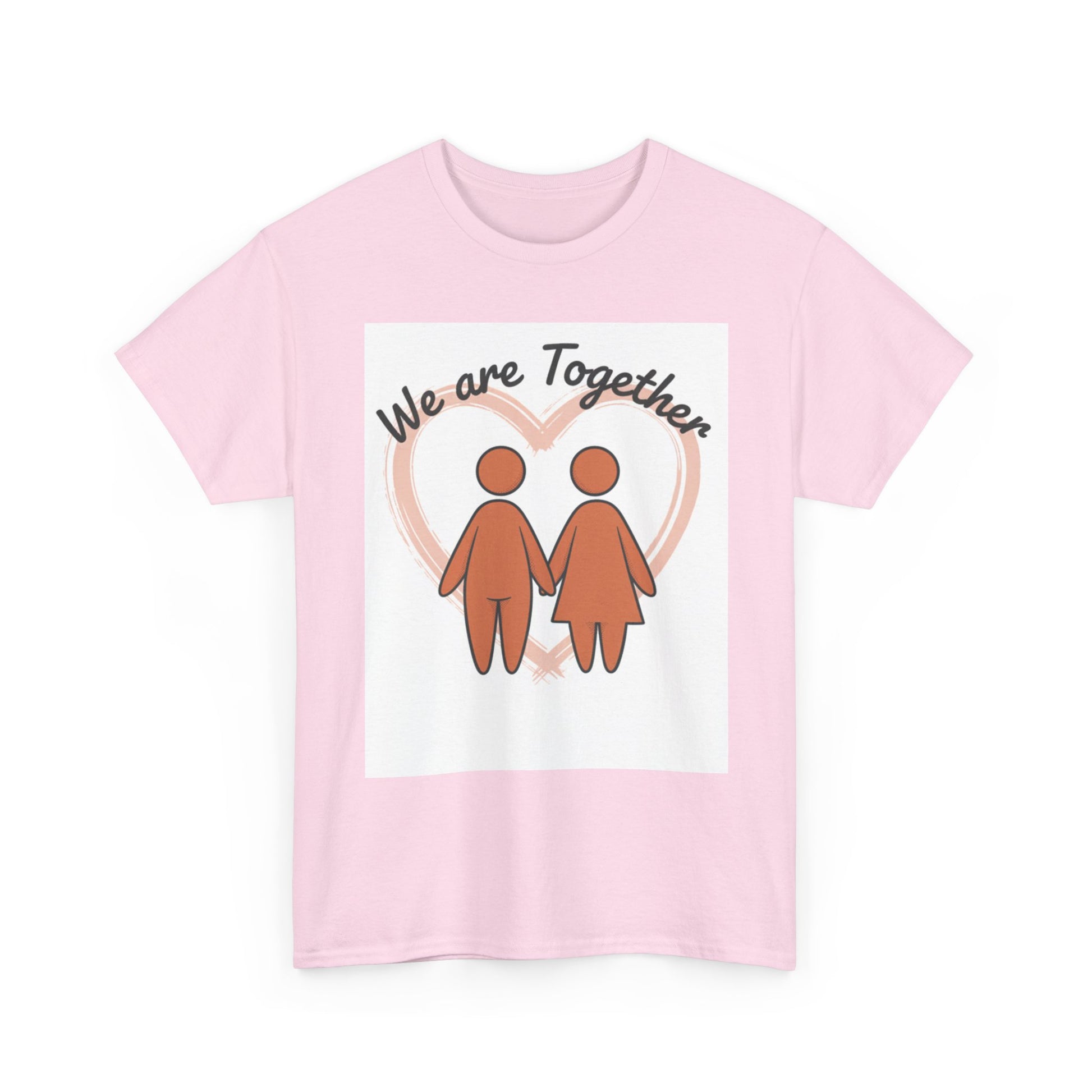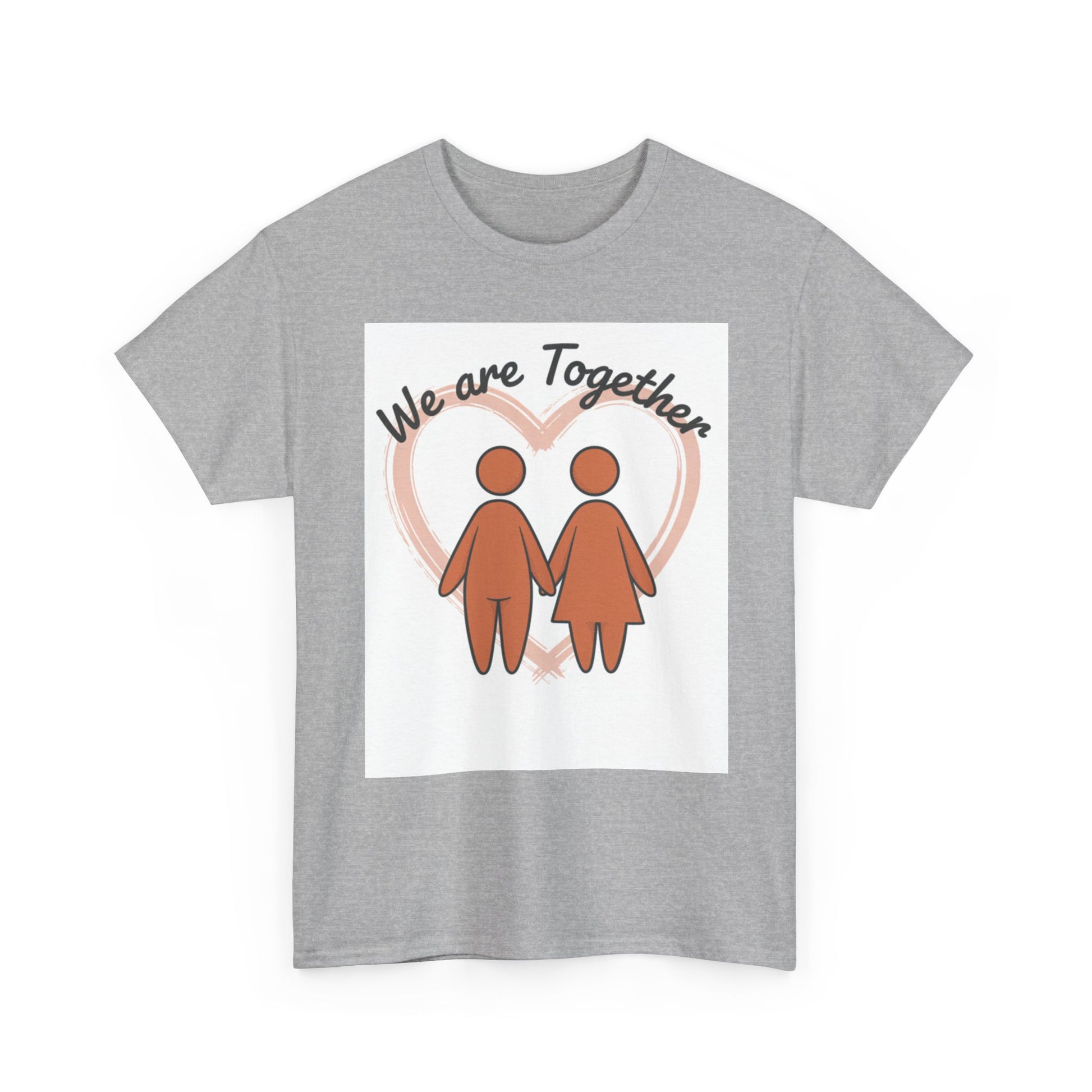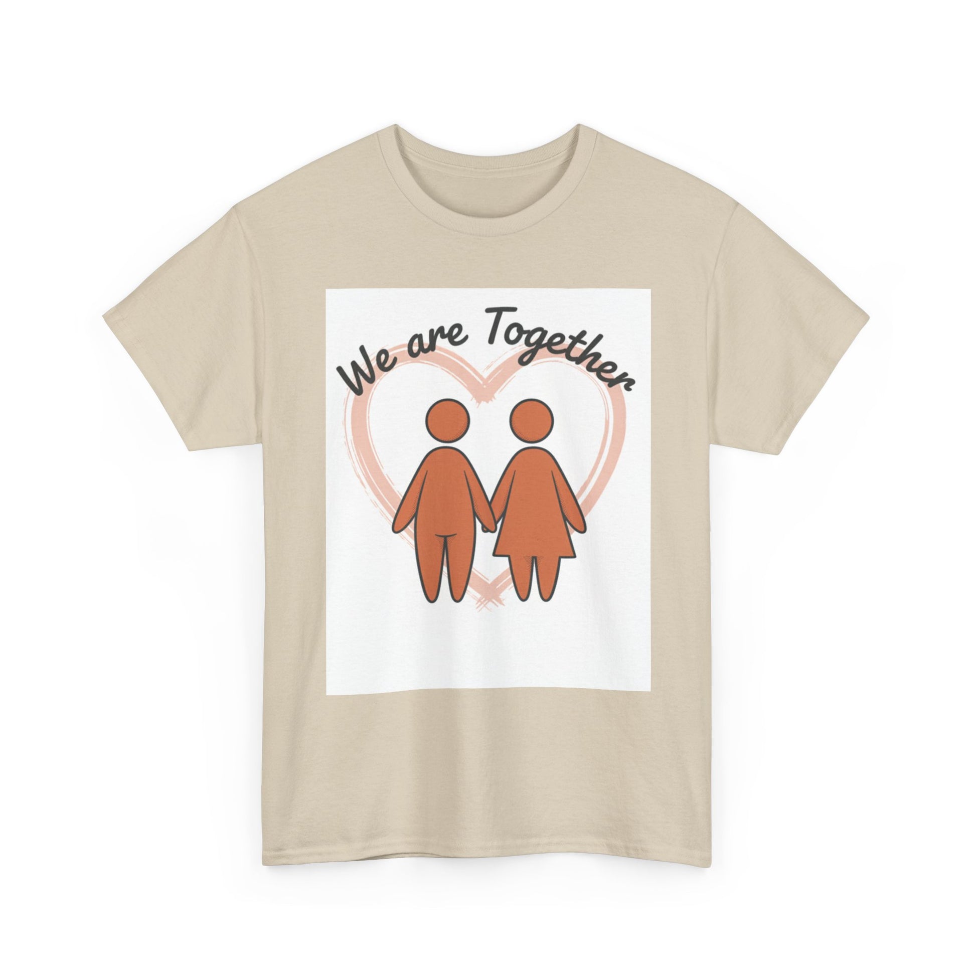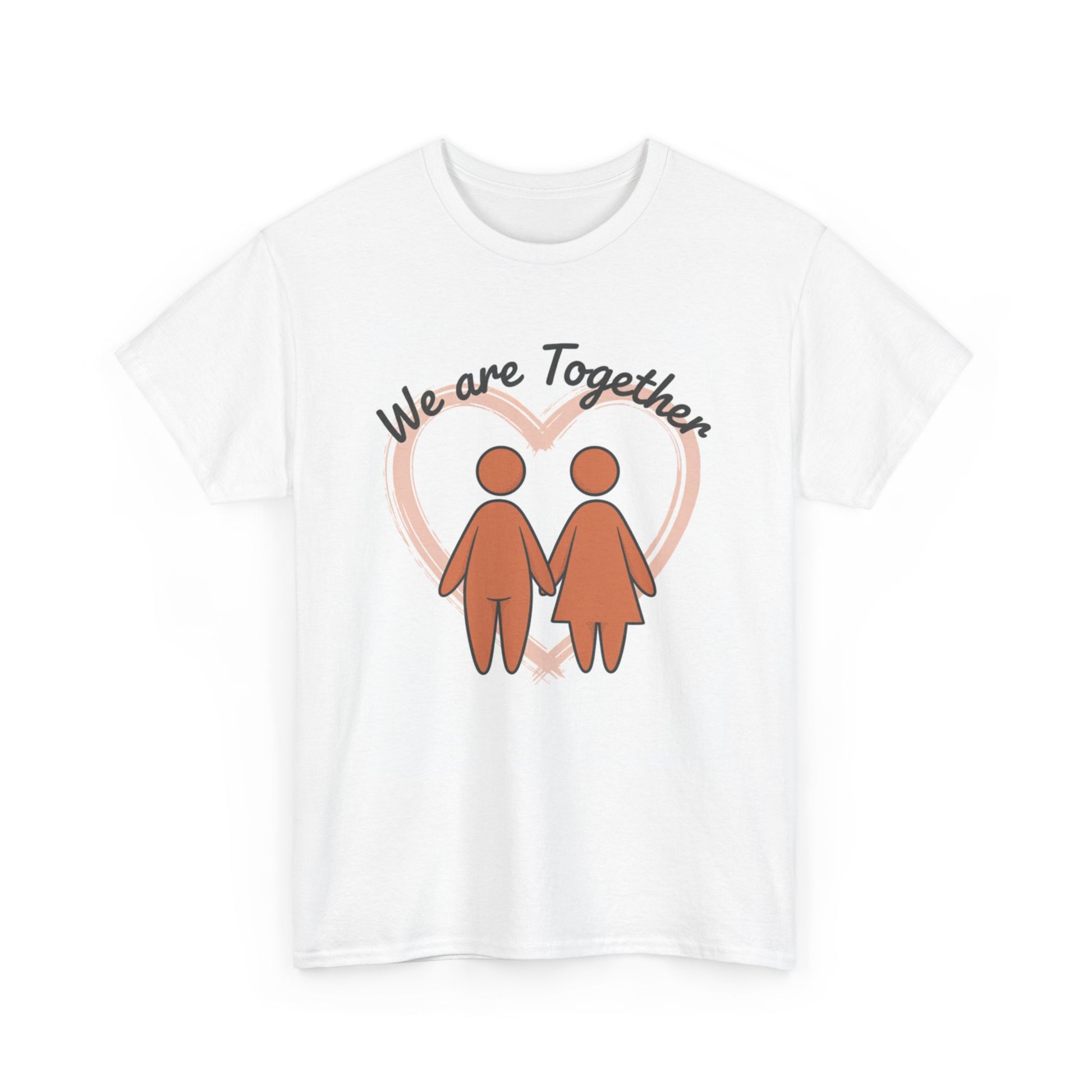 Soft, simple, and sincere — this classic tee carries a gentle message: we are together. The warm, muted illustration of two figures holding hands sits inside a soft heart glow, creating a calm, hopeful look that reads like a quiet promise. Wear it on slow mornings, neighborhood walks, or while hosting a cozy get-together; it layers smoothly under jackets and feels familiar from the first wear. The medium-weight cotton holds prints well and softens with each wash, keeping that hand-drawn charm intact. For anyone who values connection and low-key comfort, this tee feels like an everyday hug.