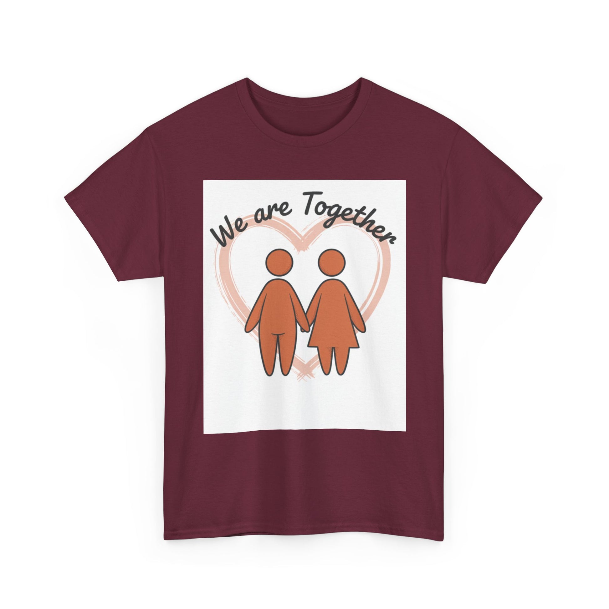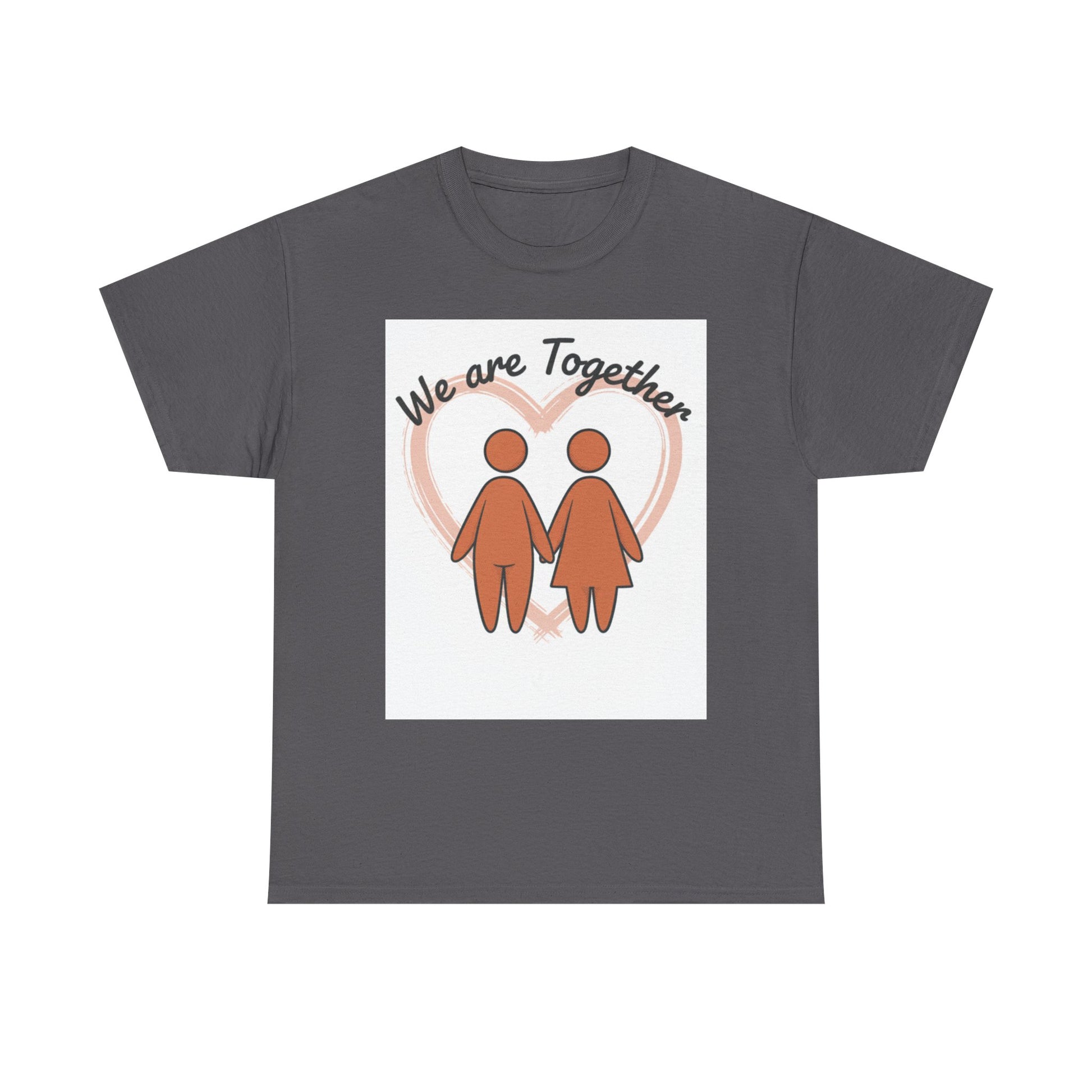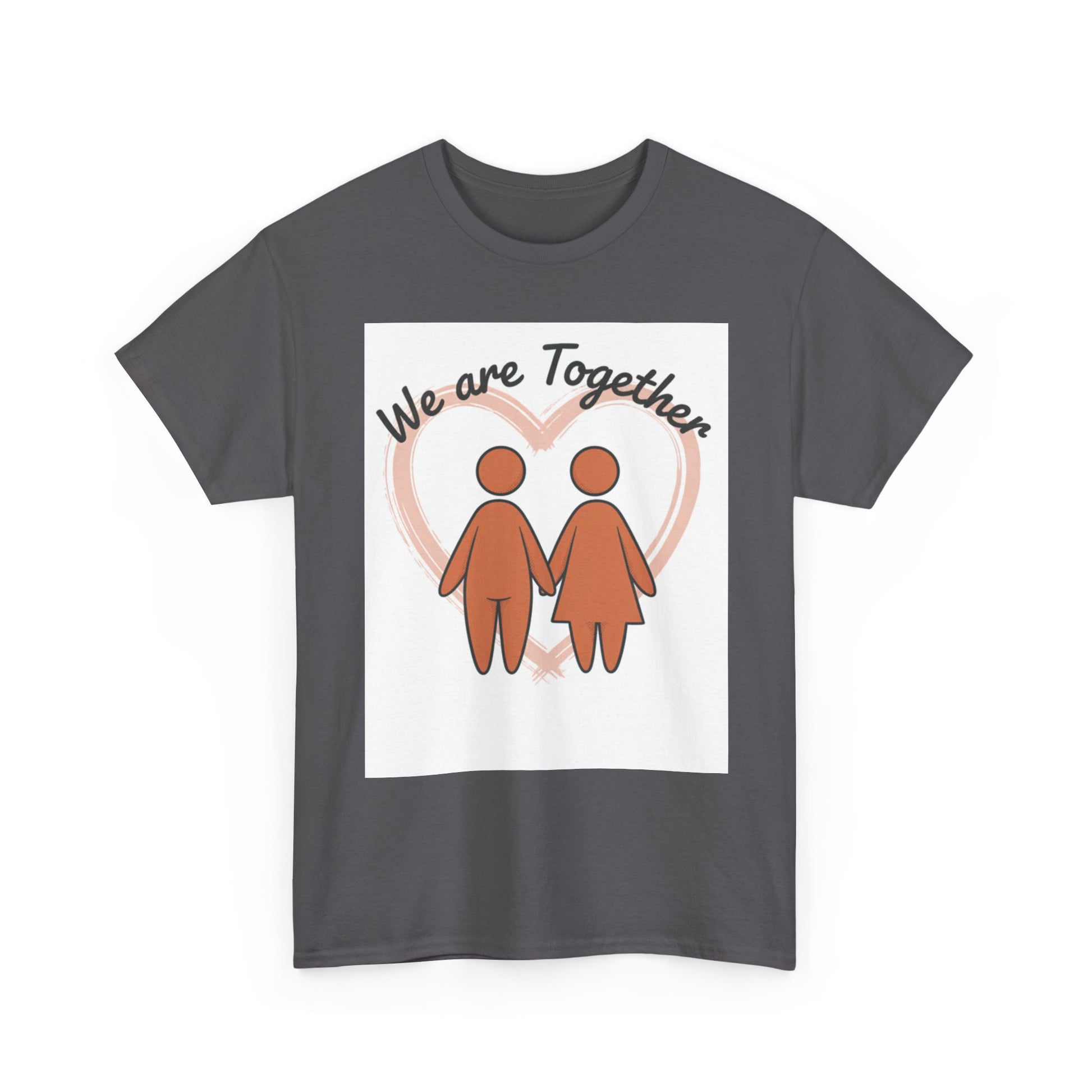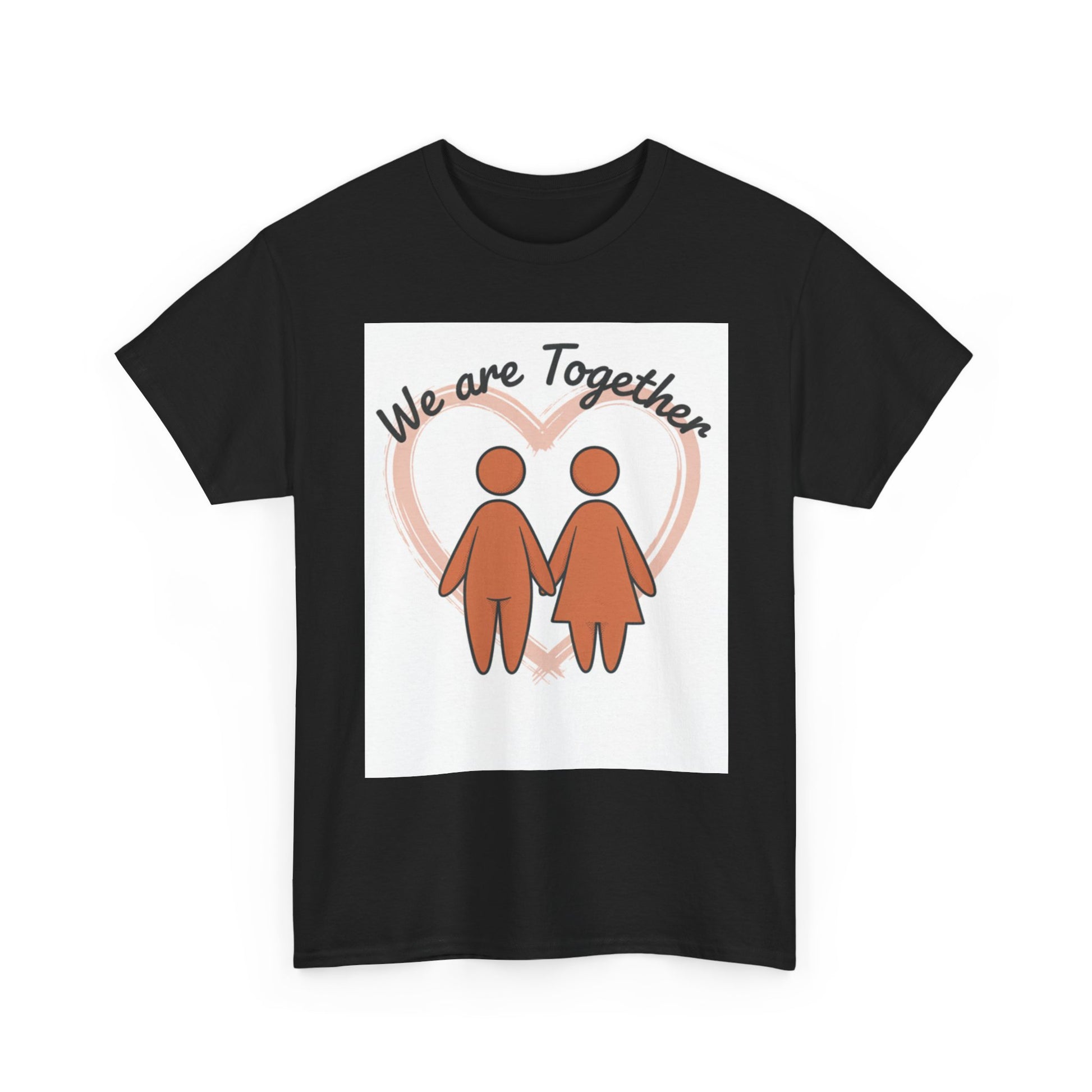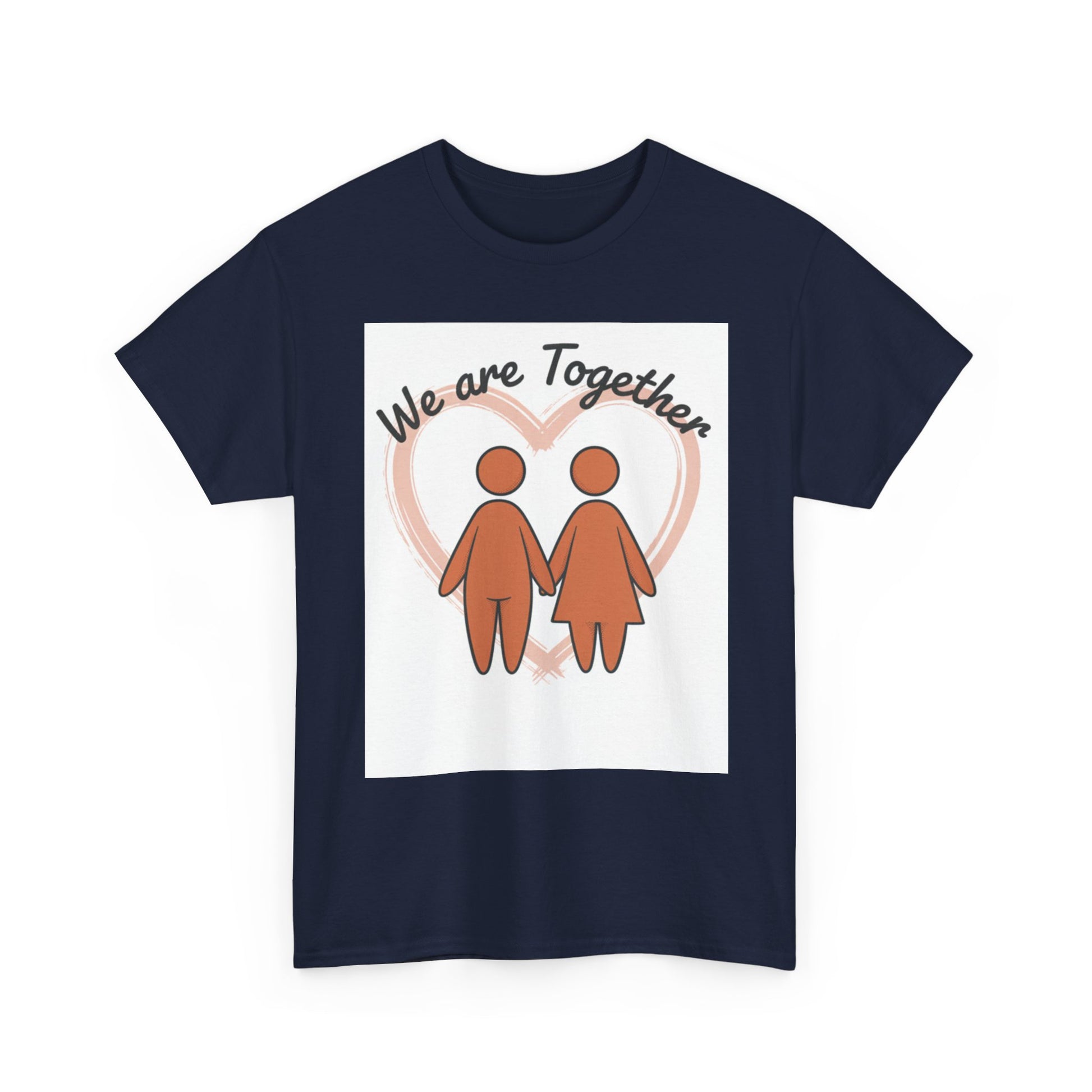 Soft, simple, and sincere — this classic tee carries a gentle message: we are together. The warm, muted illustration of two figures holding hands sits inside a soft heart glow, creating a calm, hopeful look that reads like a quiet promise. Wear it on slow mornings, neighborhood walks, or while hosting a cozy get-together; it layers smoothly under jackets and feels familiar from the first wear. The medium-weight cotton holds prints well and softens with each wash, keeping that hand-drawn charm intact. For anyone who values connection and low-key comfort, this tee feels like an everyday hug.