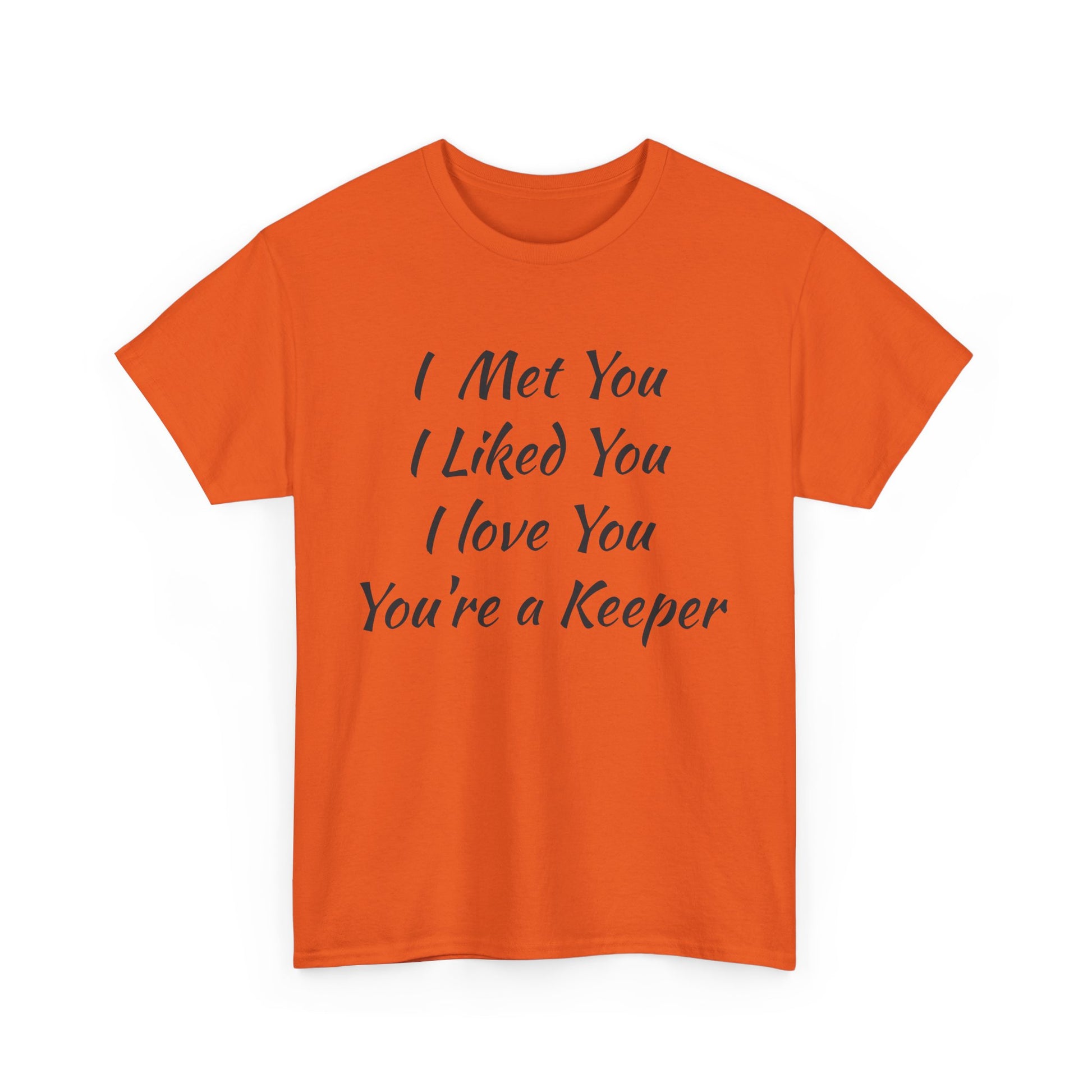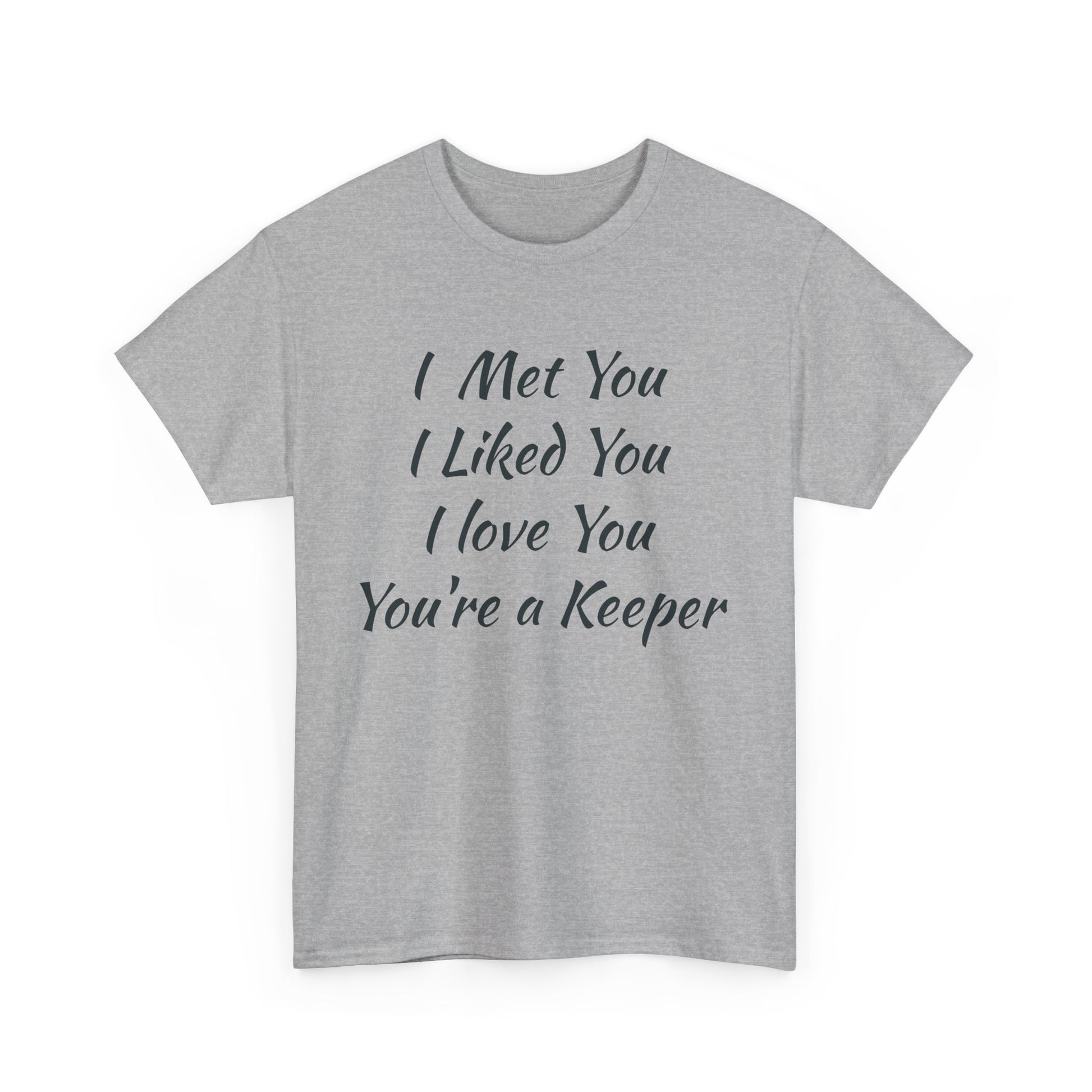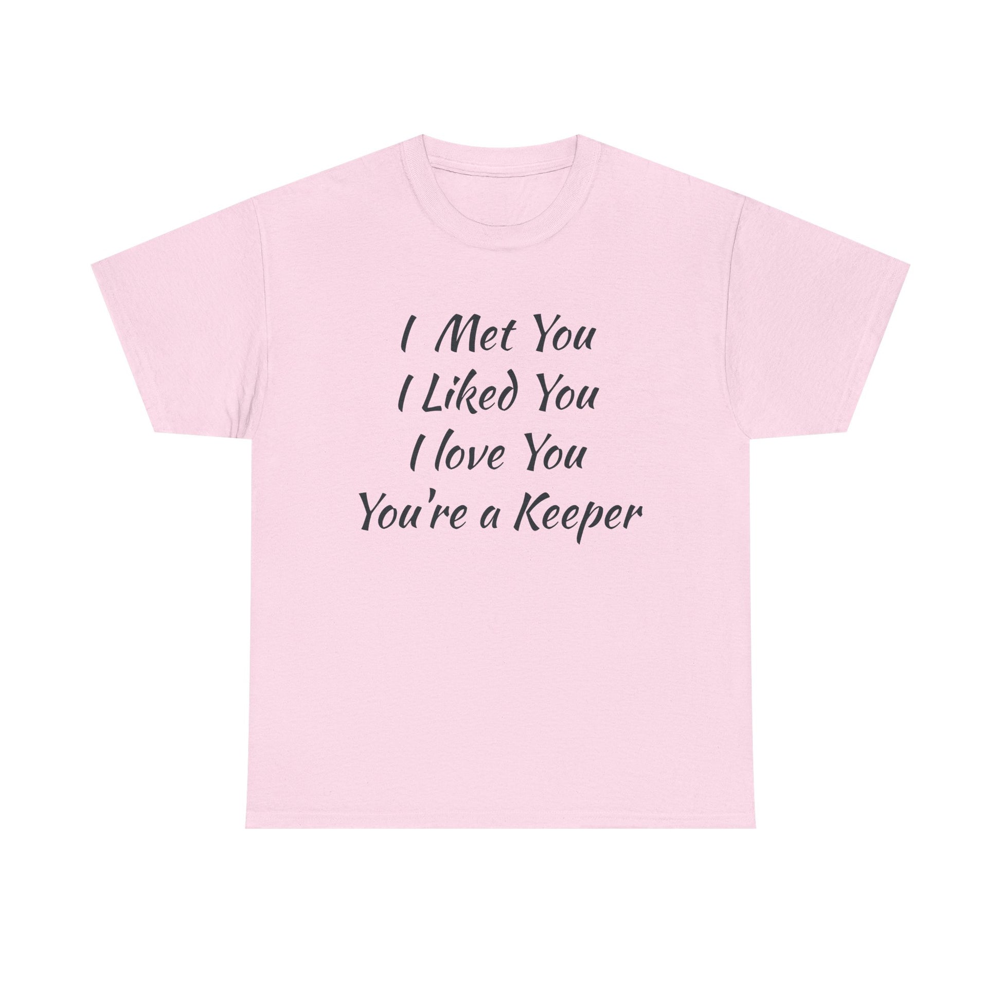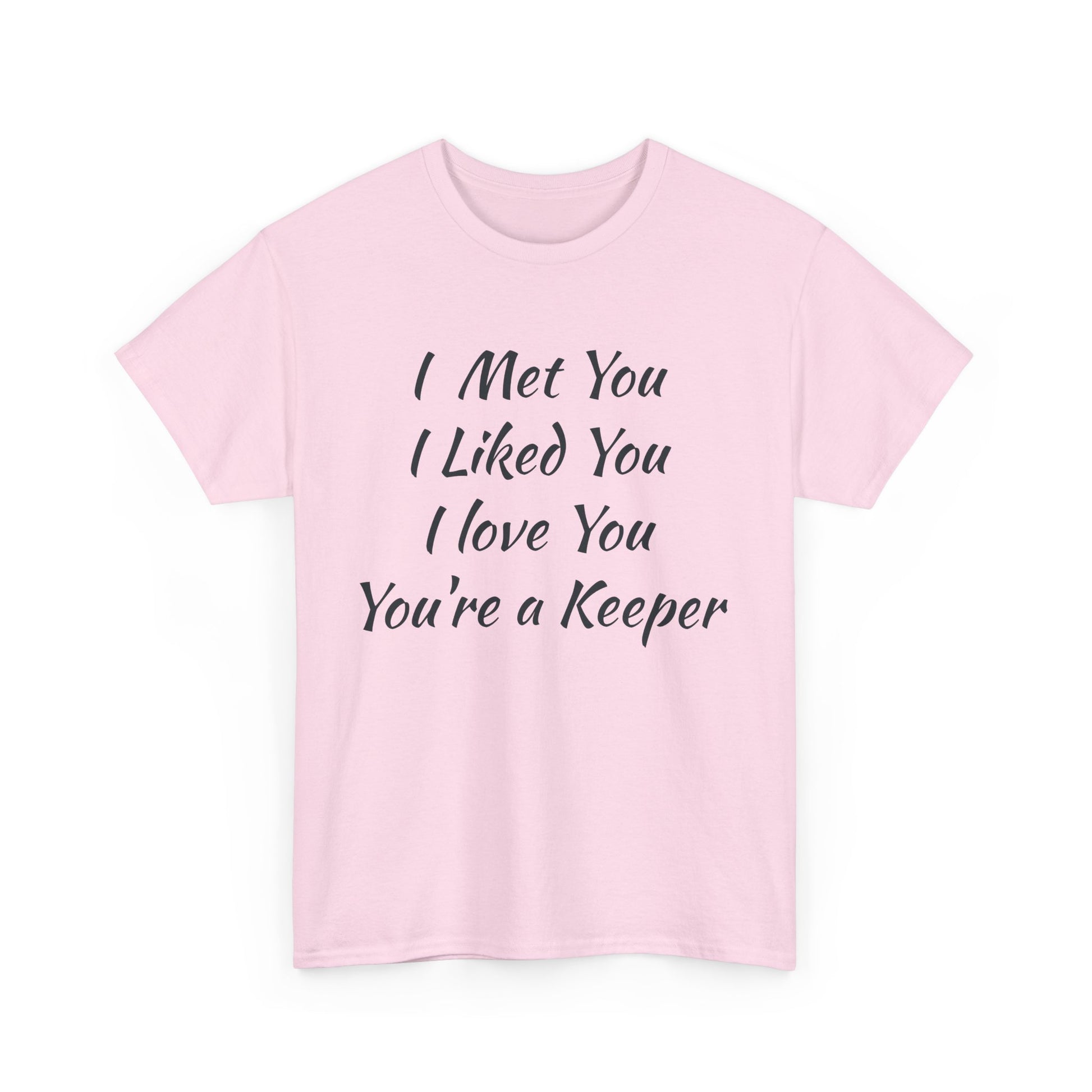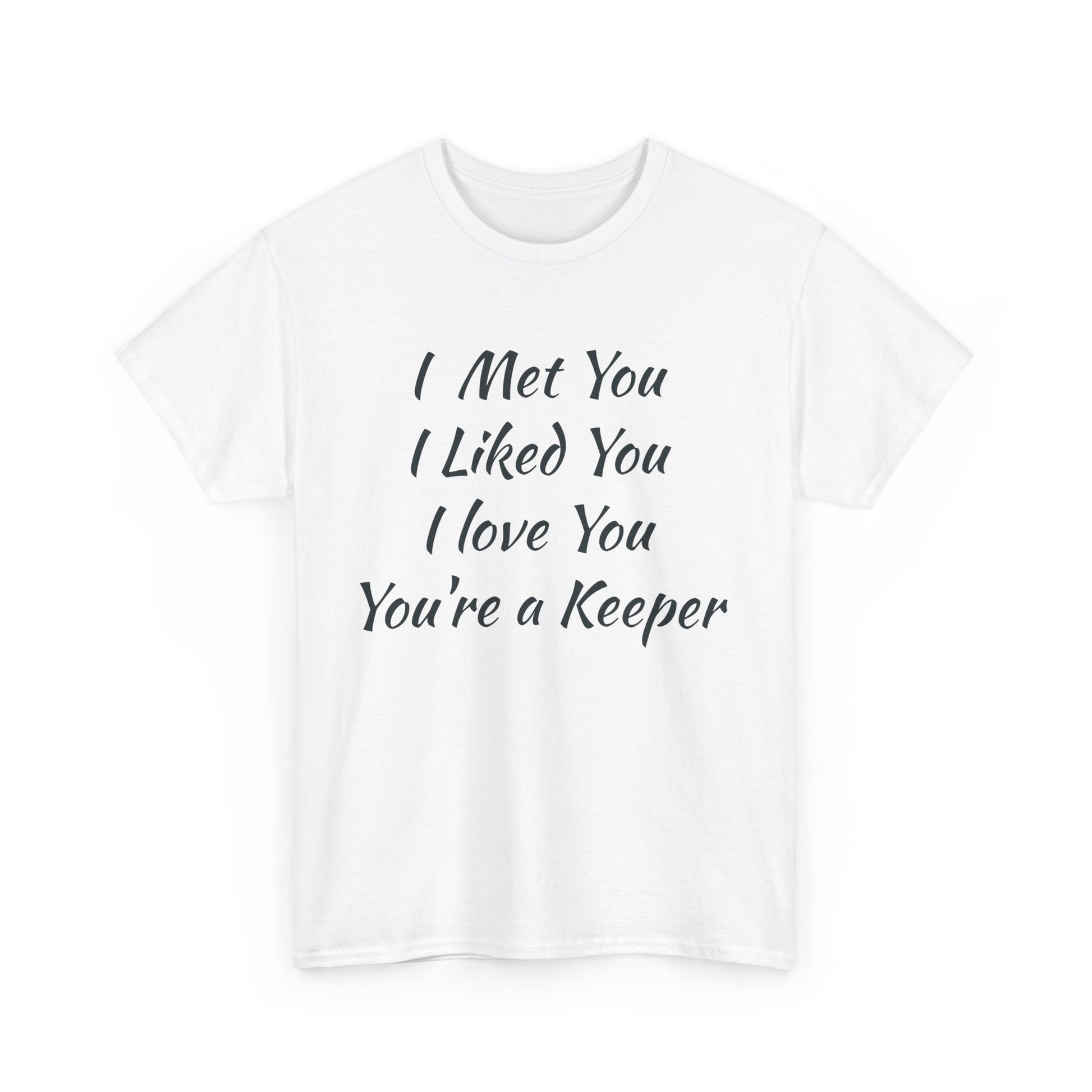Introducing our Unisex Heavy Cotton Tee, perfect for expressing feelings of love and connection. This shirt features a heartwarming message: 'I Met You, I Liked You, I Love You, You're a Keeper.' Ideal for casual outings or cozy gatherings, it effortlessly complements your everyday wardrobe. The classic fit and crew neckline make it suitable for anyone who appreciates comfort and style. Perfect for occasions like anniversaries, Valentine’s Day, or simply to gift someone special, this tee adds a warm and personal touch to any event. Wear it with pride or give it to a loved one for a memorable gift that captures the essence of love and appreciation. Romantic Quote Tee, Love Shirt, Gift for Him, Gift for Her, Couple's Apparel, Cute Relationship Tee